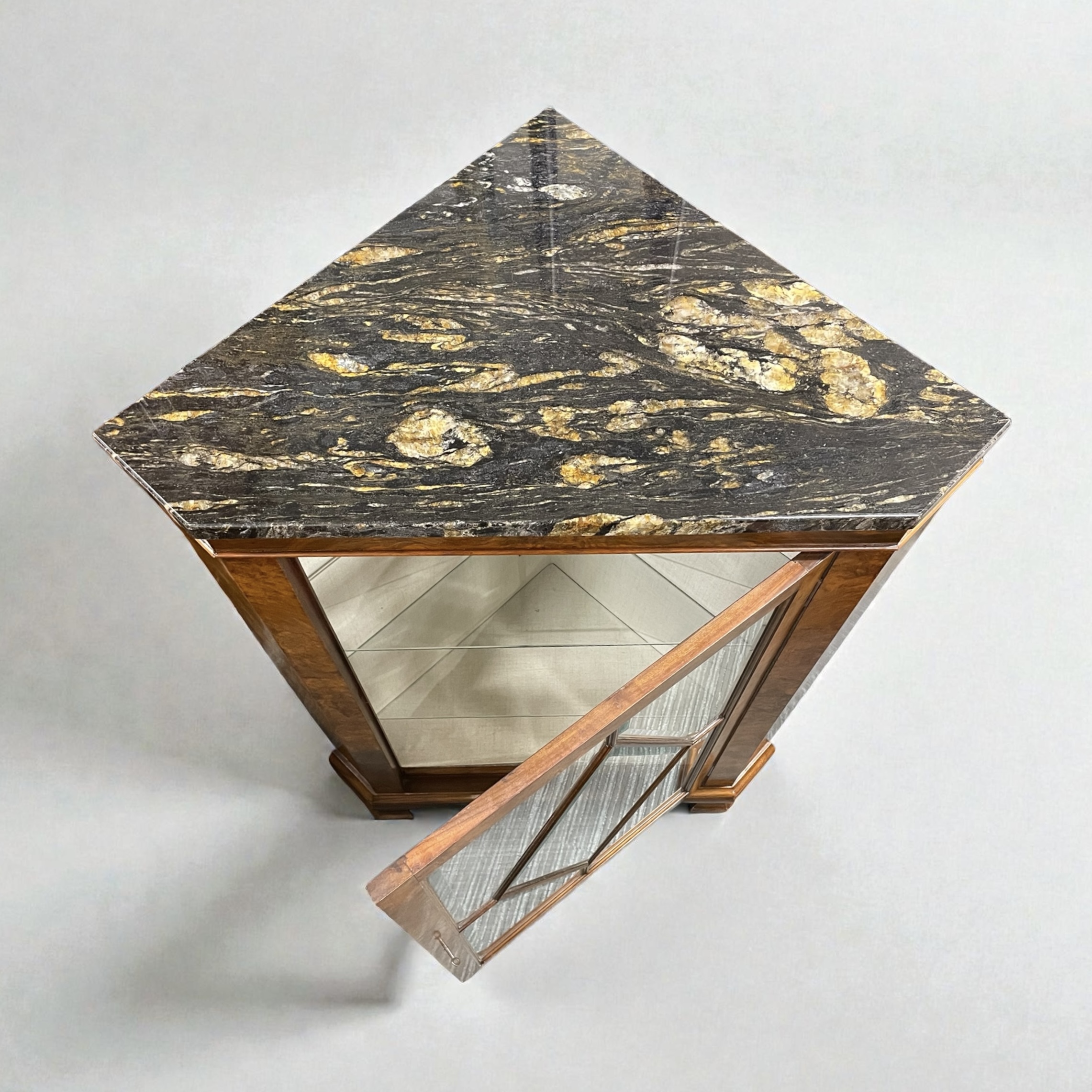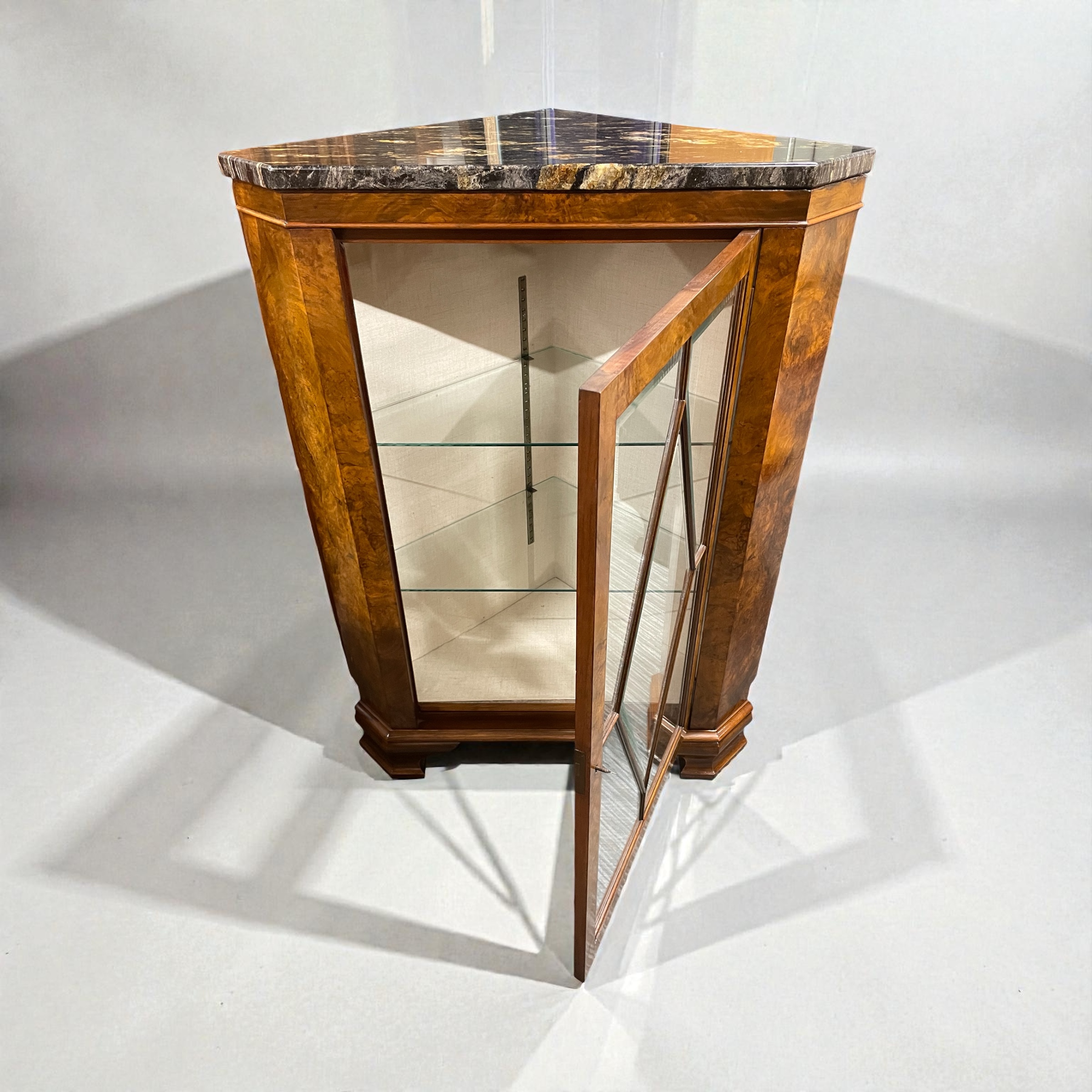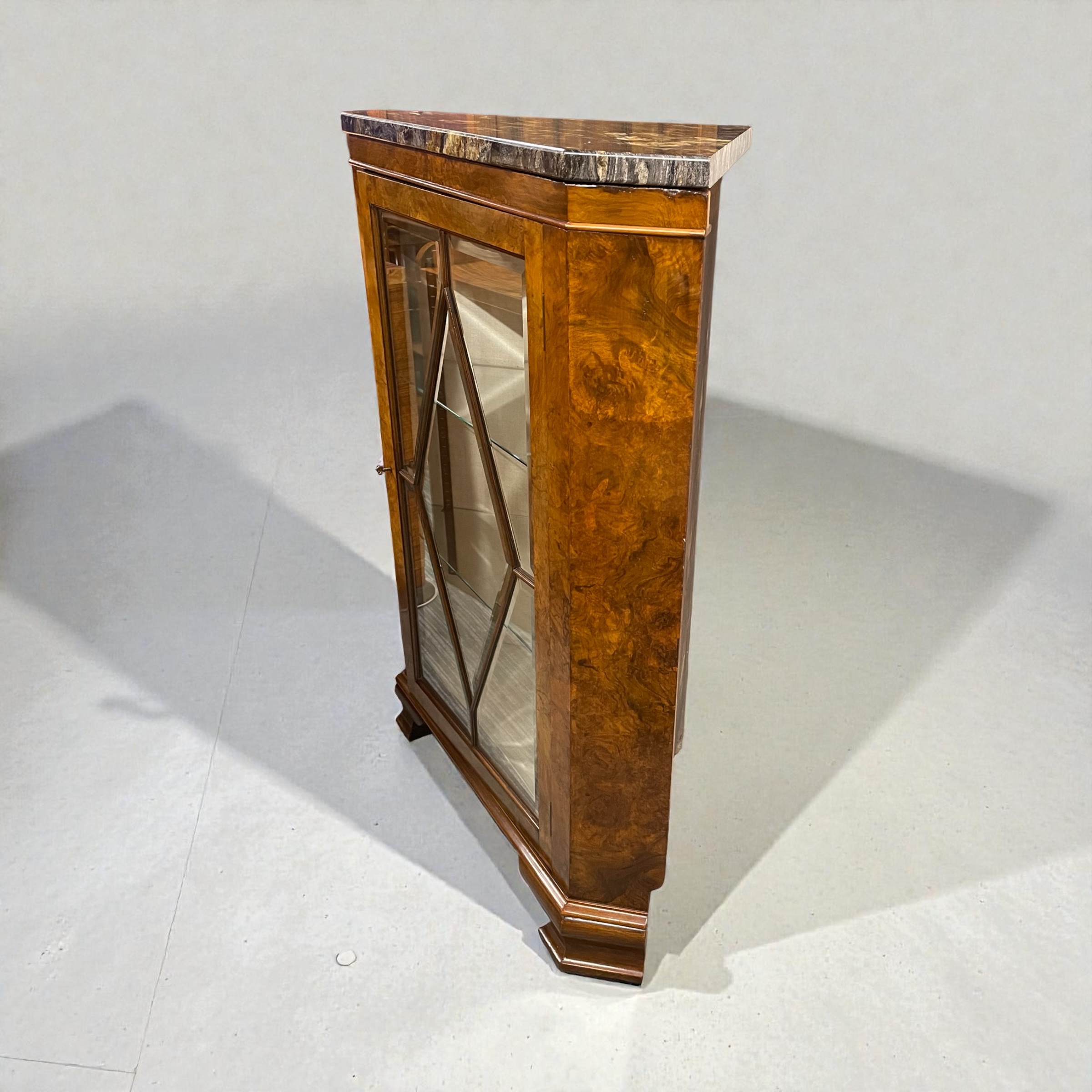 Art Deco corner cabinet in walnut. A single astral glazed bevelled edged door, with a cream fabric lined interior, with two glass adjustable shelves. An attractive marble top and the makers label, ‘John Greenwood cabinet maker and upholsterer’, to the door.