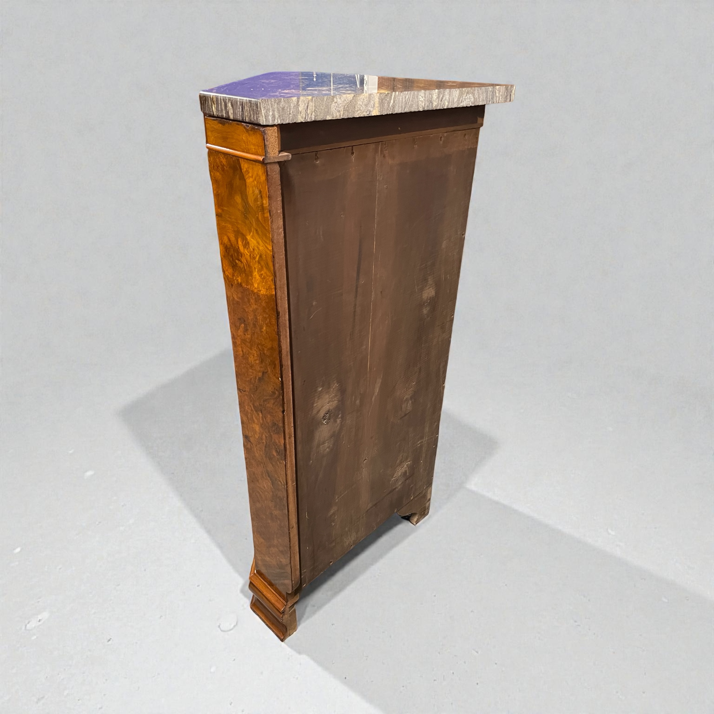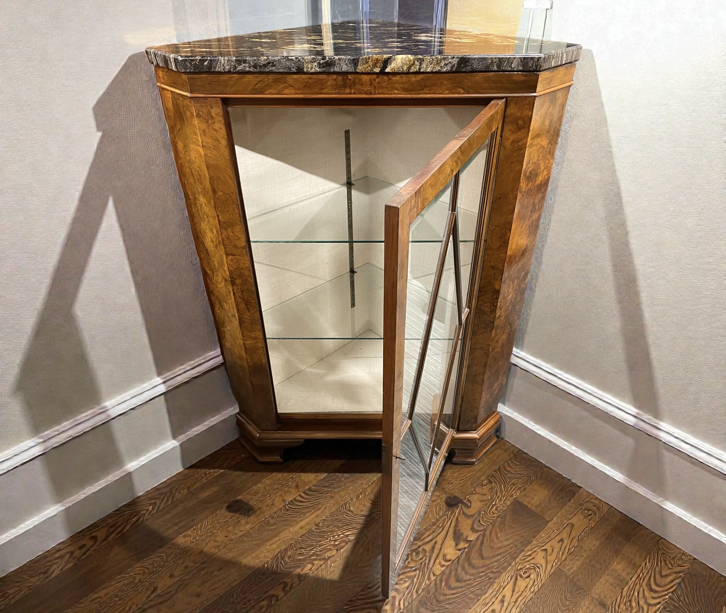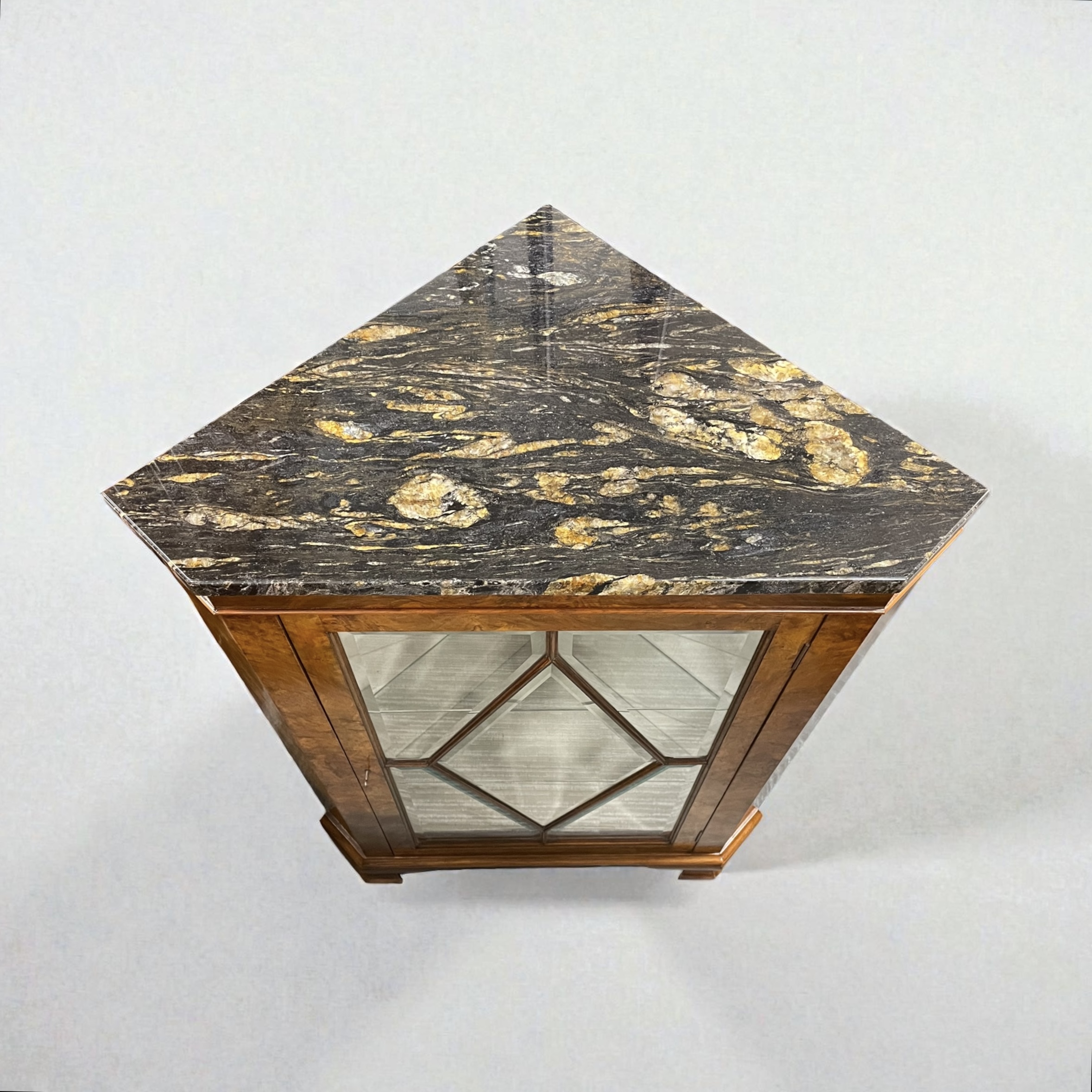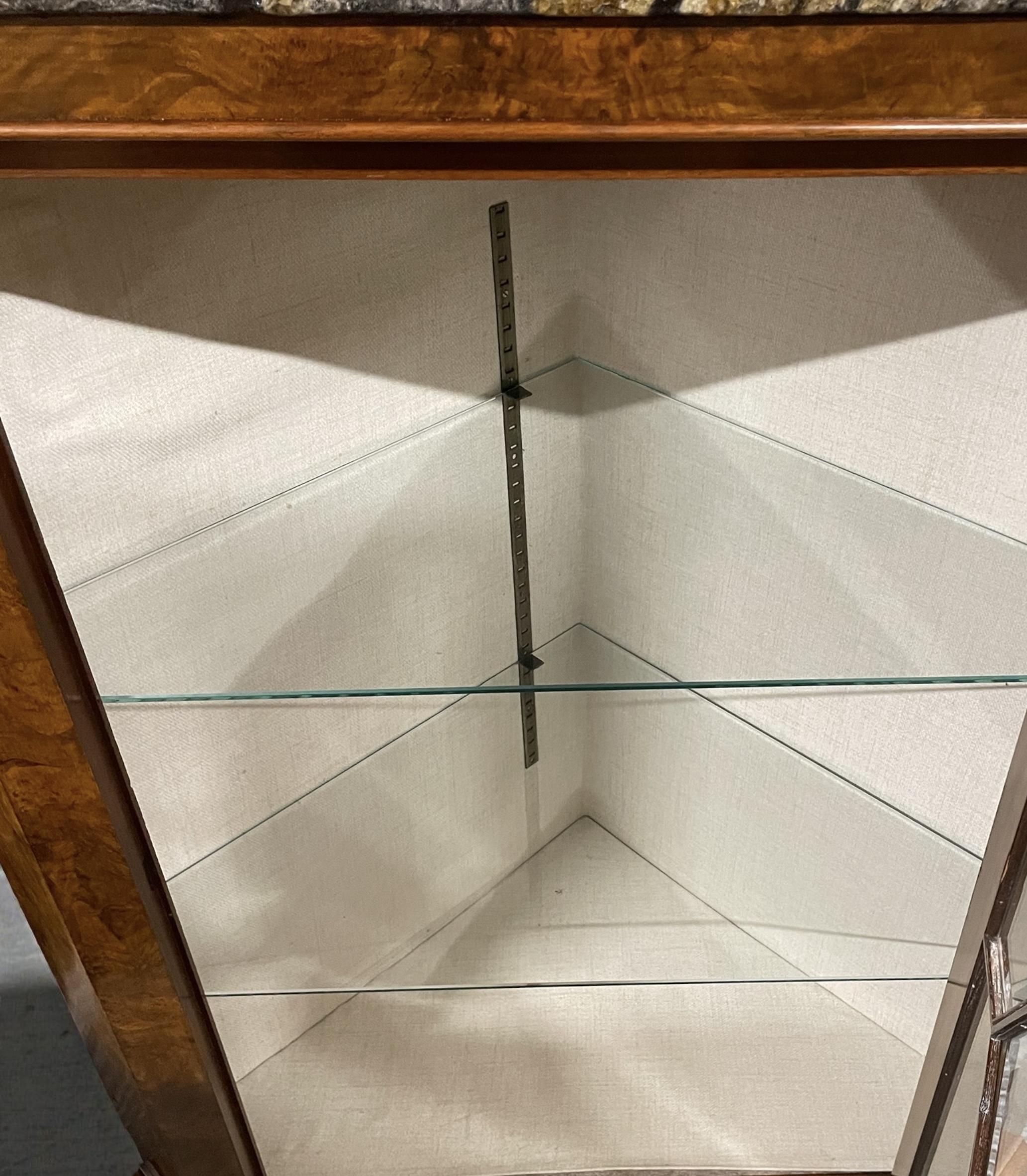 Art Deco corner cabinet in walnut. A single astral glazed bevelled edged door, with a cream fabric lined interior, with two glass adjustable shelves. An attractive marble top and the makers label, ‘John Greenwood cabinet maker and upholsterer’, to the door.