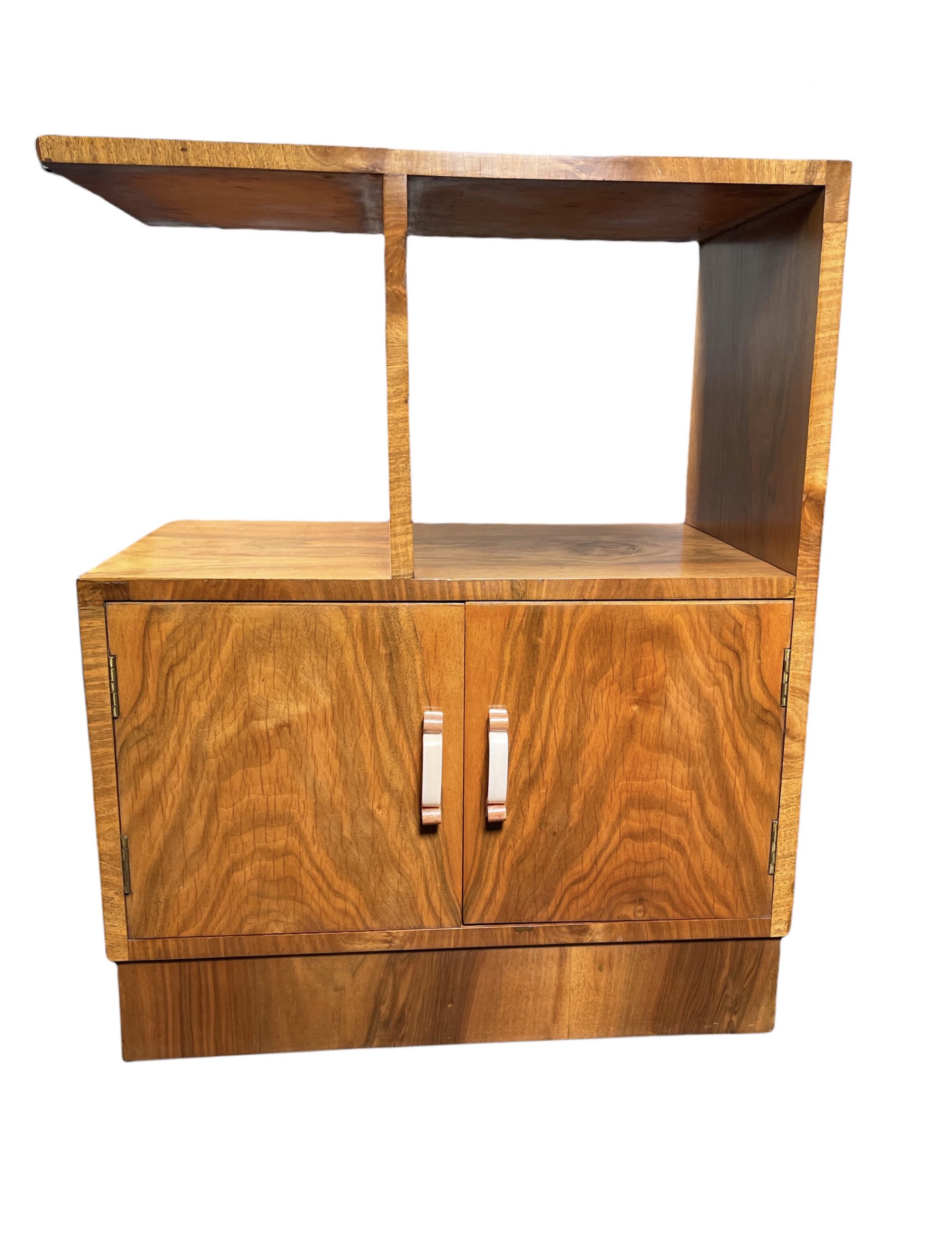 An attractive Art Deco walnut cupboard. A top shelf, with an open shelf beneath. Below a two door cupboard with attractive cream and pale red phenolic handles.