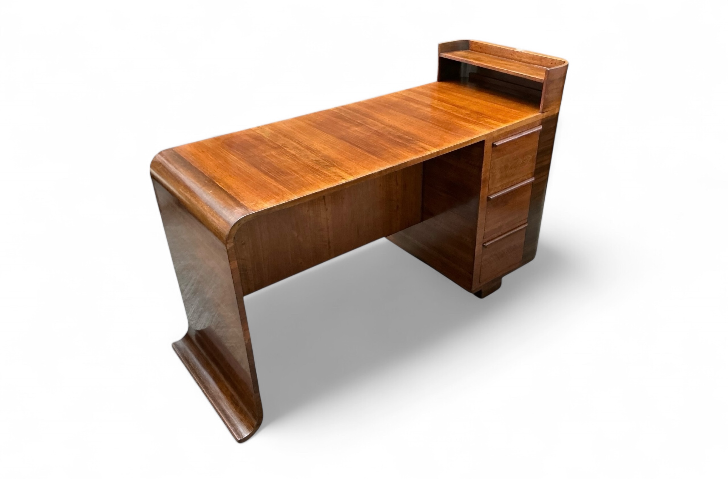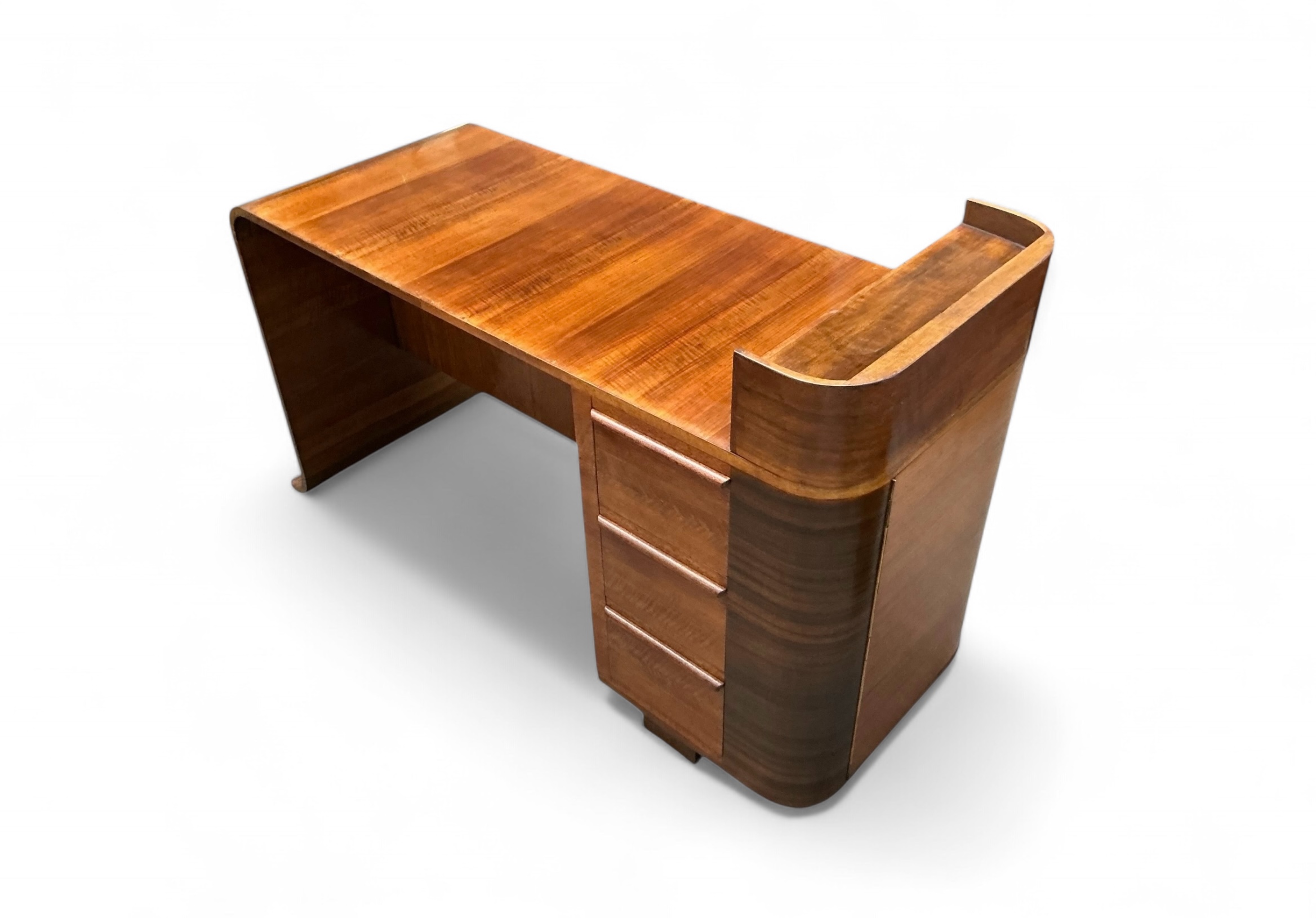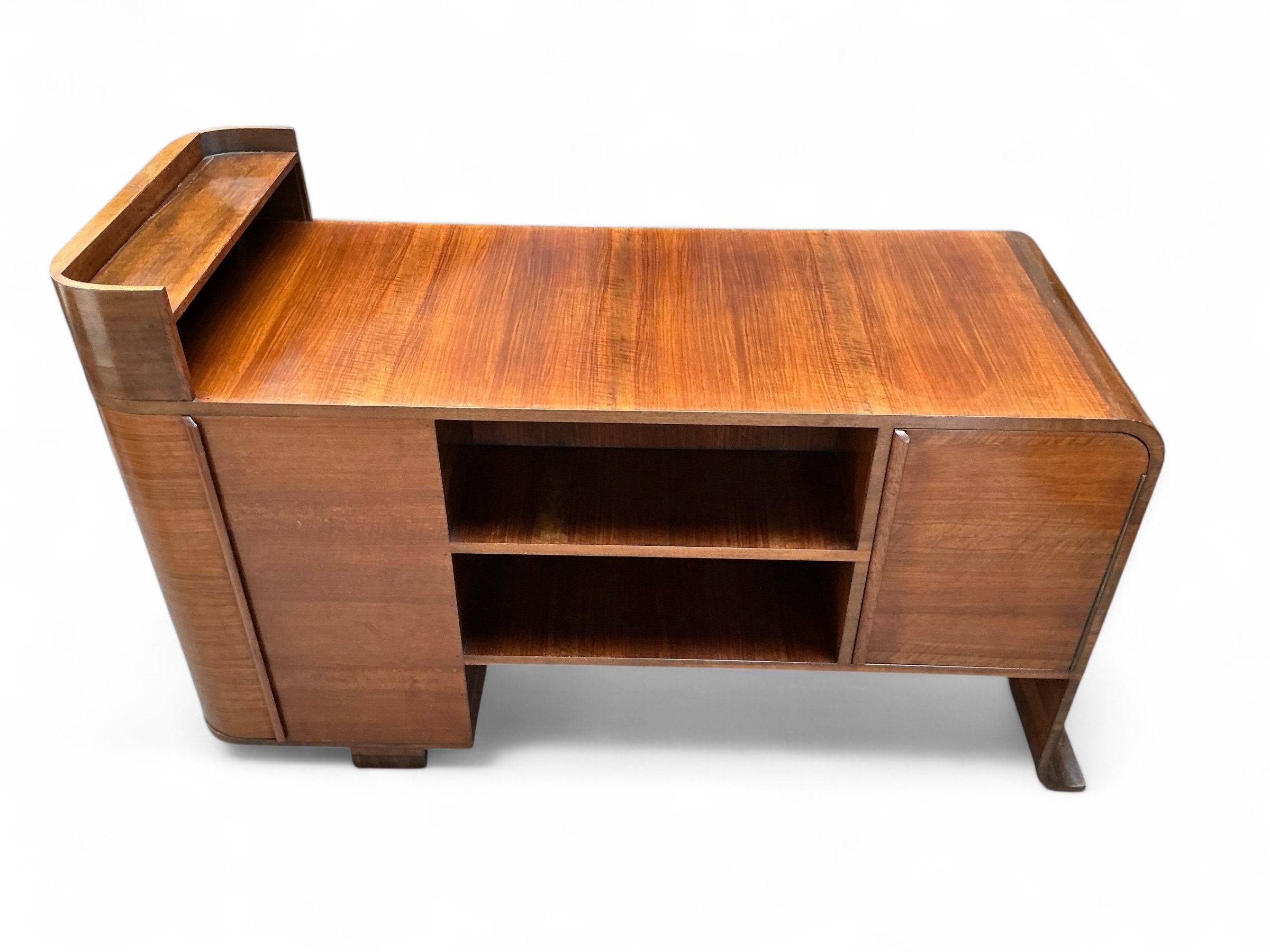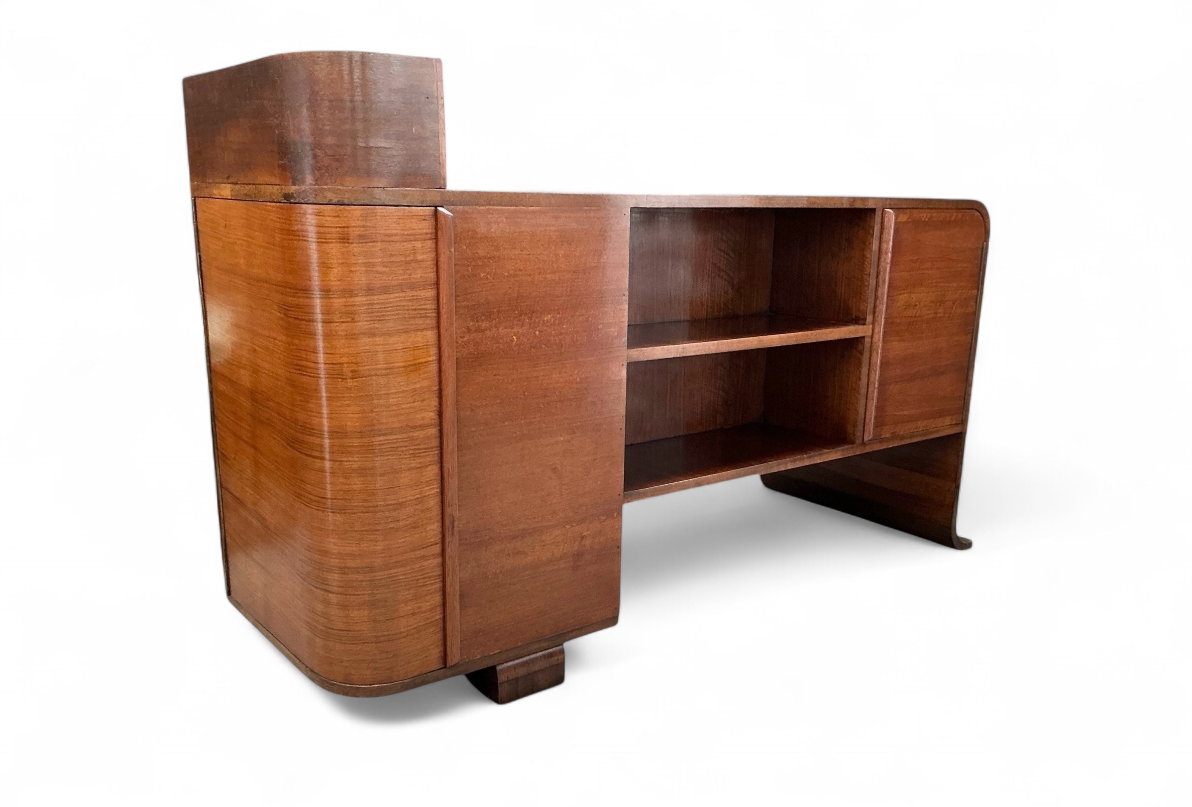 Art Deco desk in walnut with three drawers to the front and an open shelf to the desk top. To the curved side, a cupboard with three shelves and to the back a further cupboard and two open shelves, ideal for books or display. Attractive curved detail to the foot of one side and a curved side to the other.