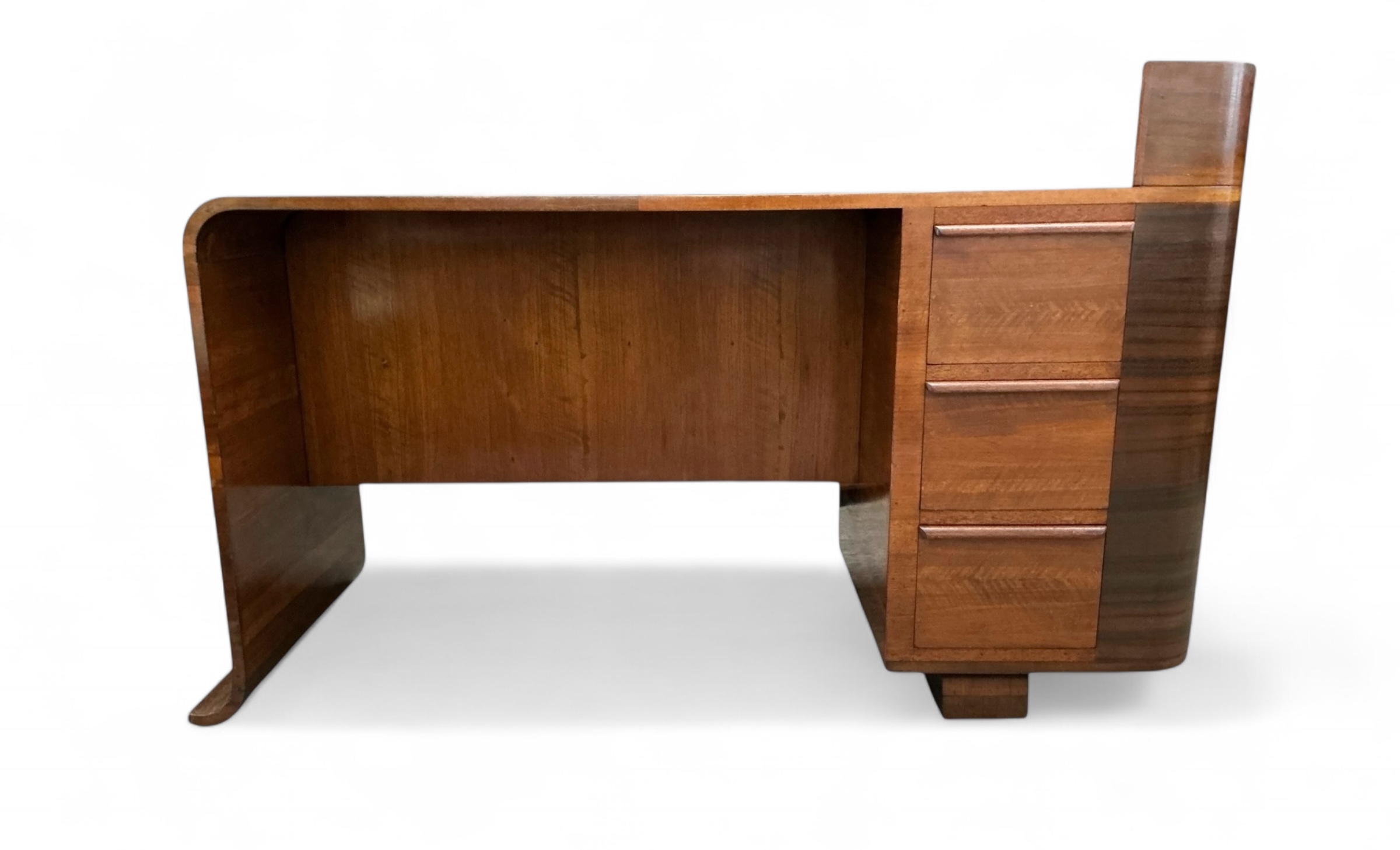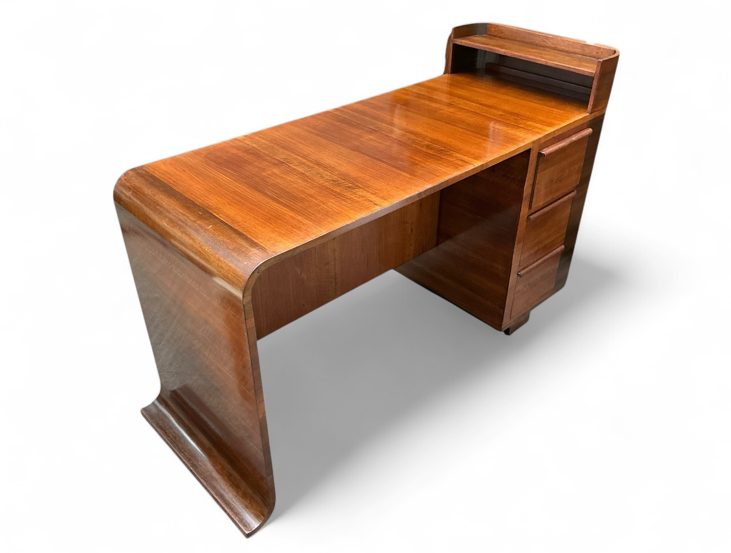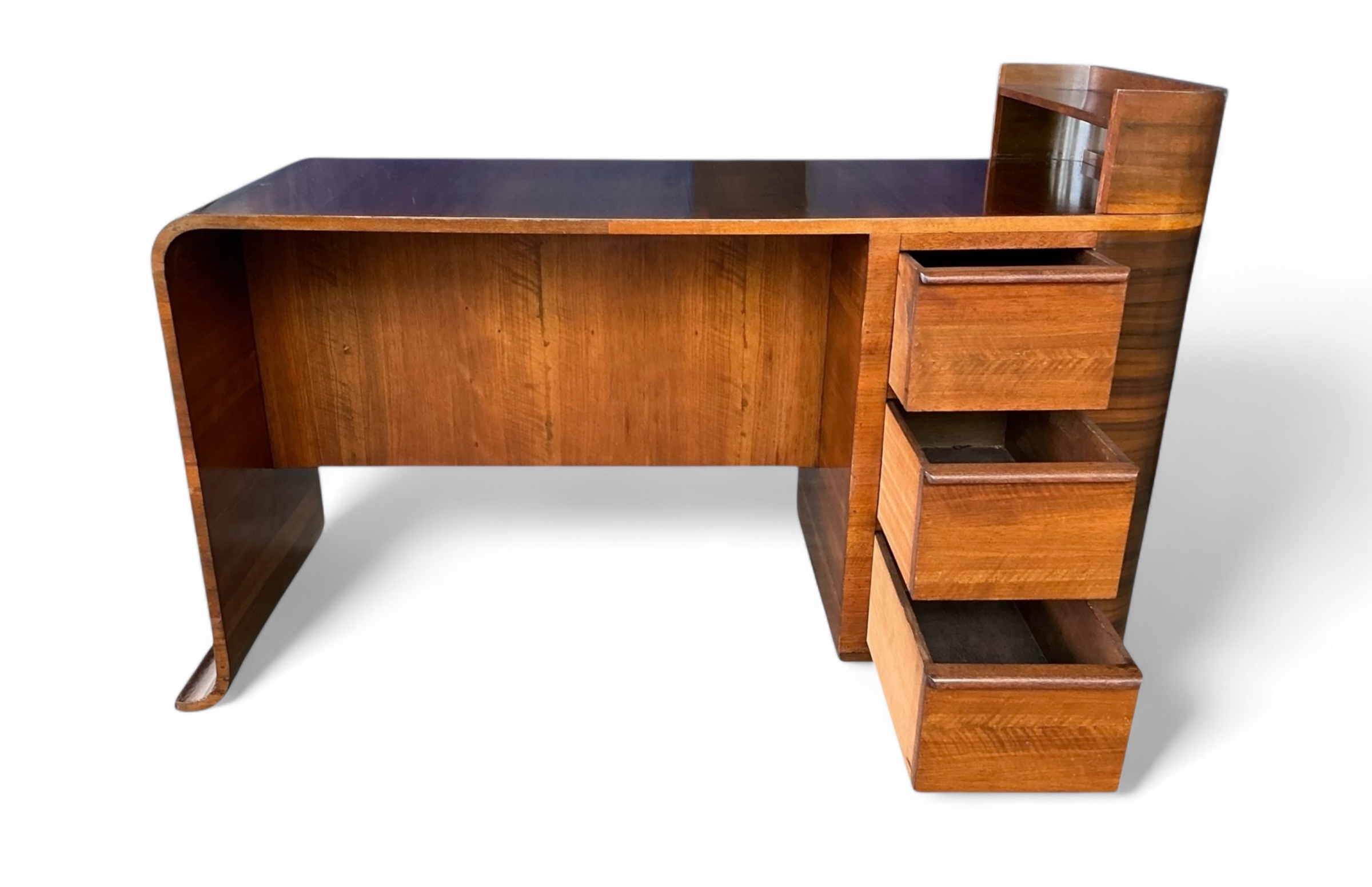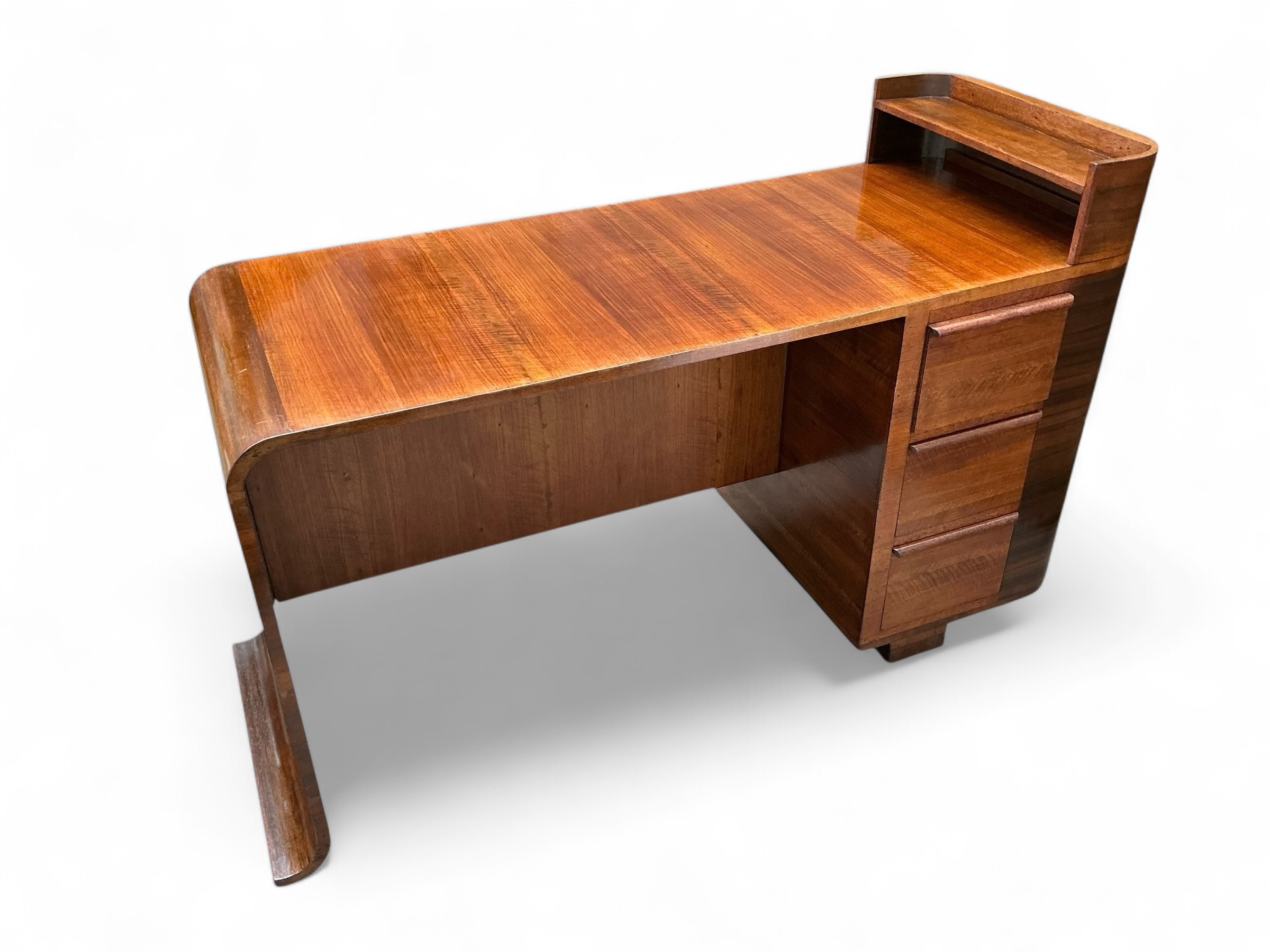 Art Deco desk in walnut with three drawers to the front and an open shelf to the desk top. To the curved side, a cupboard with three shelves and to the back a further cupboard and two open shelves, ideal for books or display. Attractive curved detail to the foot of one side and a curved side to the other.