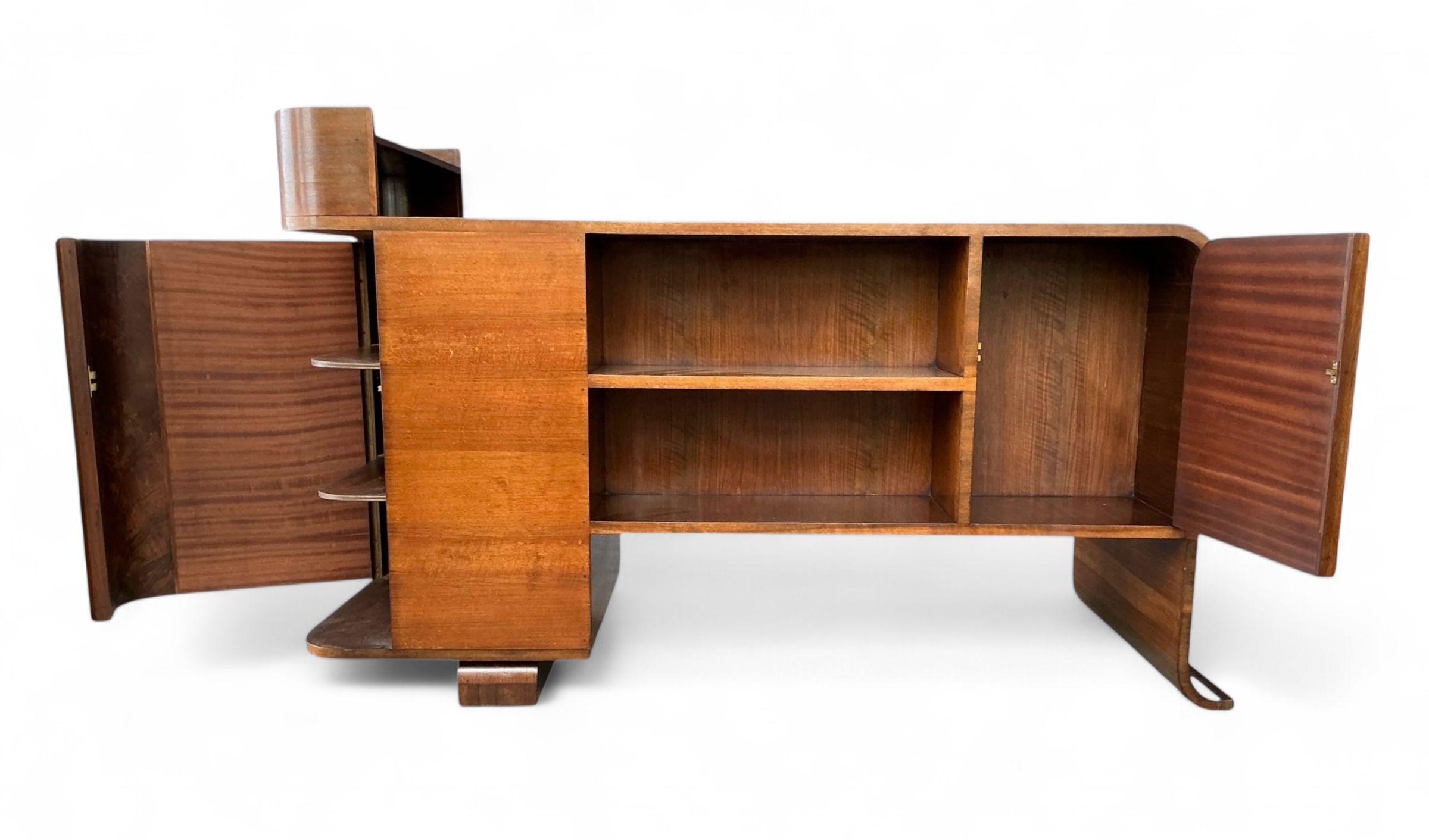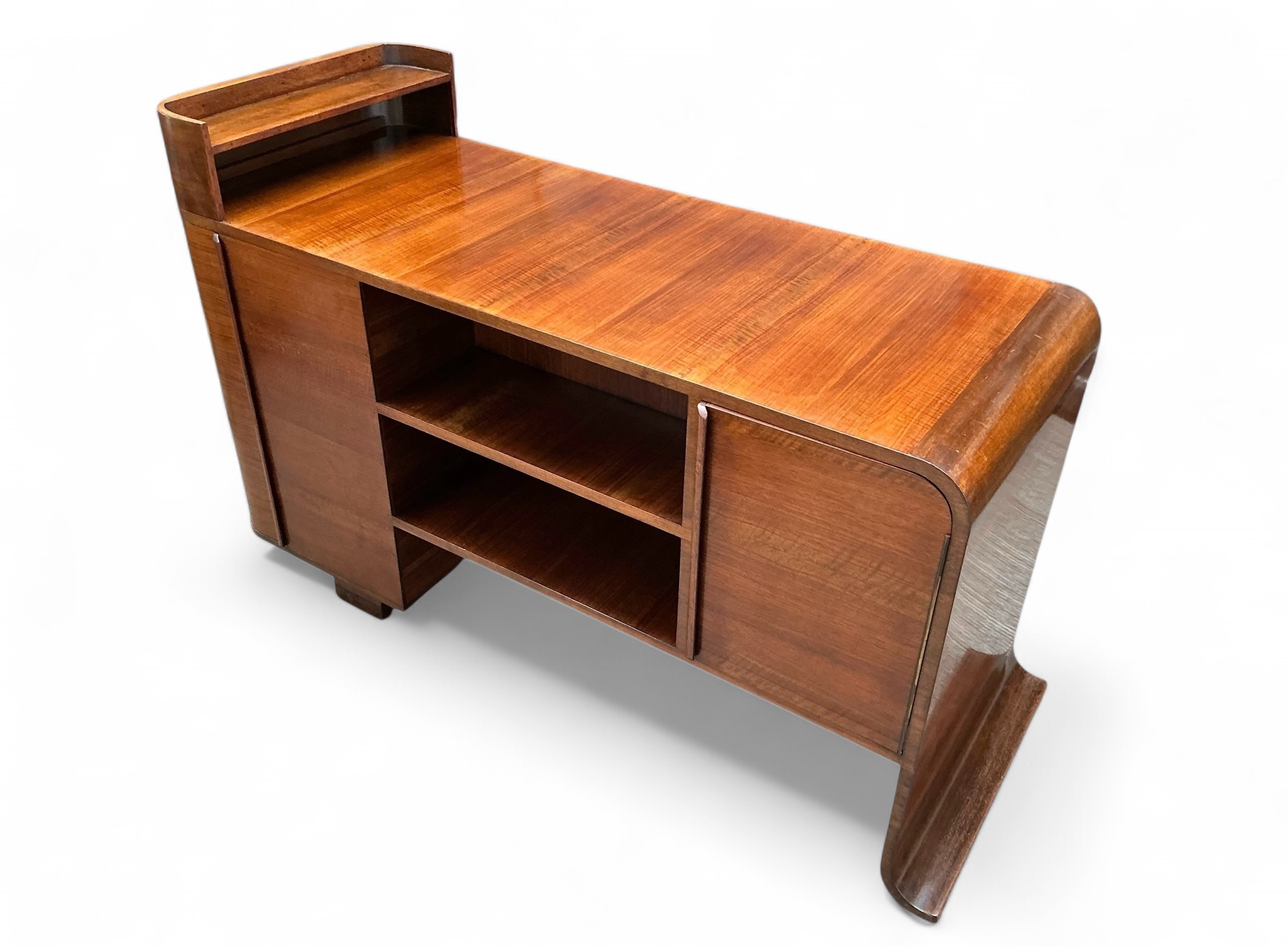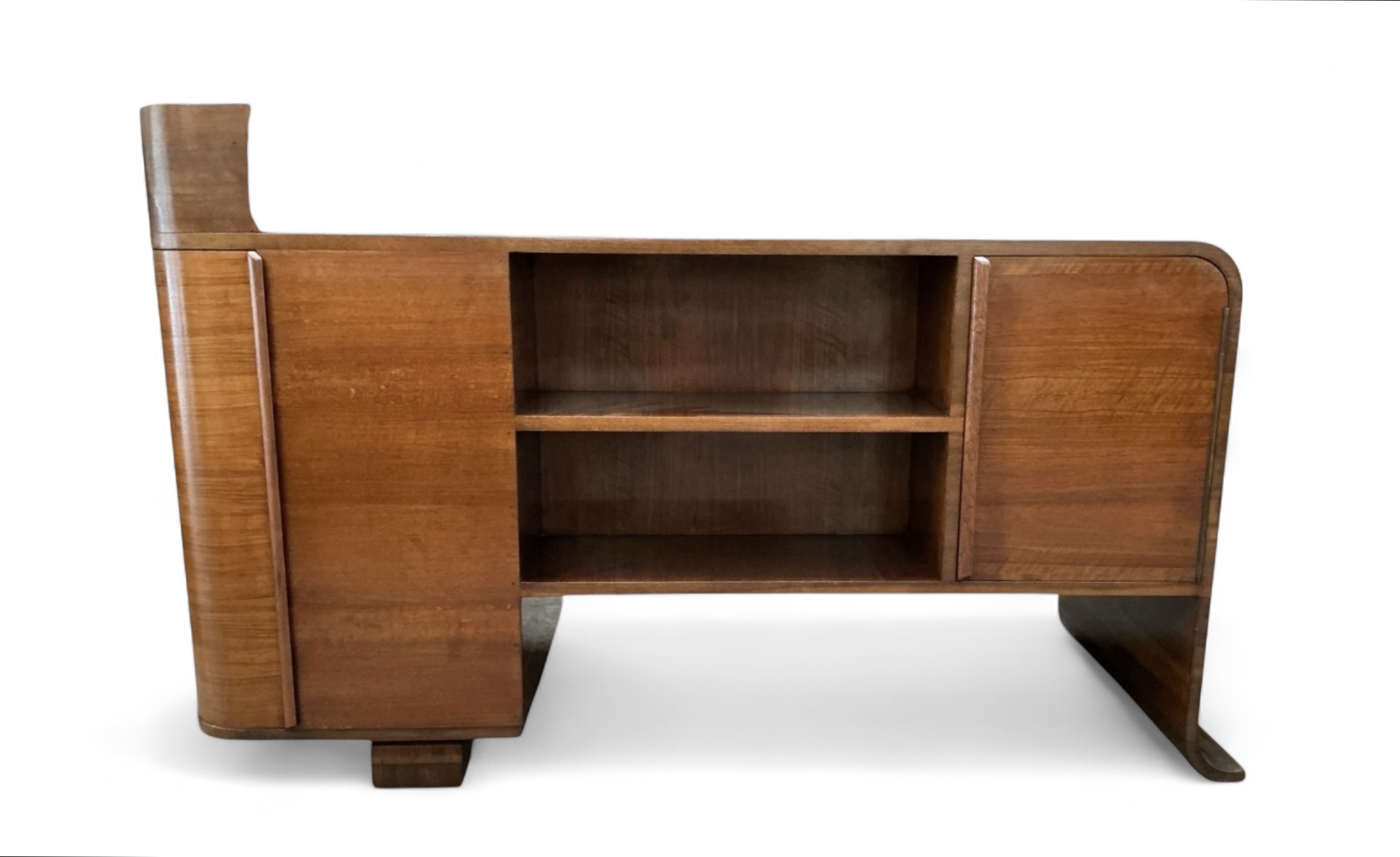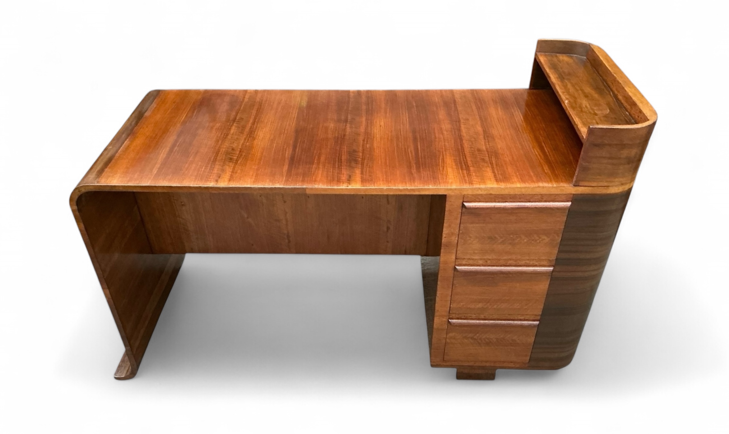 Art Deco desk in walnut with three drawers to the front and an open shelf to the desk top. To the curved side, a cupboard with three shelves and to the back a further cupboard and two open shelves, ideal for books or display. Attractive curved detail to the foot of one side and a curved side to the other.