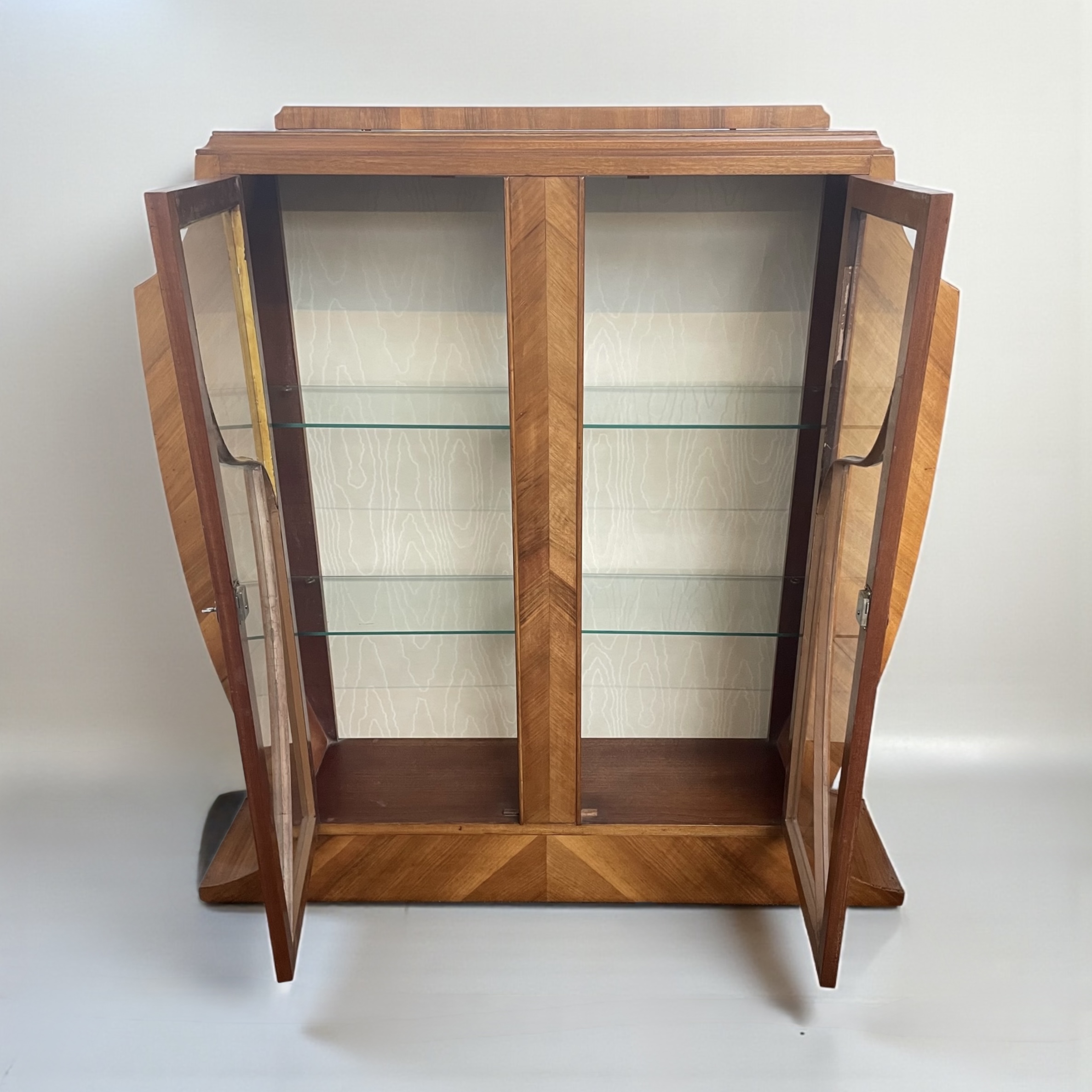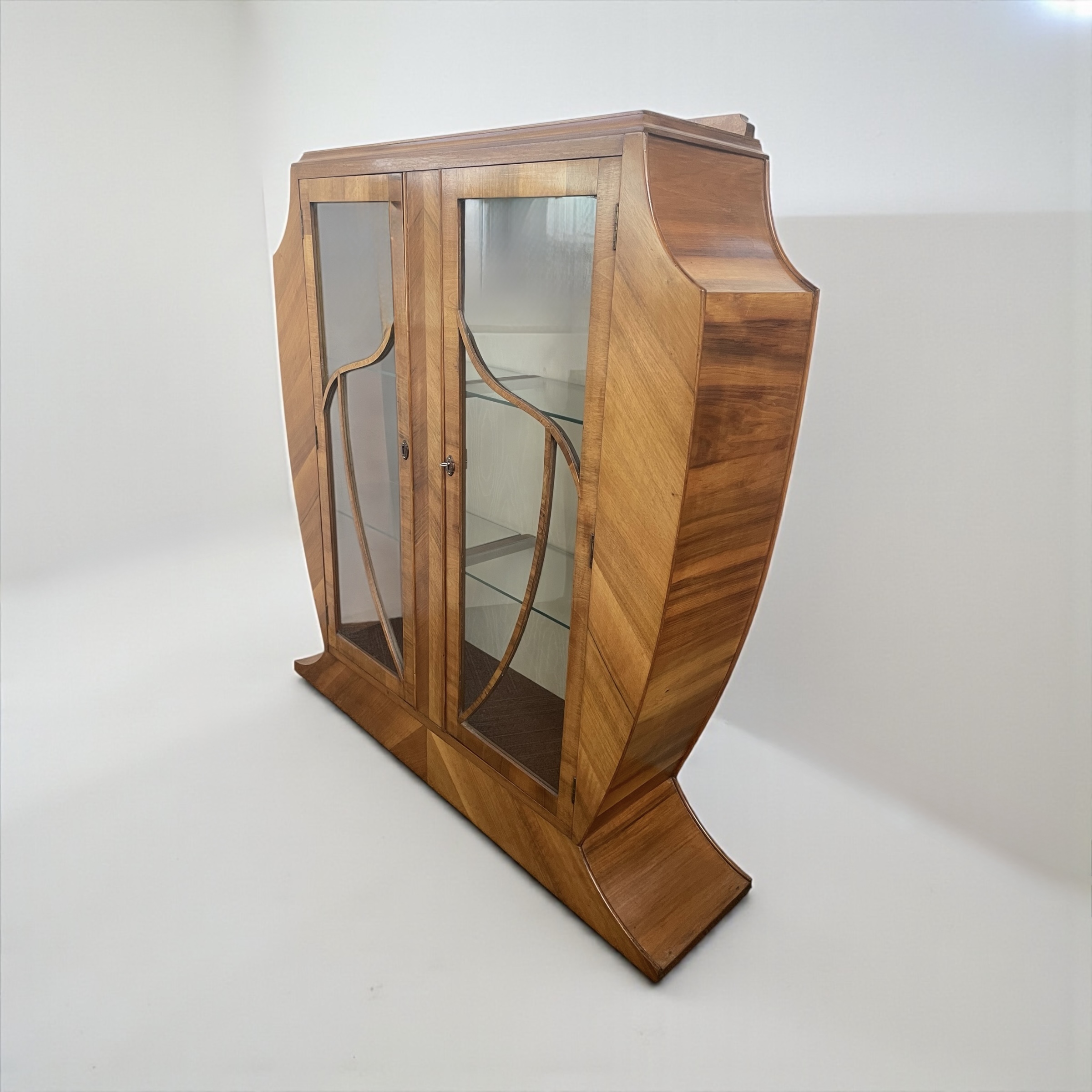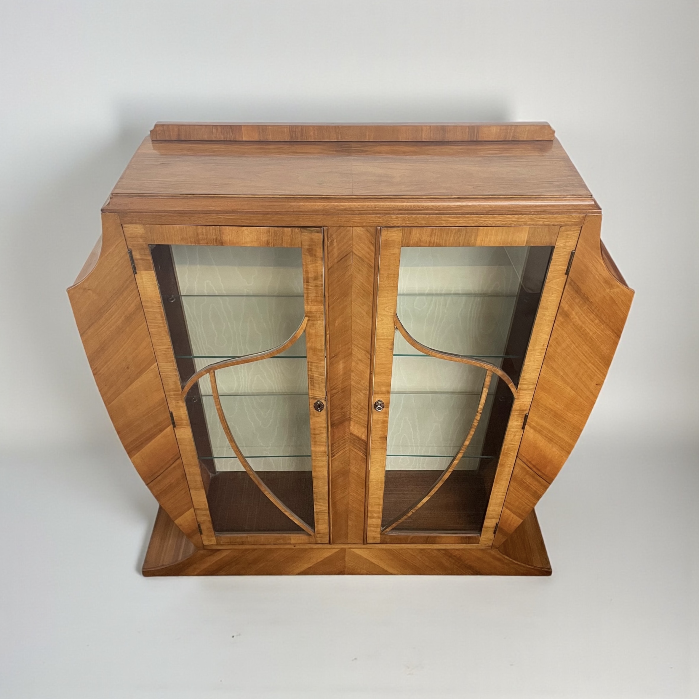 Art Deco display cabinet in walnut. The glazed doors with astragal detail, housing three shelves, two of which are glass. The cabinet is lined in a satin-effect paper and has its working lock and key.