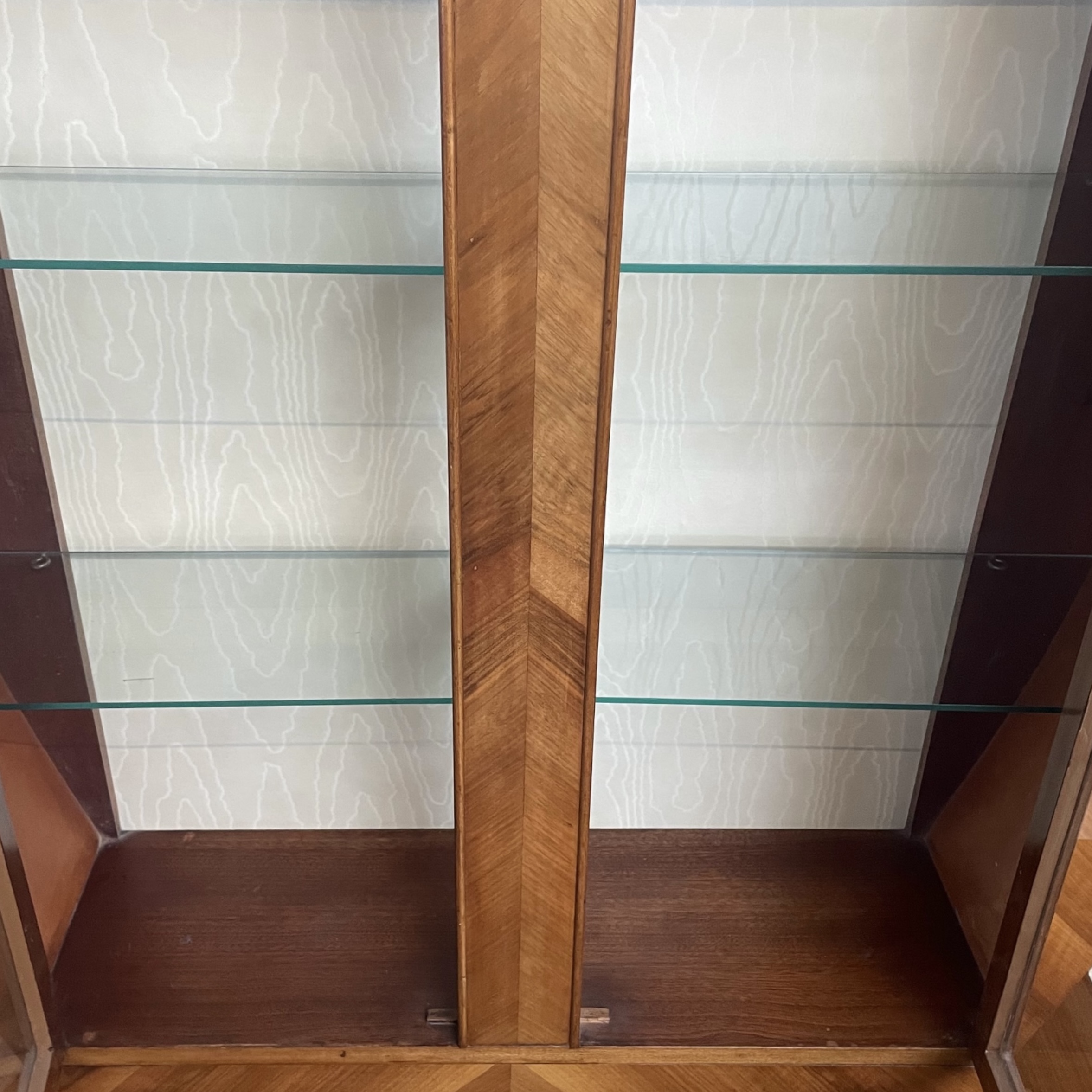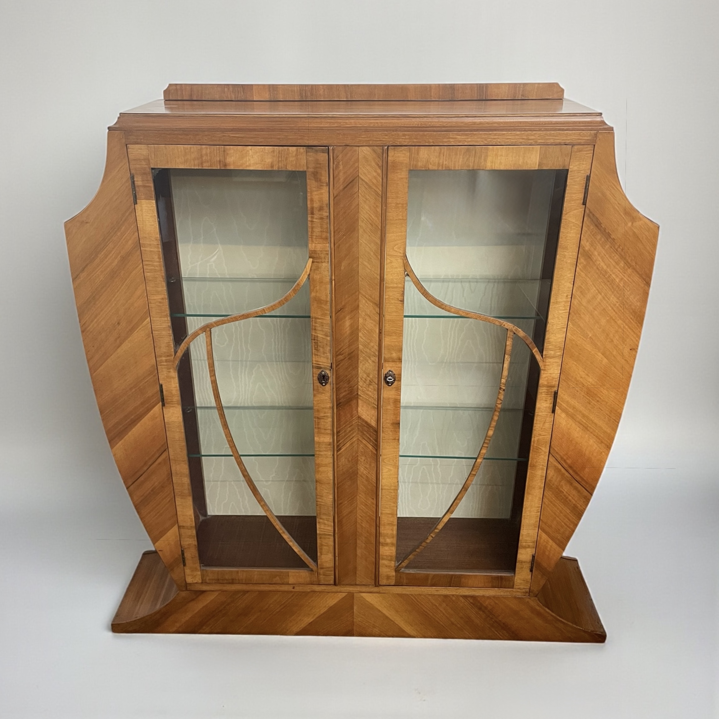 Art Deco display cabinet in walnut. The glazed doors with astragal detail, housing three shelves, two of which are glass. The cabinet is lined in a satin-effect paper and has its working lock and key.