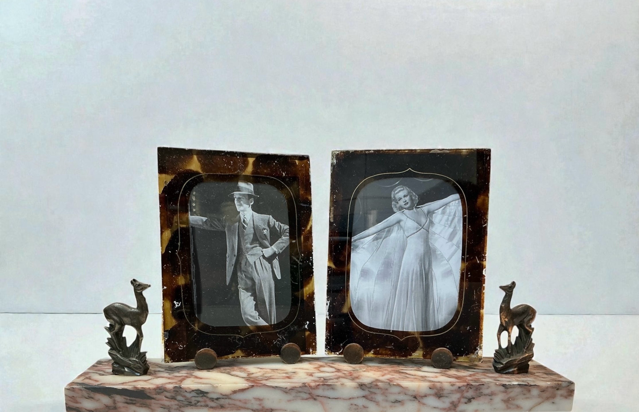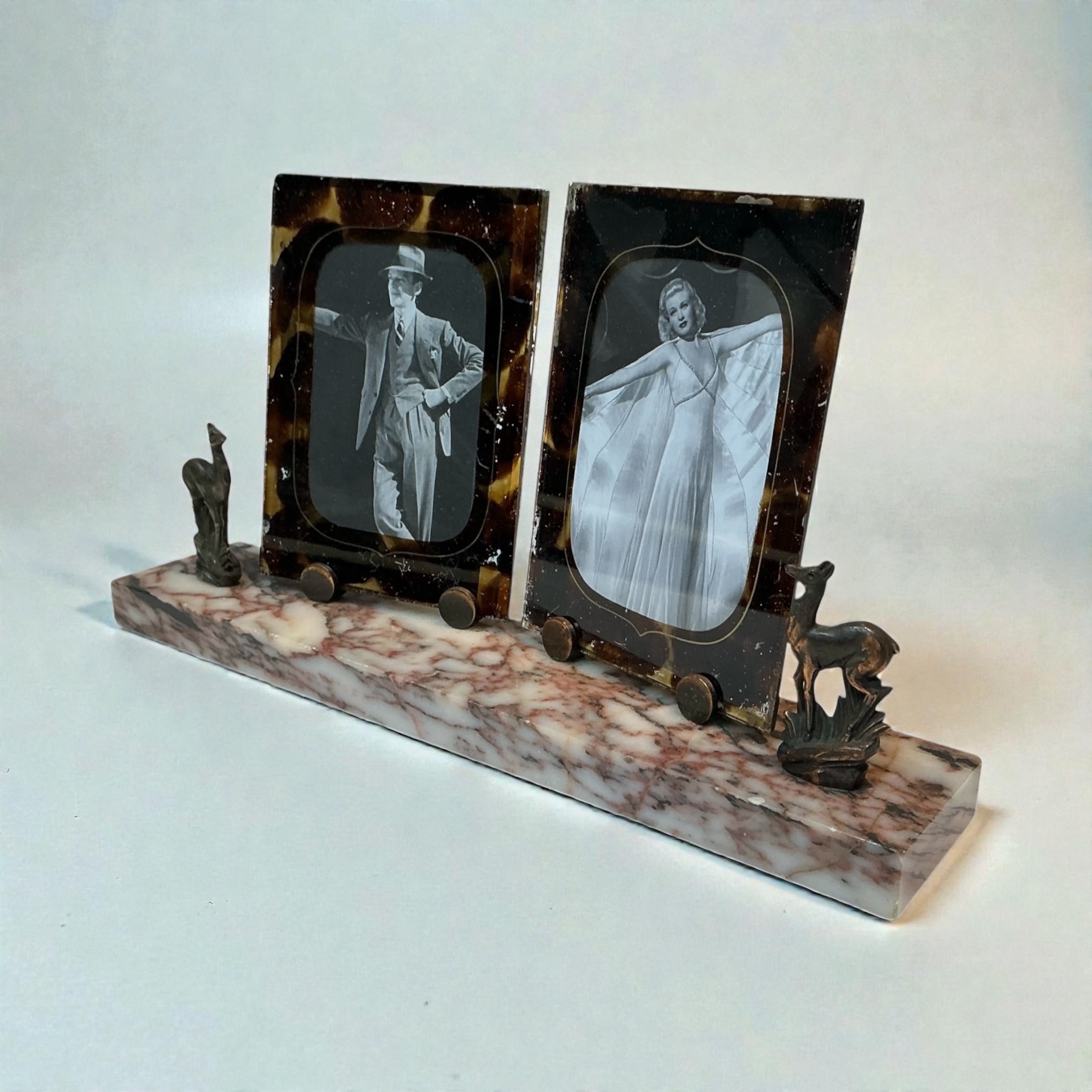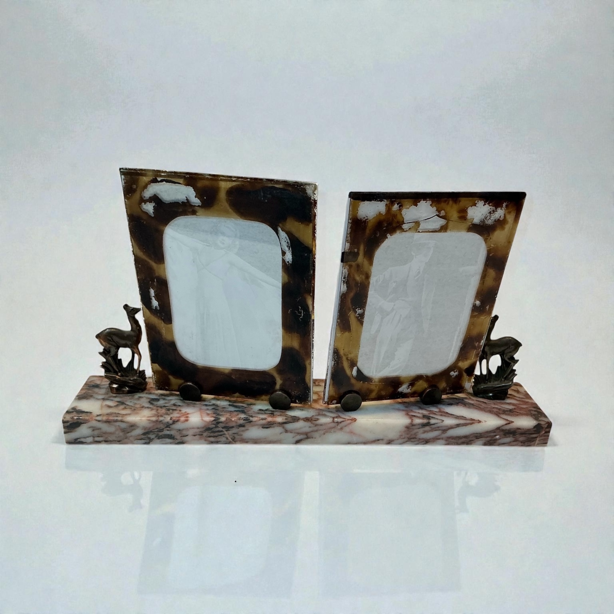 An unusual French Art Deco Double Photograph Frame. The two photo frames in tortoiseshell effect glass panels, mounted on a red veined rectangular base, with a bronze effect fawn stood to each side.