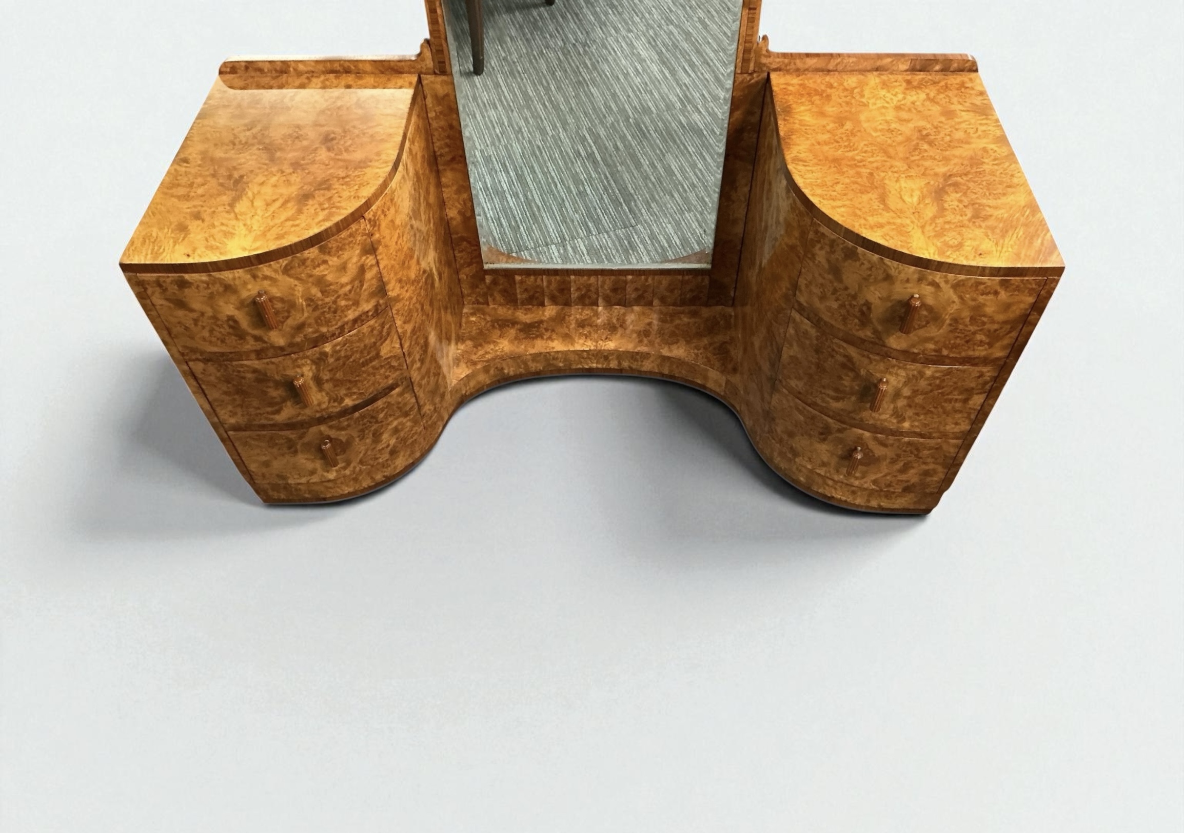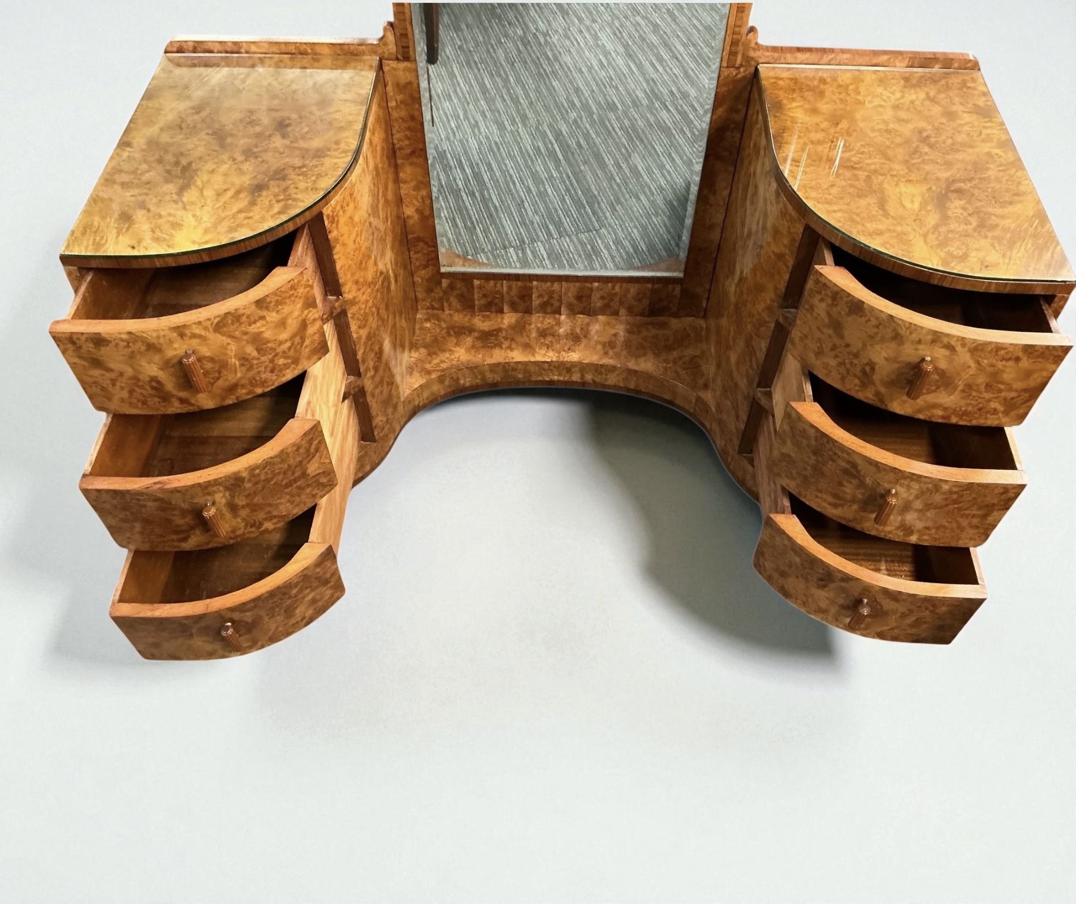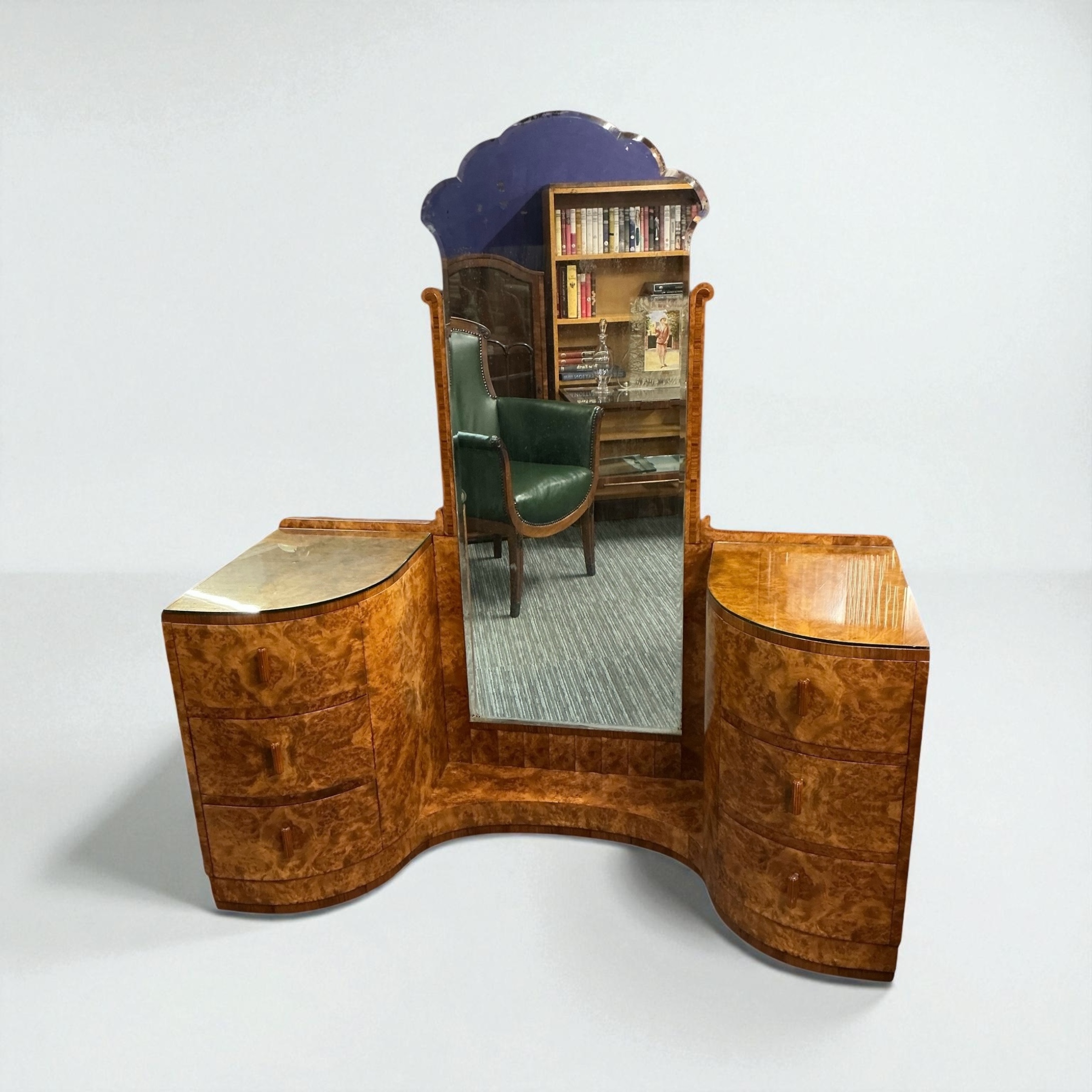 Art Deco dressing table by Harry and Lou Epstein in burr walnut and a contrasting straight grained walnut. This rare design with three curved drawers to each side, each with elongated, ribbed phenolic handles. The centre, with a curved and fluted base with a full length bevelled mirror, with curved detailing to the top.