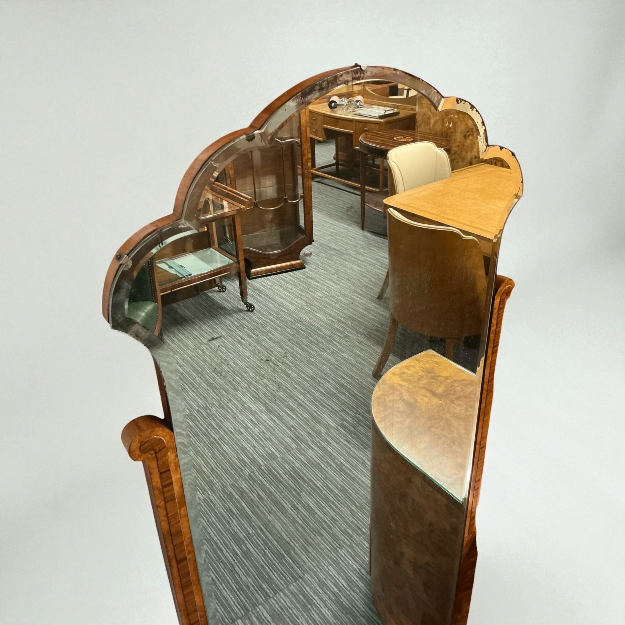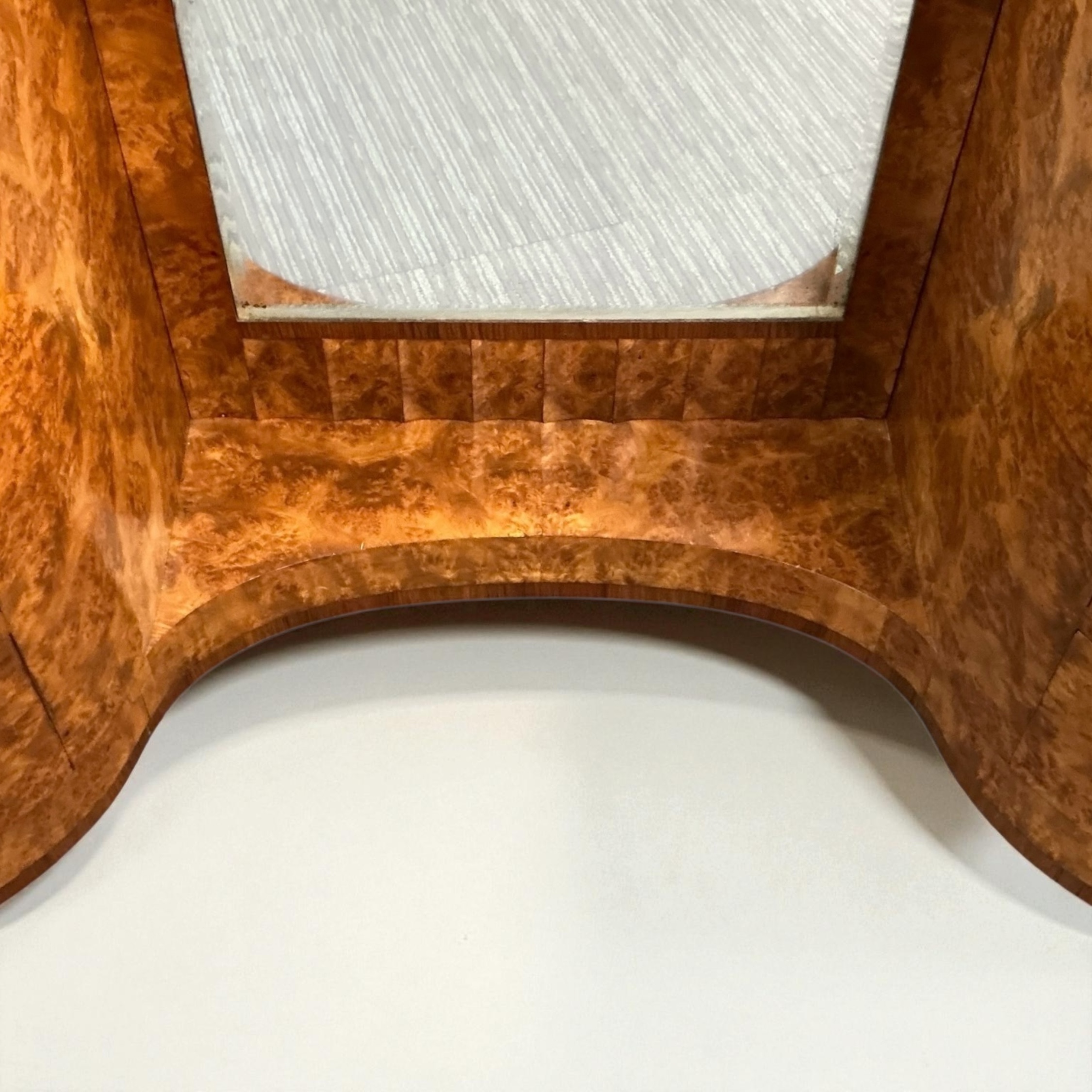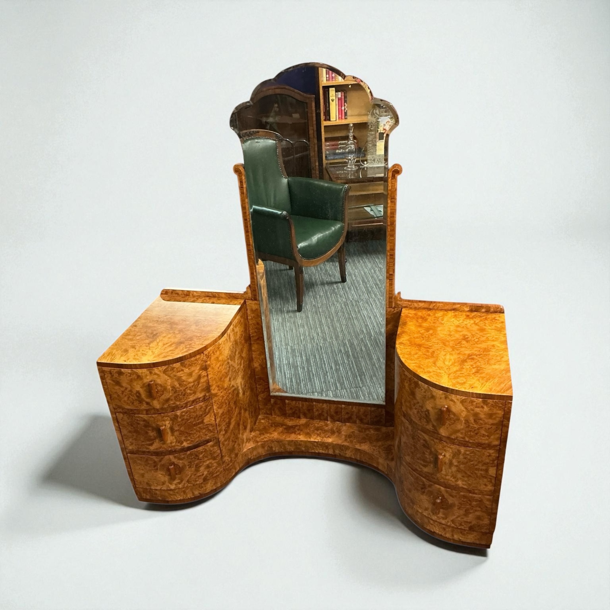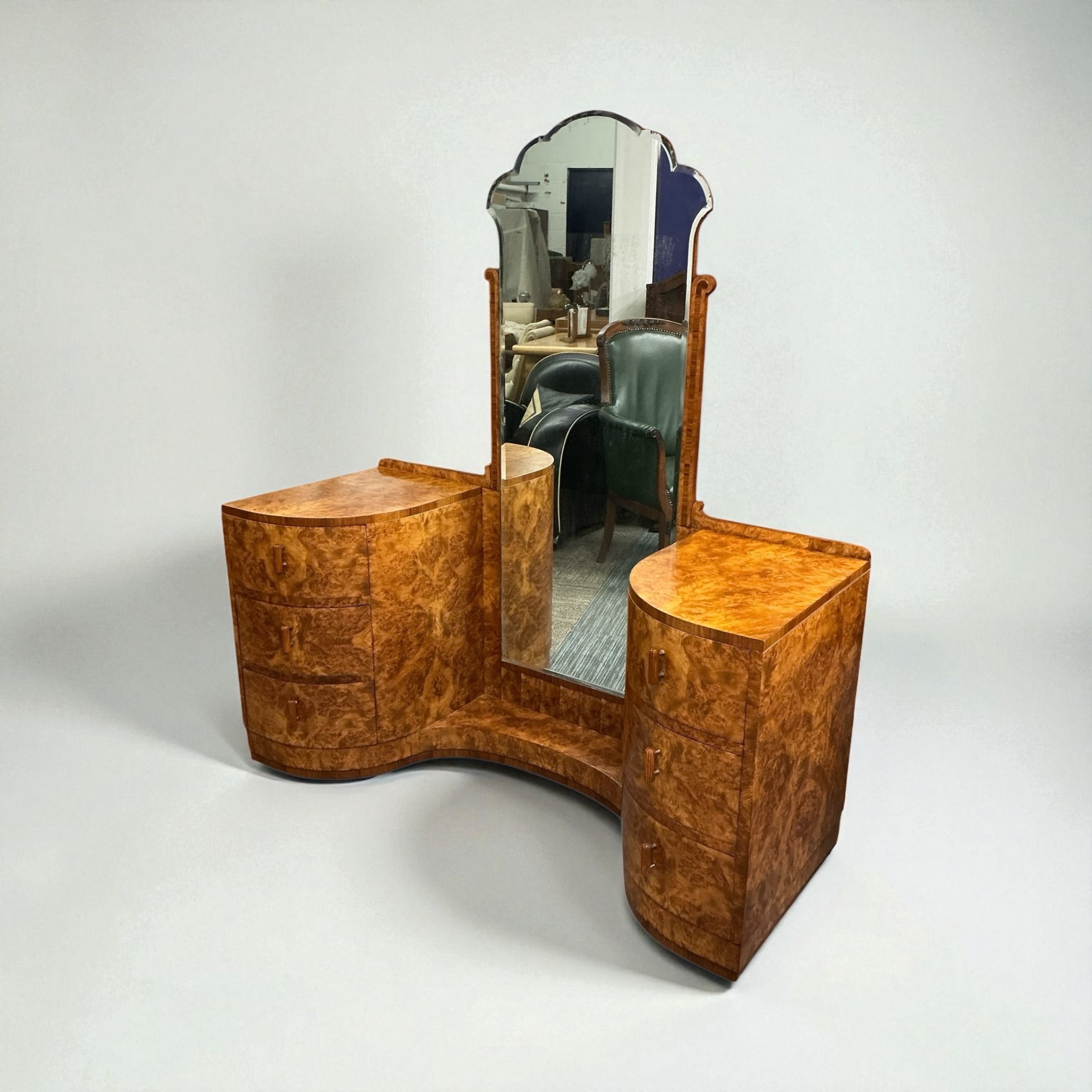 Art Deco dressing table by Harry and Lou Epstein in burr walnut and a contrasting straight grained walnut. This rare design with three curved drawers to each side, each with elongated, ribbed phenolic handles. The centre, with a curved and fluted base with a full length bevelled mirror, with curved detailing to the top.