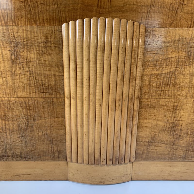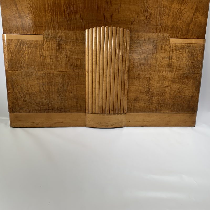 This quality Epstein double bed comprises of a maple and birch veneered head and footboard, with a metal frame to support a base and mattress. The footboard has the matching central panel details of the wardrobes. Other items of this suite are listed separately. In overall very good condition.
