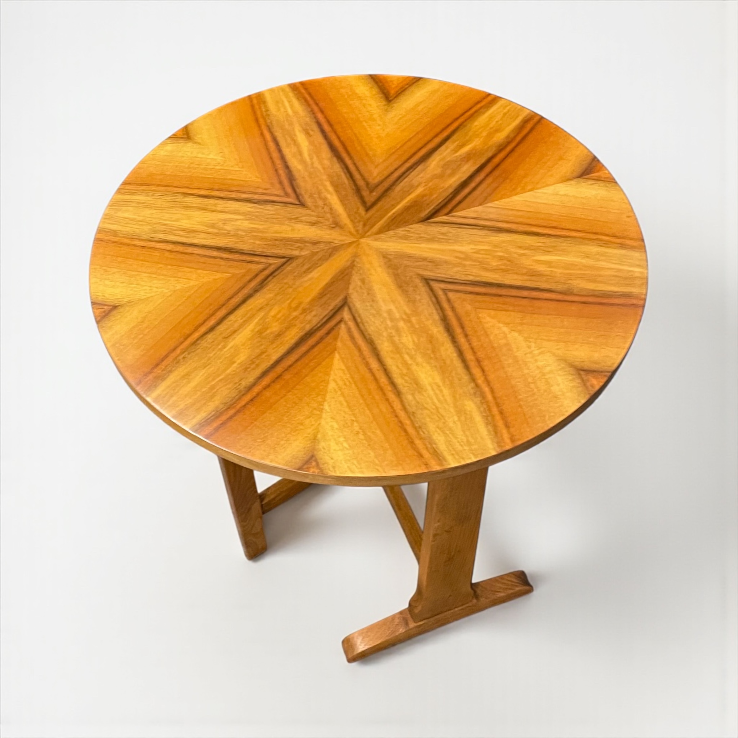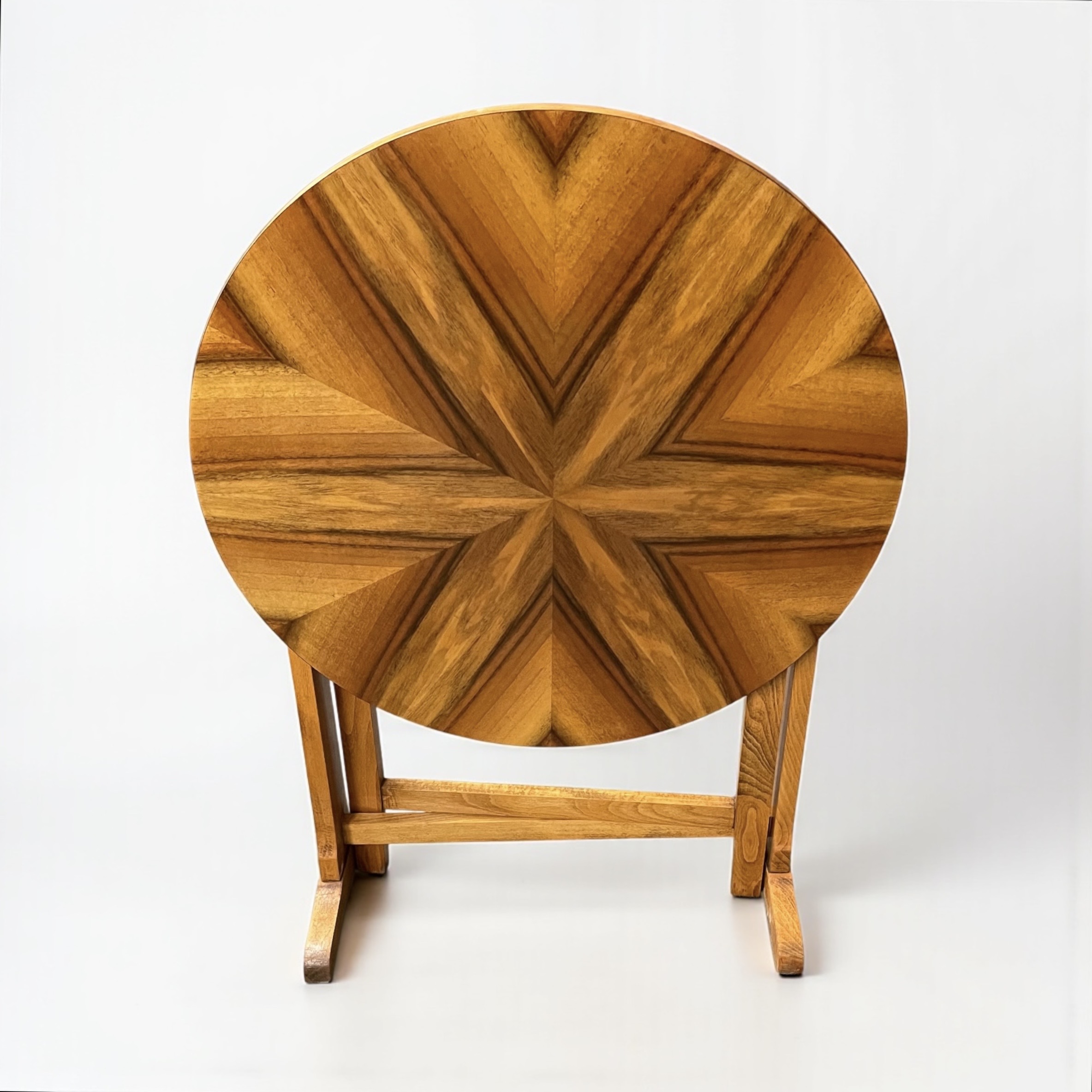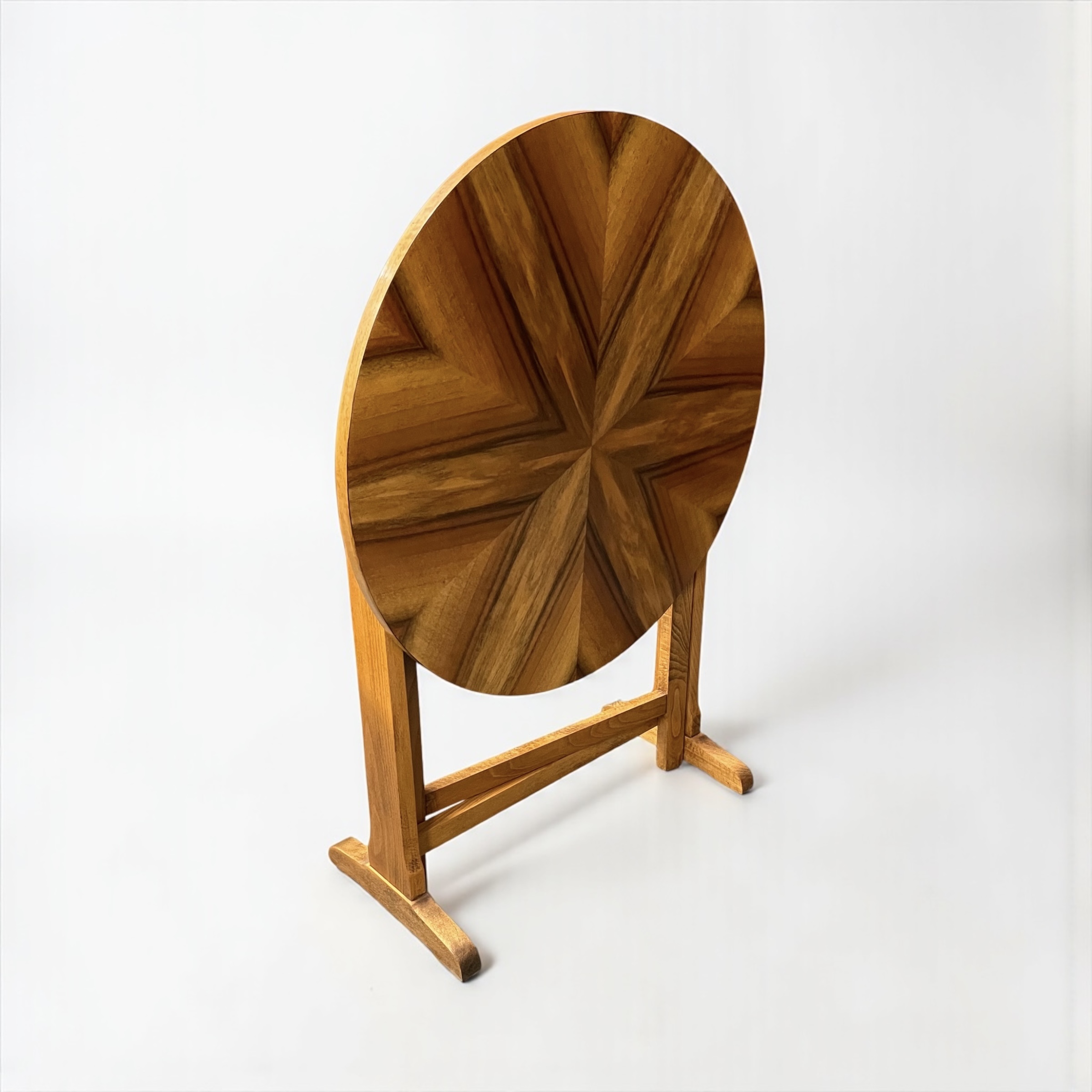 A good quality Art Deco tilt top table, a versatile, space-saving piece of furniture, with a hinged top that pivots from horizontal to vertical for easy storage. The circular top, with a striking walnut pattern and the folding legs in solid oak.
