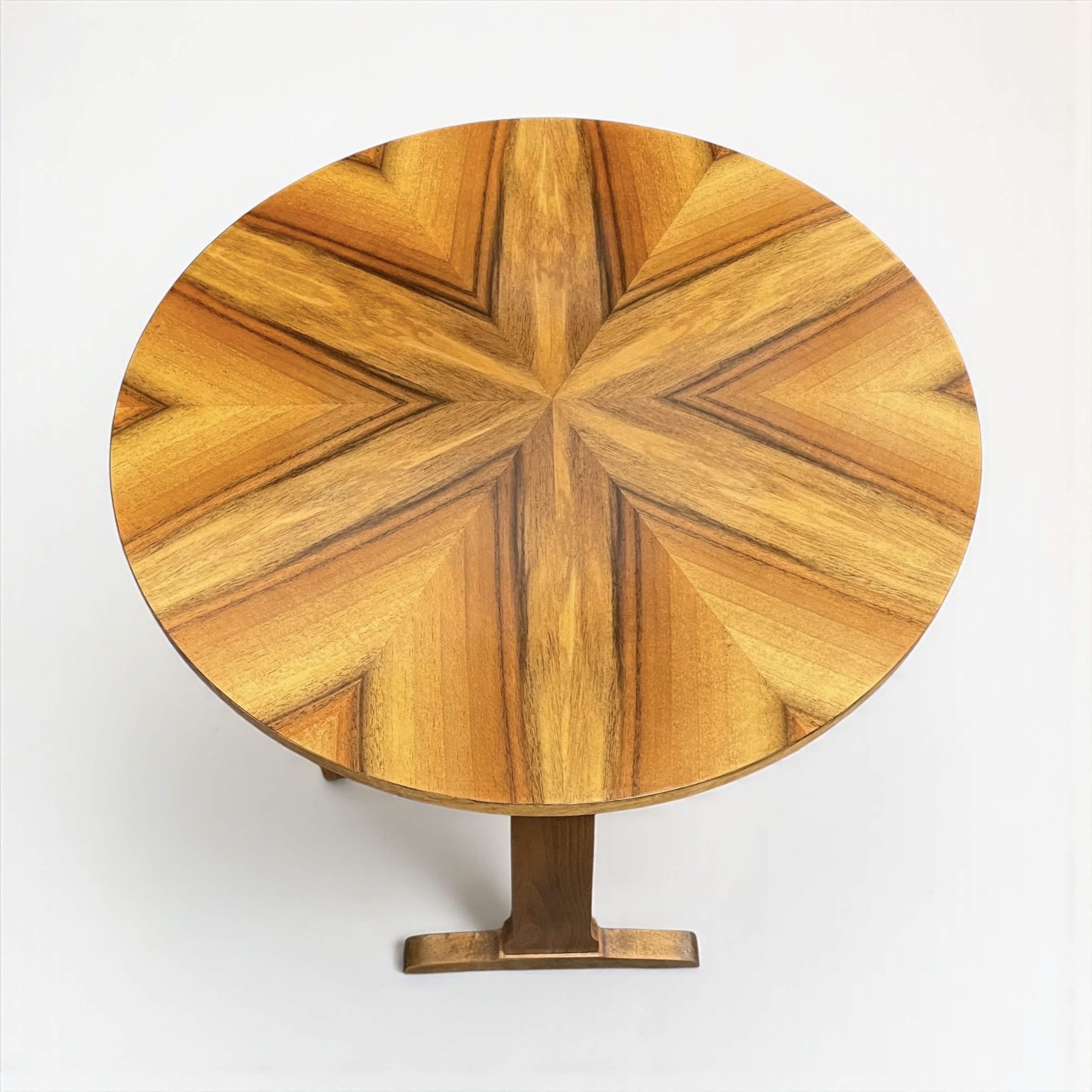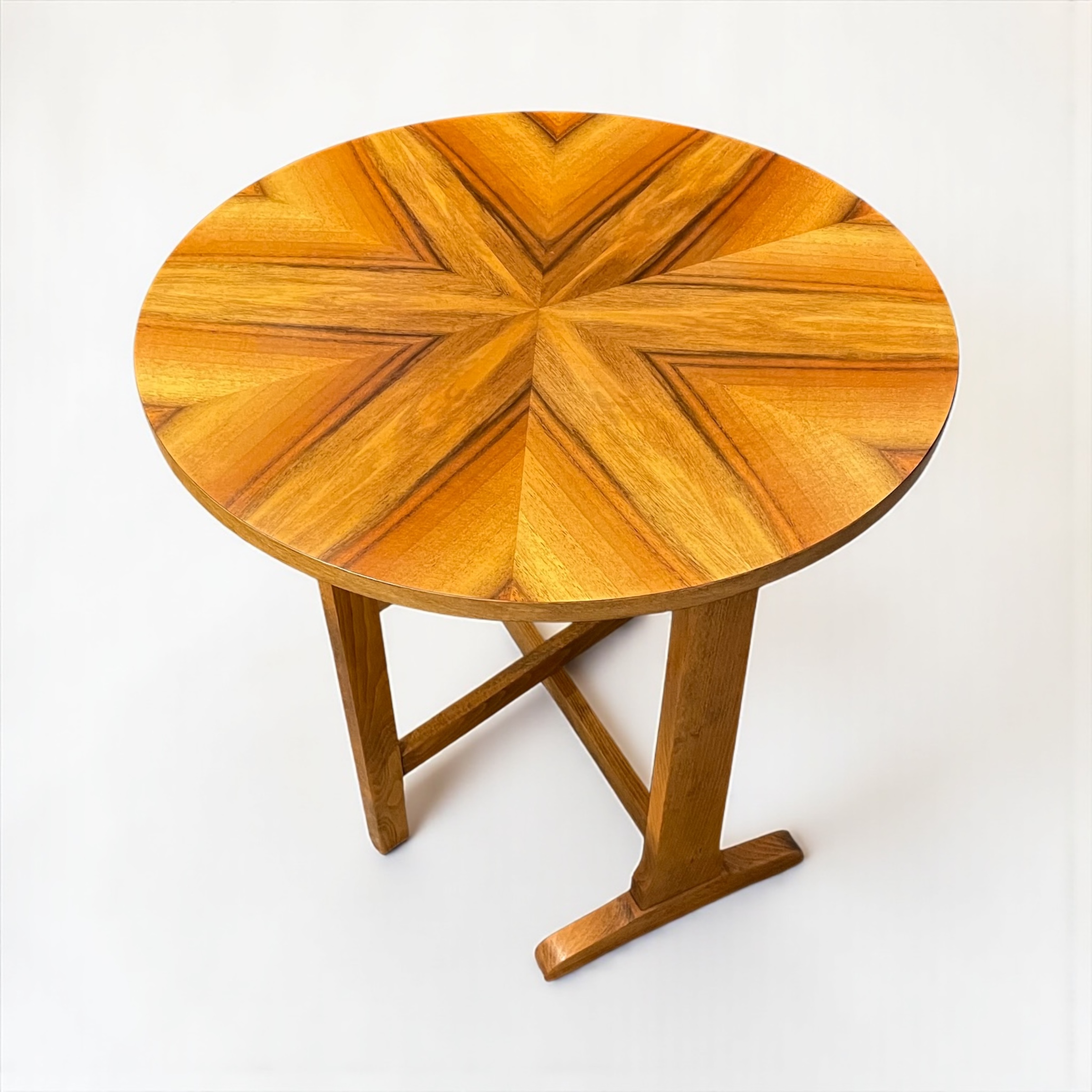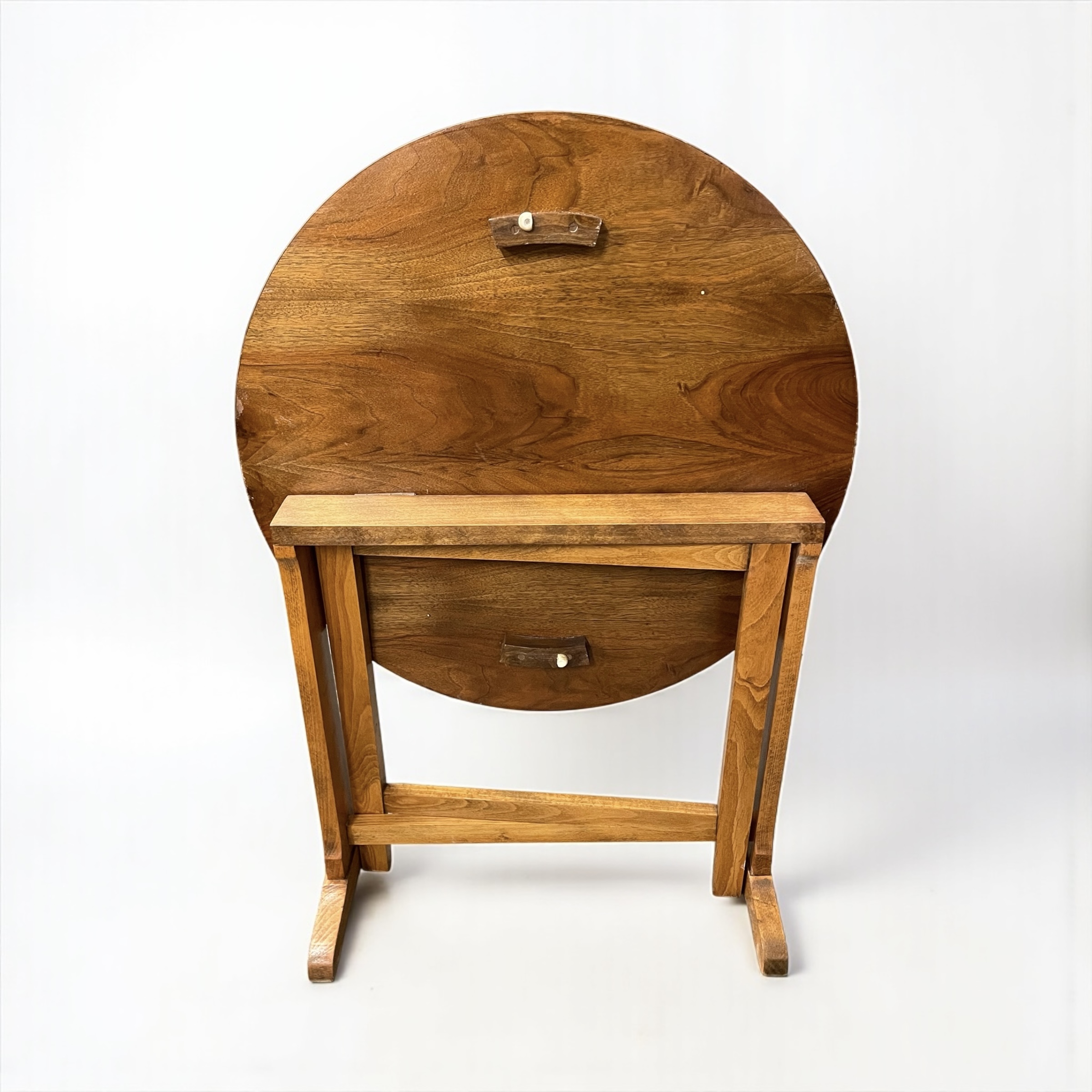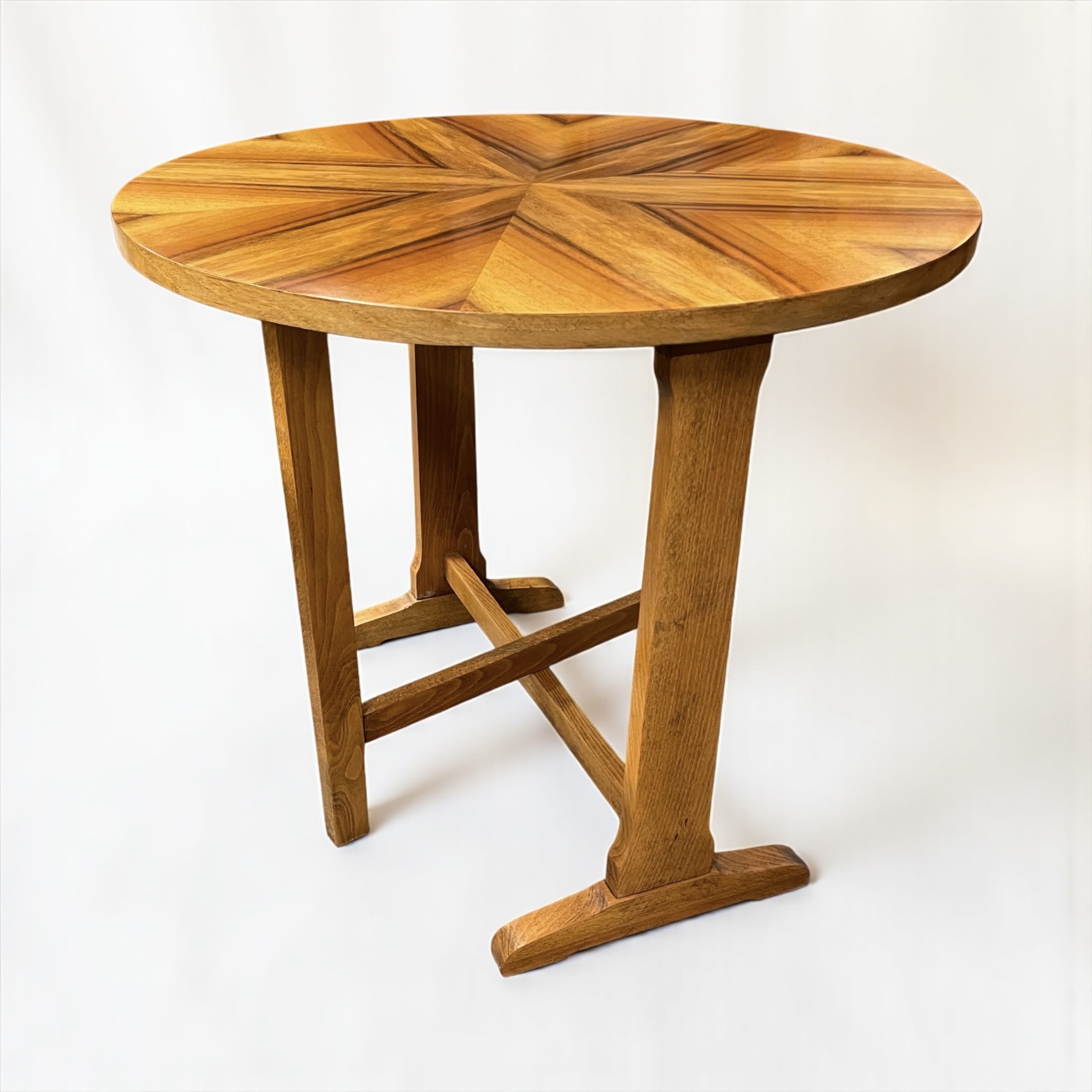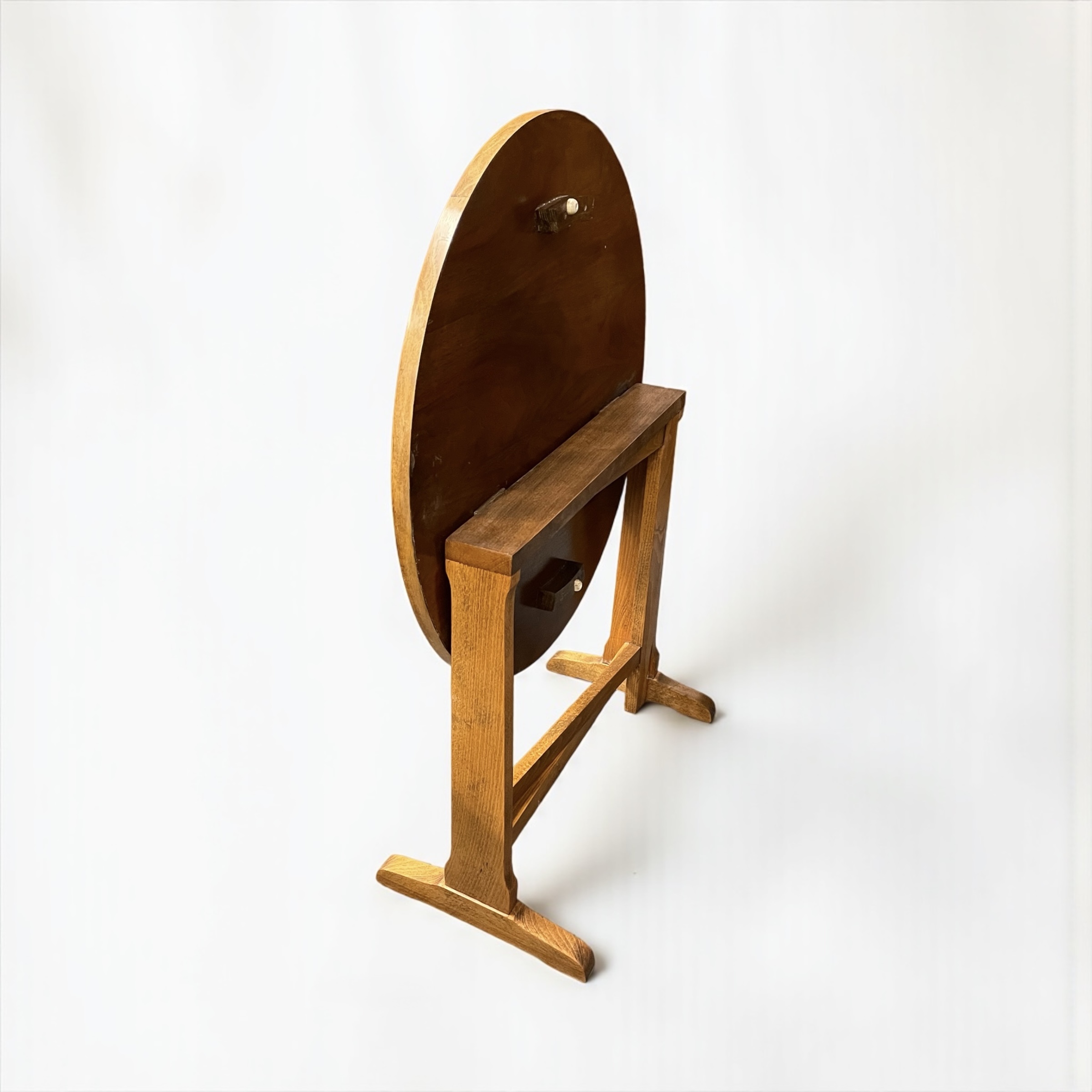 A good quality Art Deco tilt top table, a versatile, space-saving piece of furniture, with a hinged top that pivots from horizontal to vertical for easy storage. The circular top, with a striking walnut pattern and the folding legs in solid oak.
