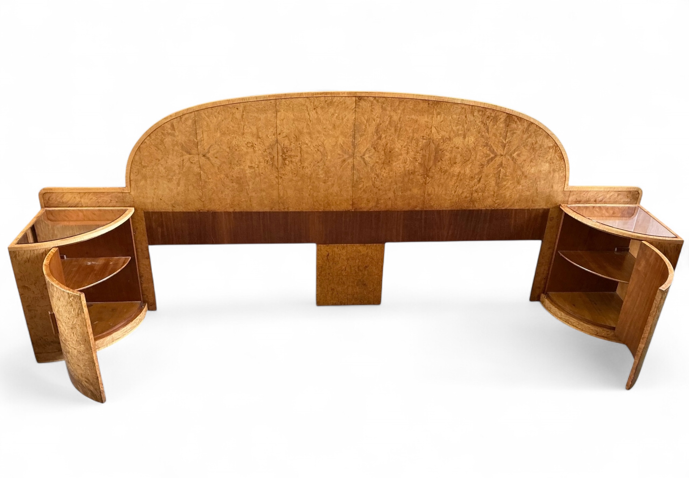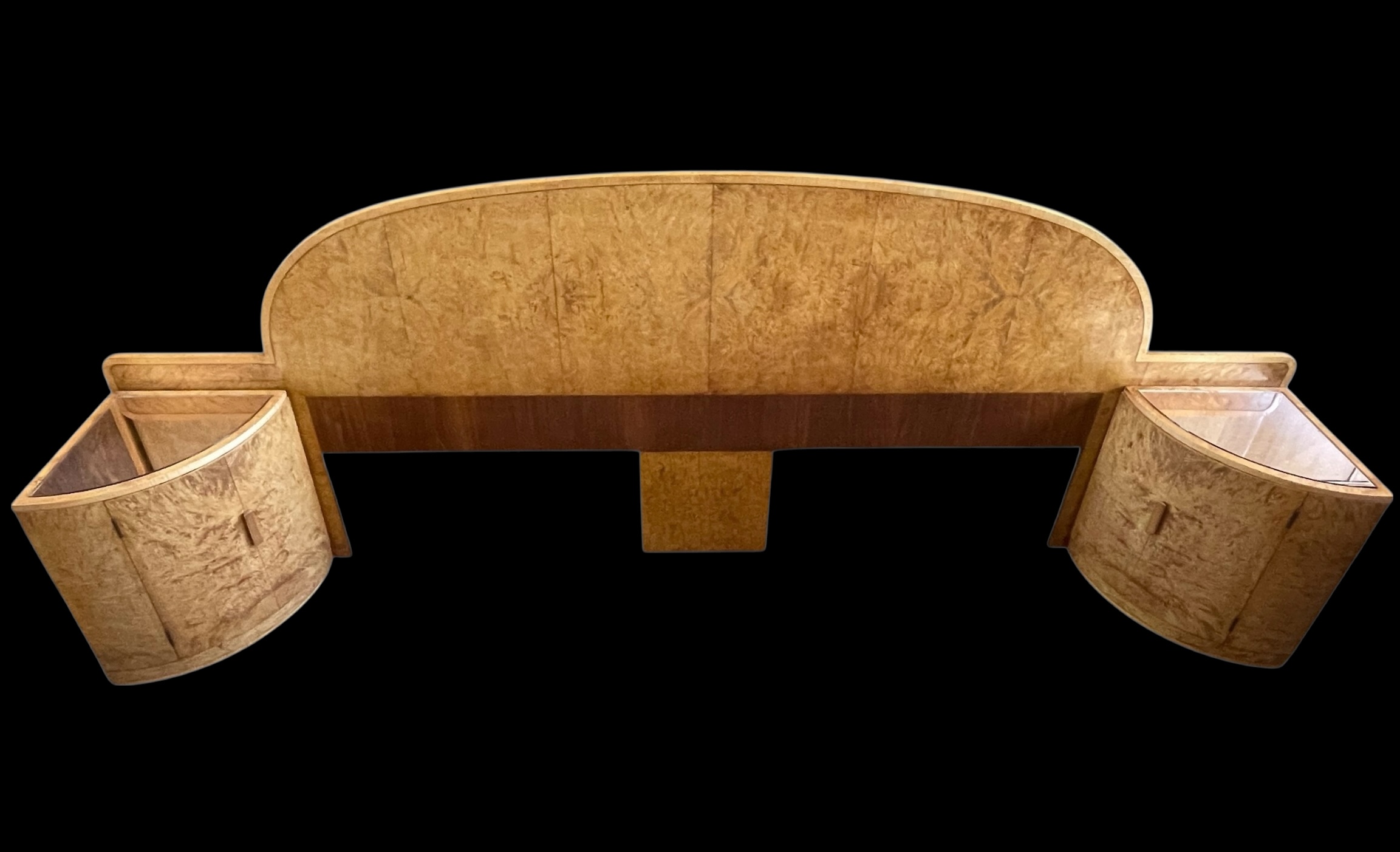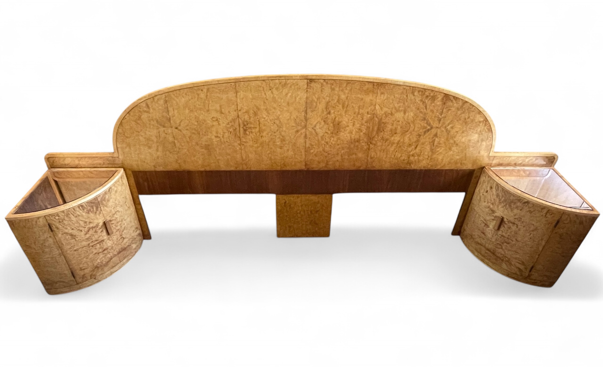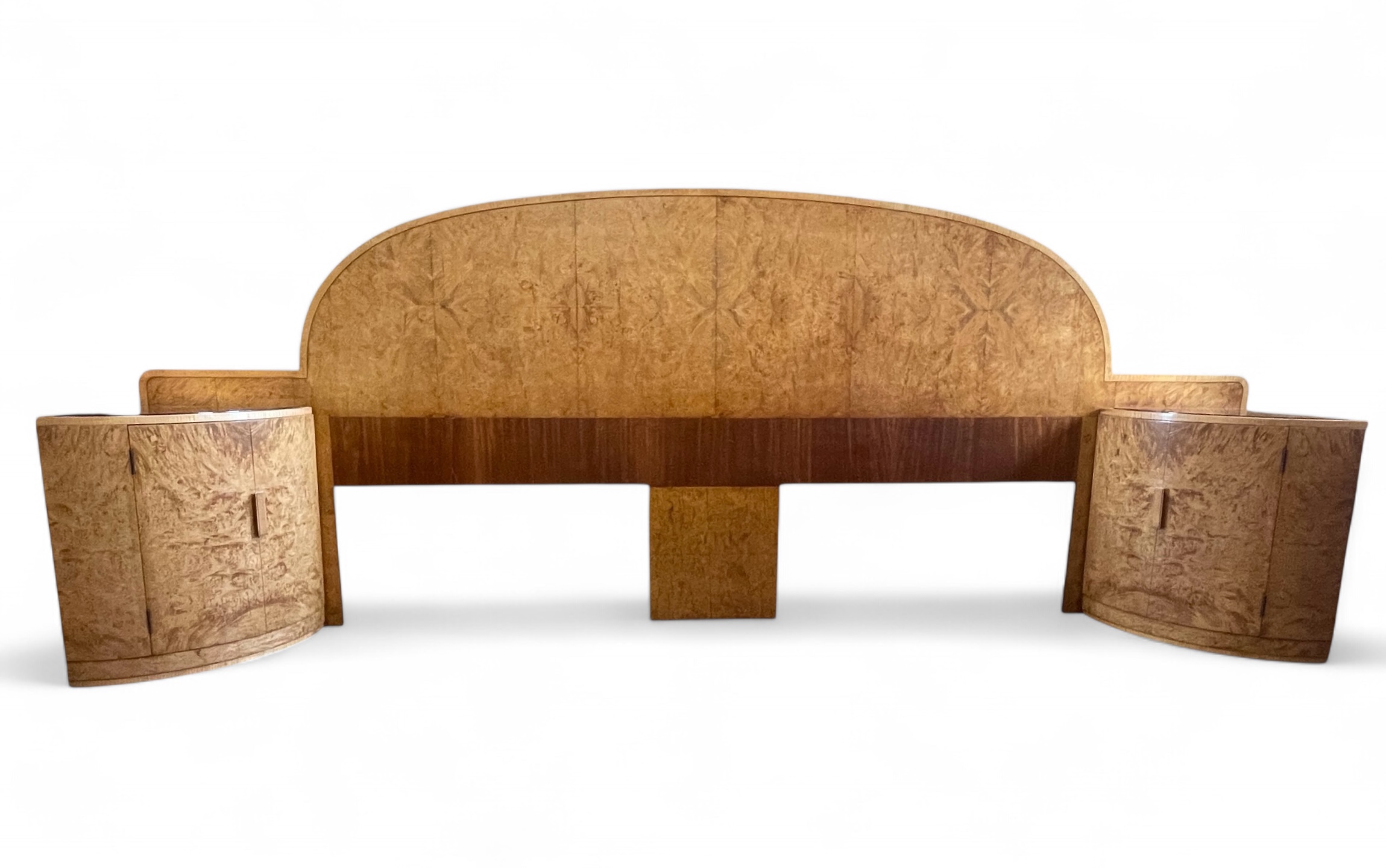 Art Deco headboard for a super king (6ft) bed with attached bedside cabinets in blond walnut. Curved detailing to the top of the headboard and both bedside cabinets curved with inset copper glass tops. The original copper glass tops with some age related marks commensurate with age. Each cabinet curved door opens to reveal three shelves.