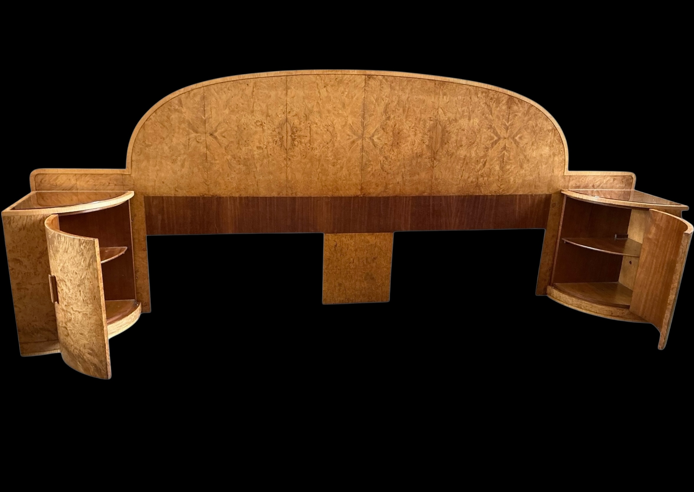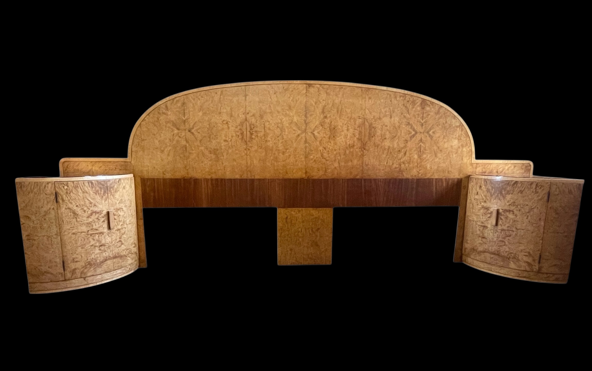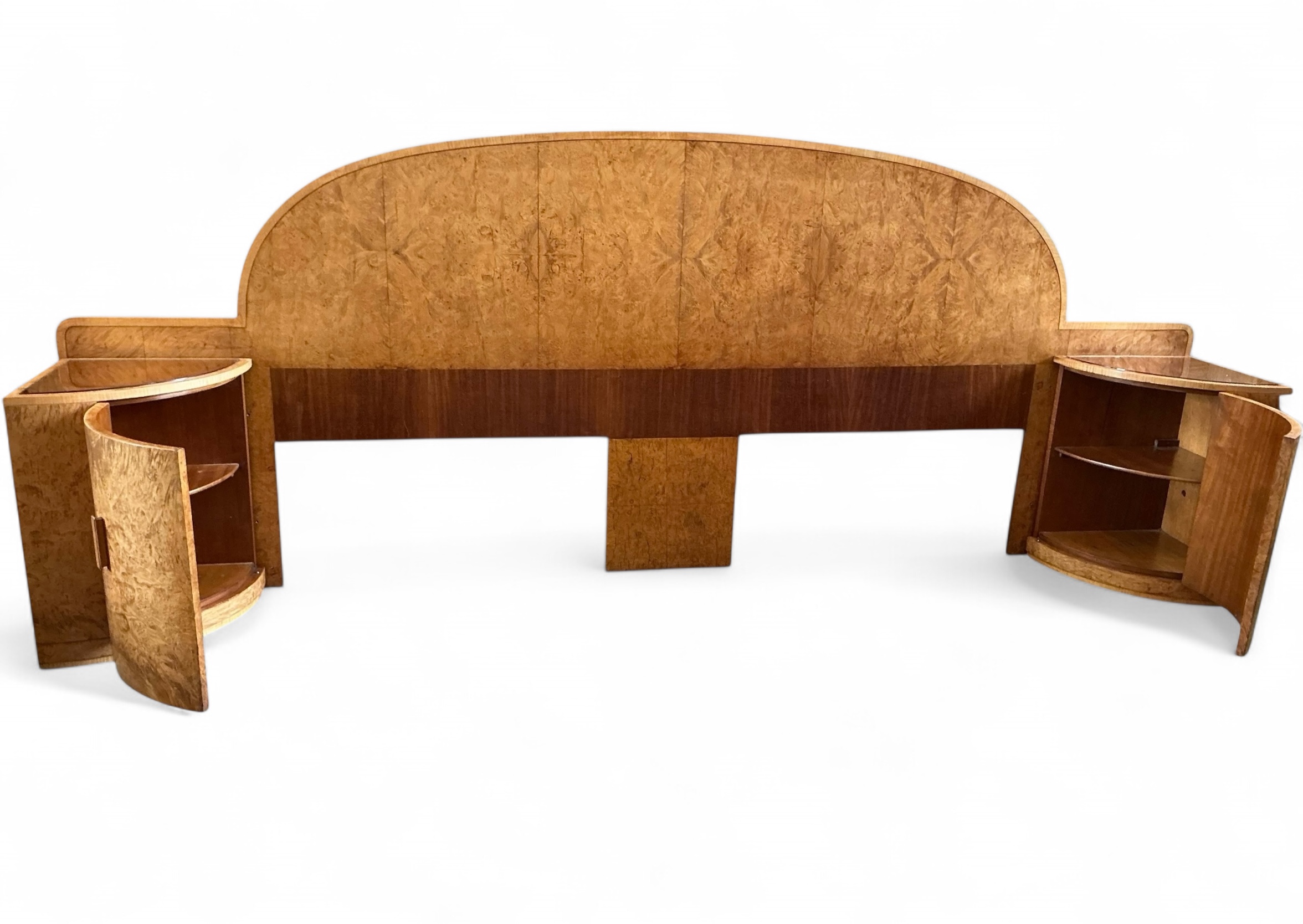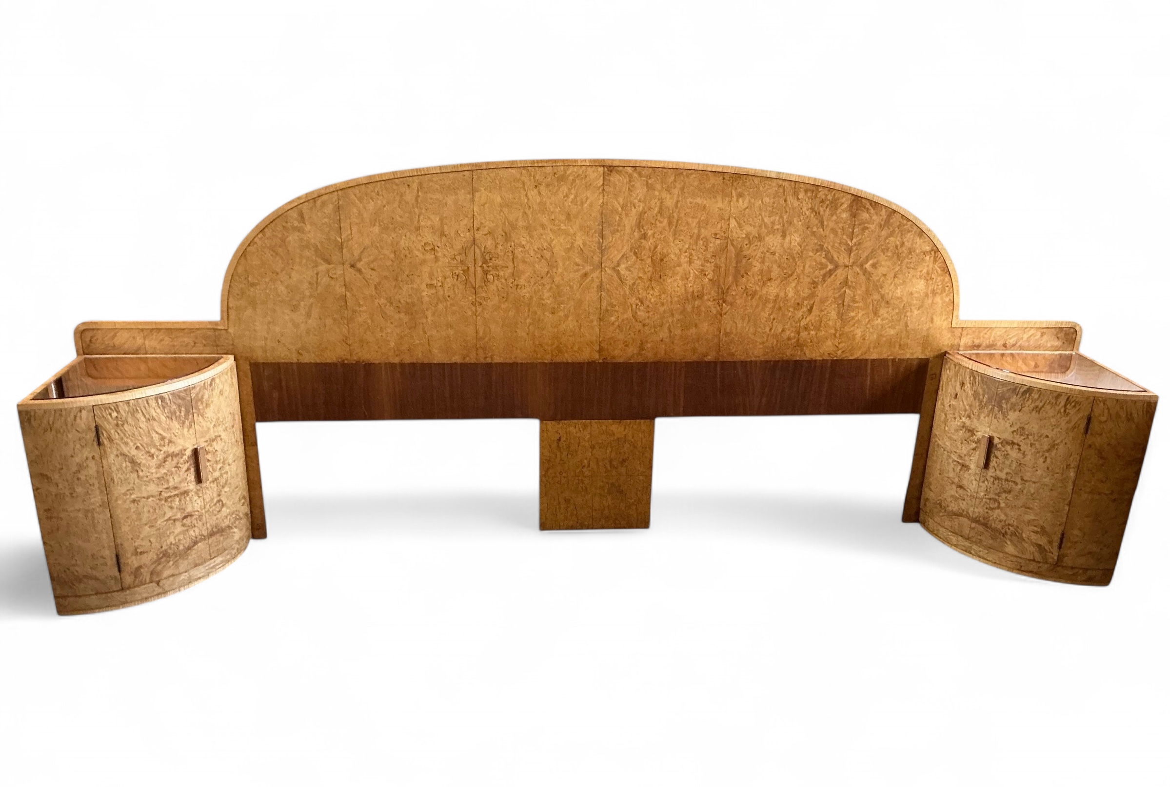 Art Deco headboard for a super king (6ft) bed with attached bedside cabinets in blond walnut. Curved detailing to the top of the headboard and both bedside cabinets curved with inset copper glass tops. The original copper glass tops with some age related marks commensurate with age. Each cabinet curved door opens to reveal three shelves.
