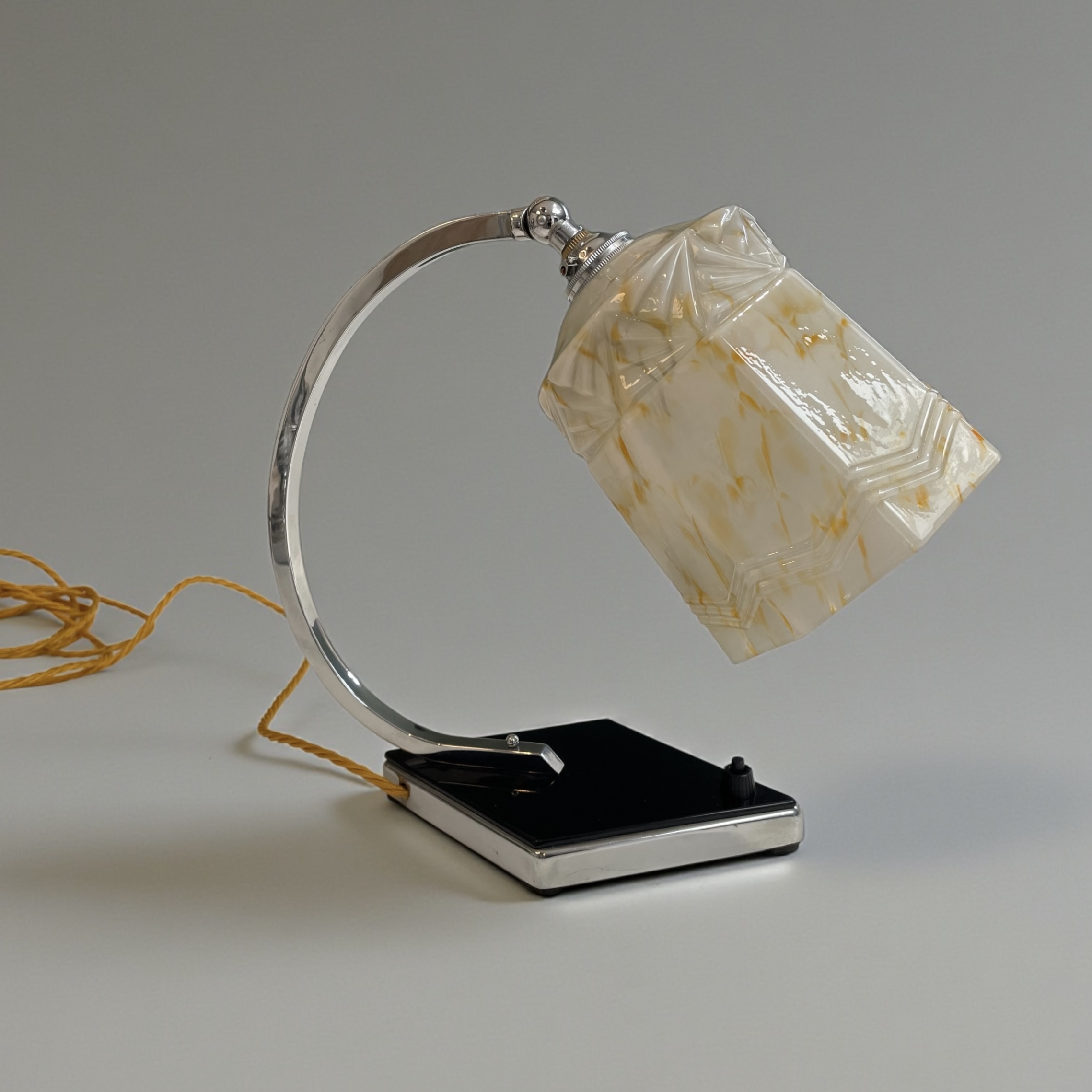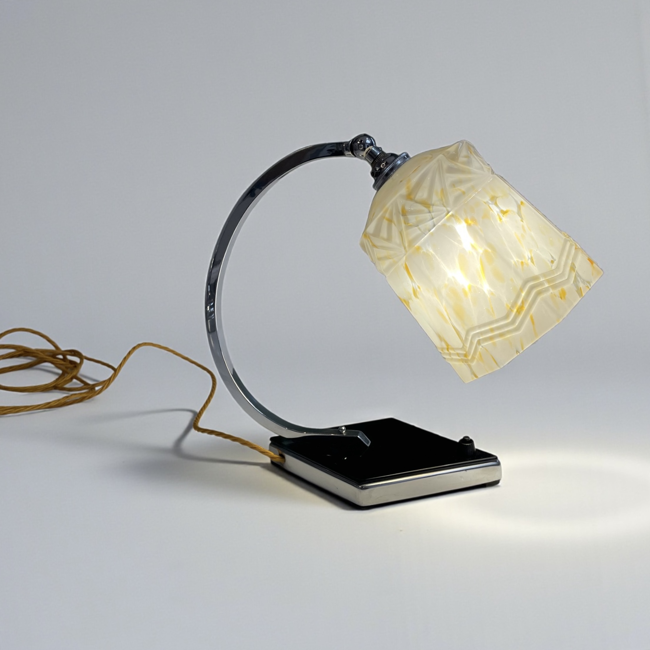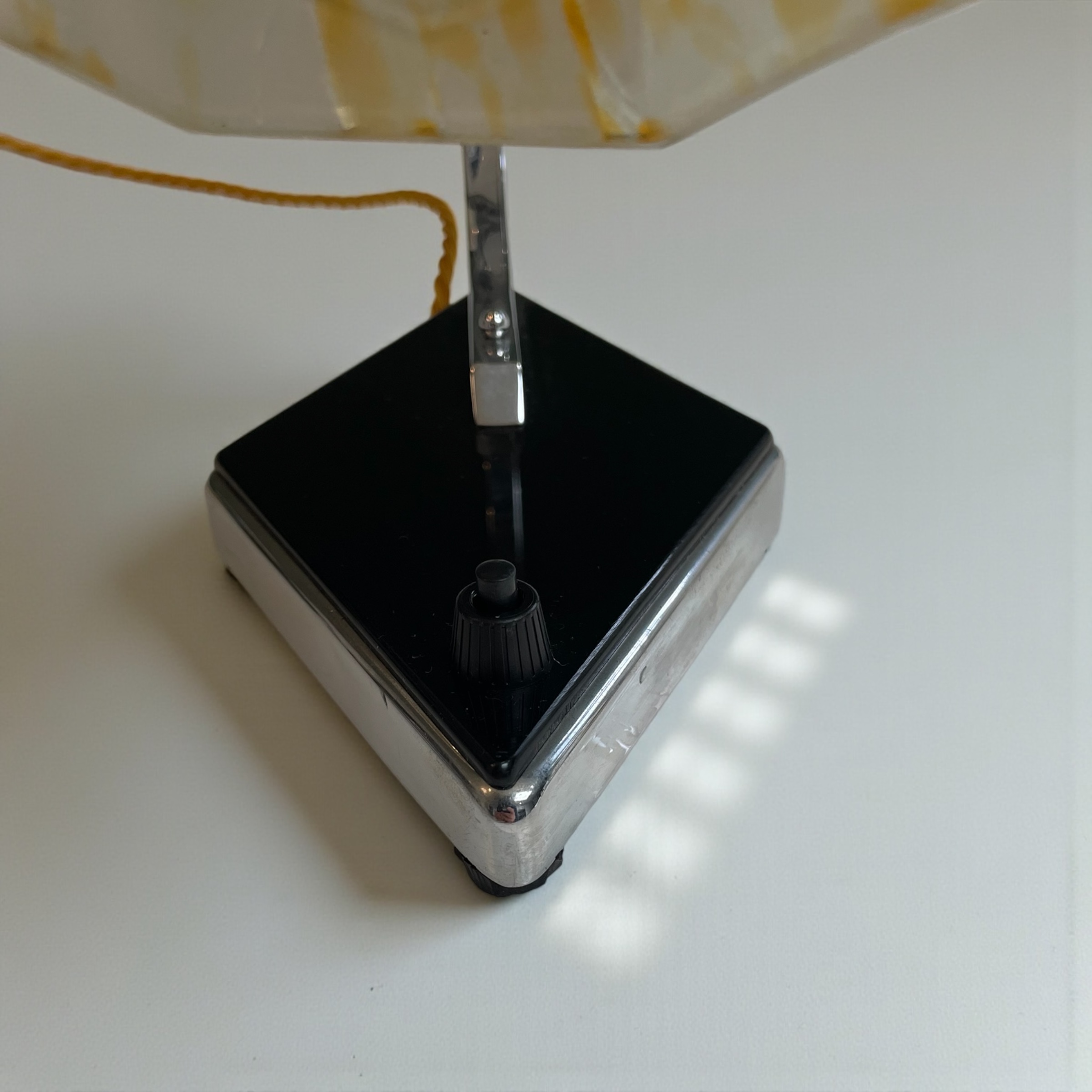 Art Deco table lamp, with a diamond shape base in chrome and black lucite. A chrome curved adjustable column and fitted with an attractive white and egg yolk yellow veined glass shade. Rewired with a matching egg yolk yellow cord lead and PAT tested.