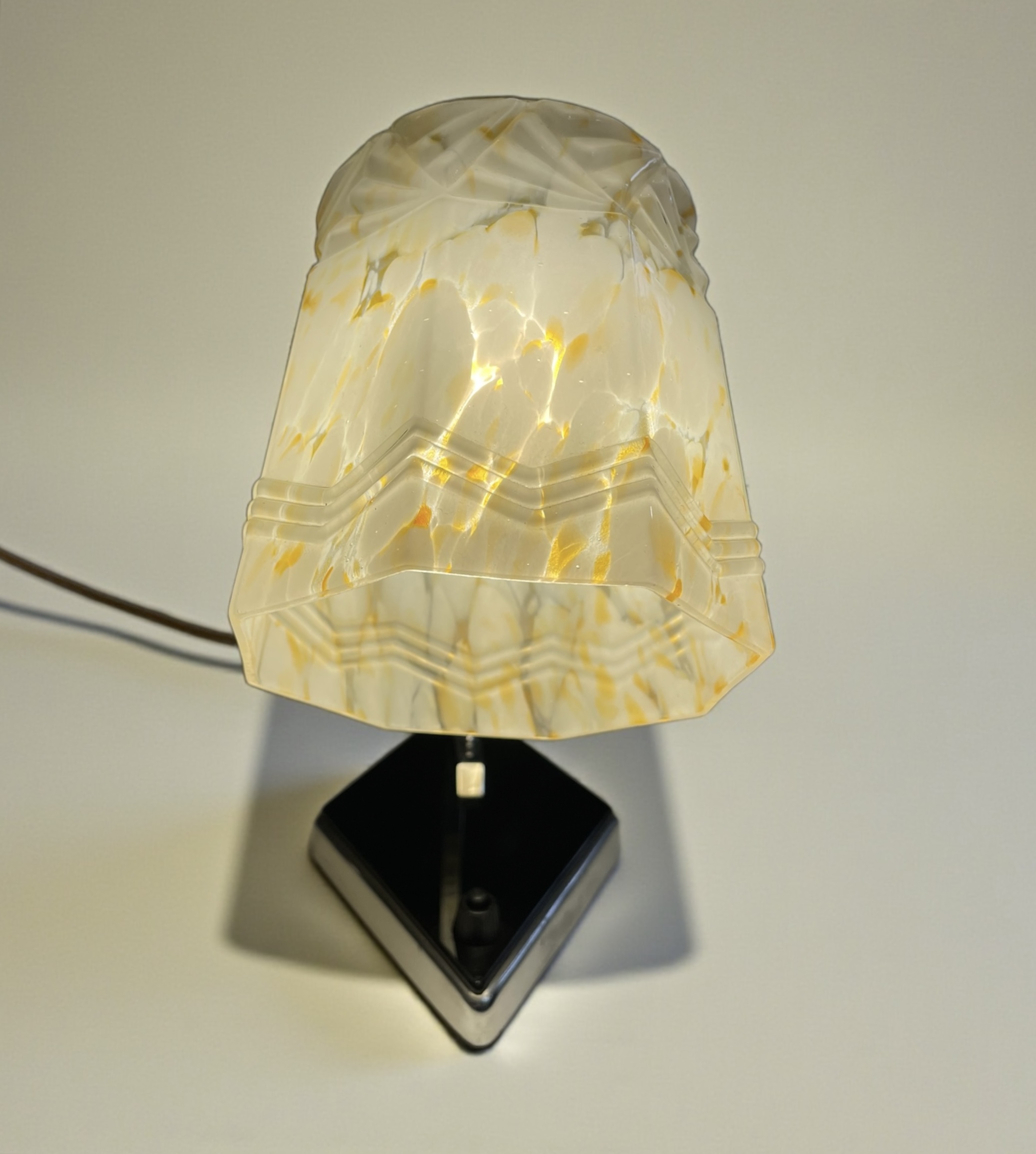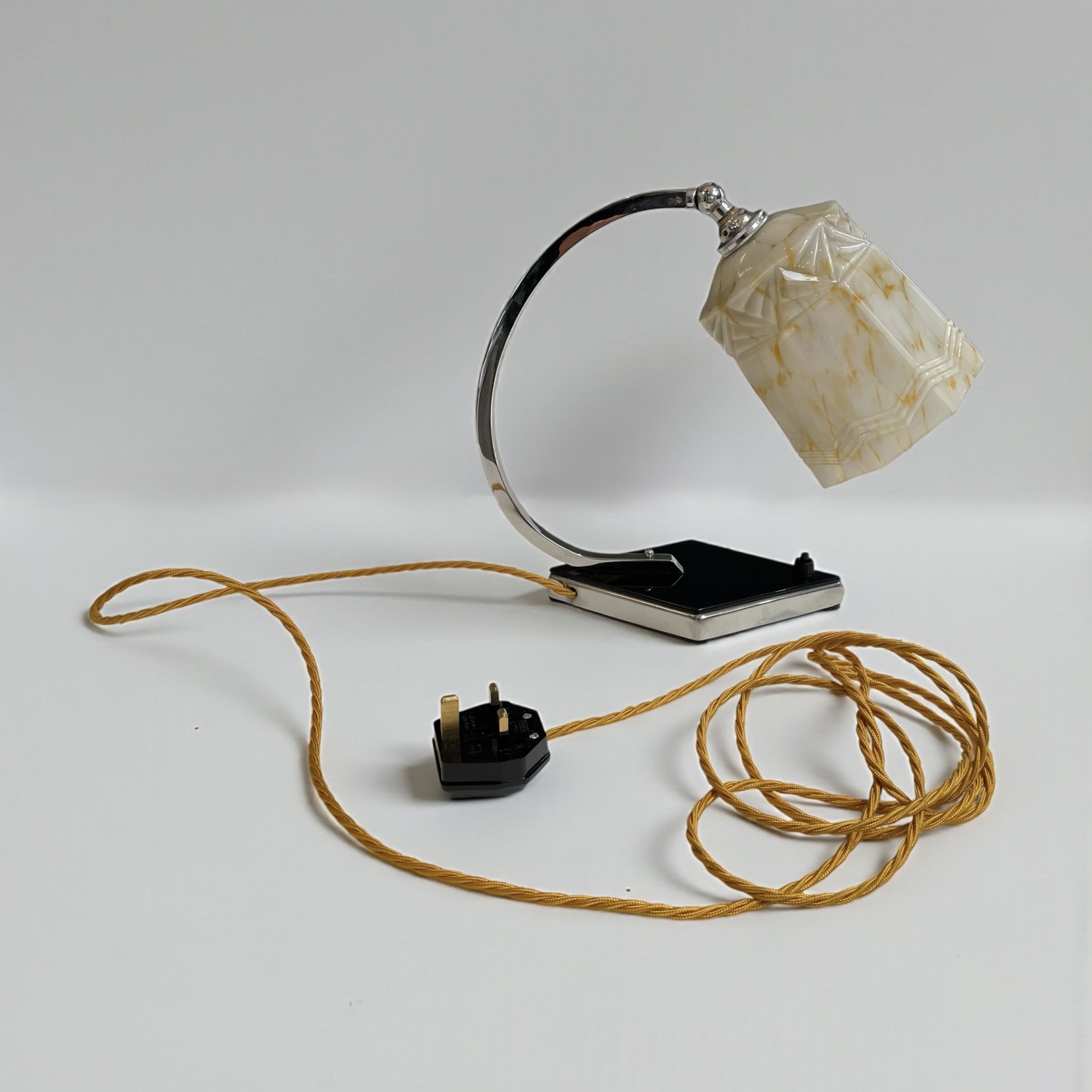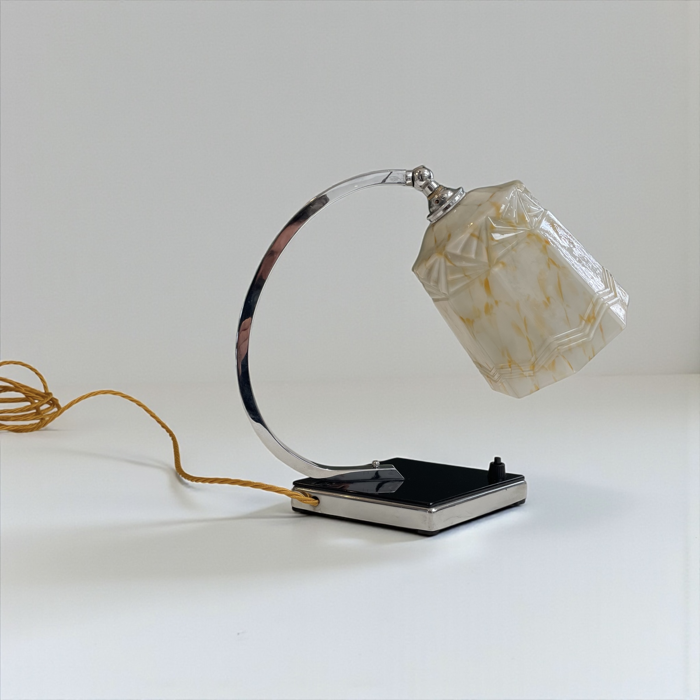 Art Deco table lamp, with a diamond shape base in chrome and black lucite. A chrome curved adjustable column and fitted with an attractive white and egg yolk yellow veined glass shade. Rewired with a matching egg yolk yellow cord lead and PAT tested.