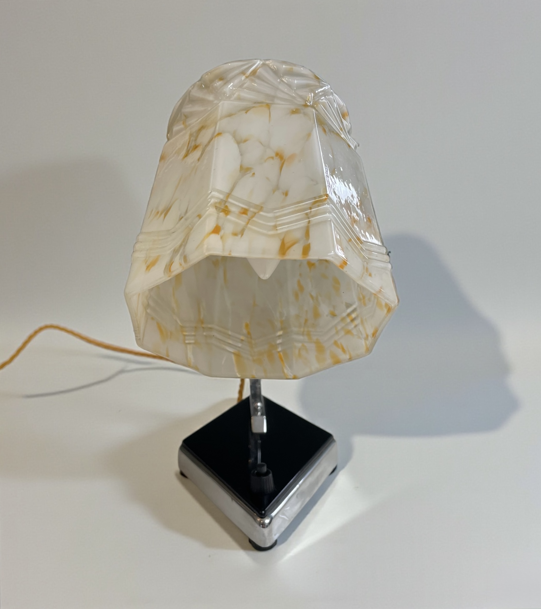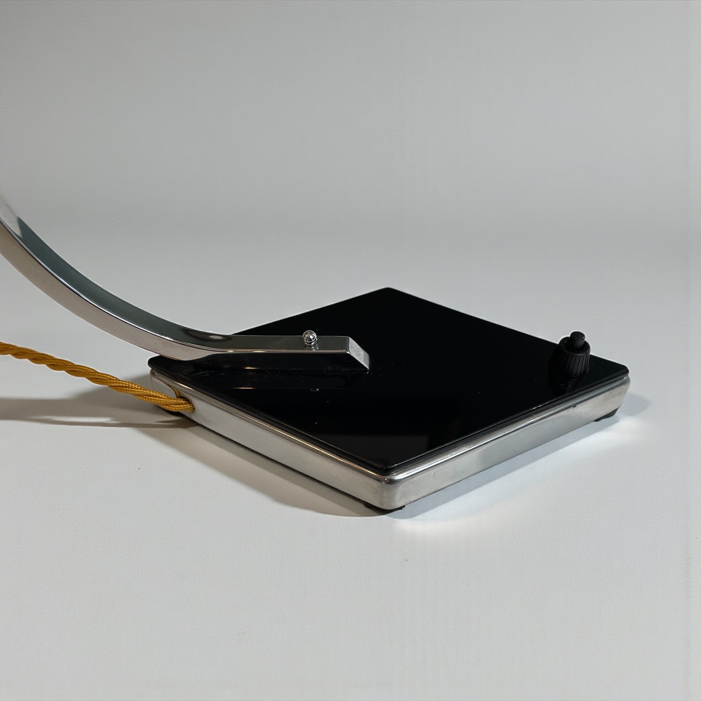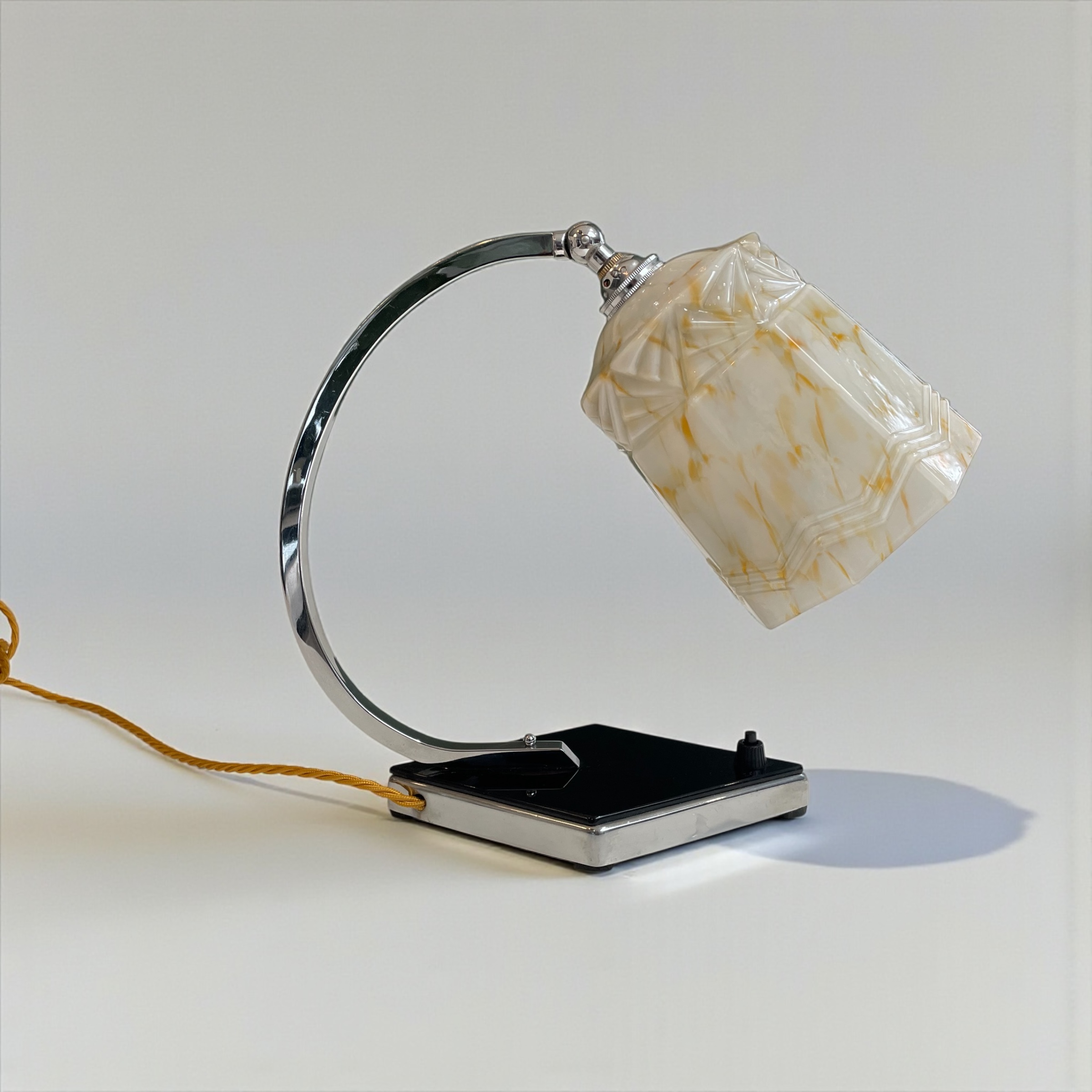 Art Deco table lamp, with a diamond shape base in chrome and black lucite. A chrome curved adjustable column and fitted with an attractive white and egg yolk yellow veined glass shade. Rewired with a matching egg yolk yellow cord lead and PAT tested.