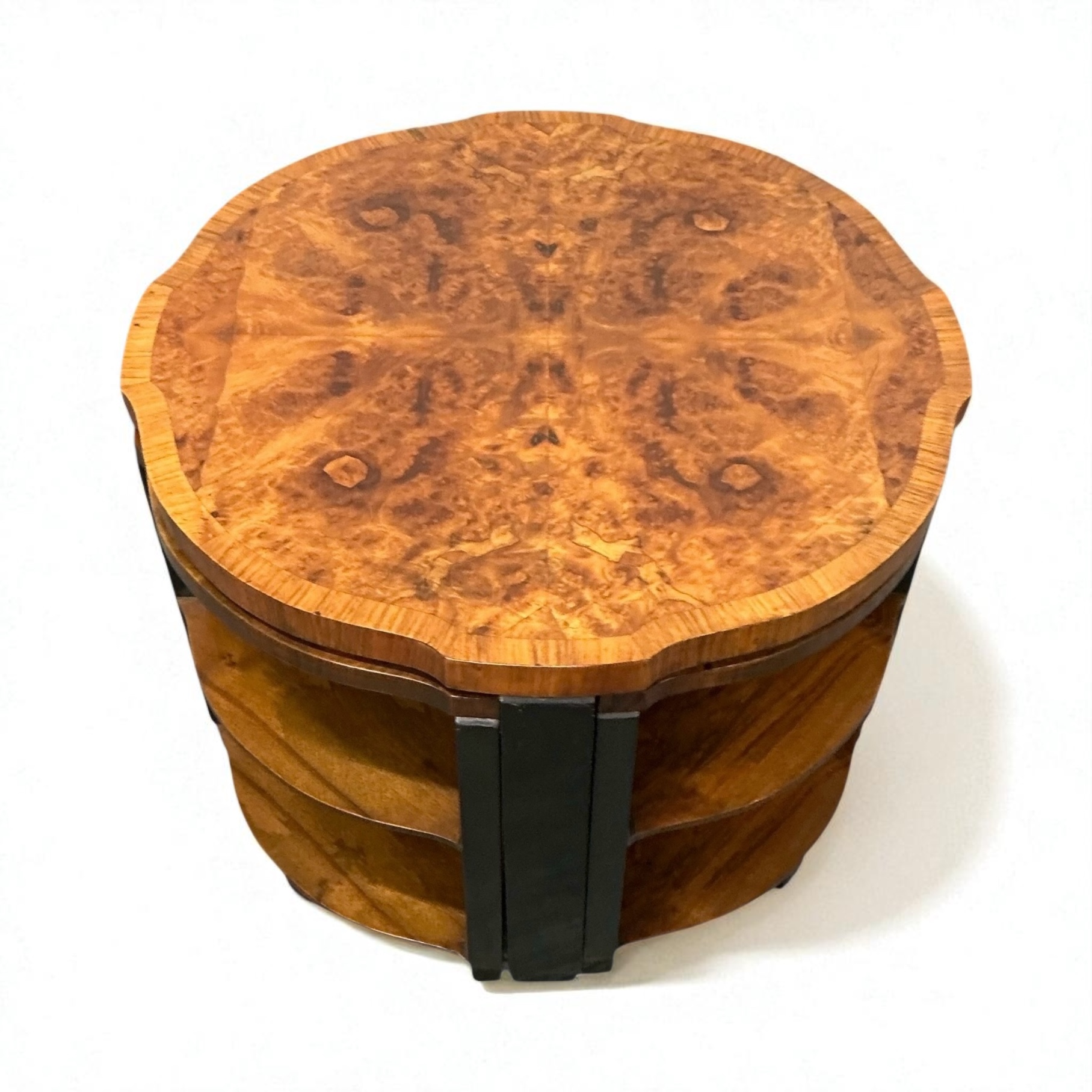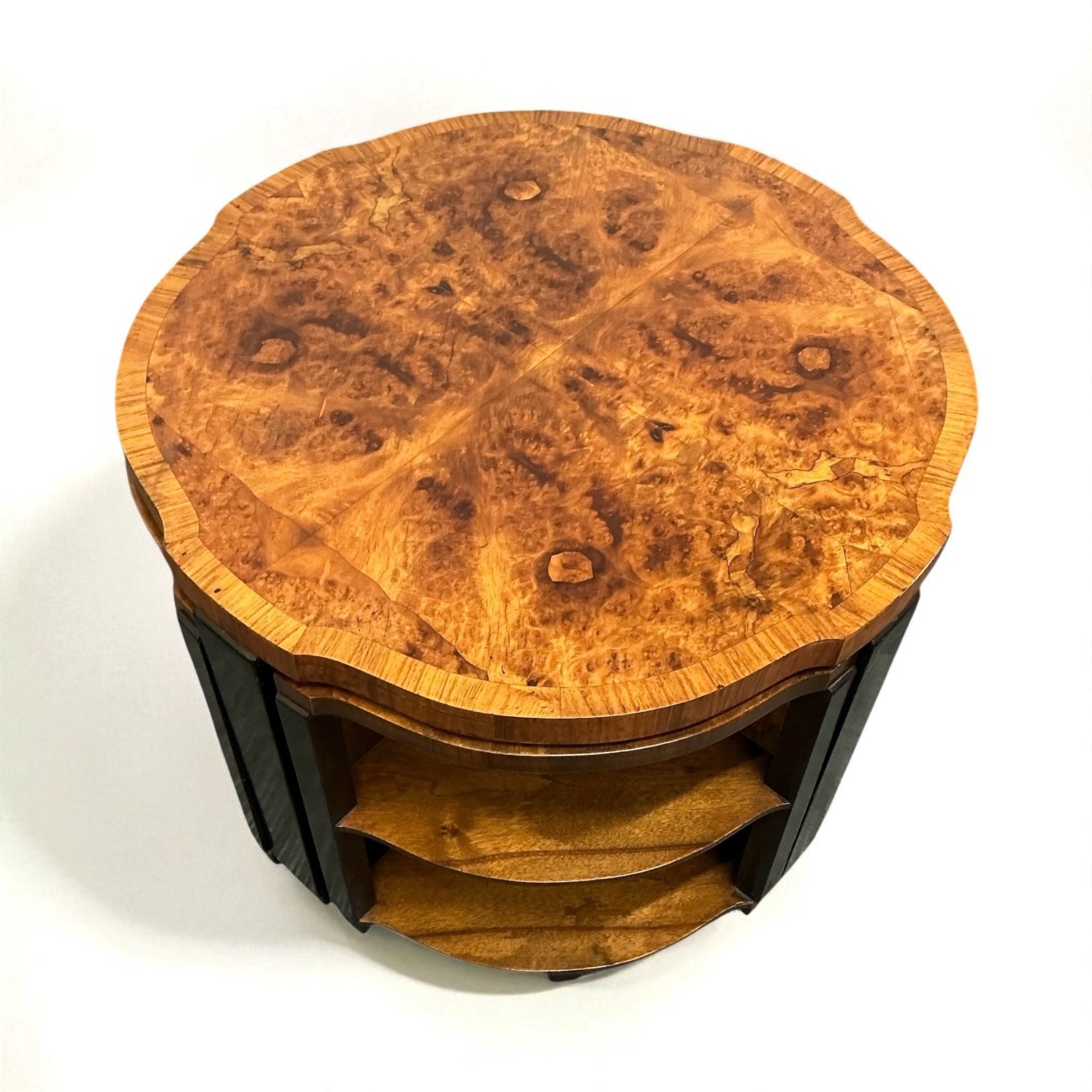 Art Deco nest of five tables, so often associated with Harry and Lou Epstein. The main table with highly figured walnut butterfly veneers, with four sectional, two tired tables that fit beneath. The ebonised legs, contrasting well with the decorative walnut of the table tops and shelves. All our furniture is professionally waxed and polished and restored where necessary. This nest of tables in showroom condition.