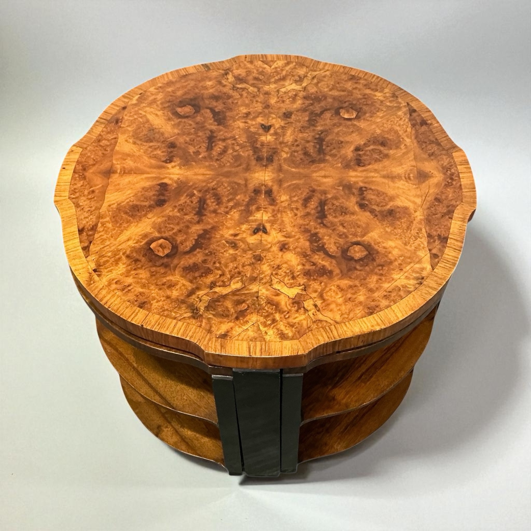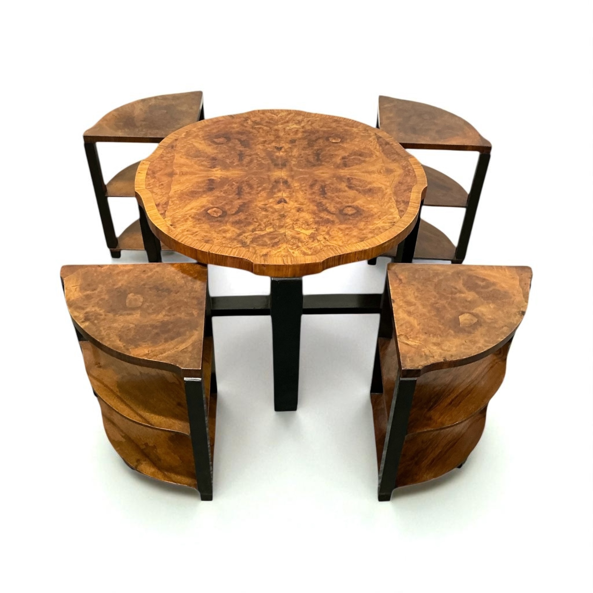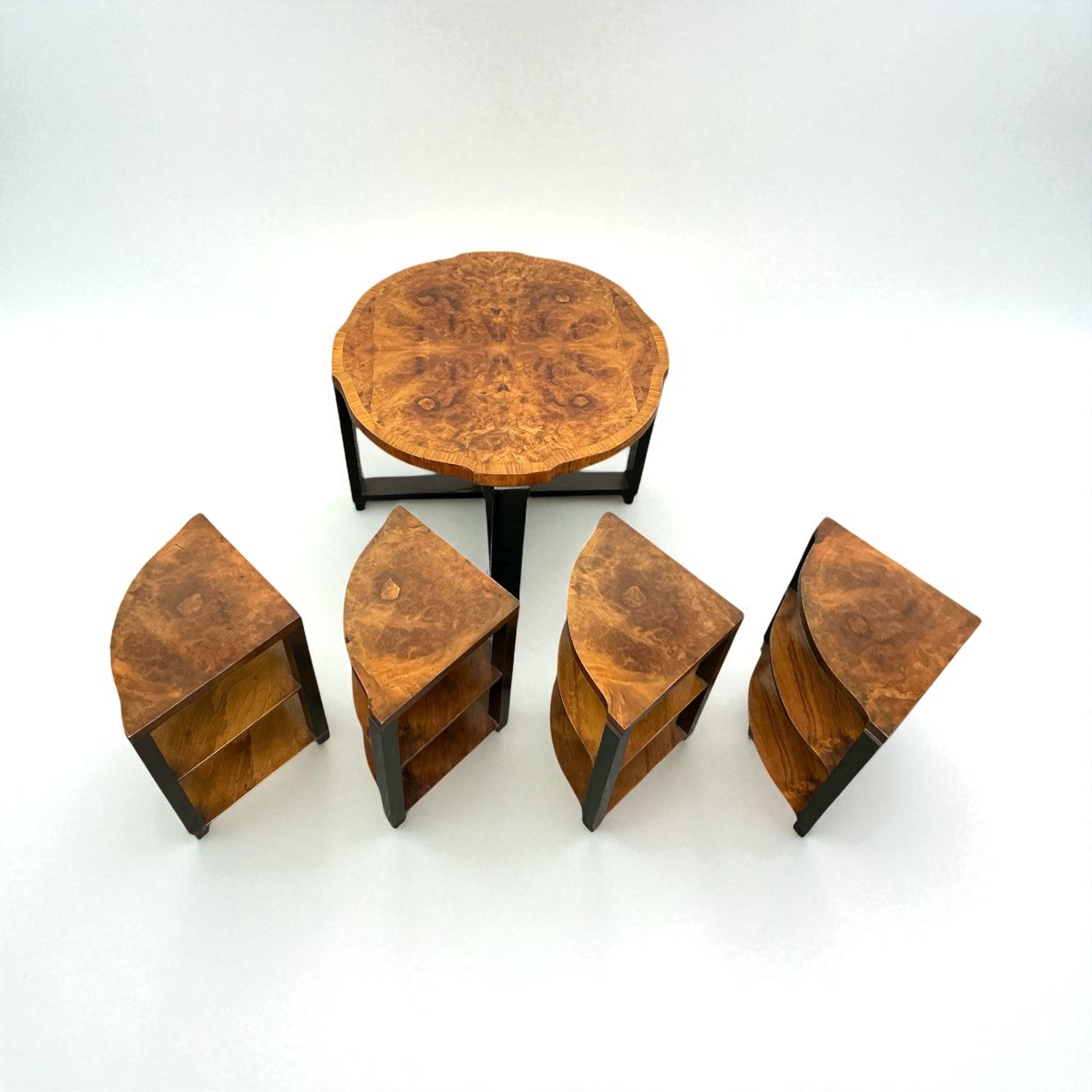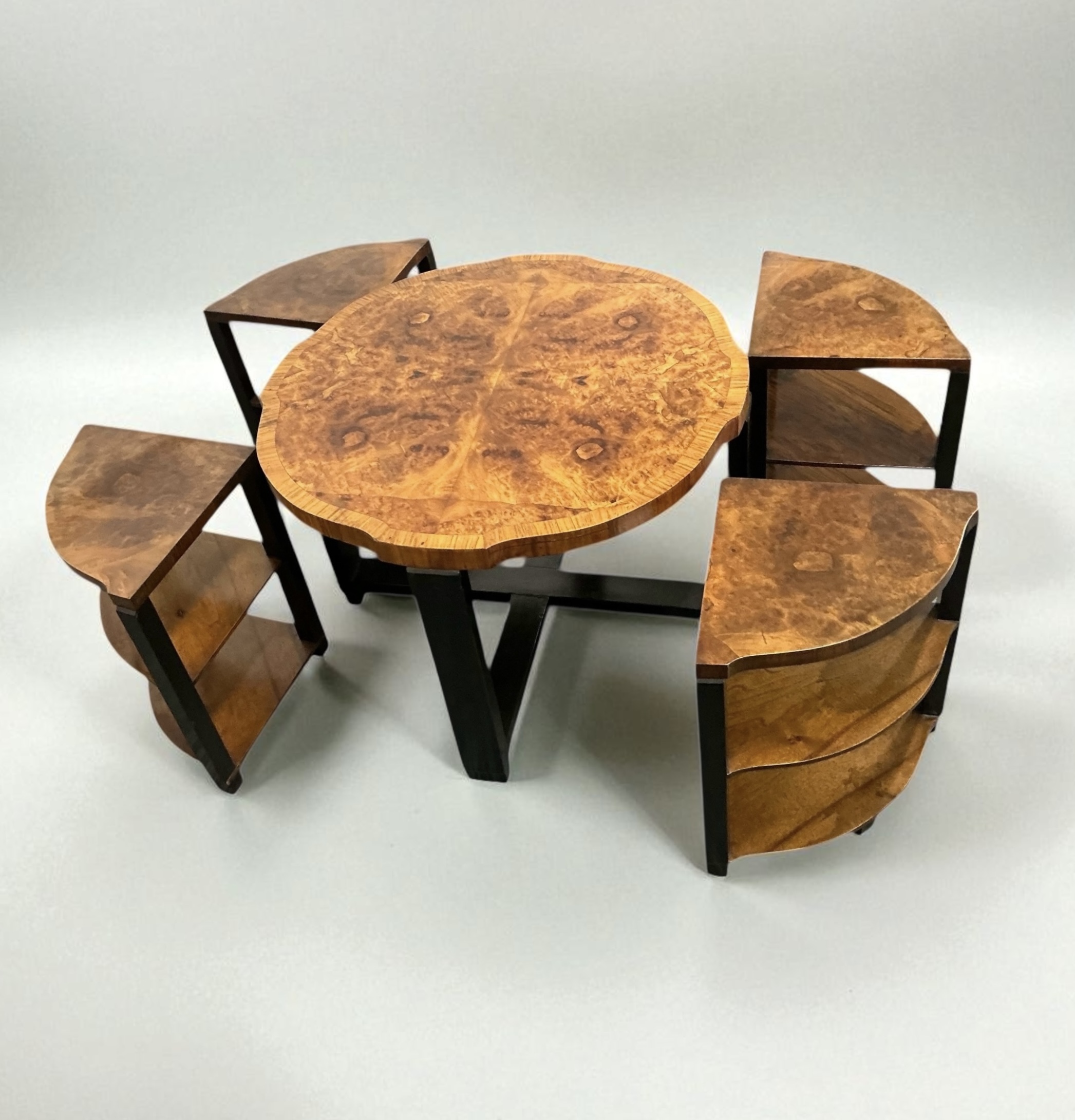 Art Deco nest of five tables, so often associated with Harry and Lou Epstein. The main table with highly figured walnut butterfly veneers, with four sectional, two tired tables that fit beneath. The ebonised legs, contrasting well with the decorative walnut of the table tops and shelves. All our furniture is professionally waxed and polished and restored where necessary. This nest of tables in showroom condition.