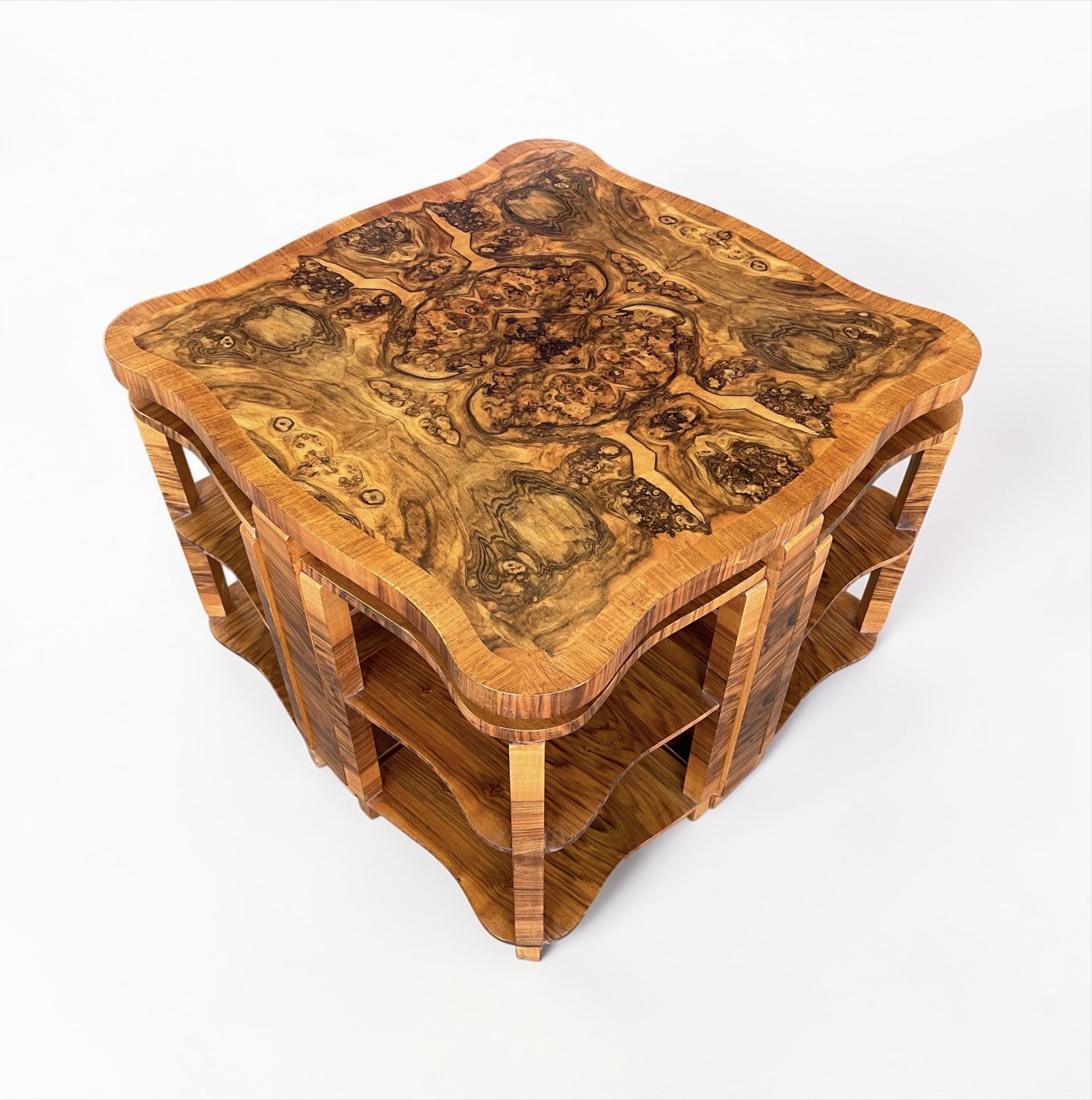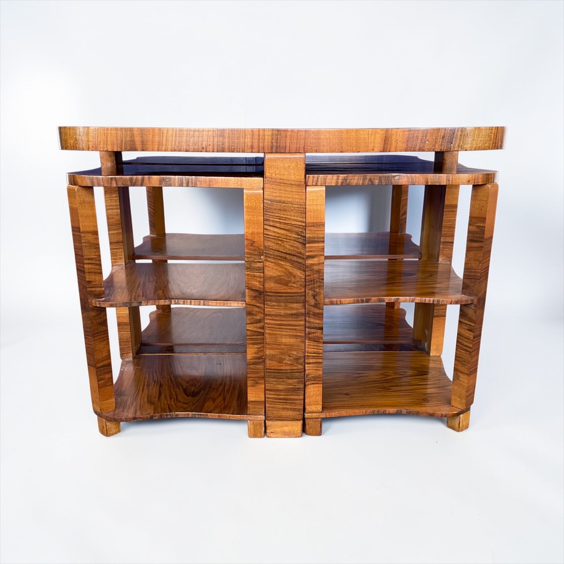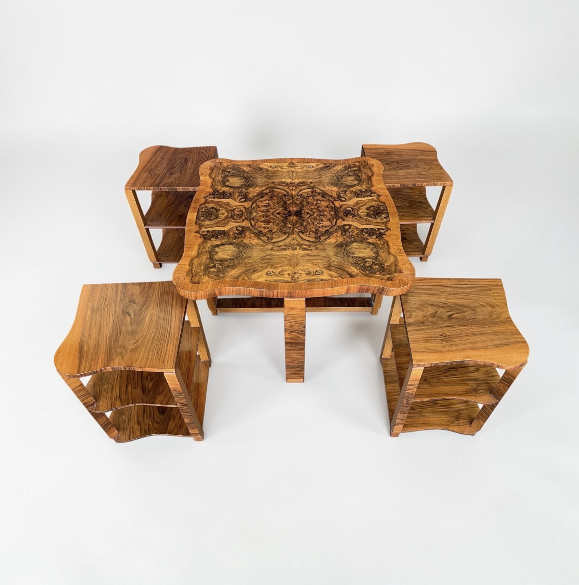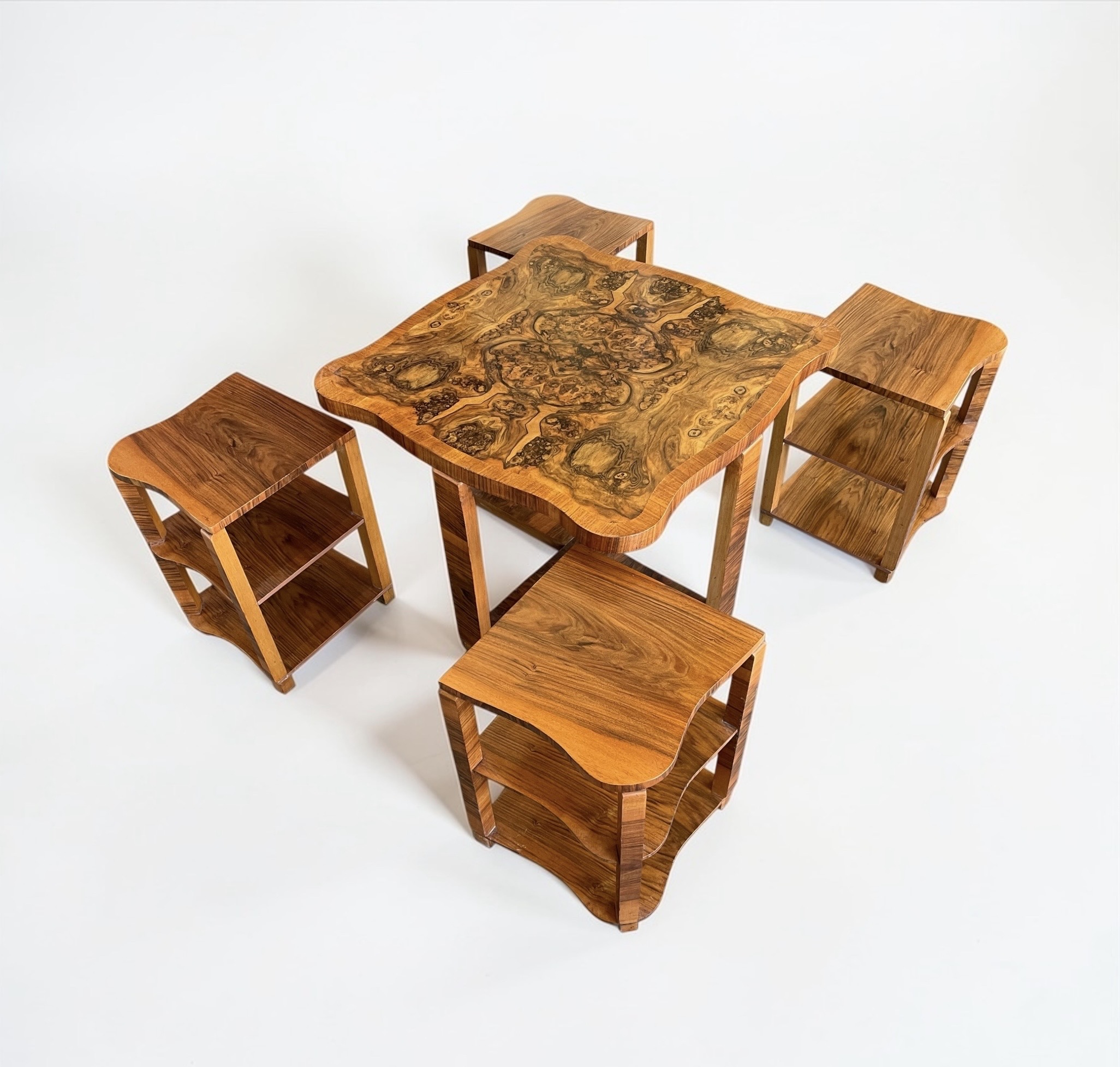 Art Deco nest of five walnut tables by Harry and Lou Epstein. The central circular, fluted table, with four tables beneath. Each of the four smaller tables with a glass top and a shelf beneath. Two of the glass tops with a small chip, as highlighted in one of the photos. The main table has a glass top, without damage.