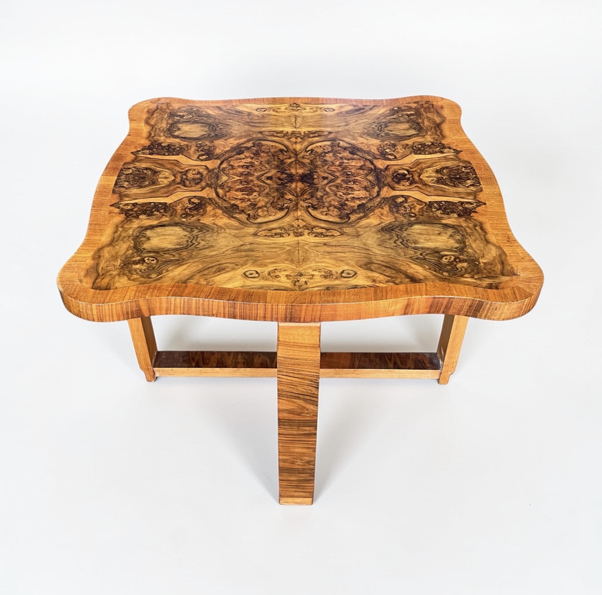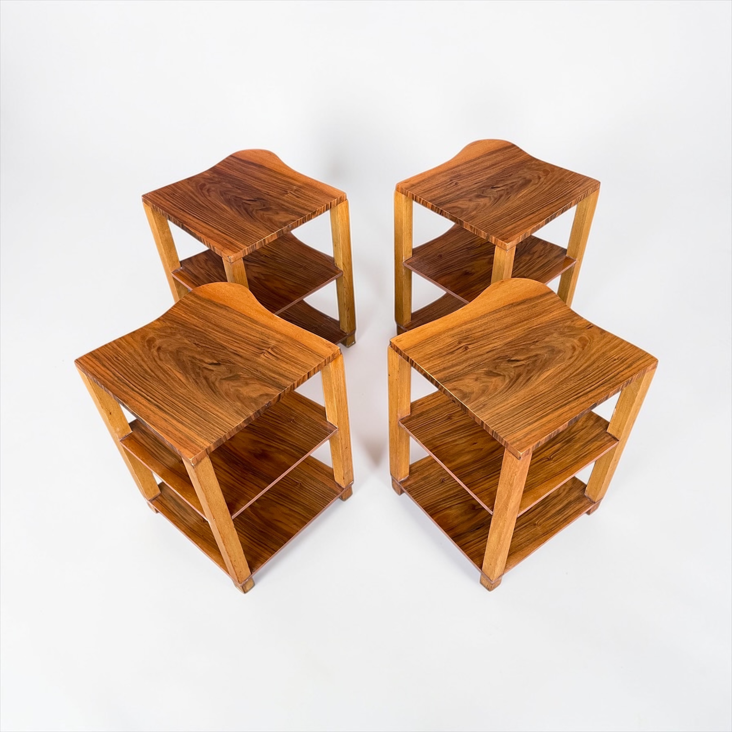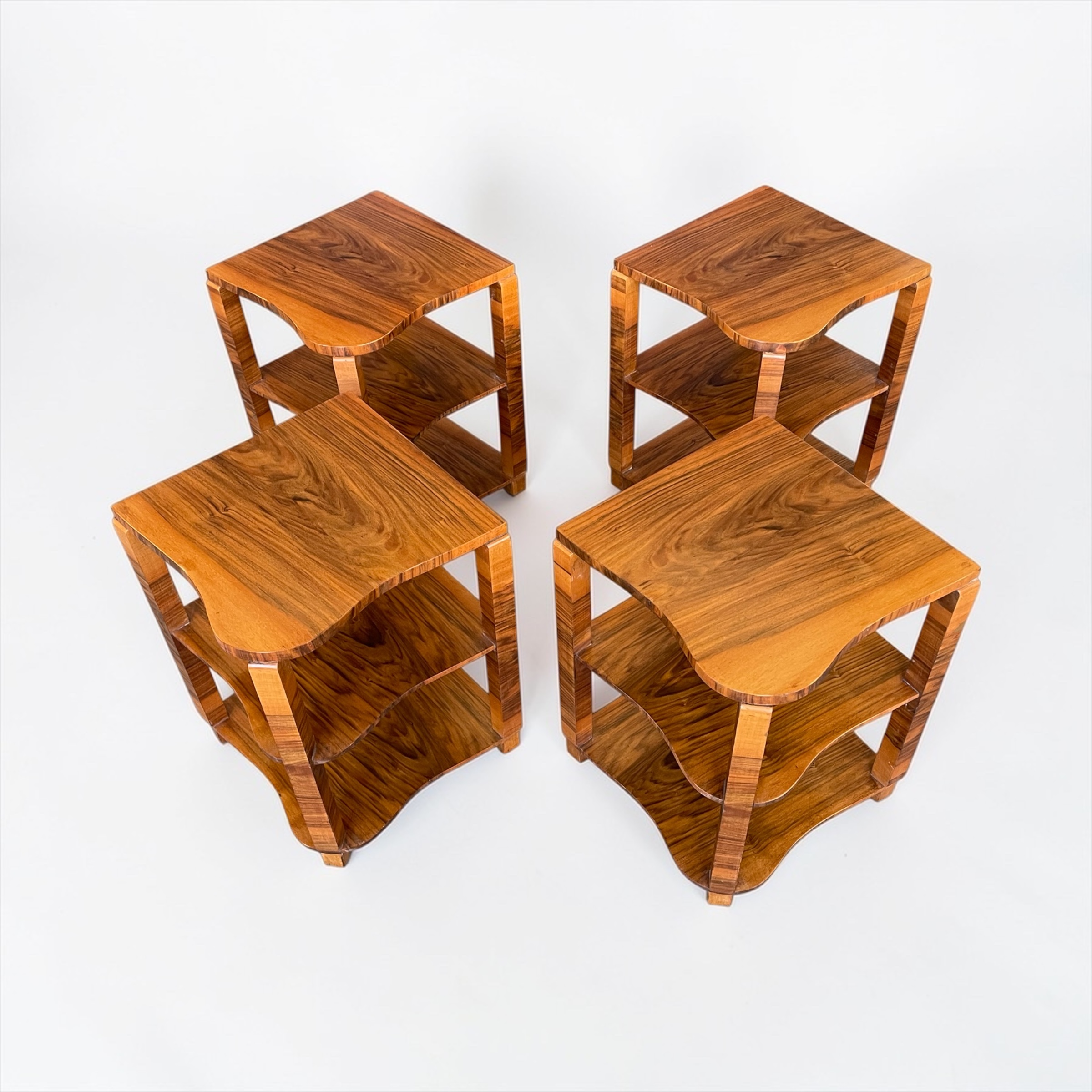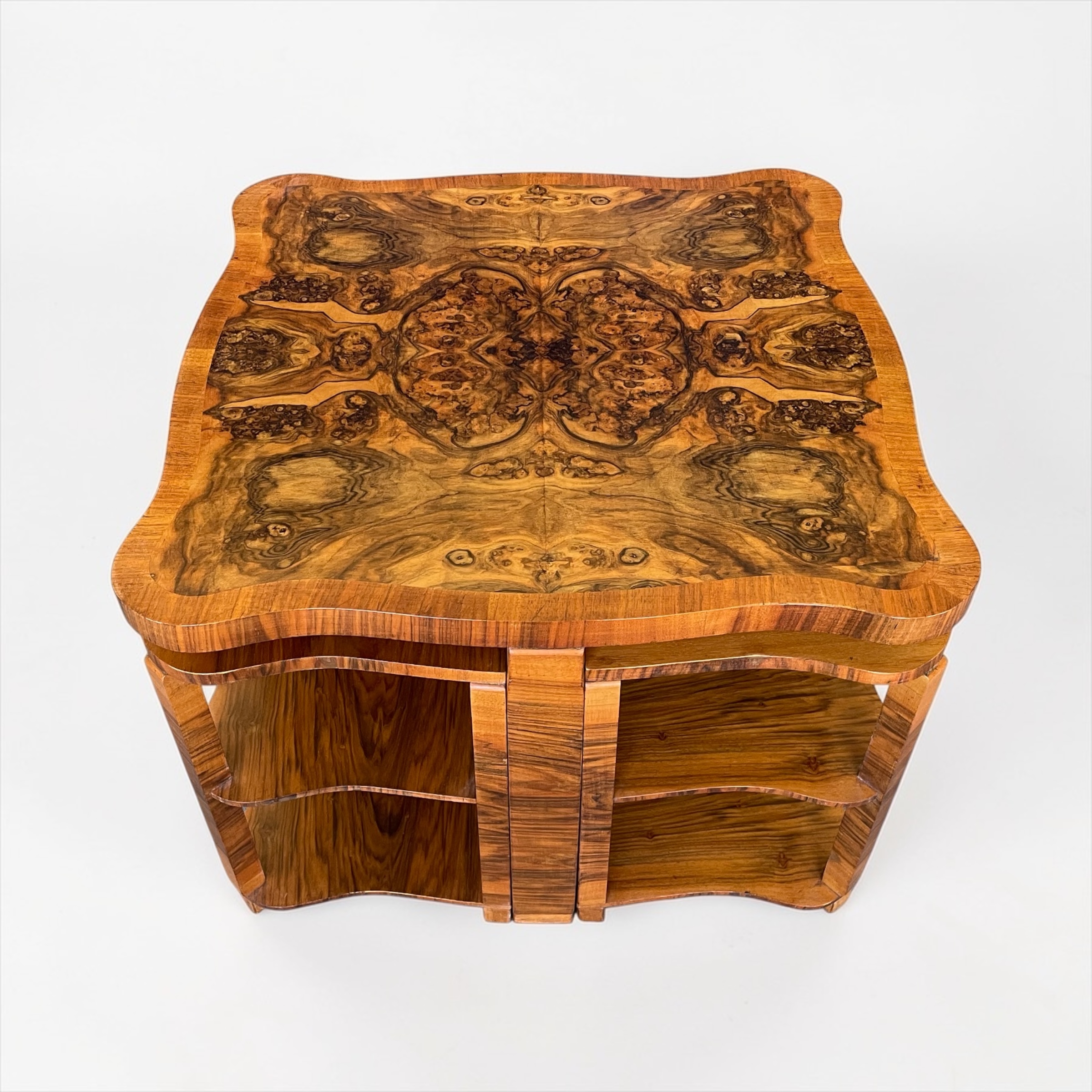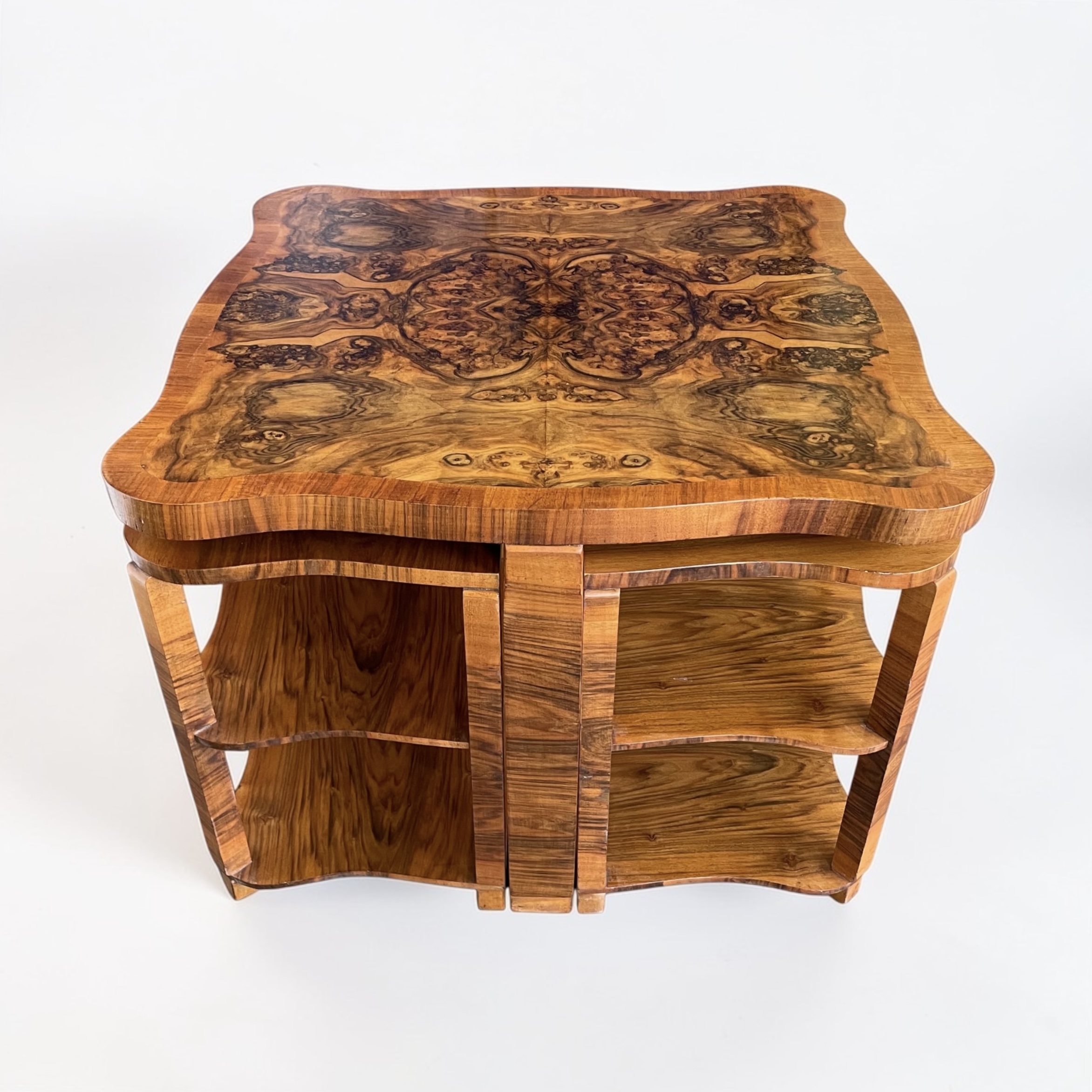 Art Deco nest of five walnut tables by Harry and Lou Epstein. The central circular, fluted table, with four tables beneath. Each of the four smaller tables with a glass top and a shelf beneath. Two of the glass tops with a small chip, as highlighted in one of the photos. The main table has a glass top, without damage.