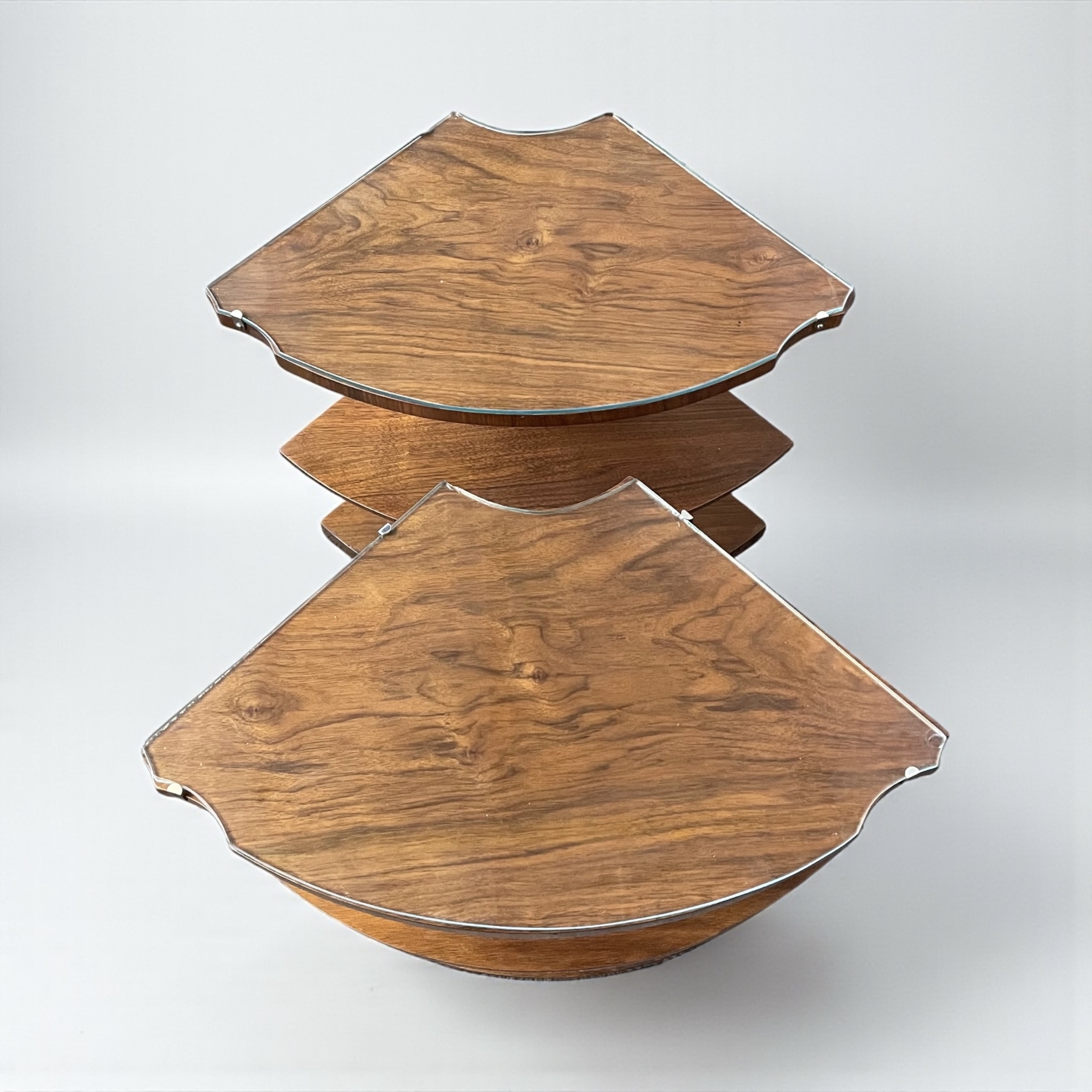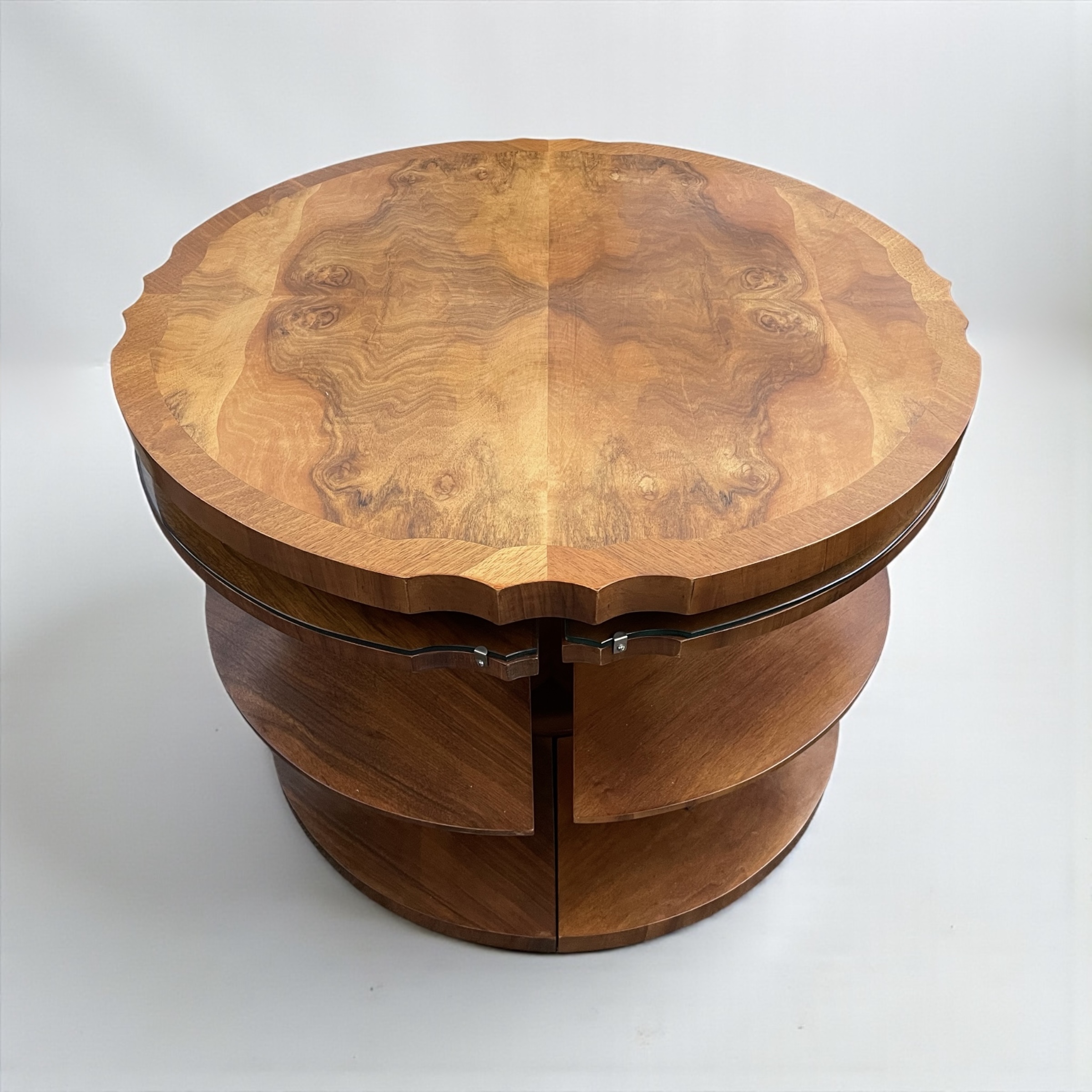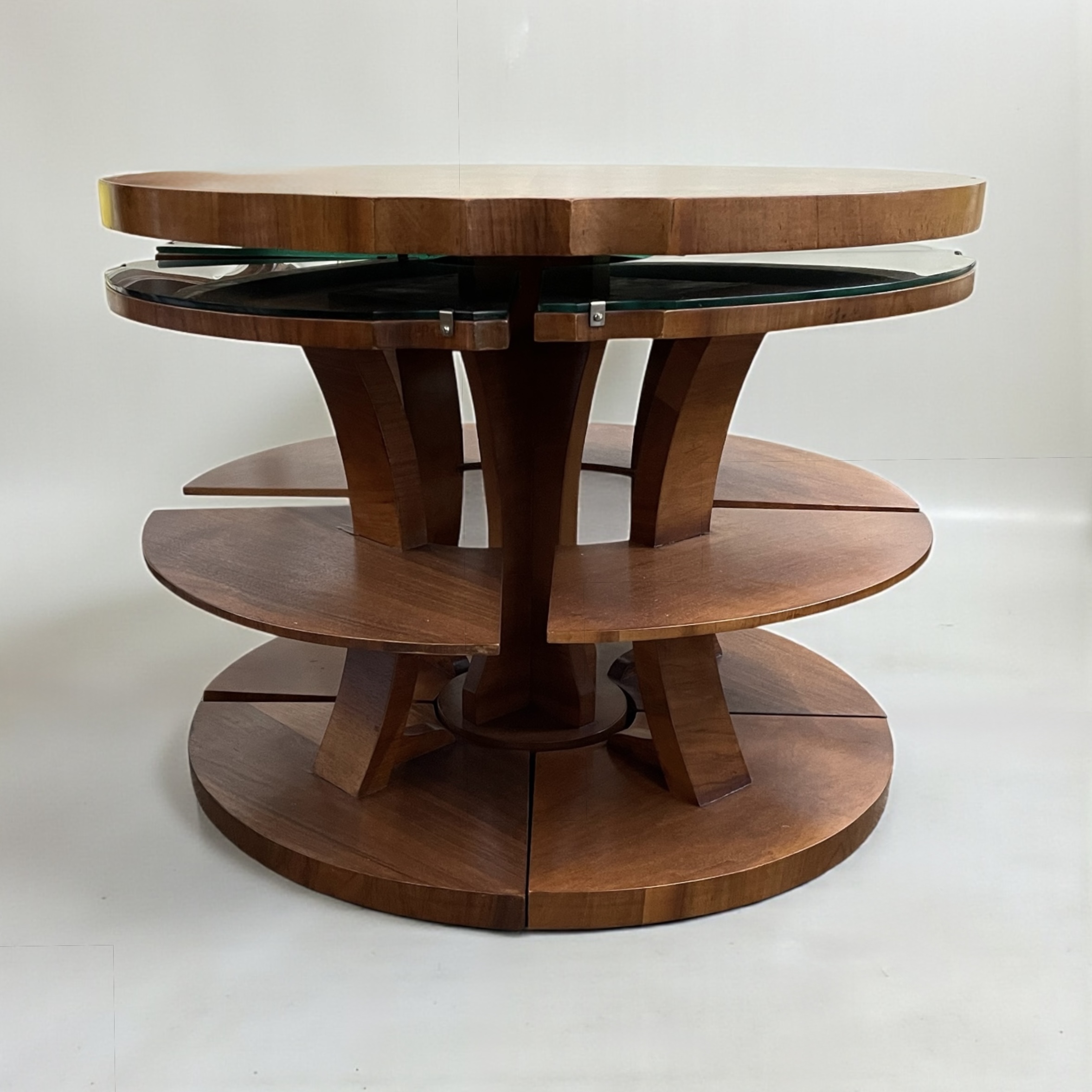 Art Deco nest of five walnut tables by Harry and Lou Epstein. The central circular table, fluted, with the centre in figured walnut and straight grained walnut banding and with four walnut tables beneath. Each of the four smaller tables with a glass top and a shelf beneath. Two of the glass tops with a small chip, but retained for protective purposes. The main table has a glass top, without damage.