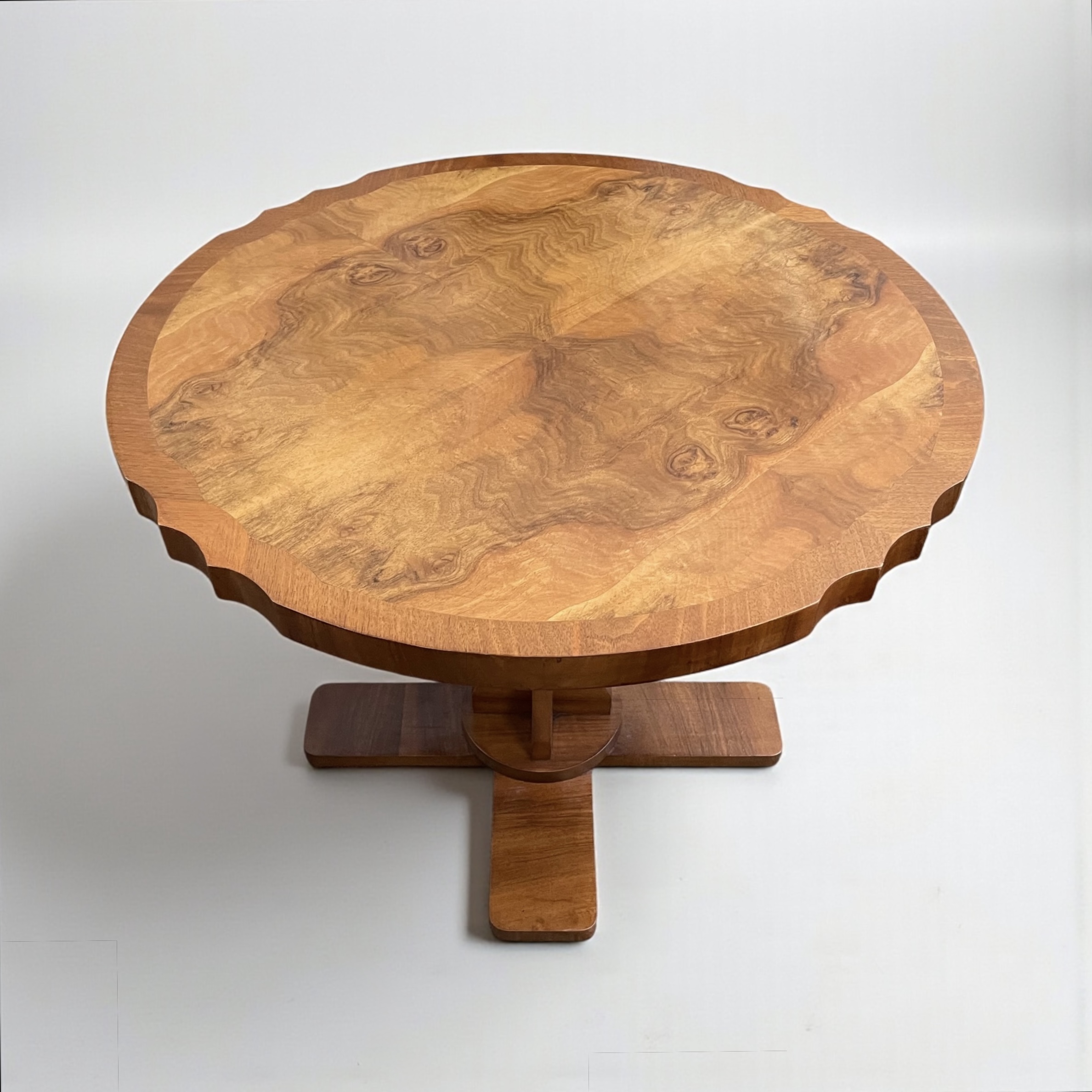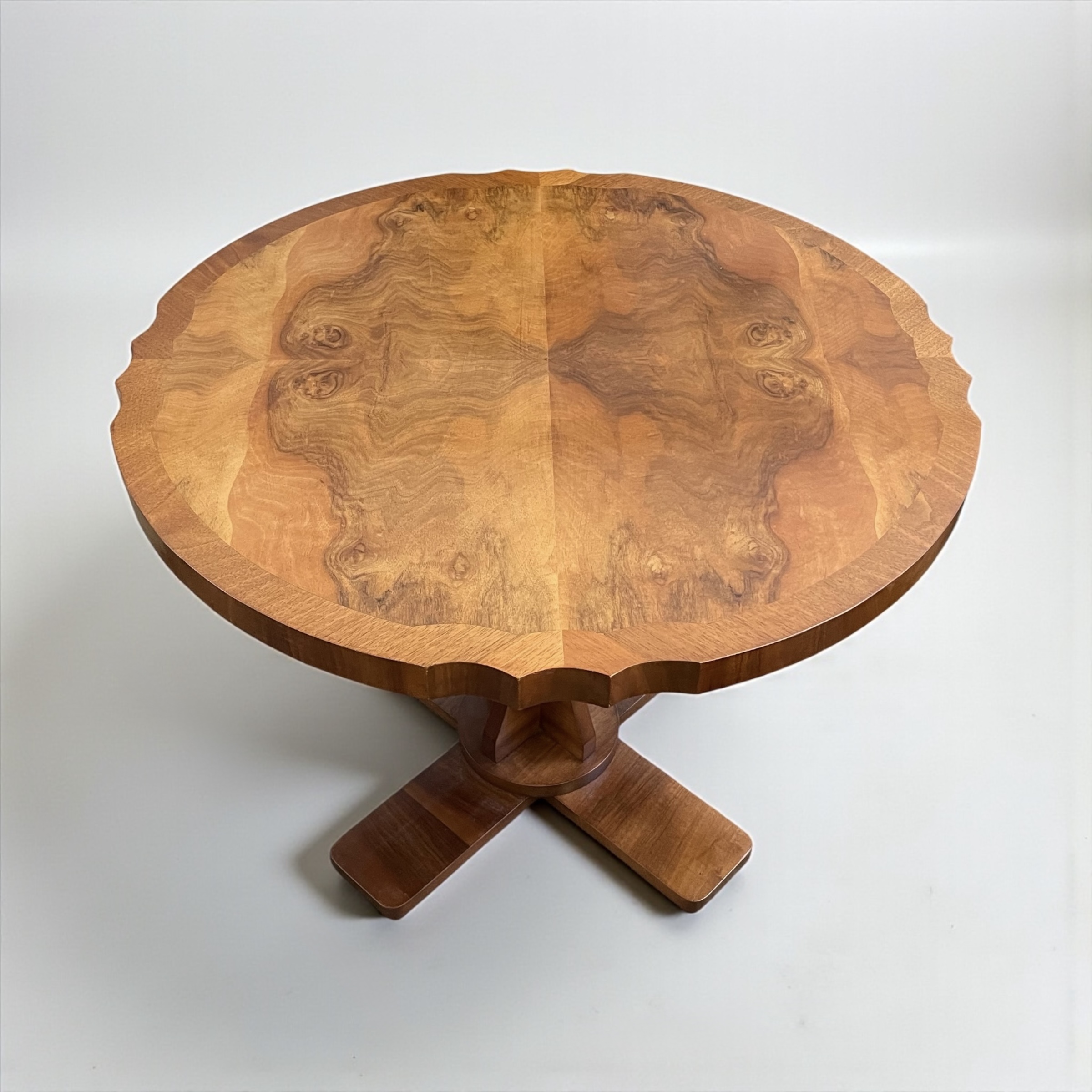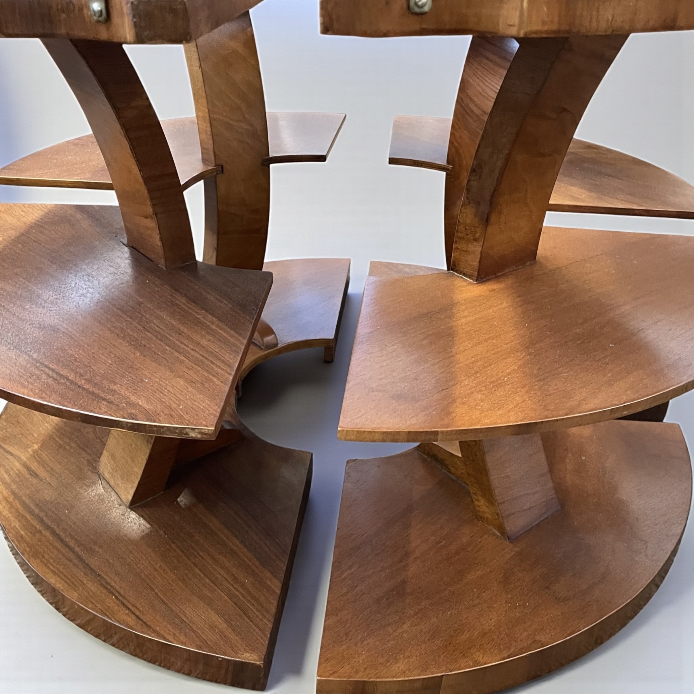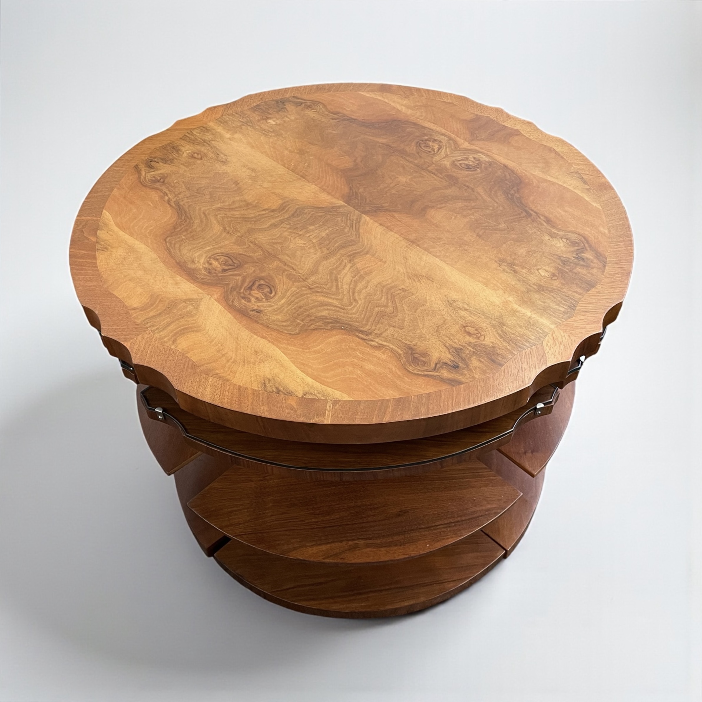 Art Deco nest of five walnut tables by Harry and Lou Epstein. The central circular table, fluted, with the centre in figured walnut and straight grained walnut banding and with four walnut tables beneath. Each of the four smaller tables with a glass top and a shelf beneath. Two of the glass tops with a small chip, but retained for protective purposes. The main table has a glass top, without damage.