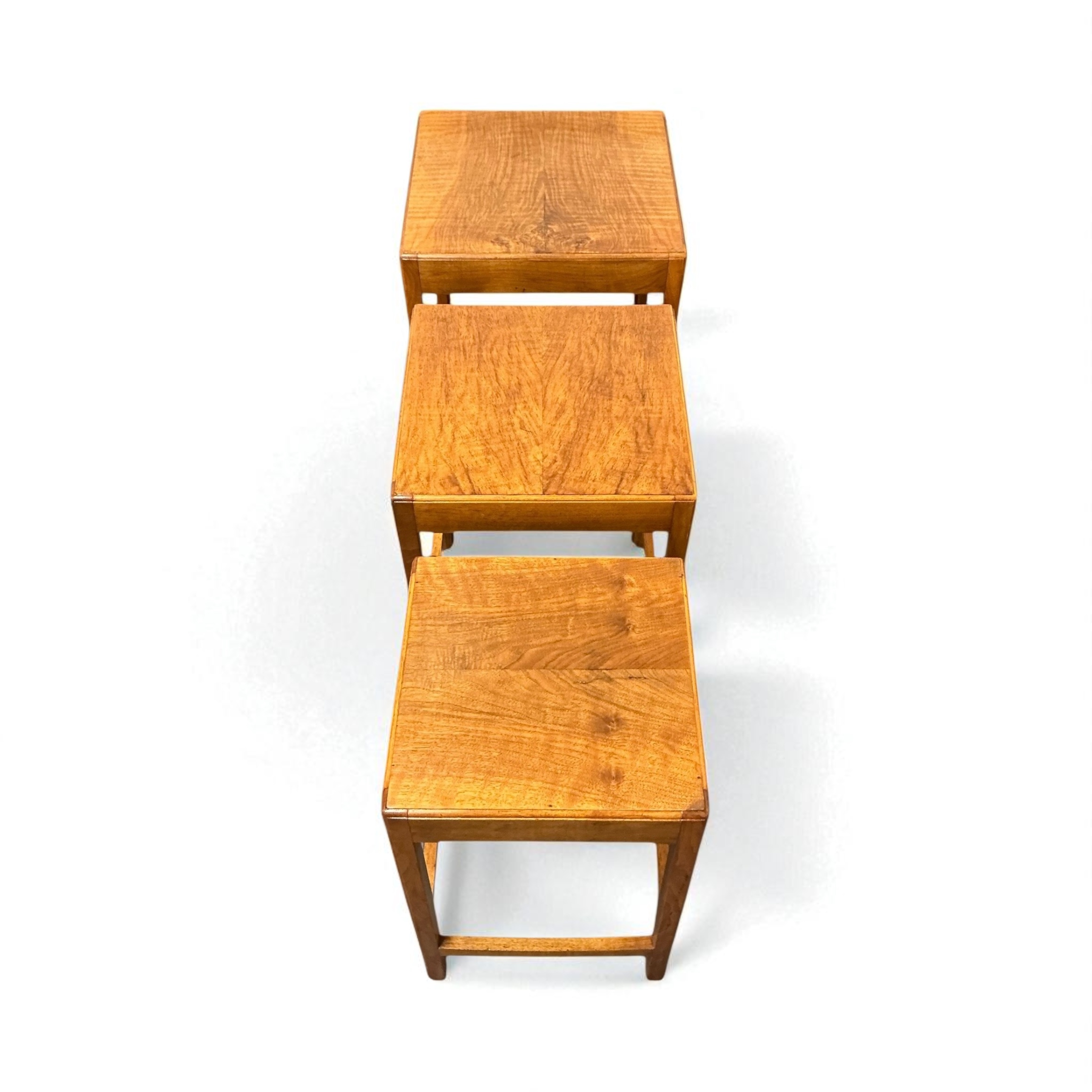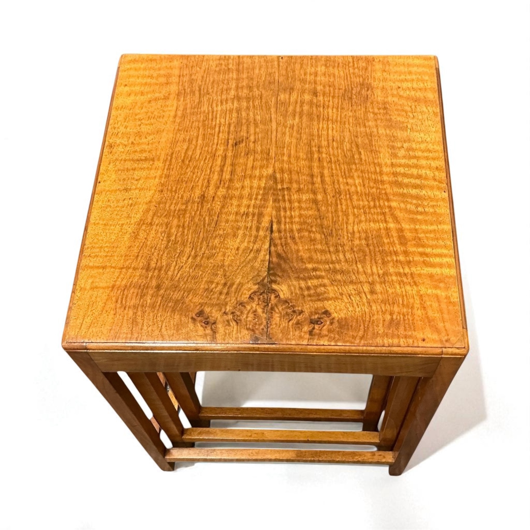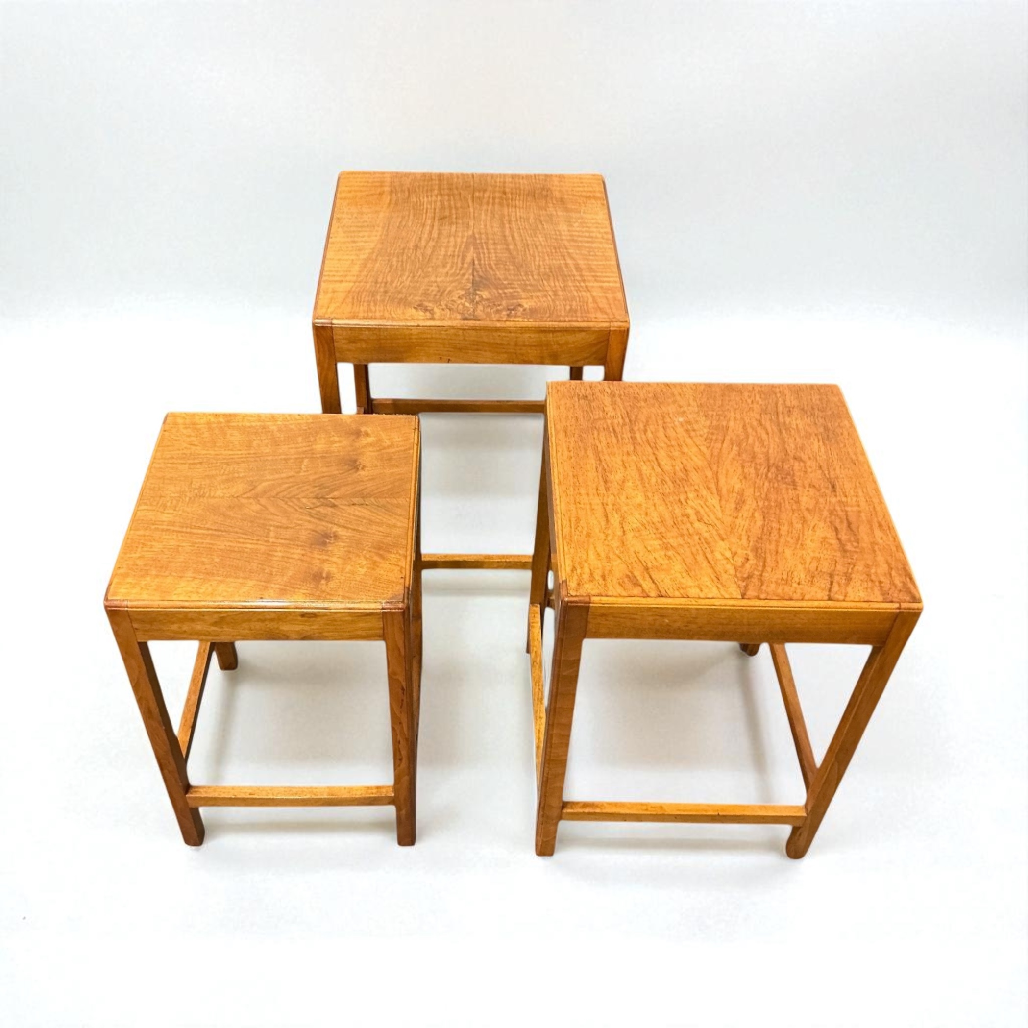 Art Deco nest of three square tables in walnut. Rather than slide into each other, this set sit over each other.