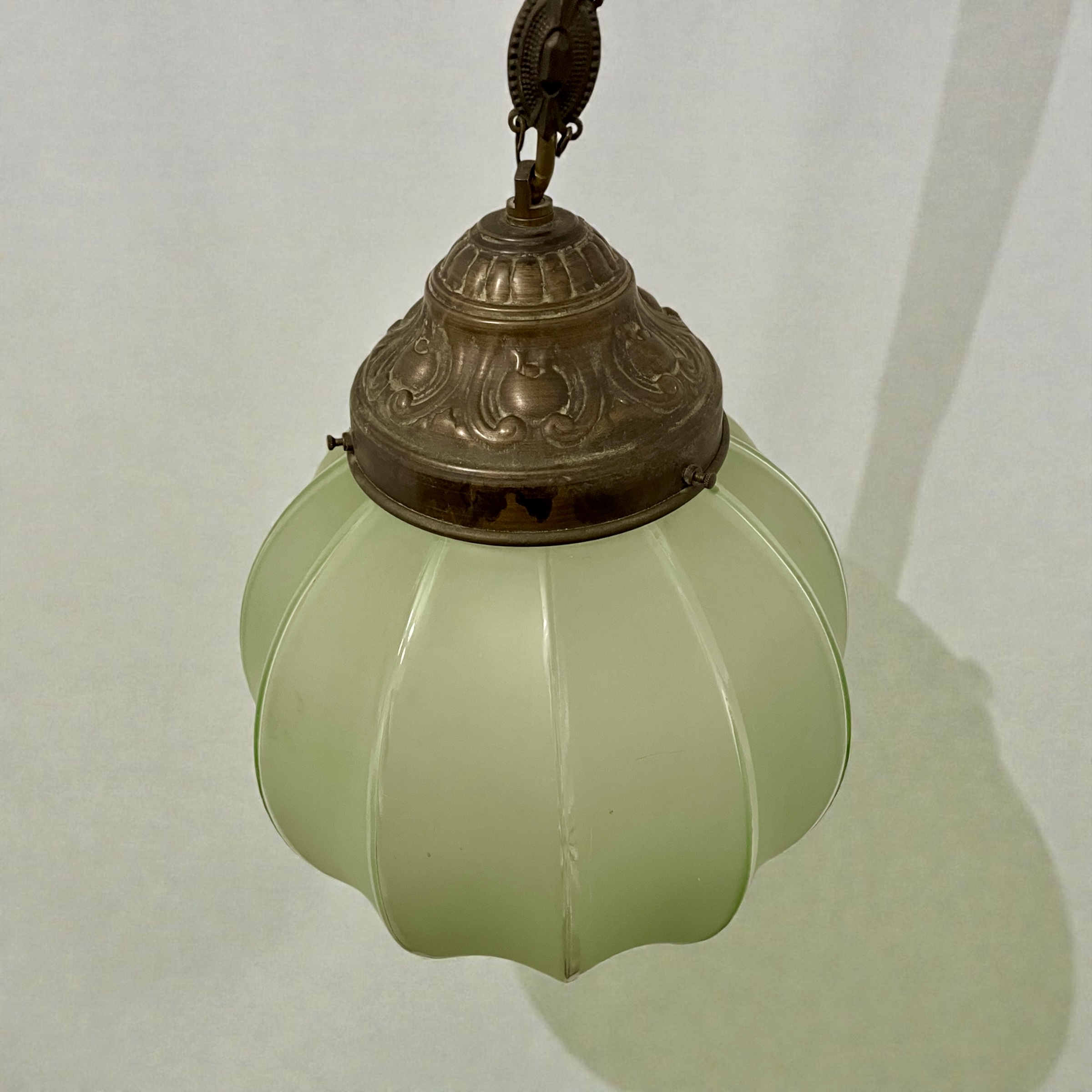 Art Deco ceiling pendant light, with a good size green fluted glass shade and an attractive antiqued brass detailed hanging chain, gallery and ceiling rose..