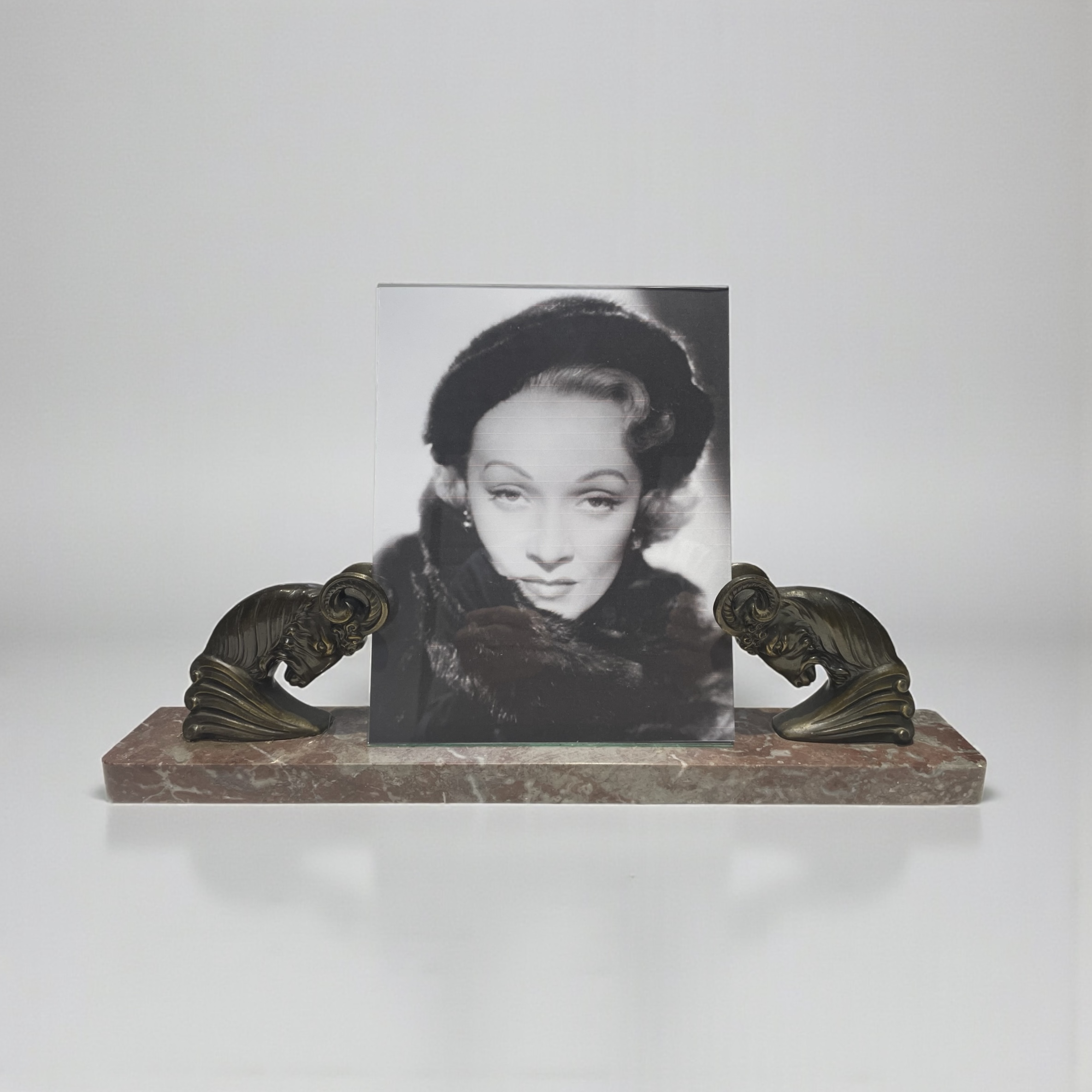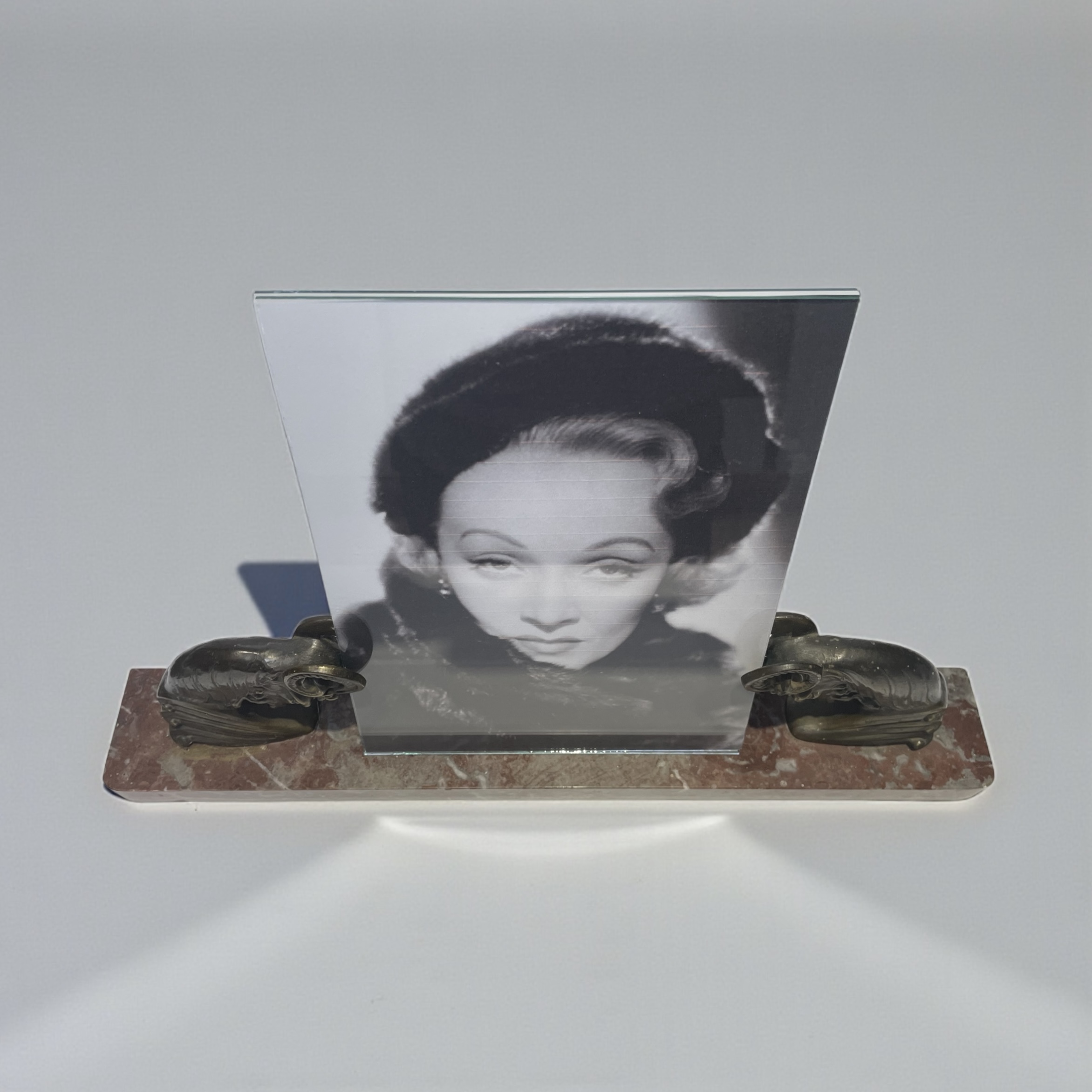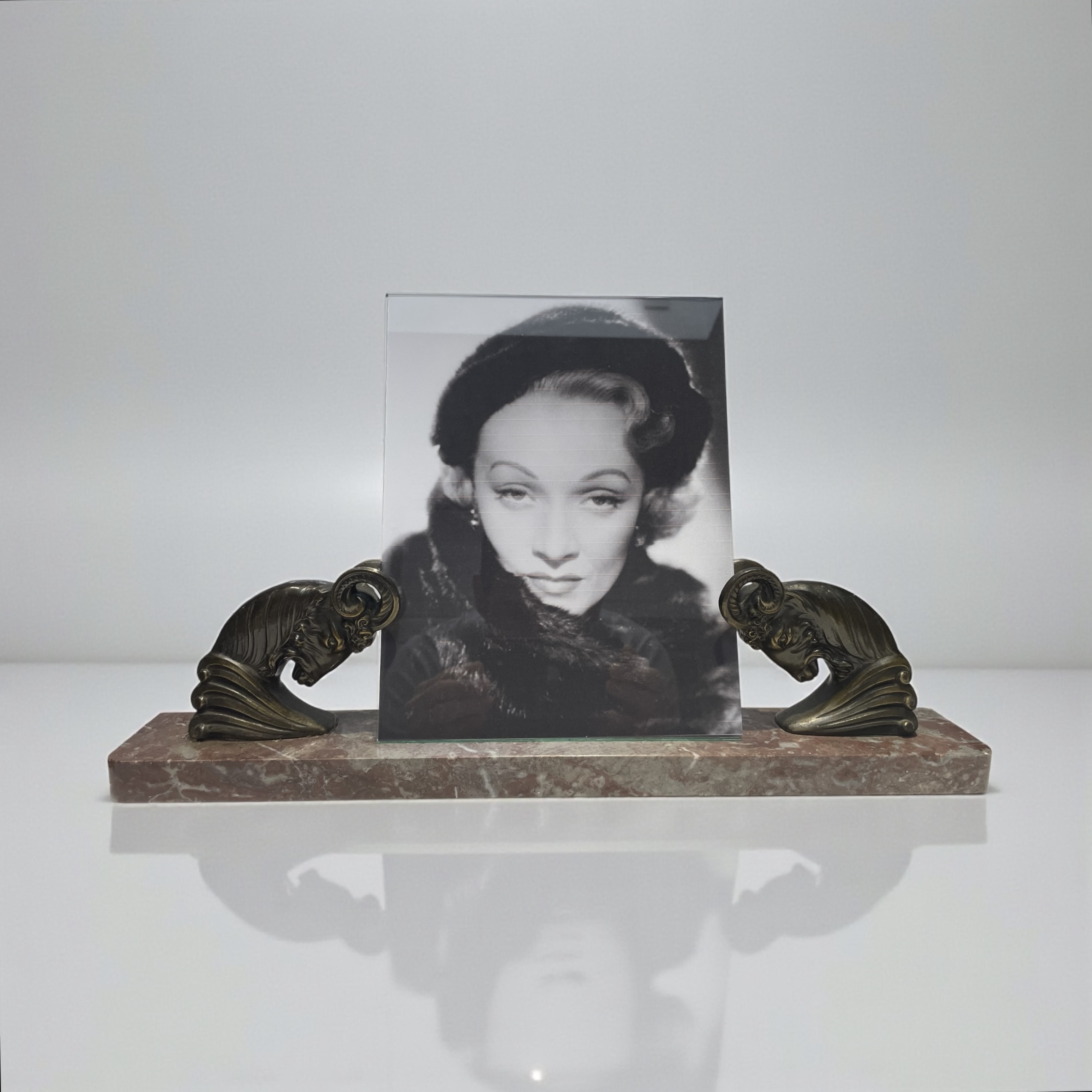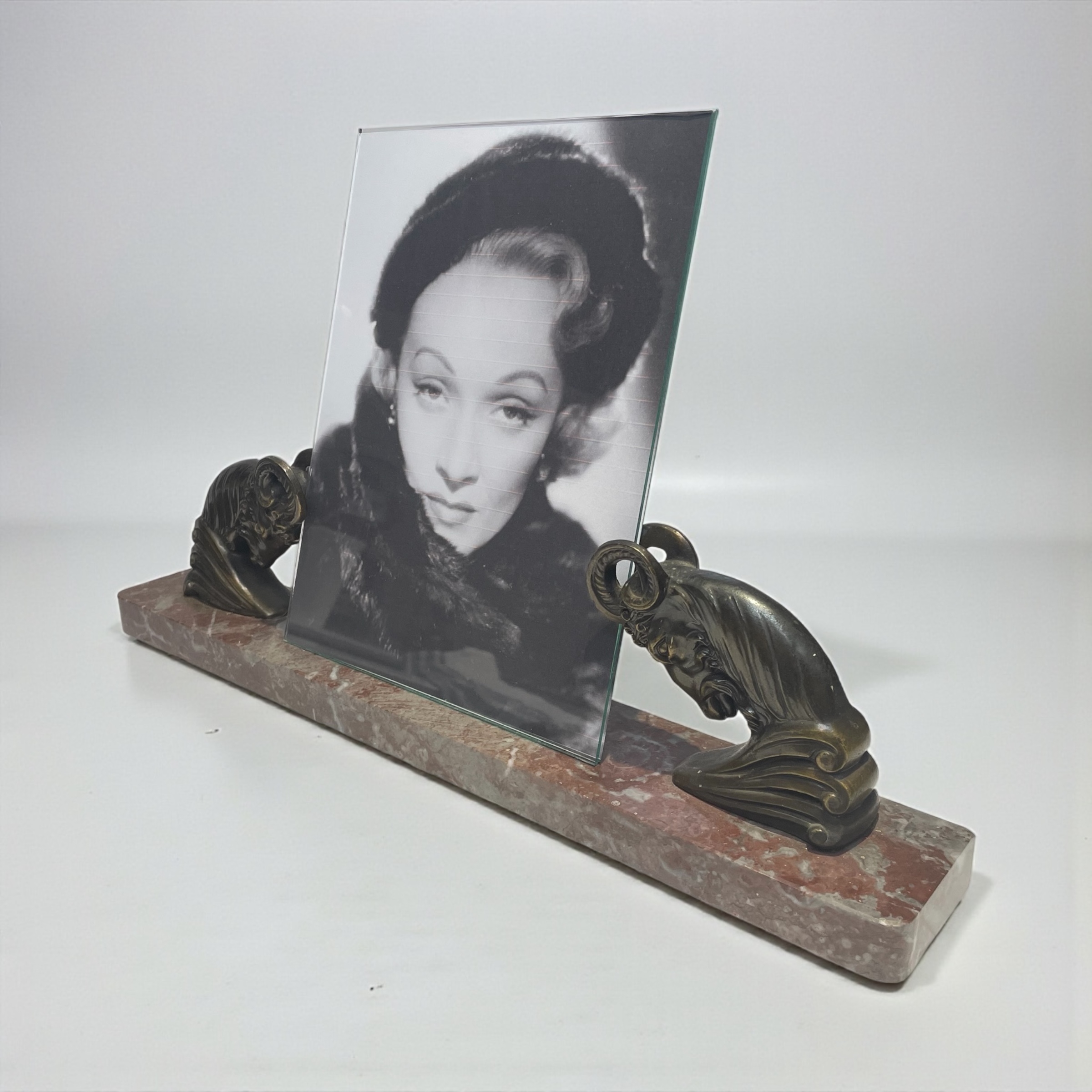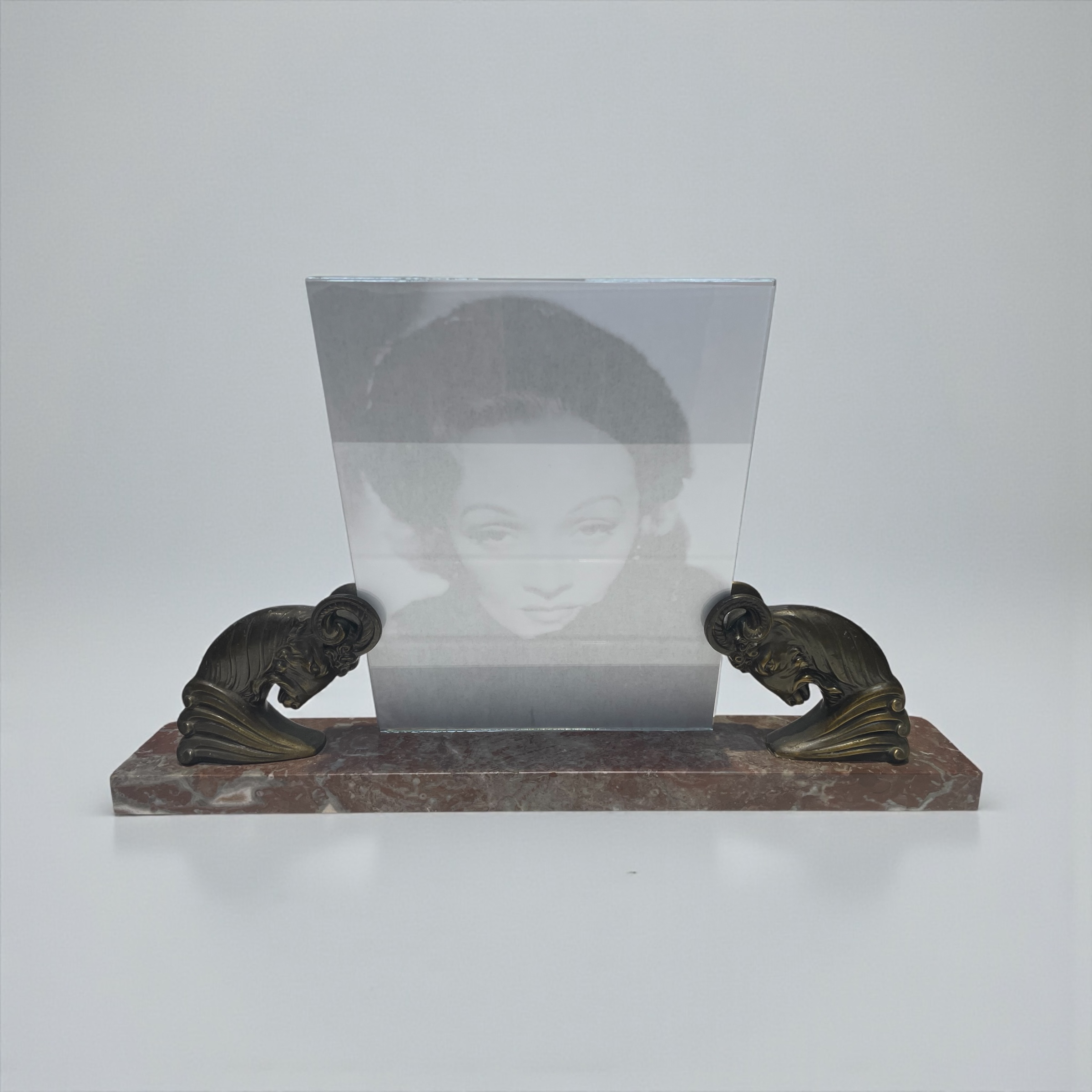 A large Art Deco photo frame, with a burnt red and grey and white veined marble base. The two sheets of picture glass held in place by the horns of two rams.