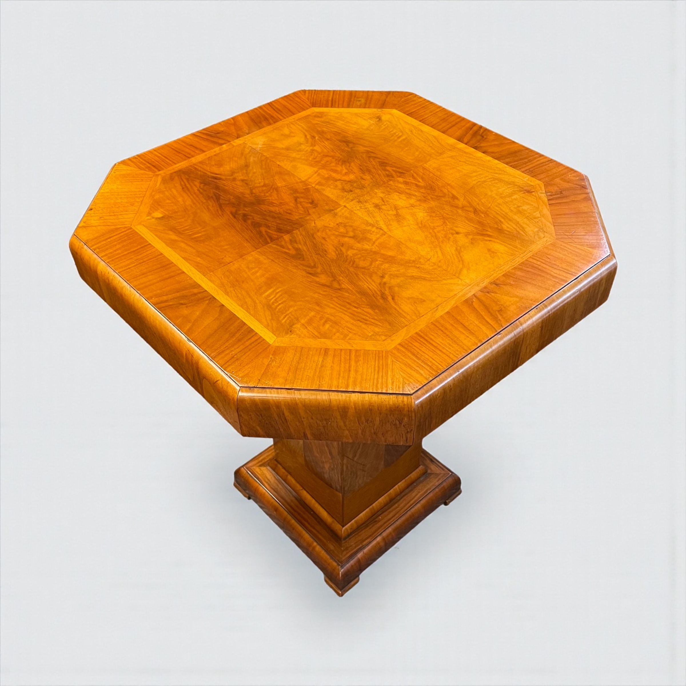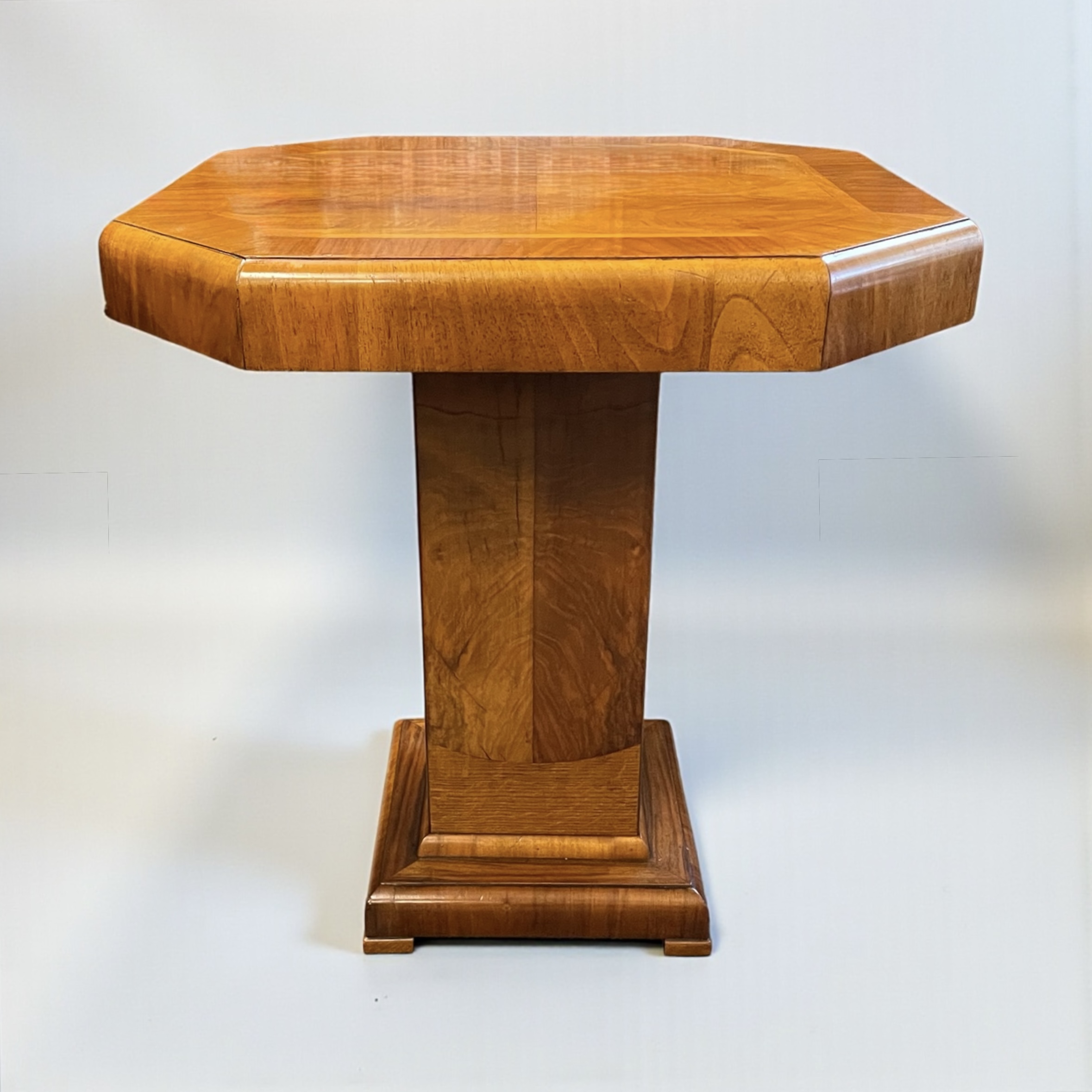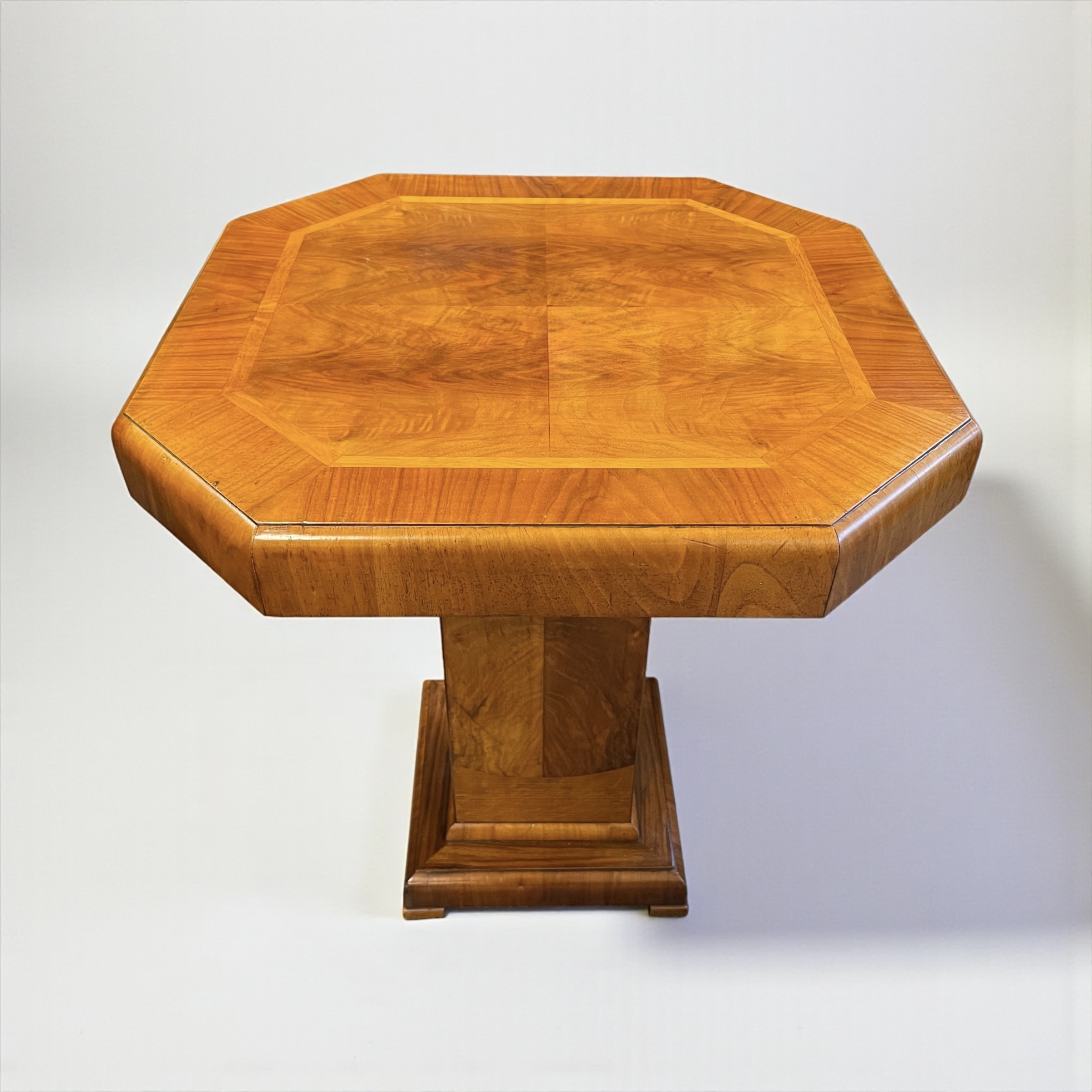 Art Deco Side/Coffee table with an eight sided top, set on a square pedestal and base and raised on four square feet. Various contrasting walnut veneers have been used throughout to create this very attractive table from the 1930s.