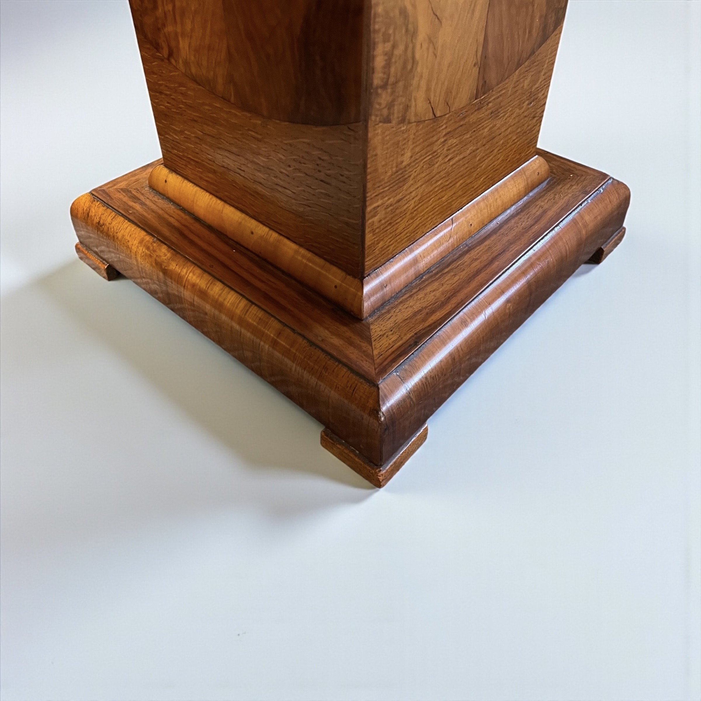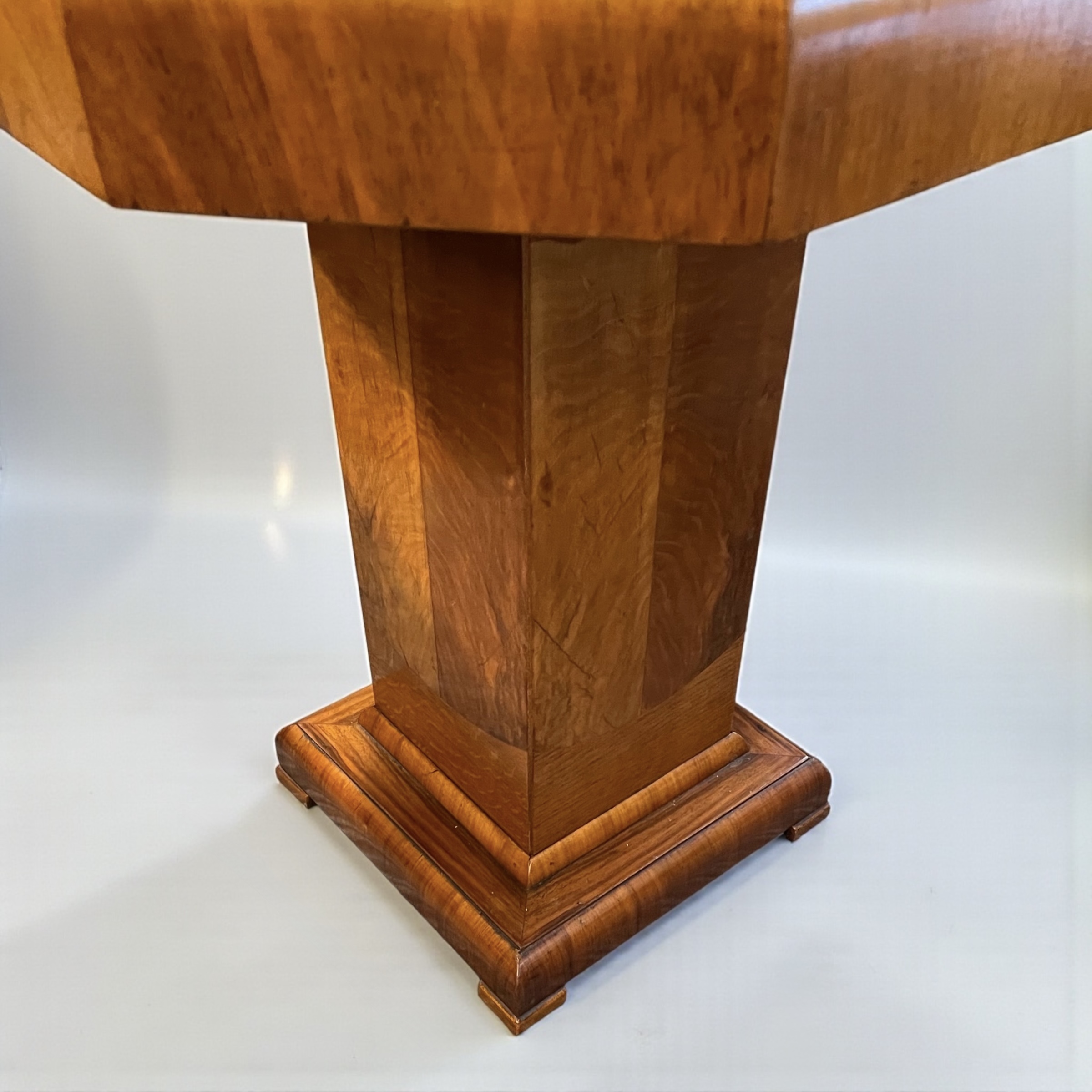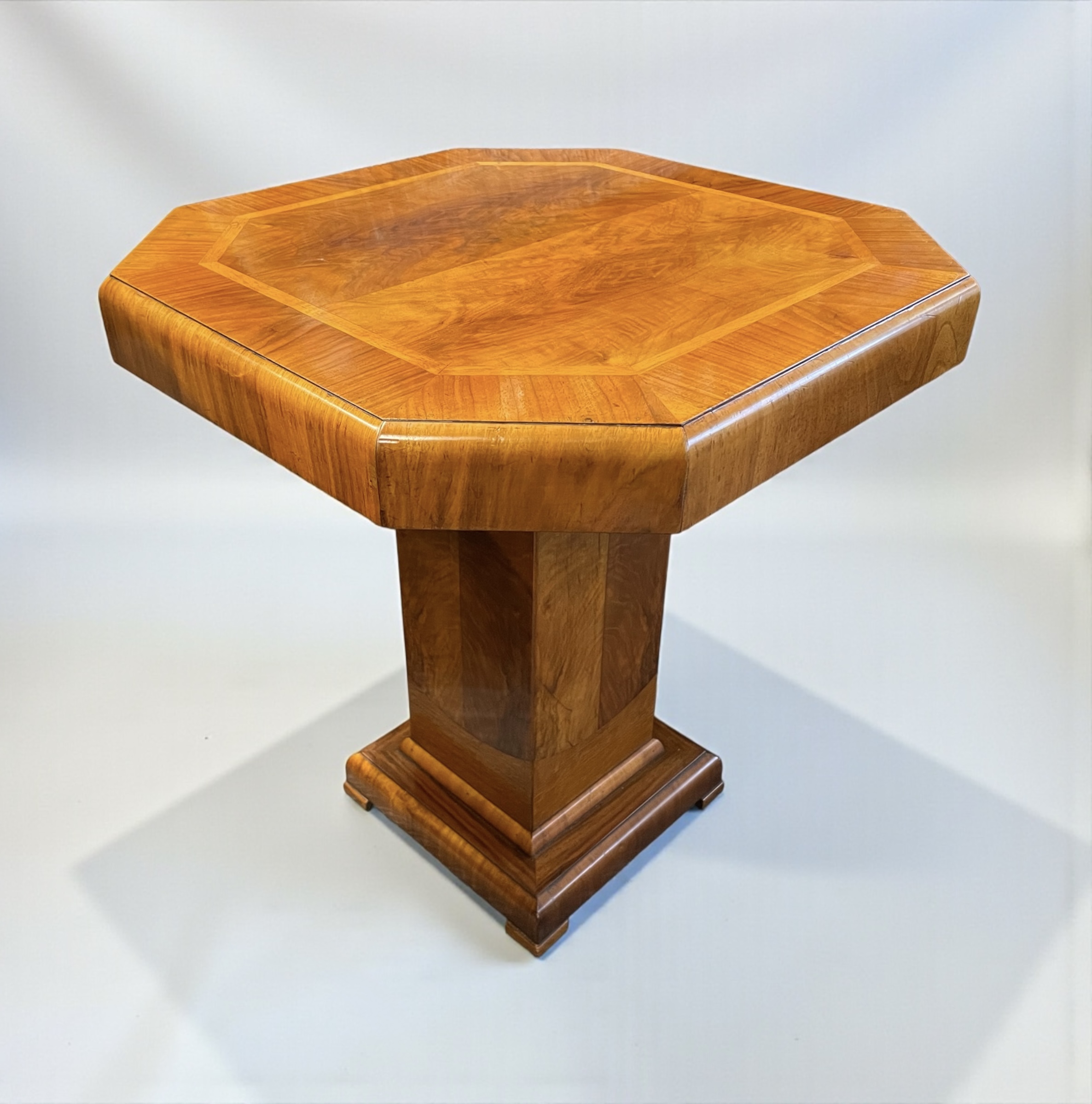 Art Deco Side/Coffee table with an eight sided top, set on a square pedestal and base and raised on four square feet. Various contrasting walnut veneers have been used throughout to create this very attractive table from the 1930s.