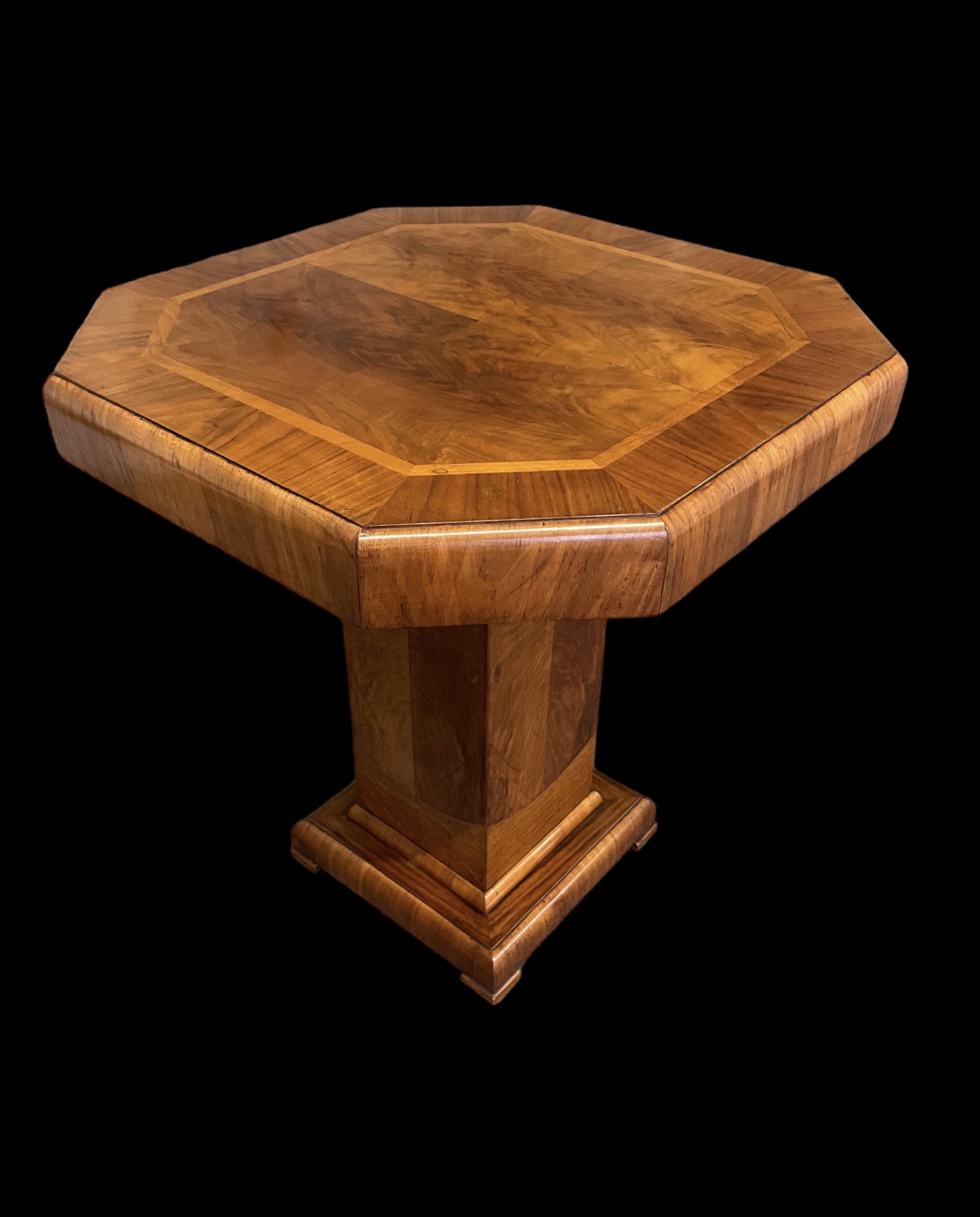 Art Deco Side/Coffee table with an eight sided top set on a square pedestal and base and raised on four square feet. Various contrasting walnut veneers have been used throughout to create a very attractive table from the 1930s.