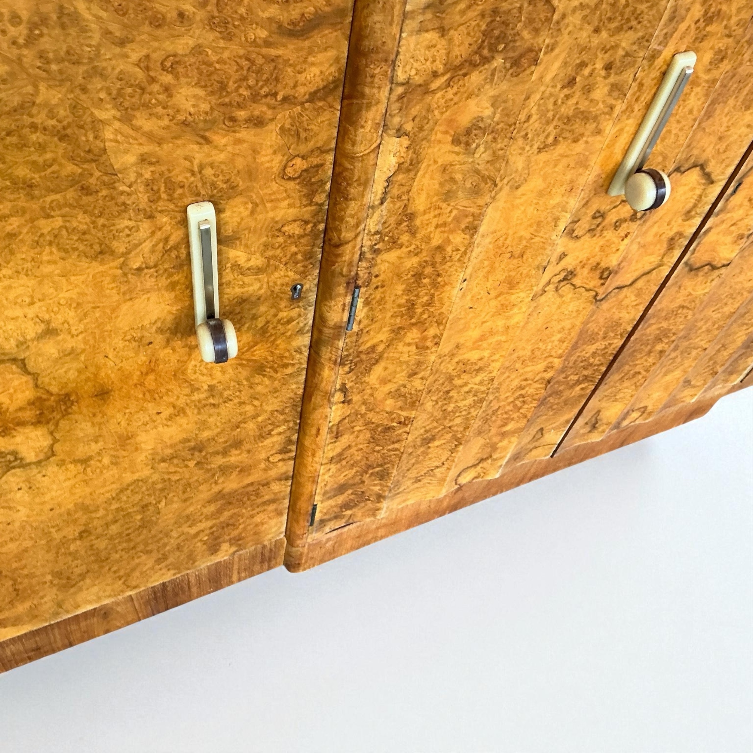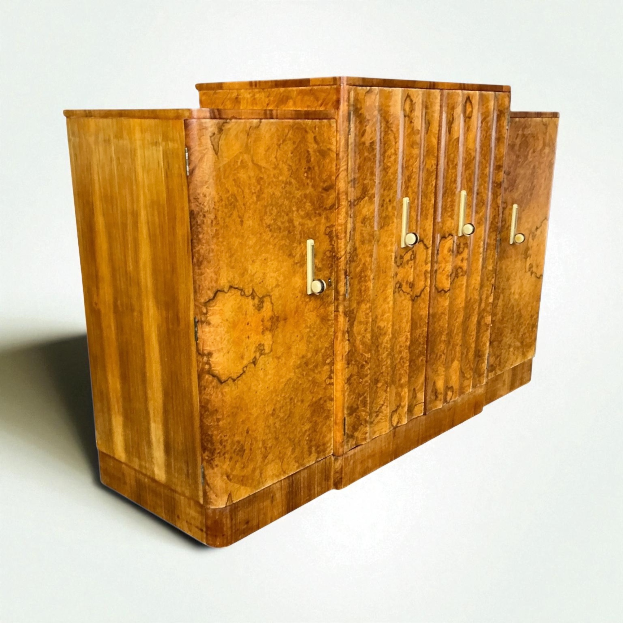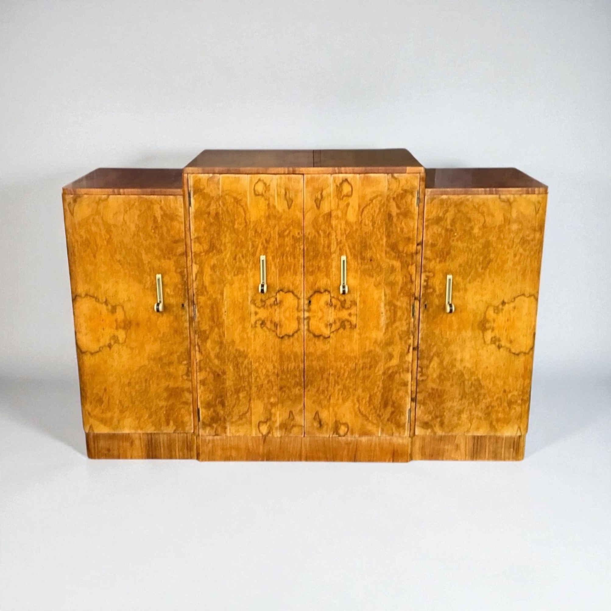 Art Deco Sideboard in figured walnut. by Harry and Lou Epstein. The four cupboard doors each with a cream phenolic and metal curved handle. The end cupboards each with two shelves and the central doors open to three drawers and a compartment below for bottle storage. All our furniture is professionally waxed and polished and restored where necessary. This Epstein sideboard in showroom condition.