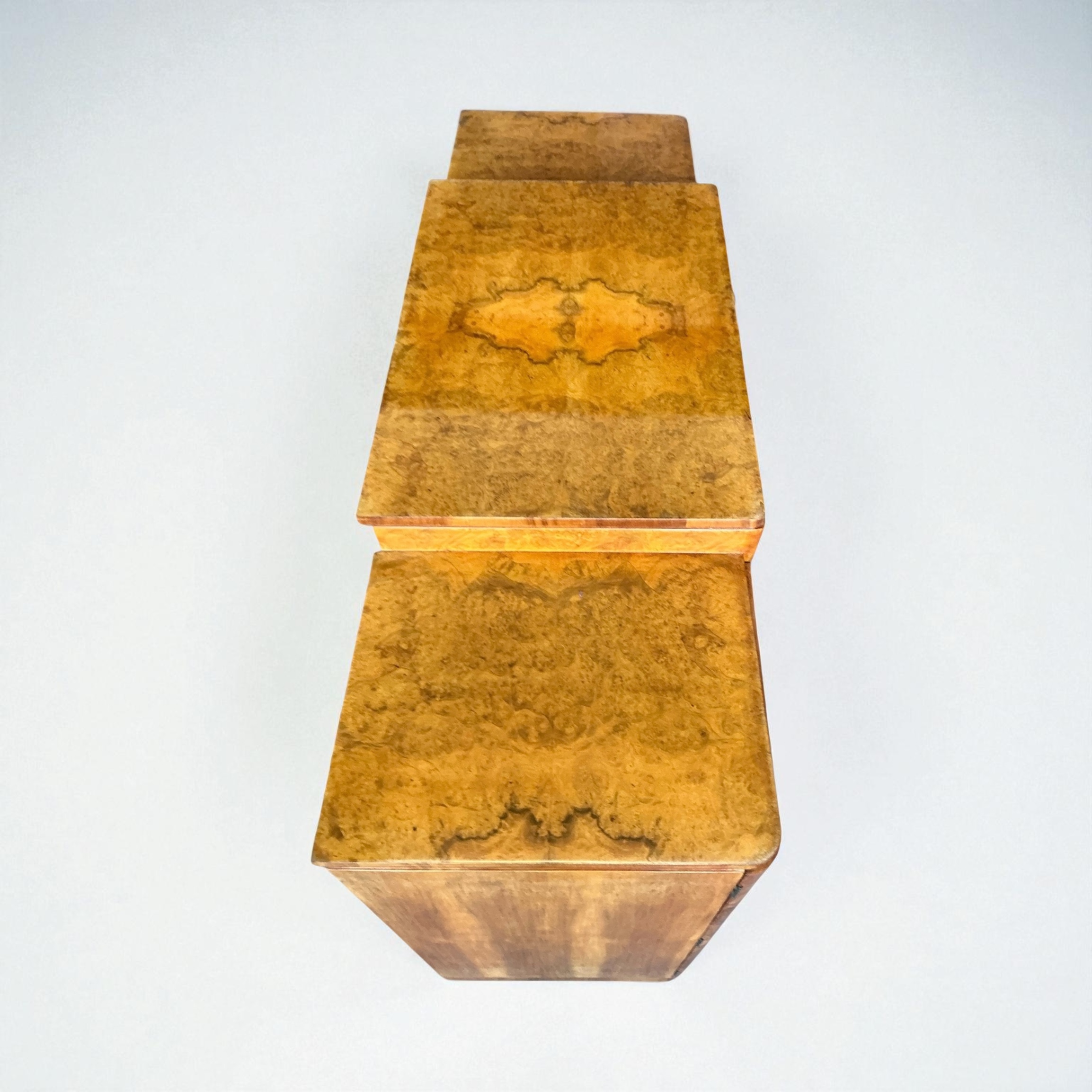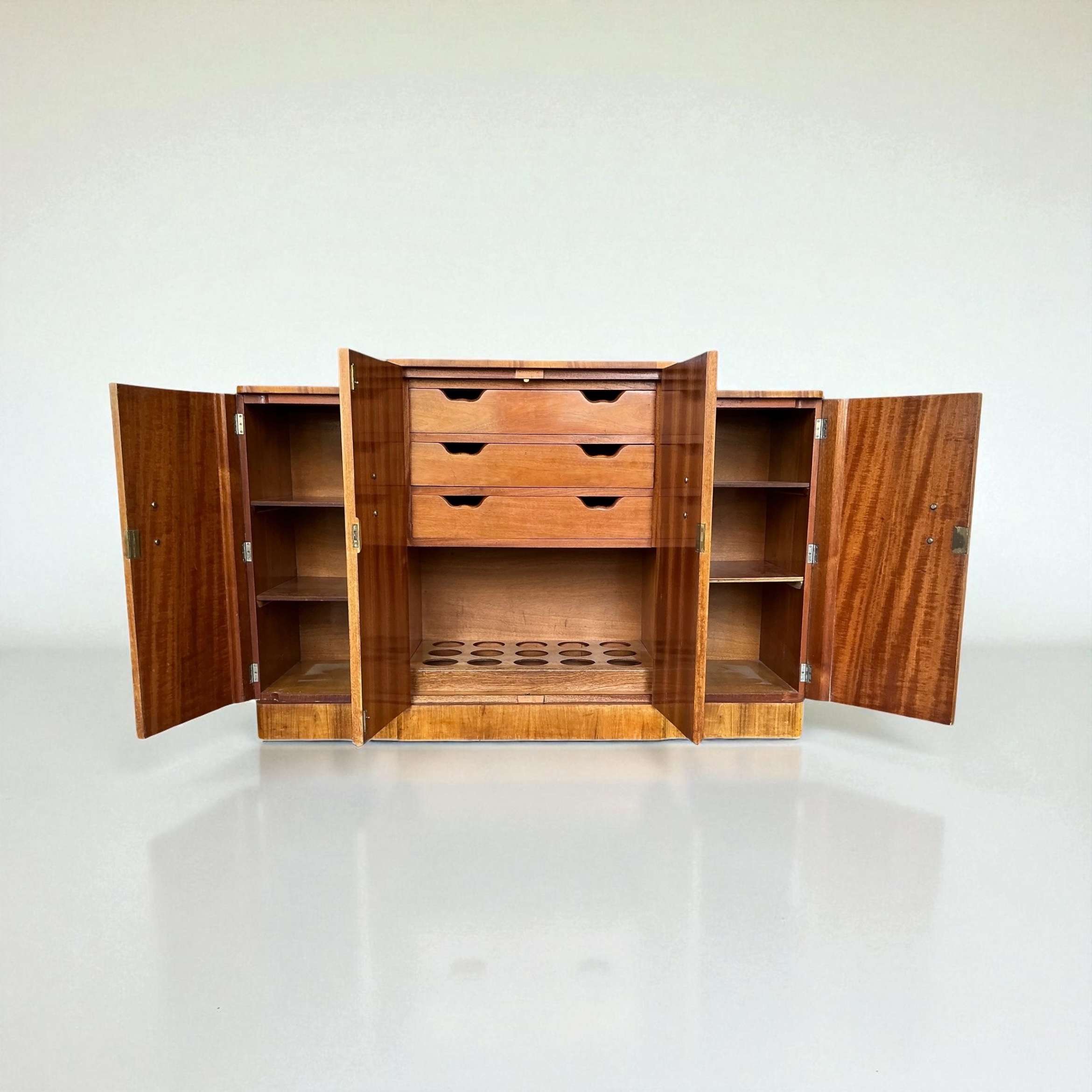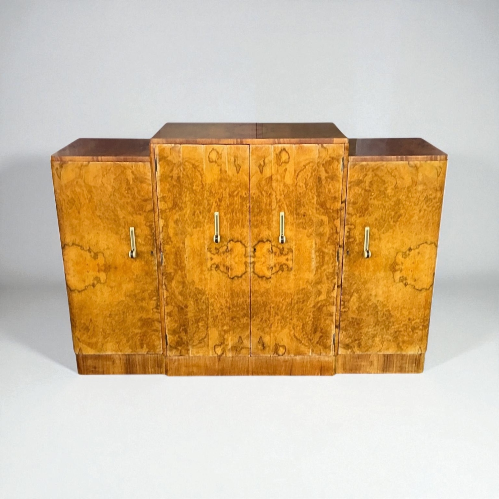 Art Deco Sideboard in figured walnut. by Harry and Lou Epstein. The four cupboard doors each with a cream phenolic and metal curved handle. The end cupboards each with two shelves and the central doors open to three drawers and a compartment below for bottle storage. All our furniture is professionally waxed and polished and restored where necessary. This Epstein sideboard in showroom condition.