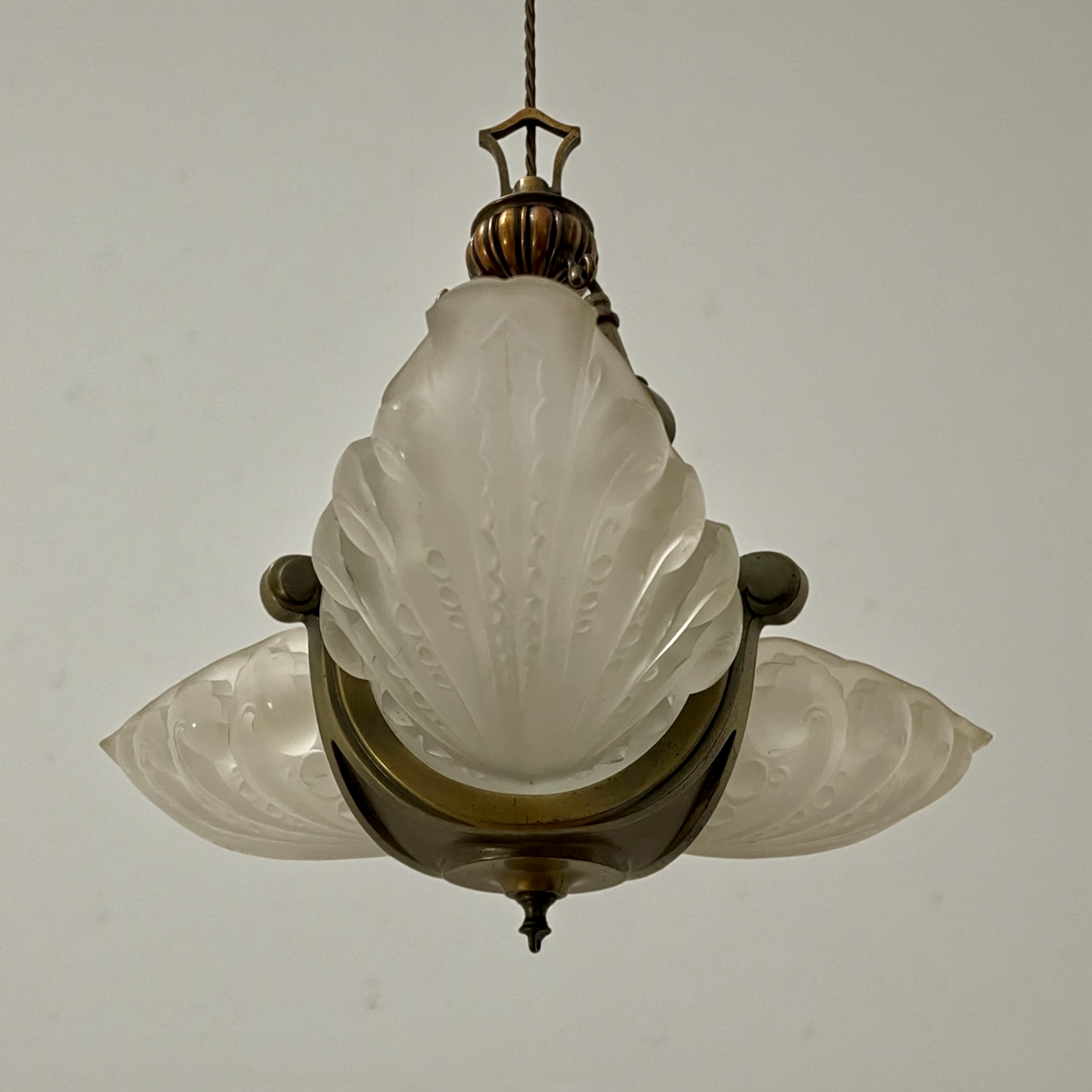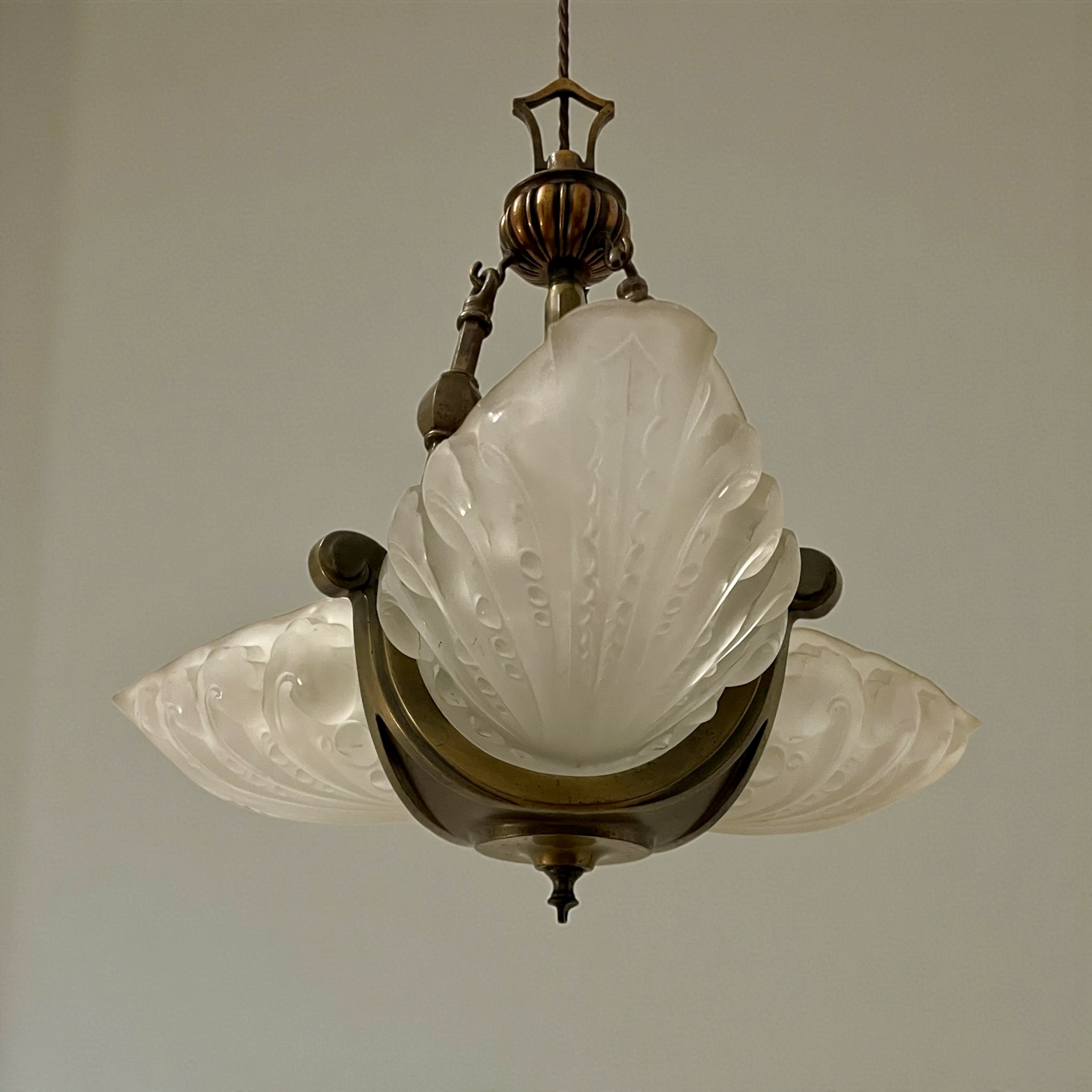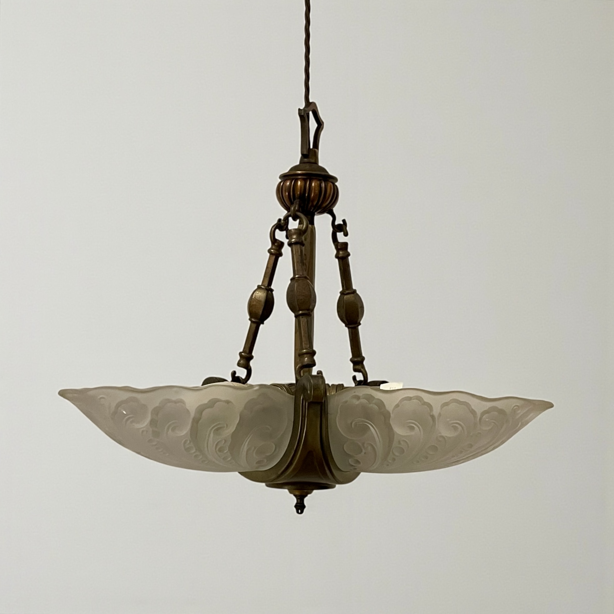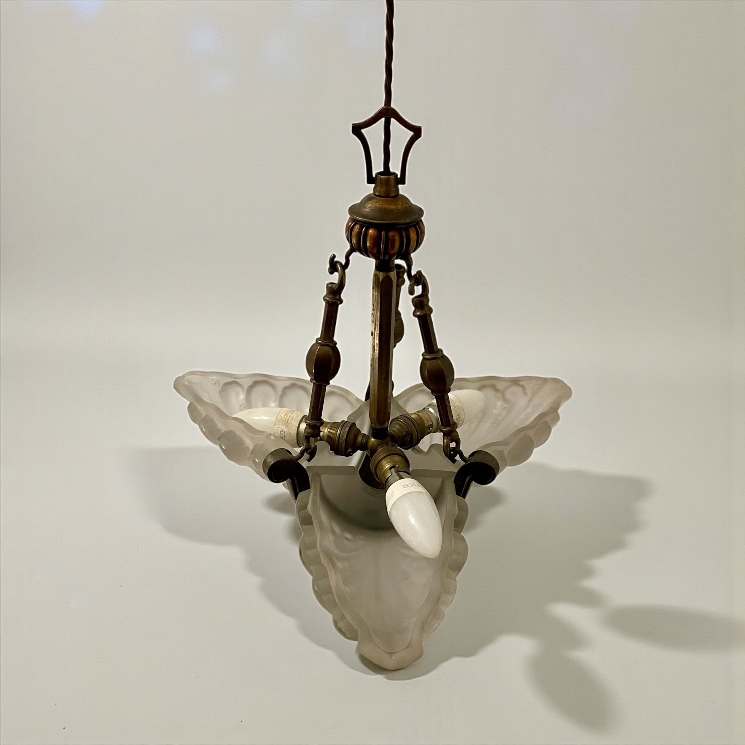 Art Deco ‘Slip’ Shade Chandelier, with three thick, moulded glass shades that slip into the three arms of the bronze effect frame. In very good condition and just rewired with an authentic brown cord lead and PAT tested.