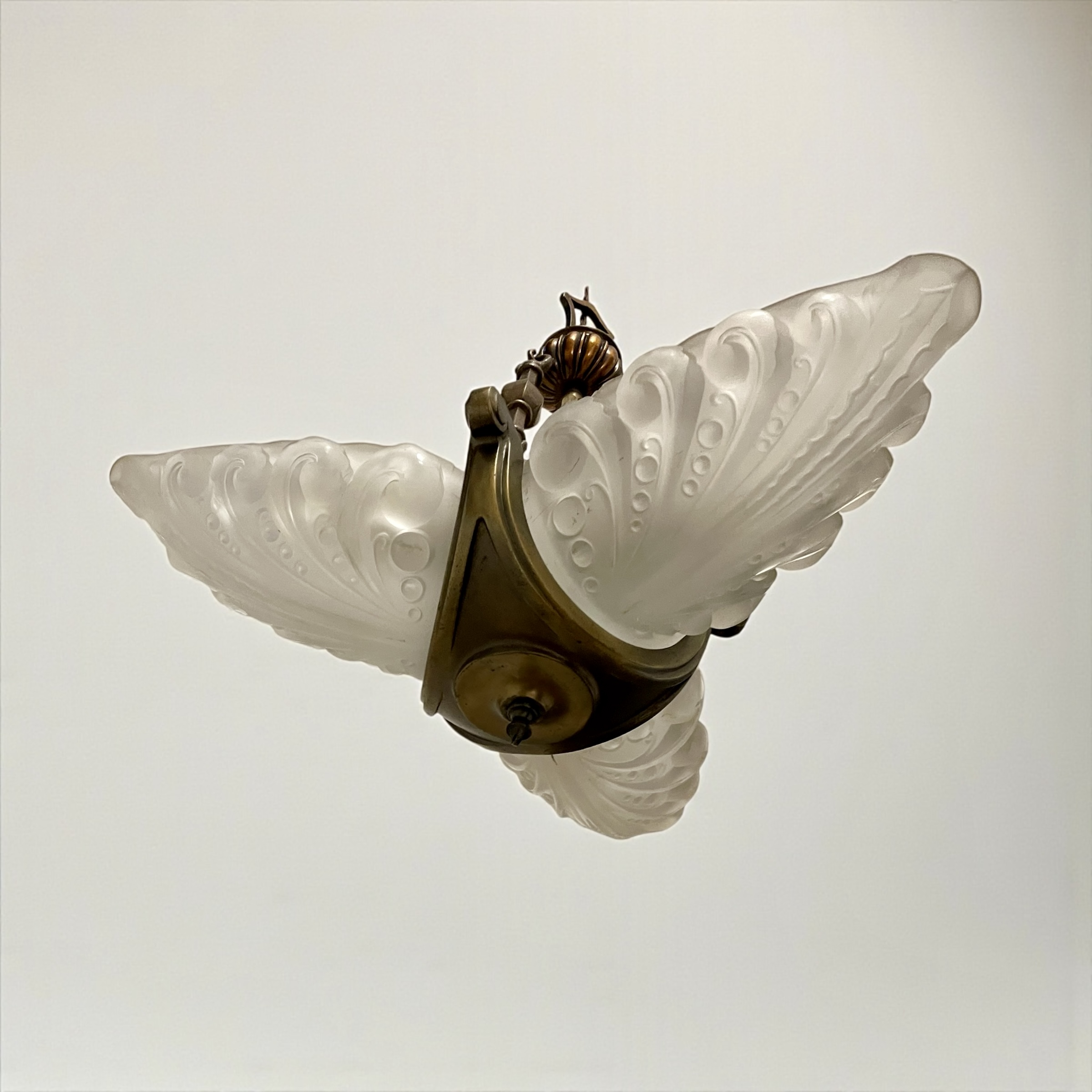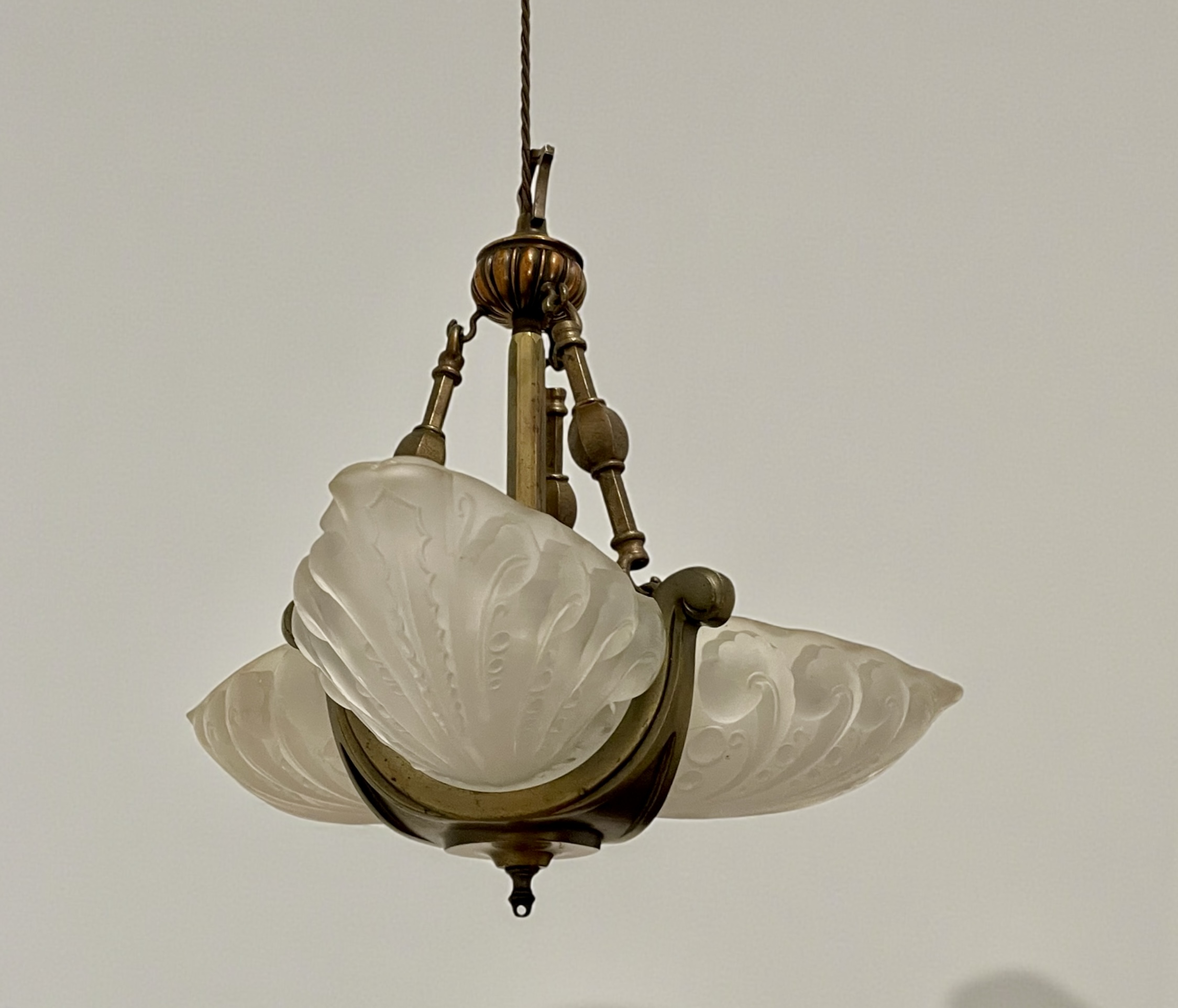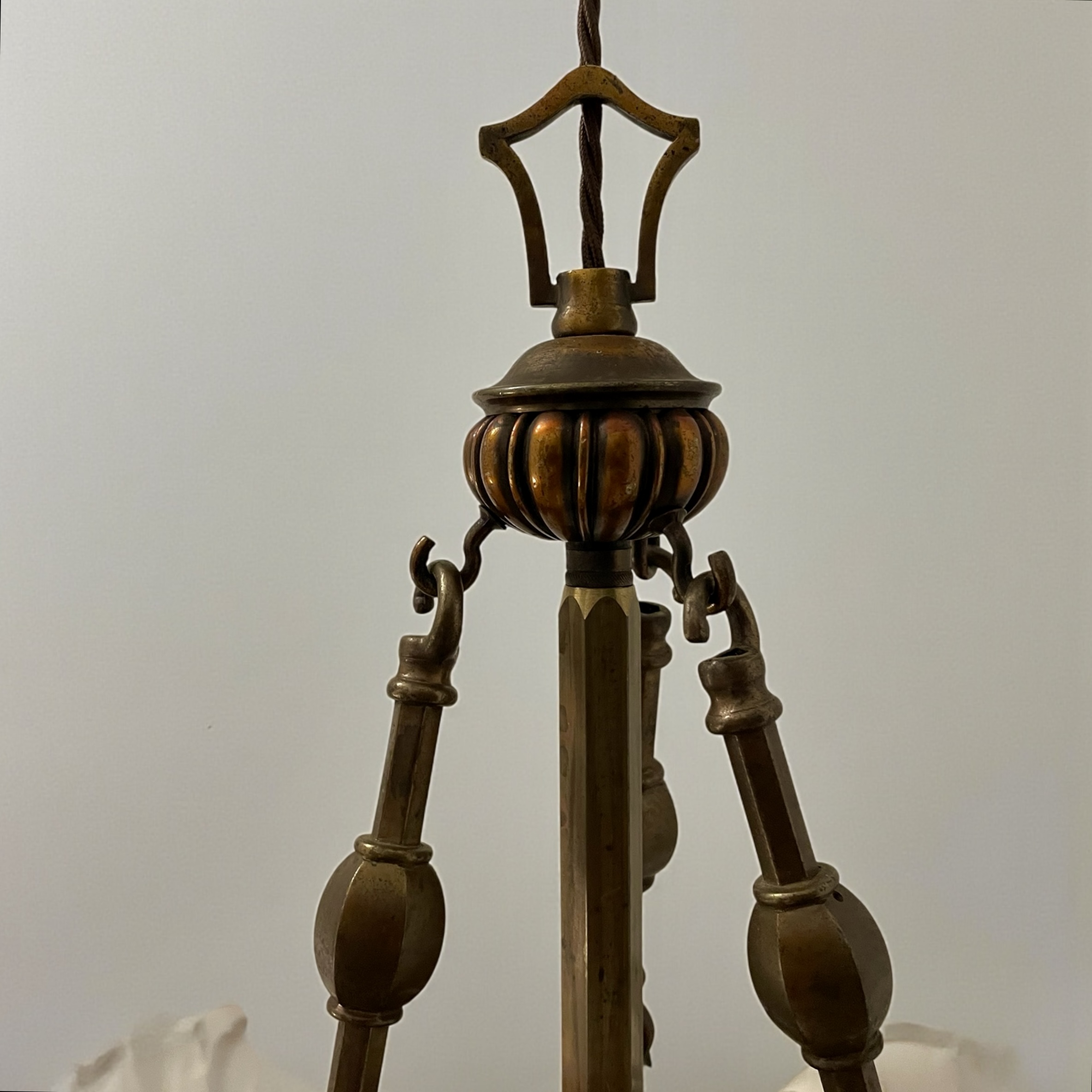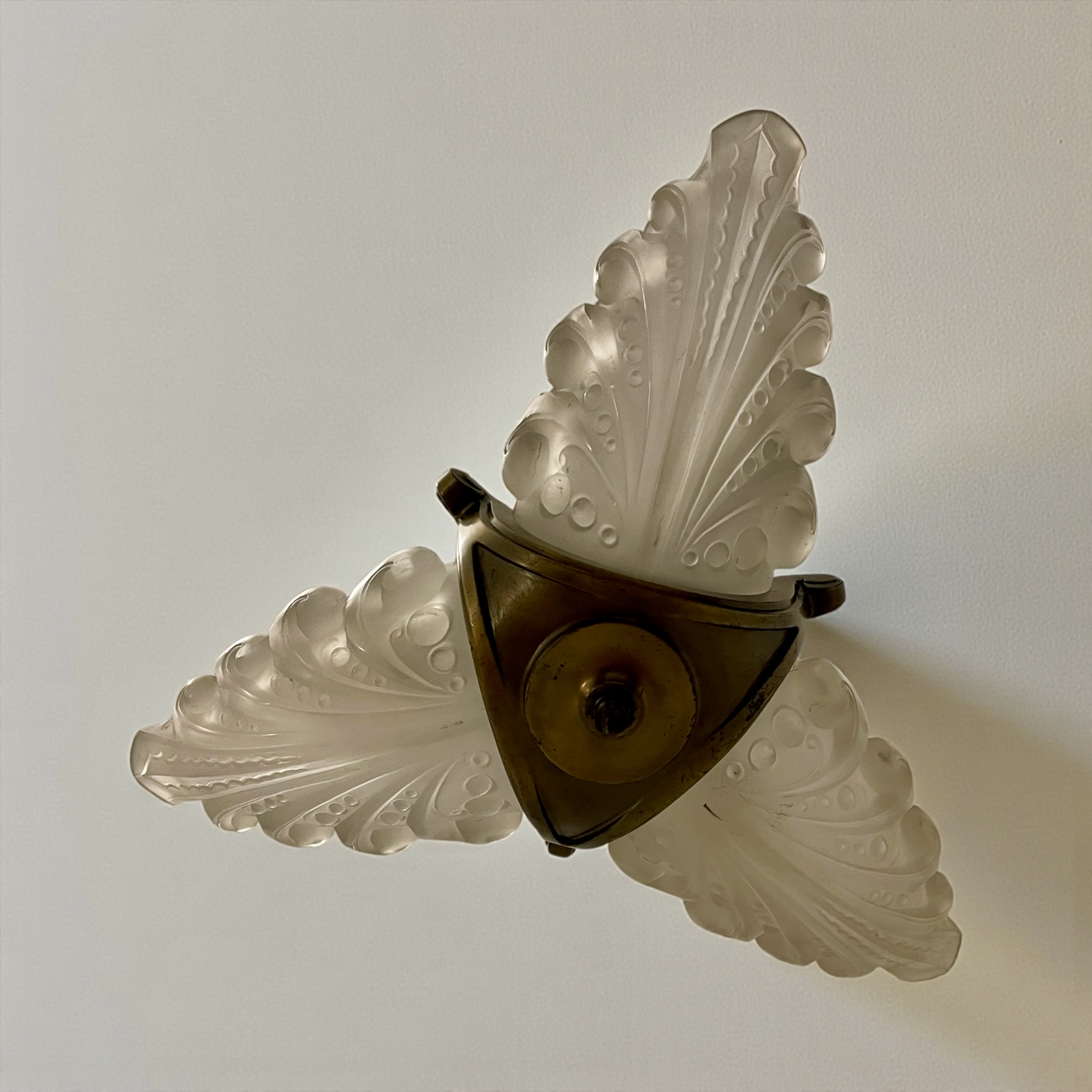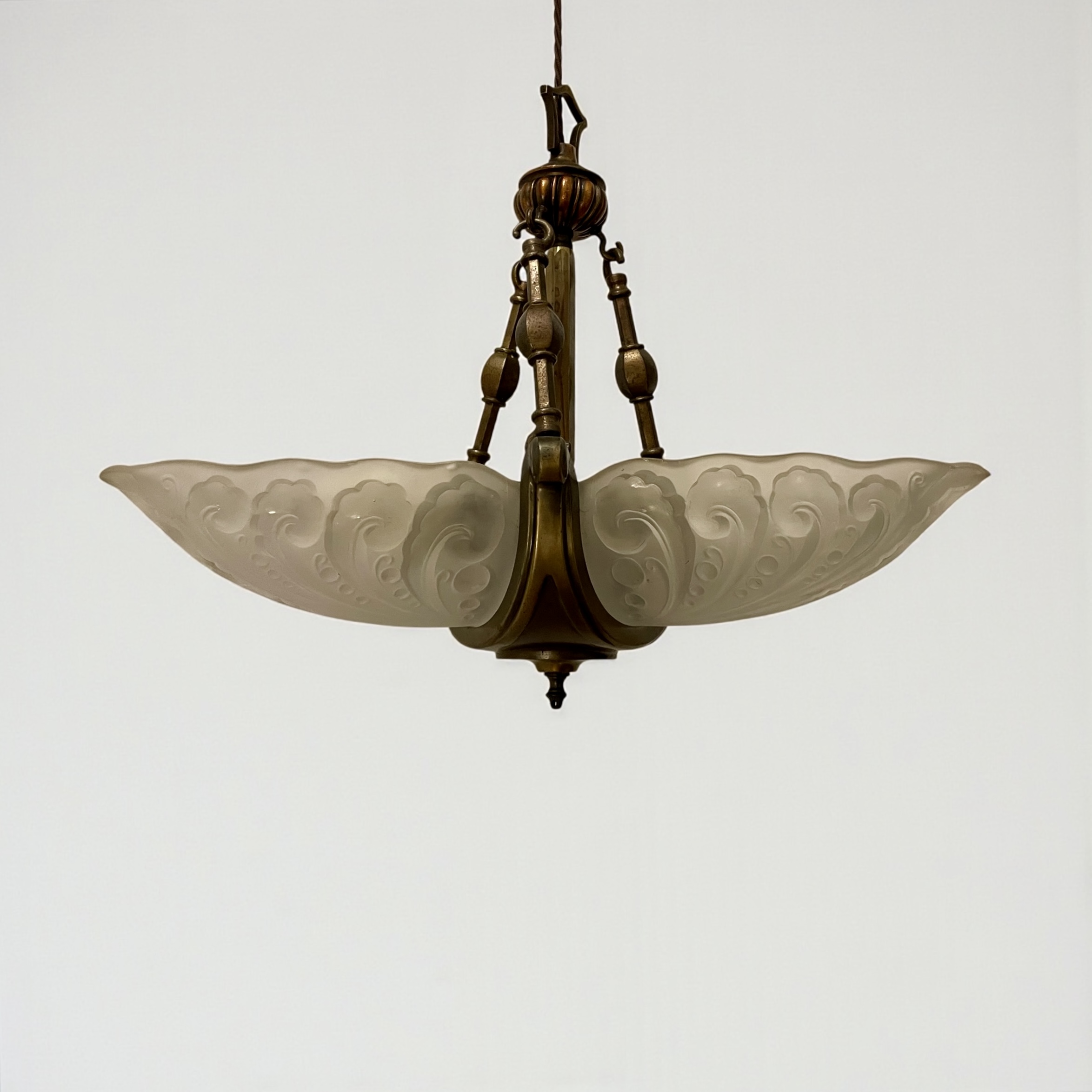 Art Deco ‘Slip’ Shade Chandelier, with three thick, moulded glass shades that slip into the three arms of the bronze effect frame. In very good condition and just rewired with an authentic brown cord lead and PAT tested.