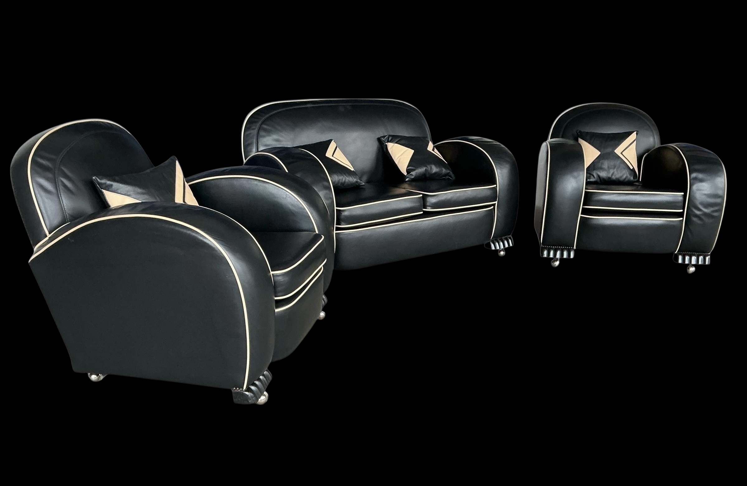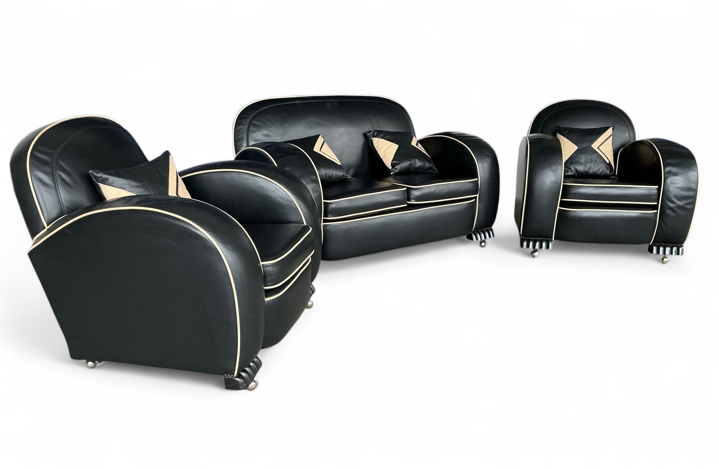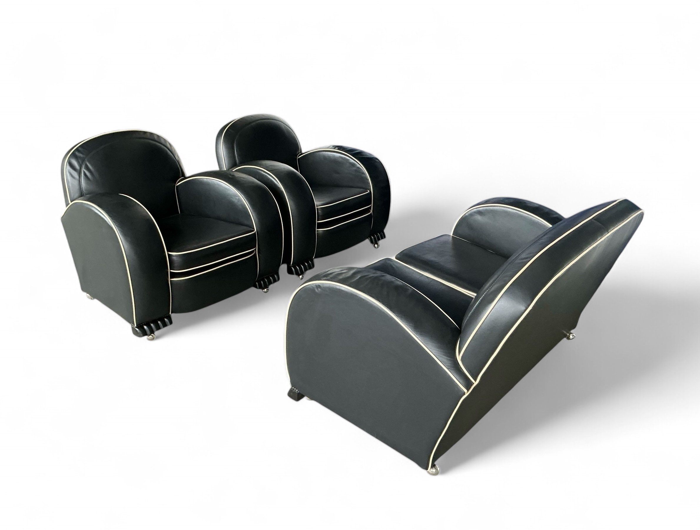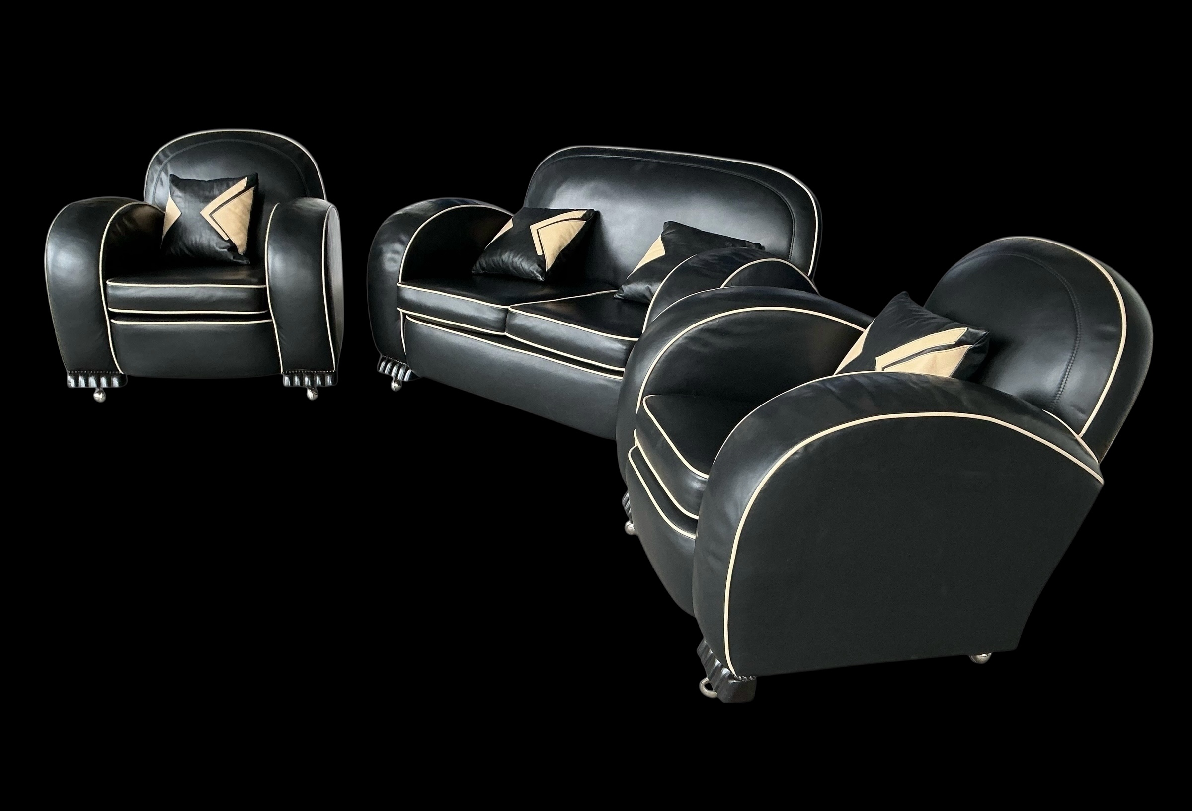 A good quality Art Deco two seater sofa and two matching armchairs. Reupholstered by the previous owner in soft black leather with cream piping. Very solid construction and good sprung seats. Raised on elephant shaped feet and chrome castors. The four leather cushions included in the purchase.