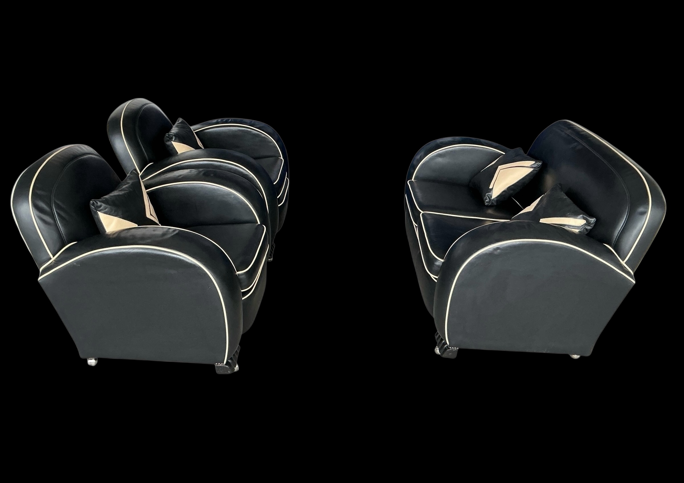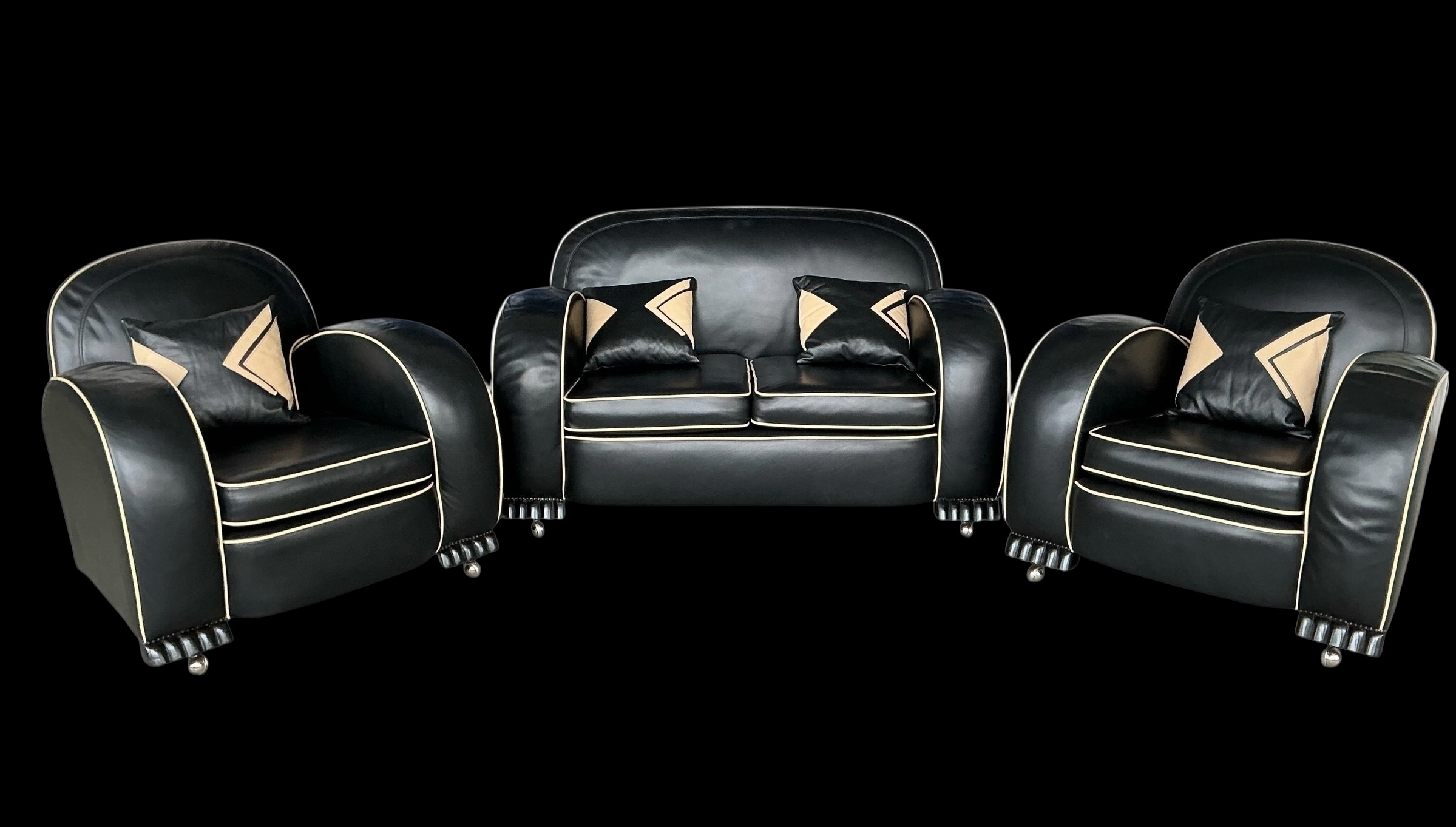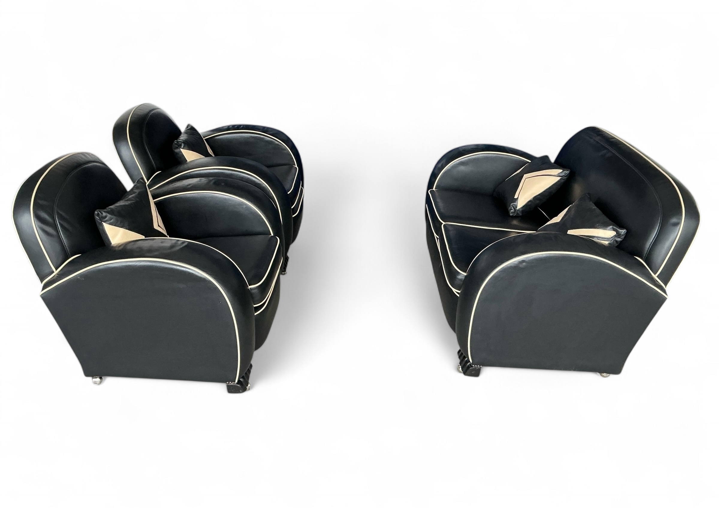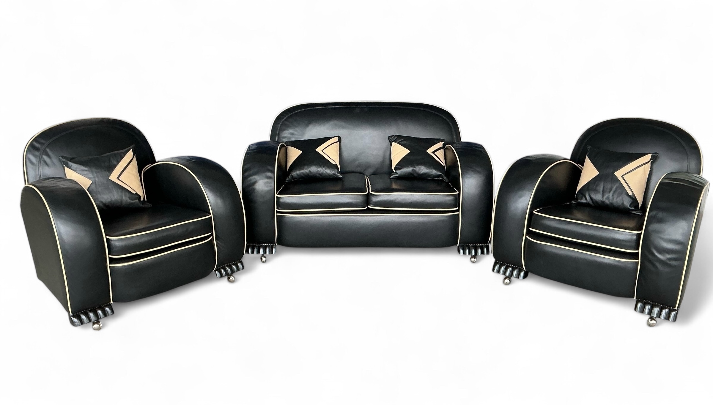 A good quality Art Deco two seater sofa and two matching armchairs. Reupholstered by the previous owner in soft black leather with cream piping. Very solid construction and good sprung seats. Raised on elephant shaped feet and chrome castors. The four leather cushions included in the purchase.