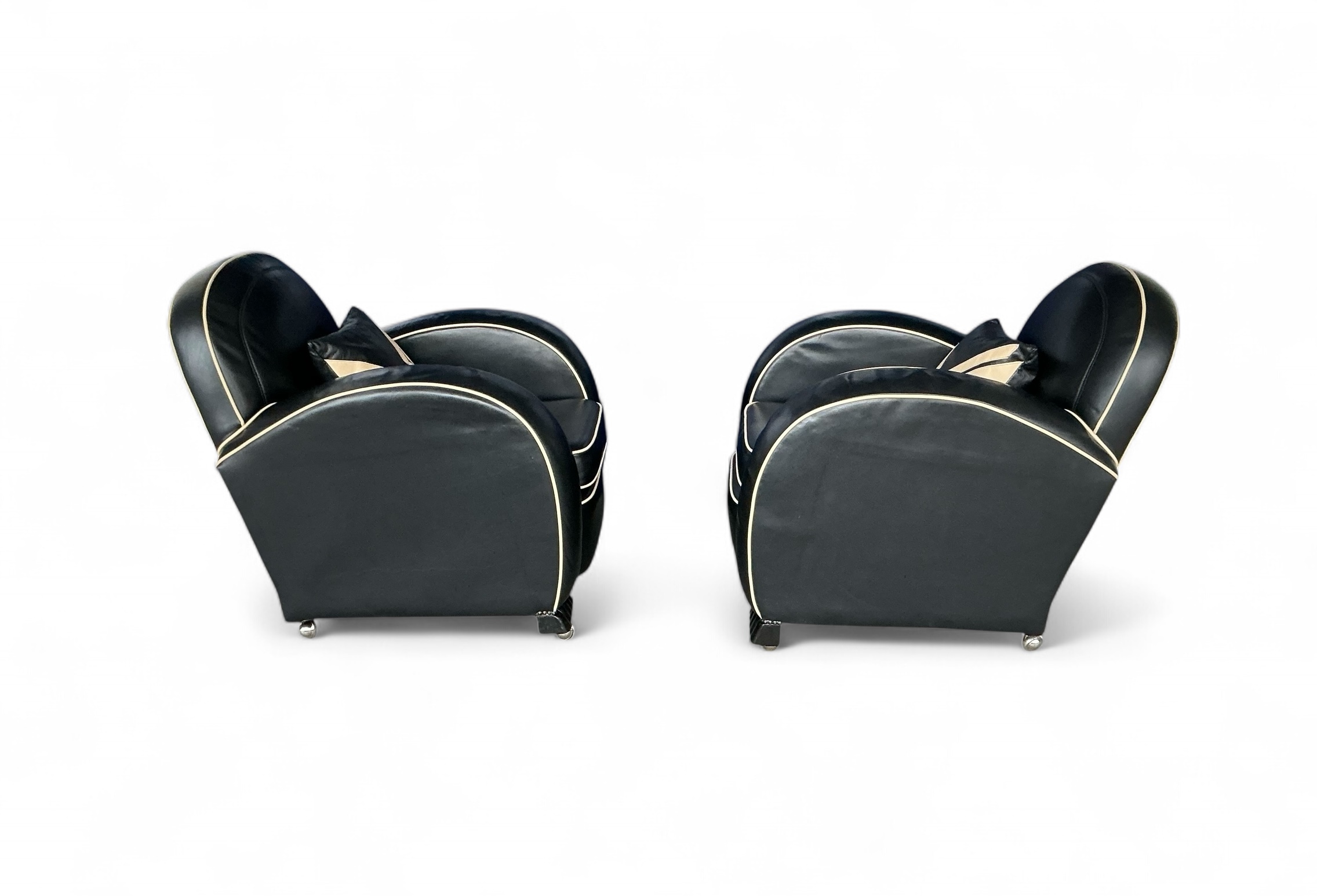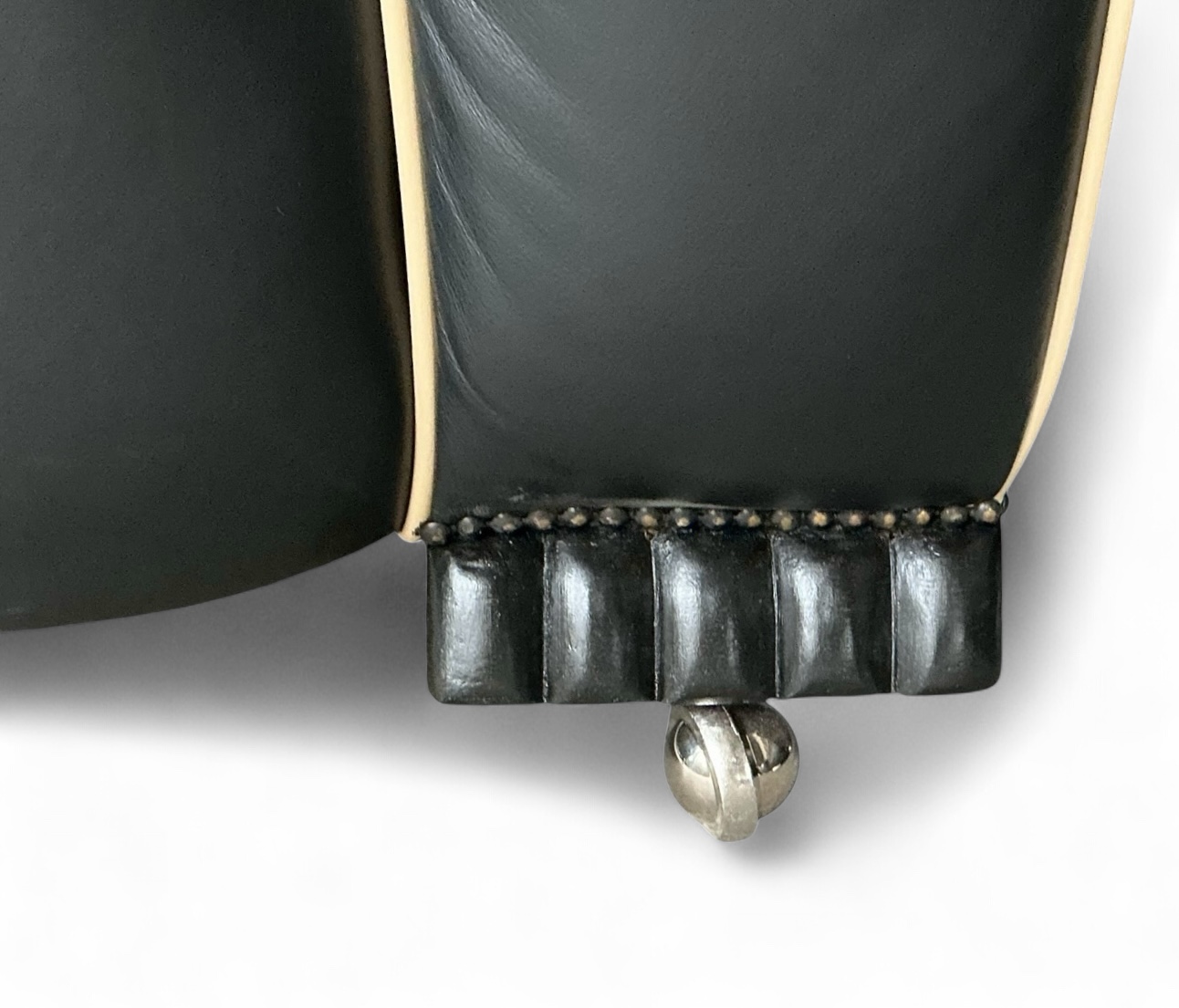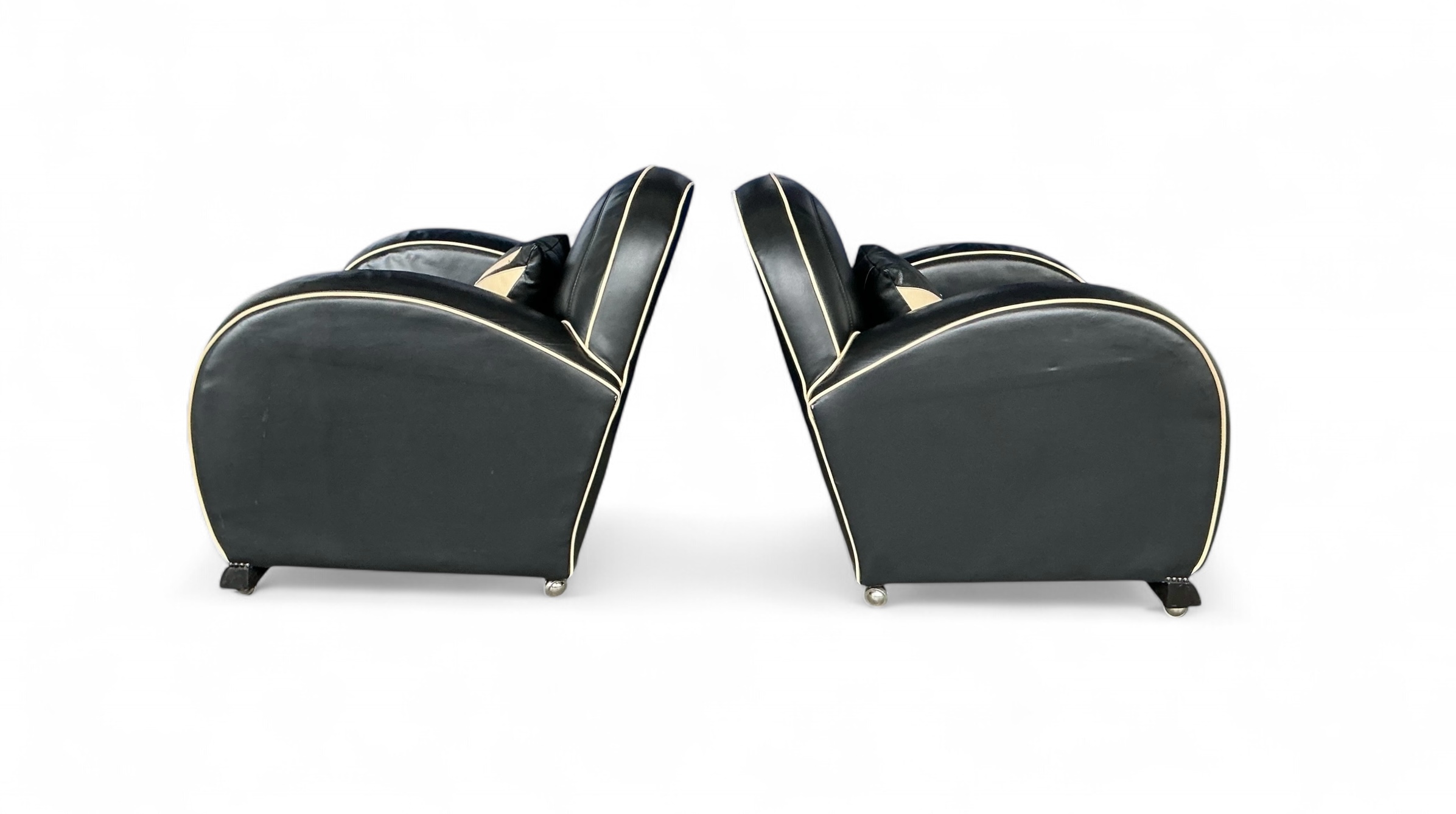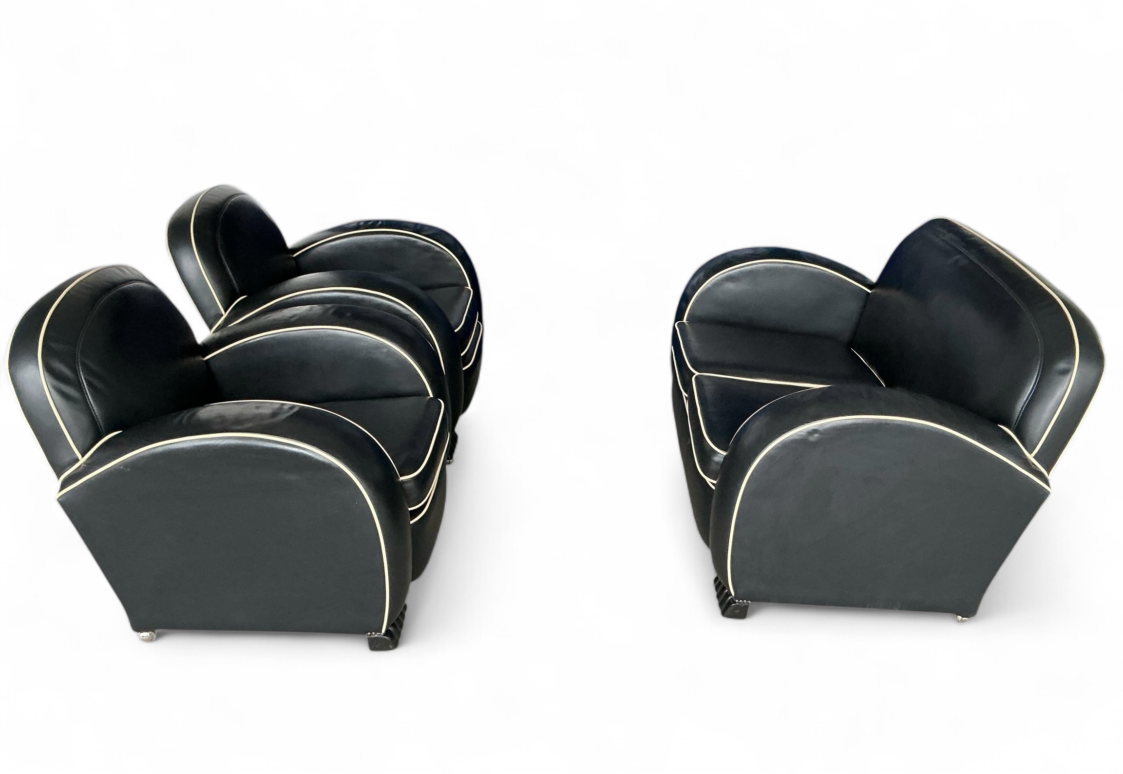A good quality Art Deco two seater sofa and two matching armchairs. Reupholstered by the previous owner in soft black leather with cream piping. Very solid construction and good sprung seats. Raised on elephant shaped feet and chrome castors. The four leather cushions included in the purchase.