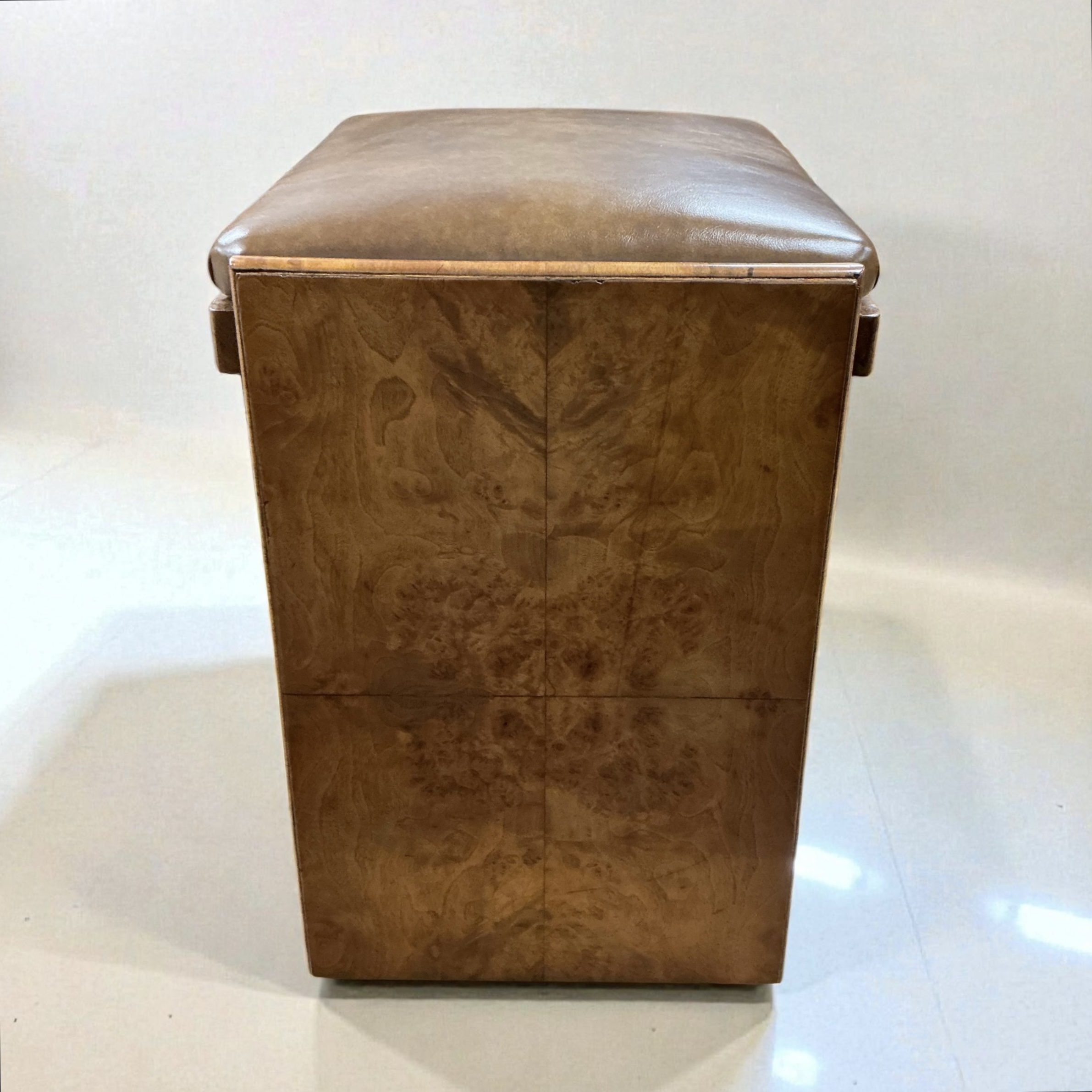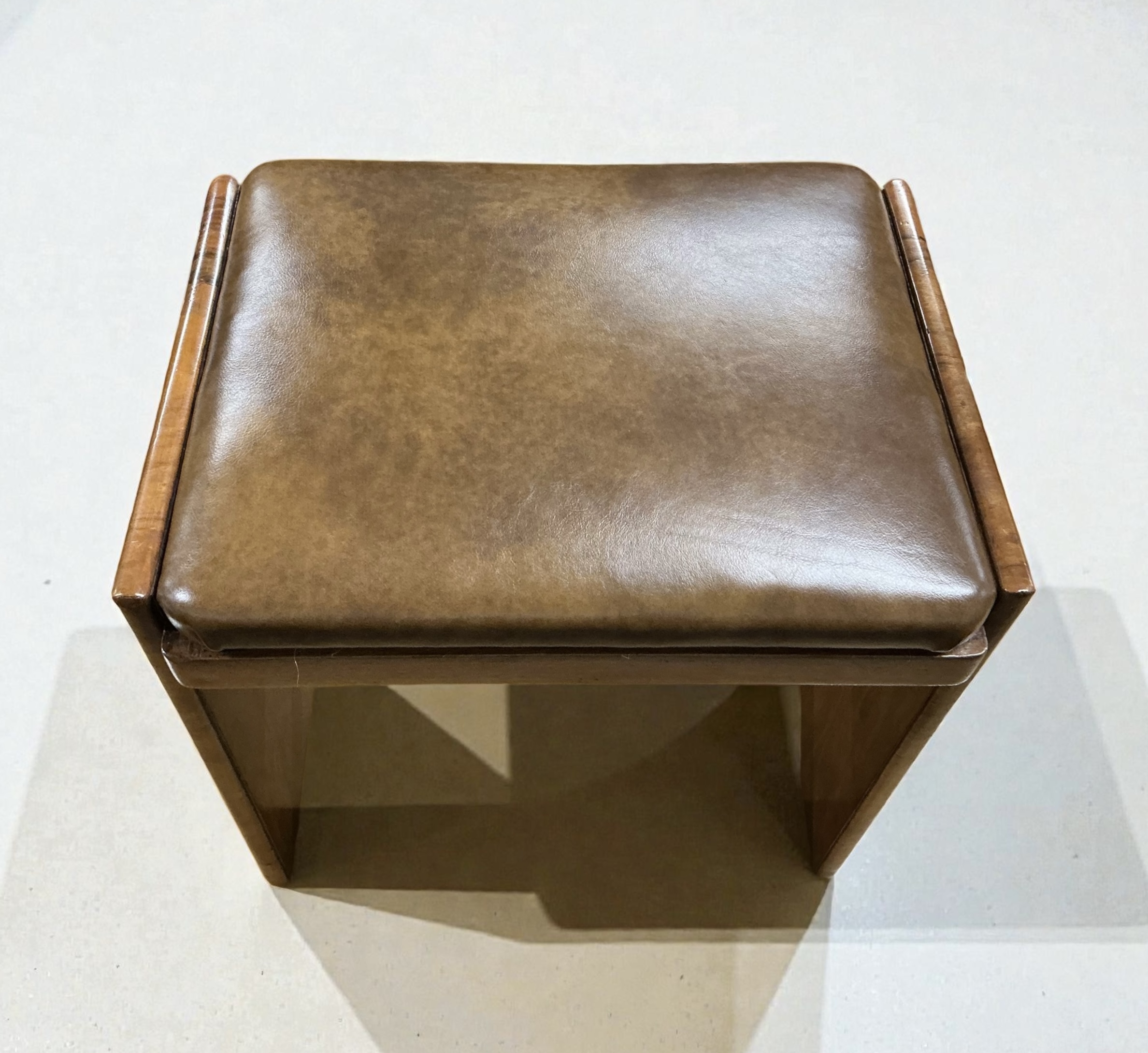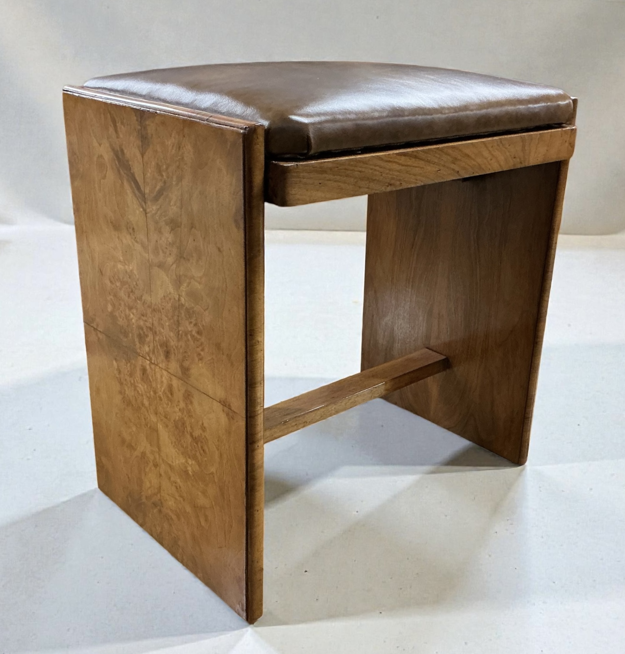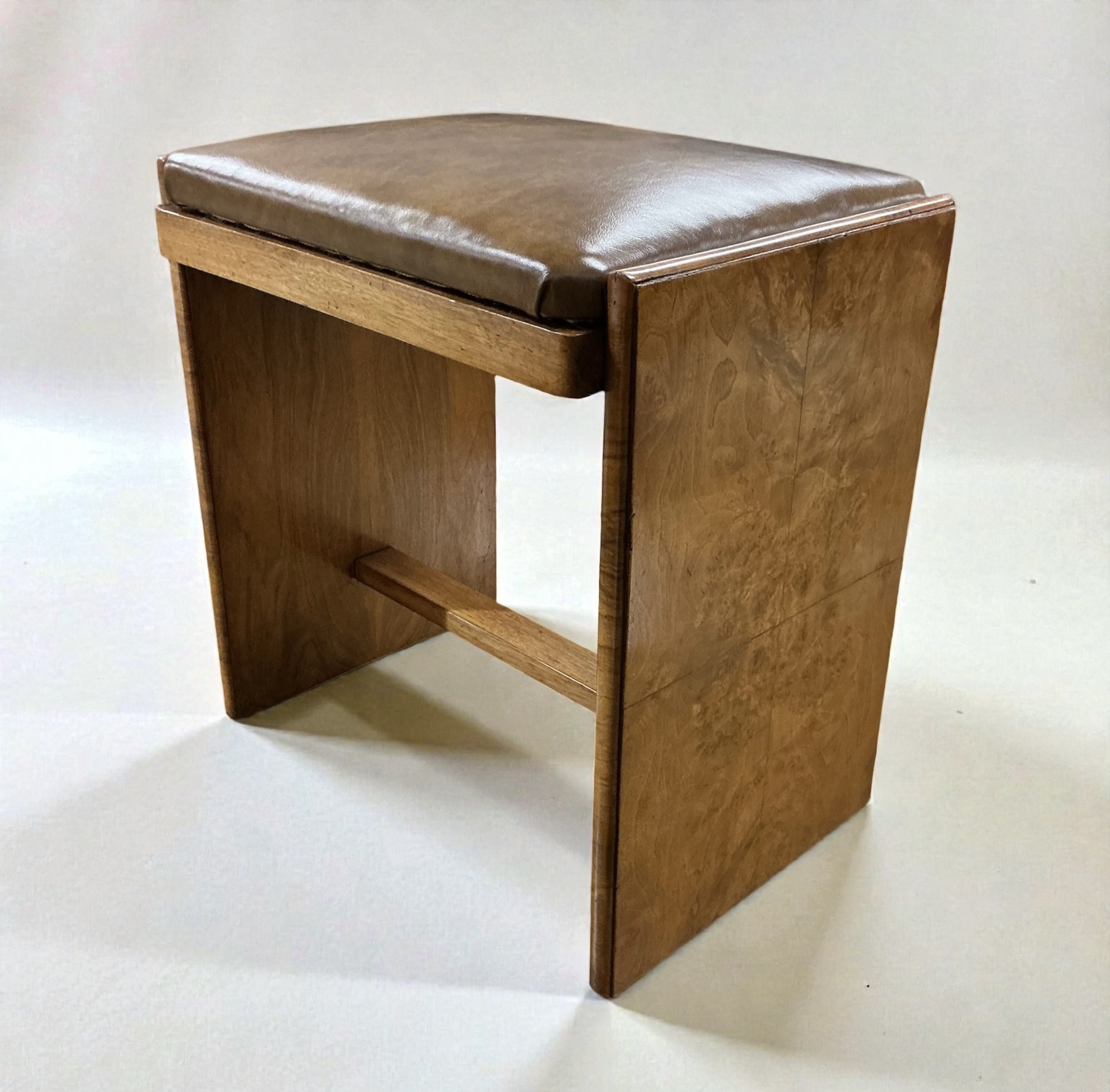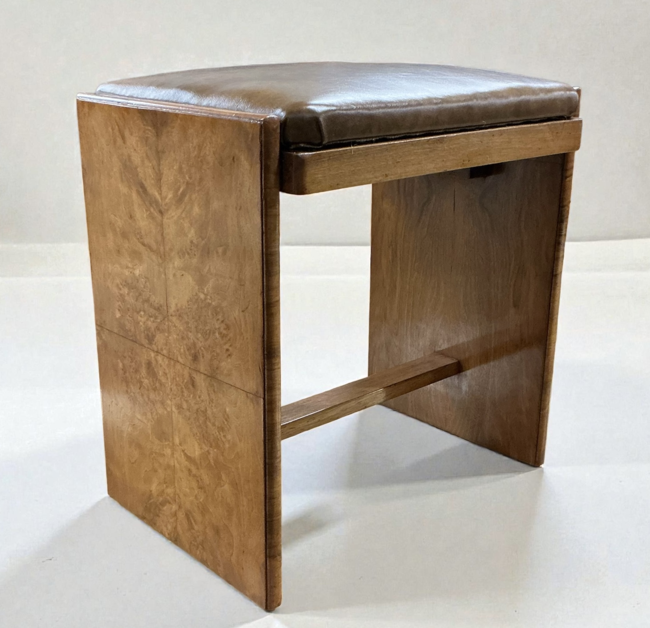 Art Deco stool with two figured walnut sides, a stretcher and a rectangular seat, just reupholstered in a vintage effect brown leather.