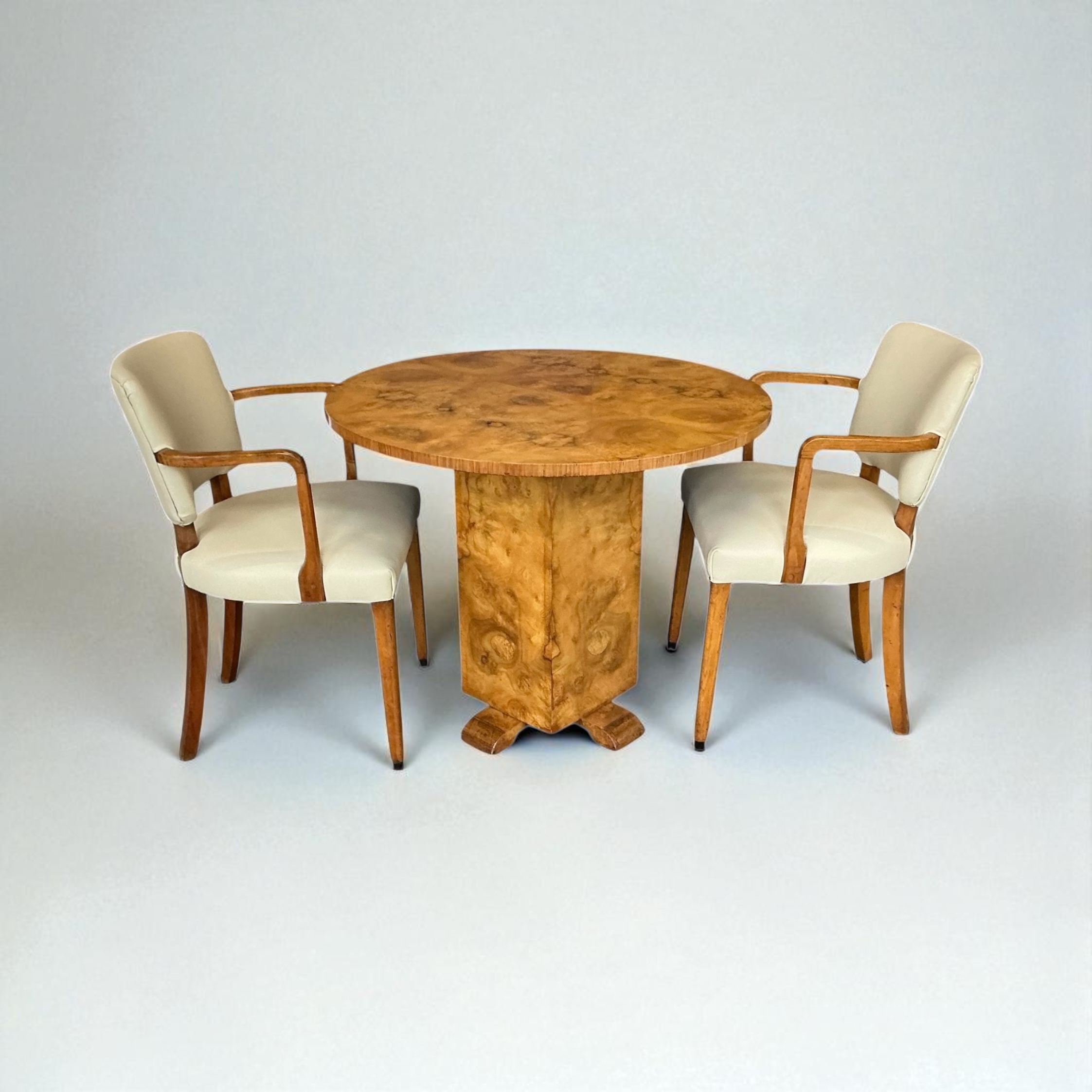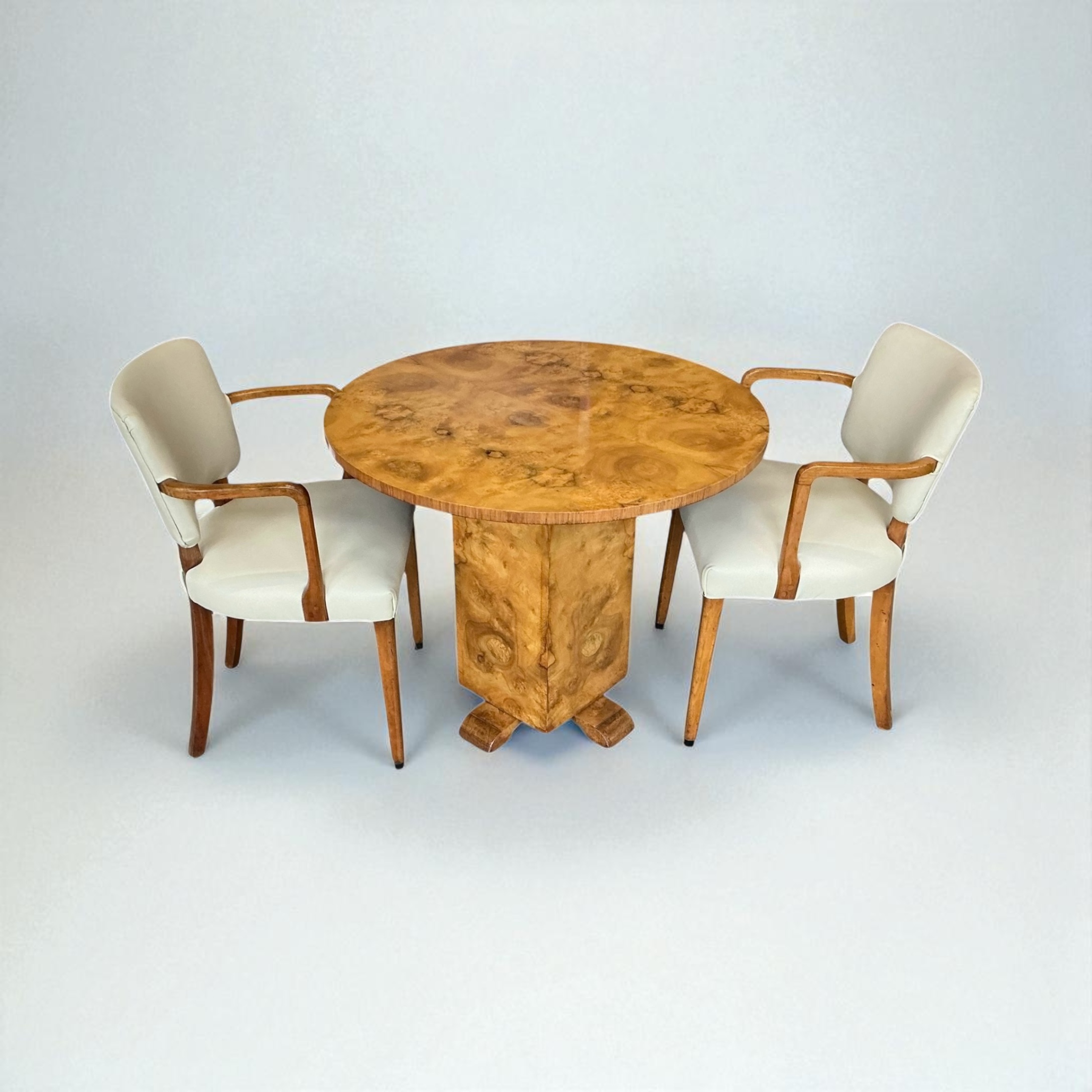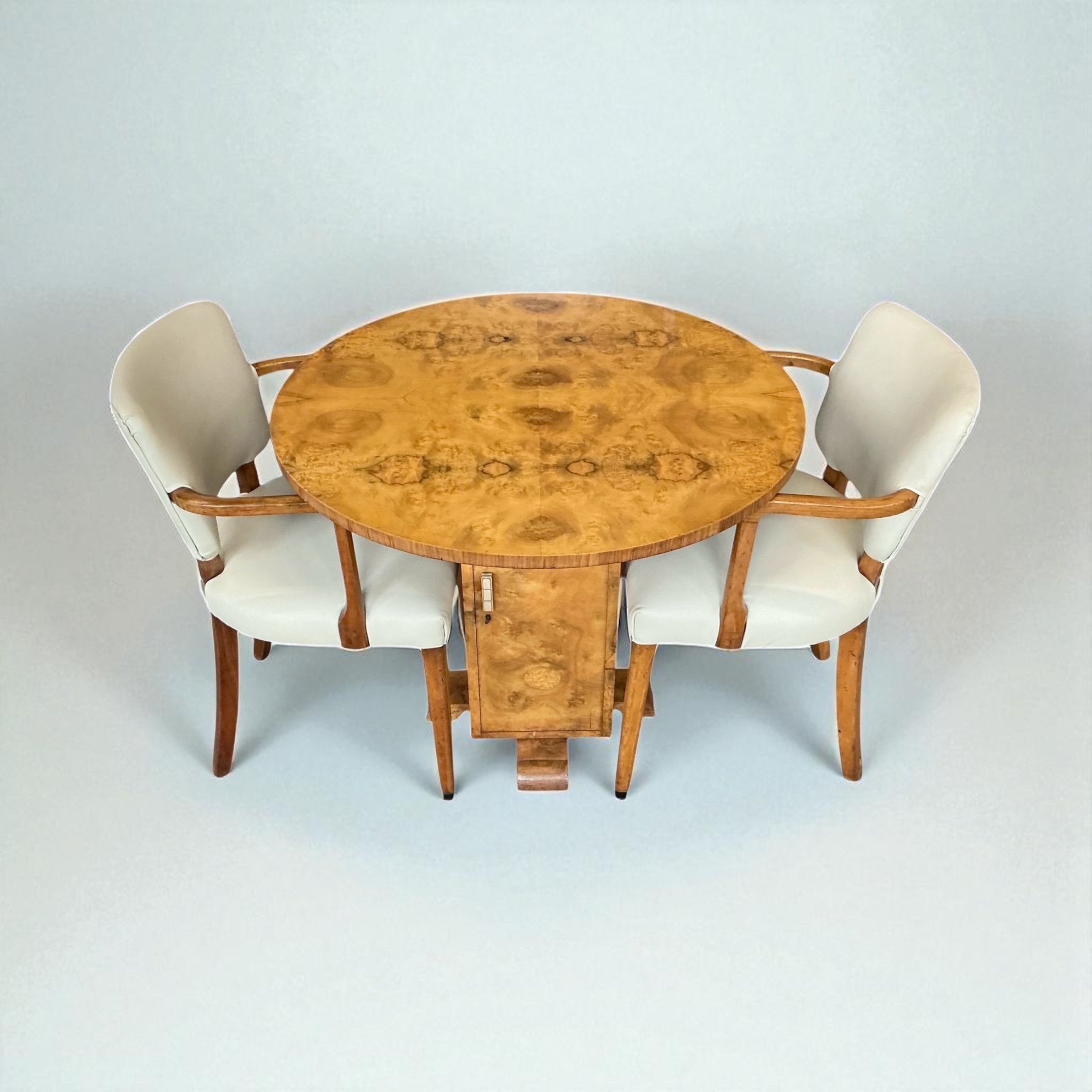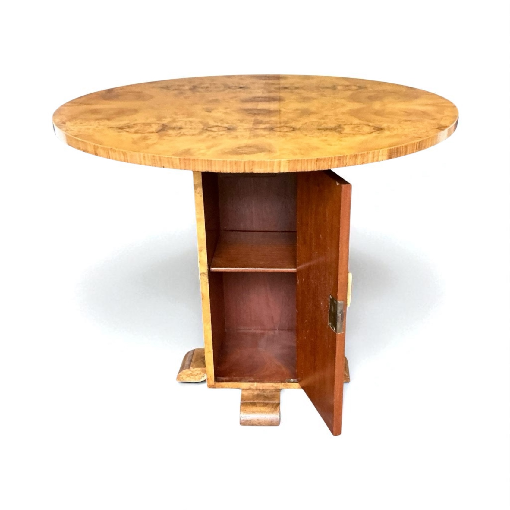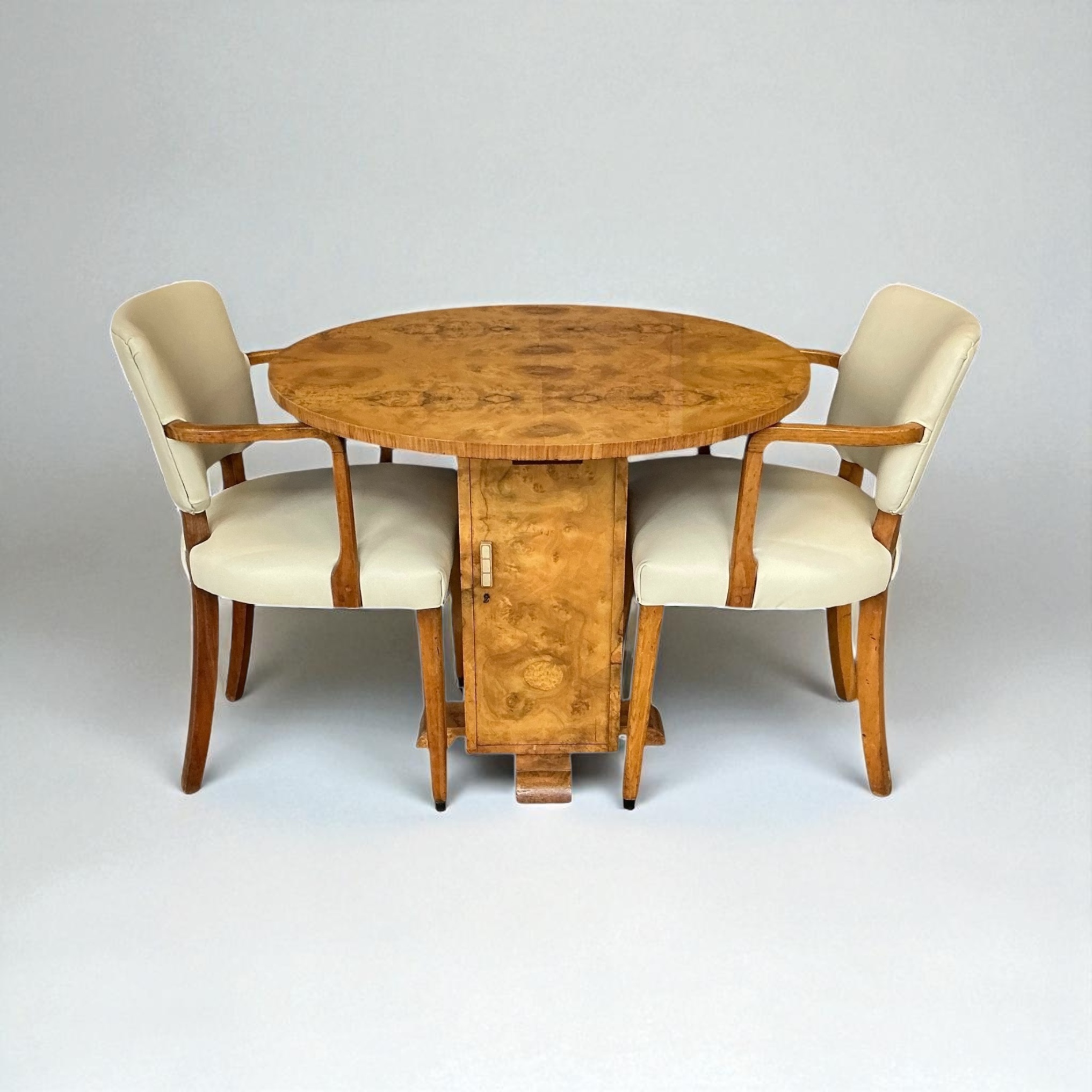 Art Deco centre table or small dining table. In walnut, with a circular top and a square pedestal sat on four feet. The pedestal with a cupboard with two internal shelves. All our furniture is professionally waxed and polished and restored where necessary. This table in showroom condition. price for table (chairs available to purchase separately).