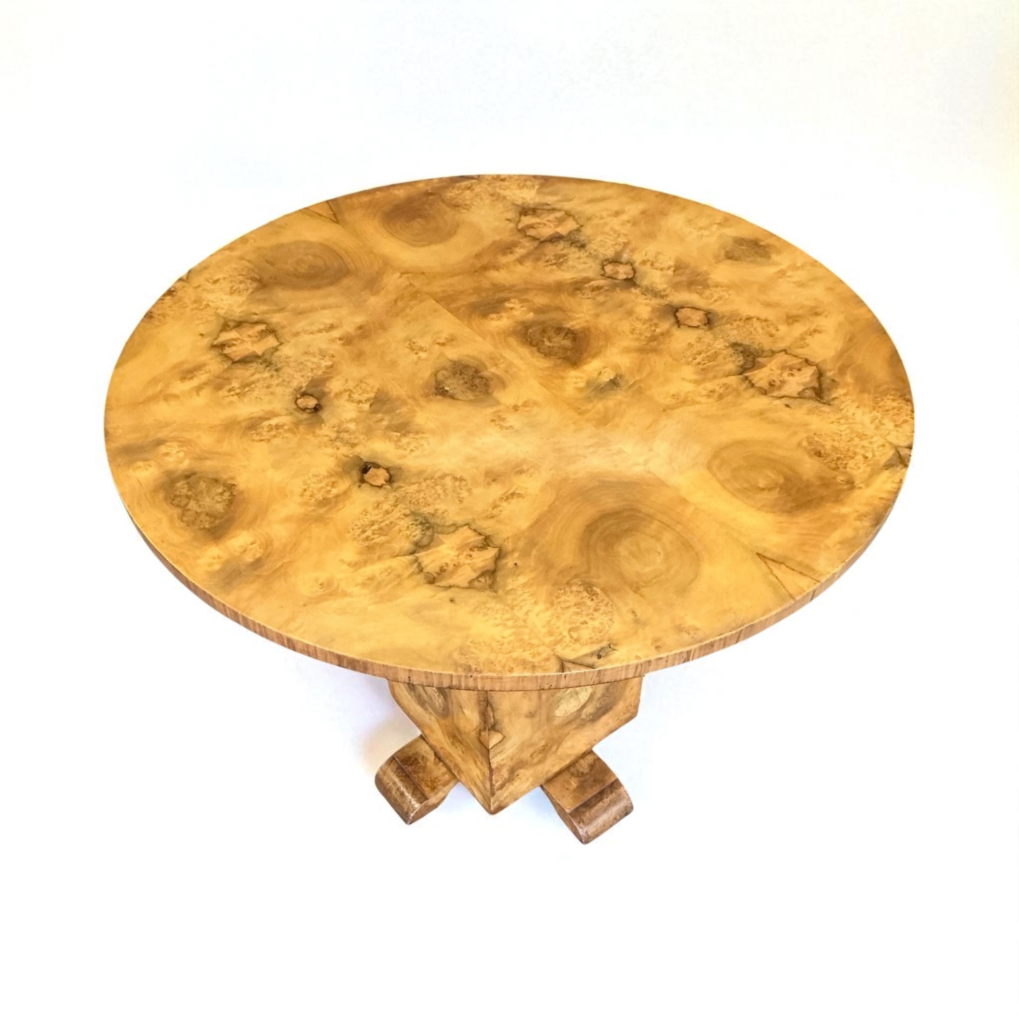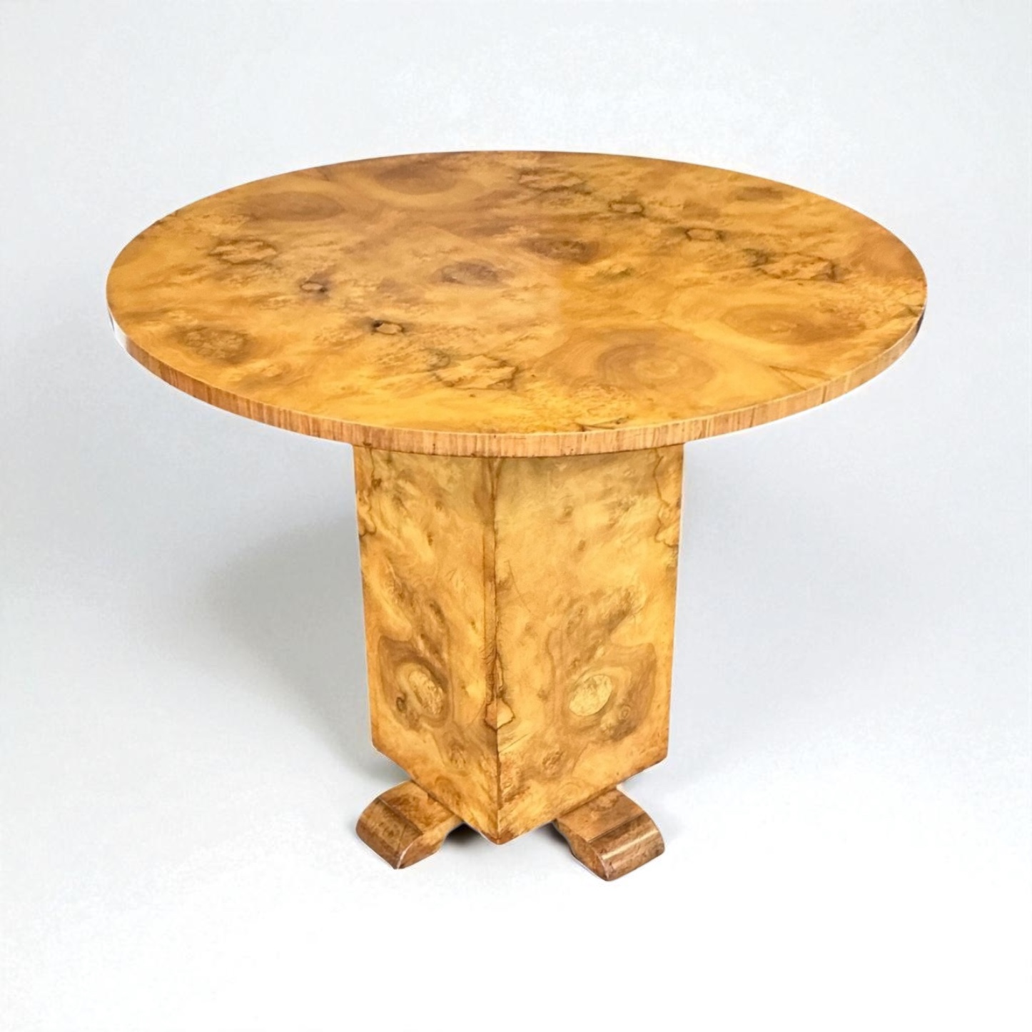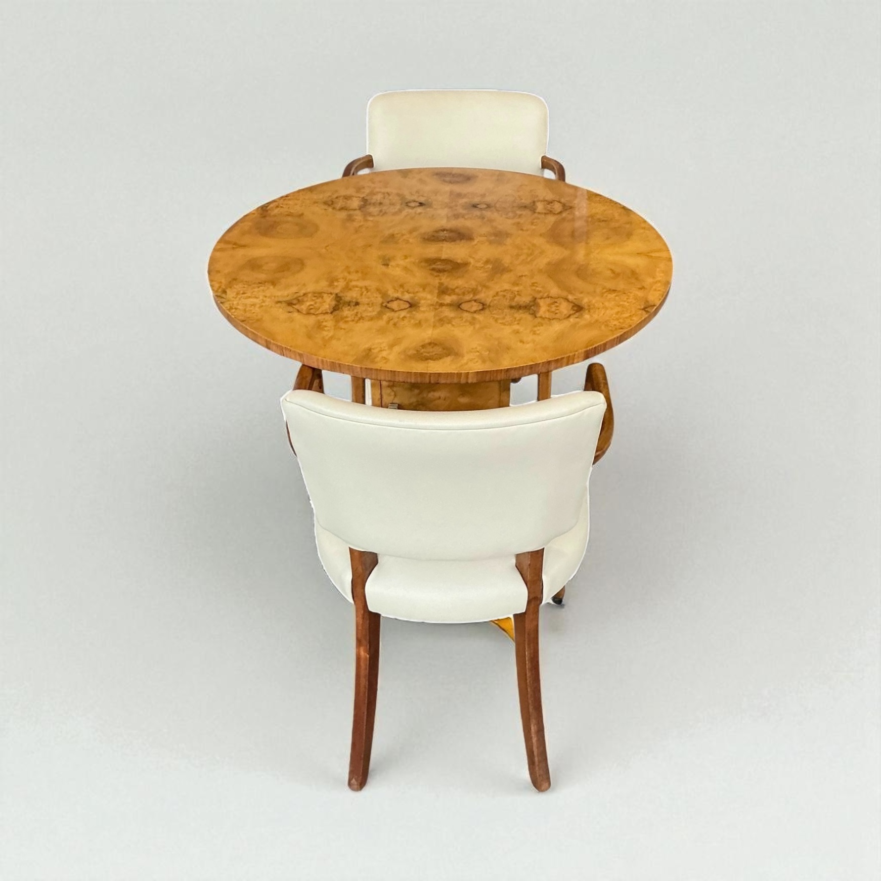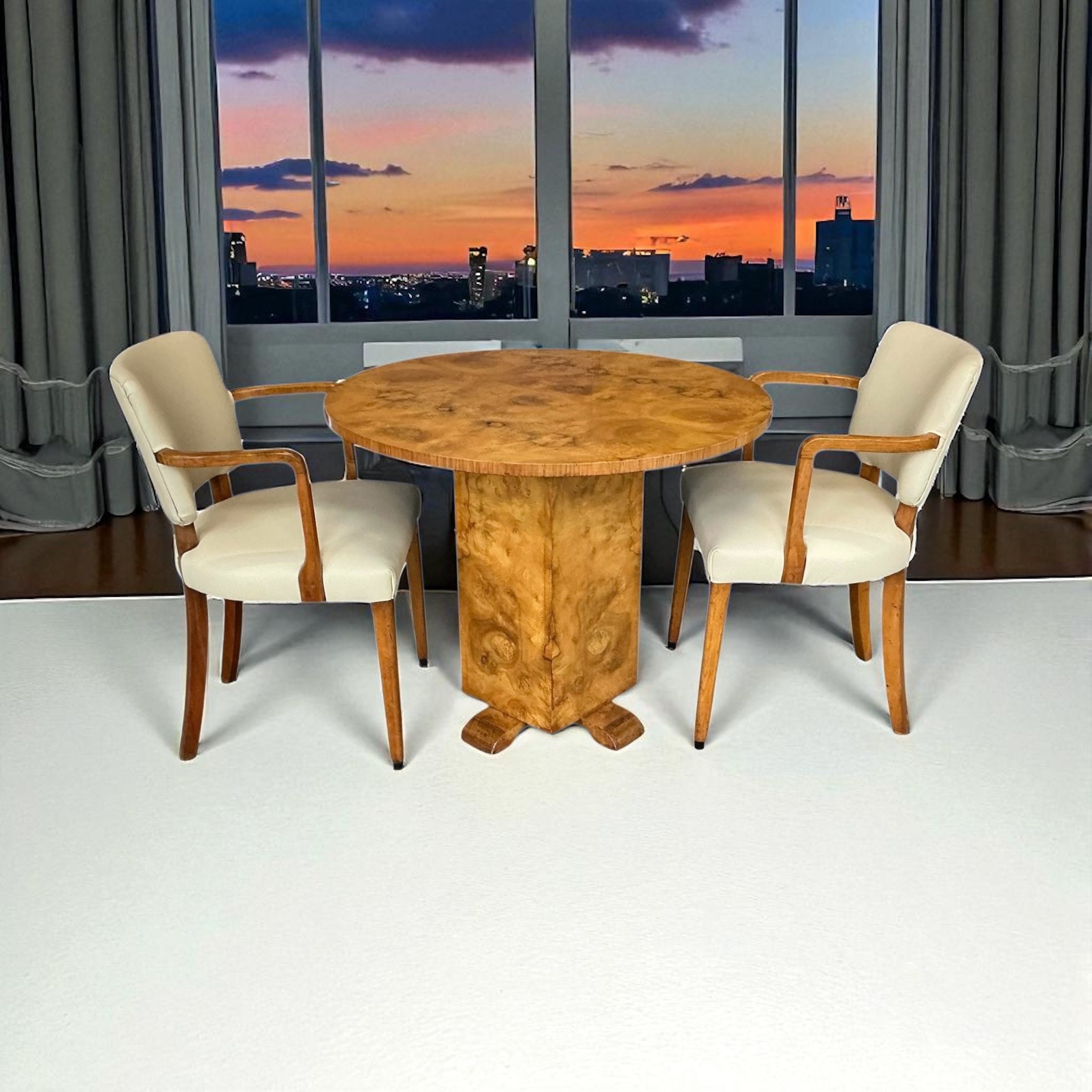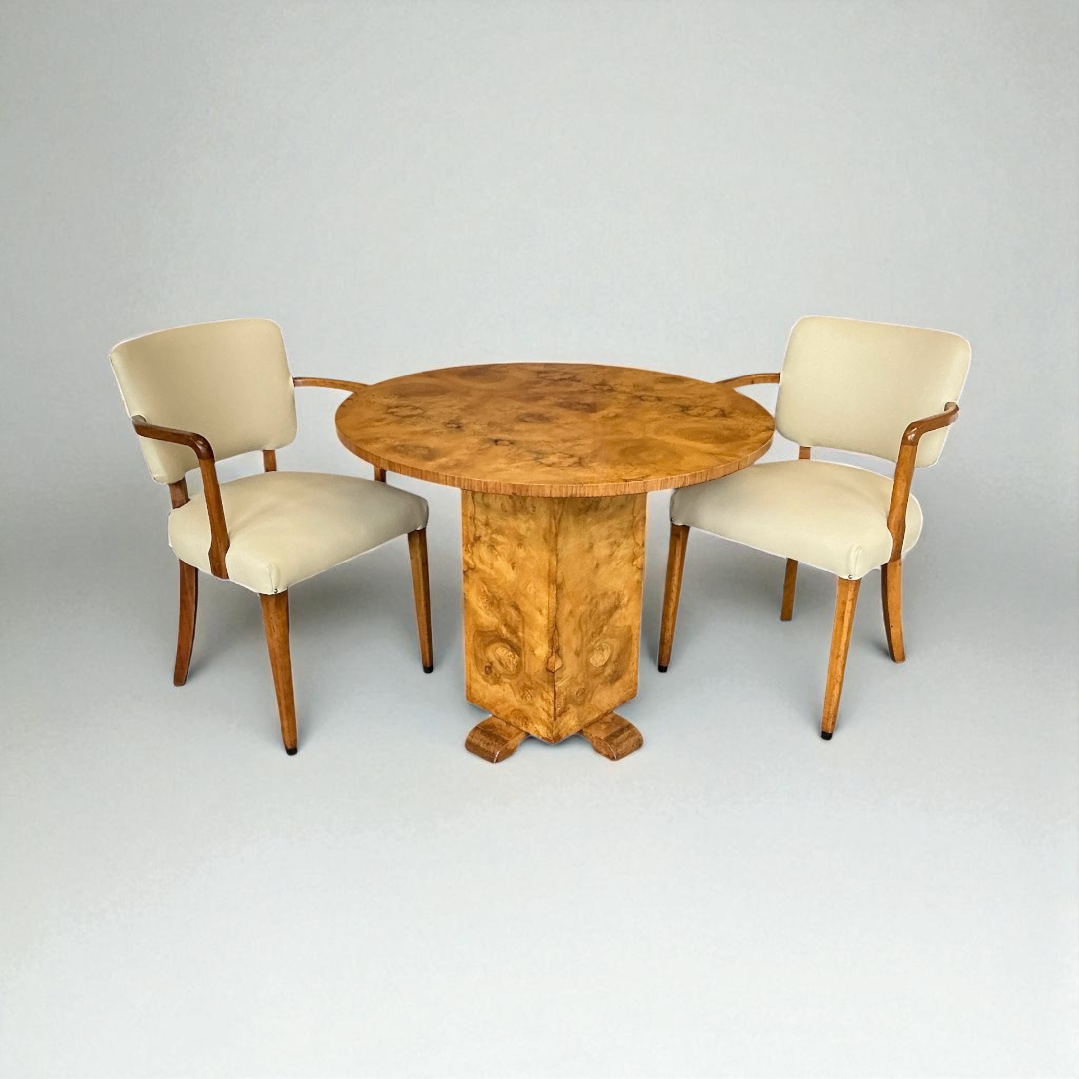 Art Deco centre table or small dining table. In walnut, with a circular top and a square pedestal sat on four feet. The pedestal with a cupboard with two internal shelves. All our furniture is professionally waxed and polished and restored where necessary. This table in showroom condition. price for table (chairs available to purchase separately).