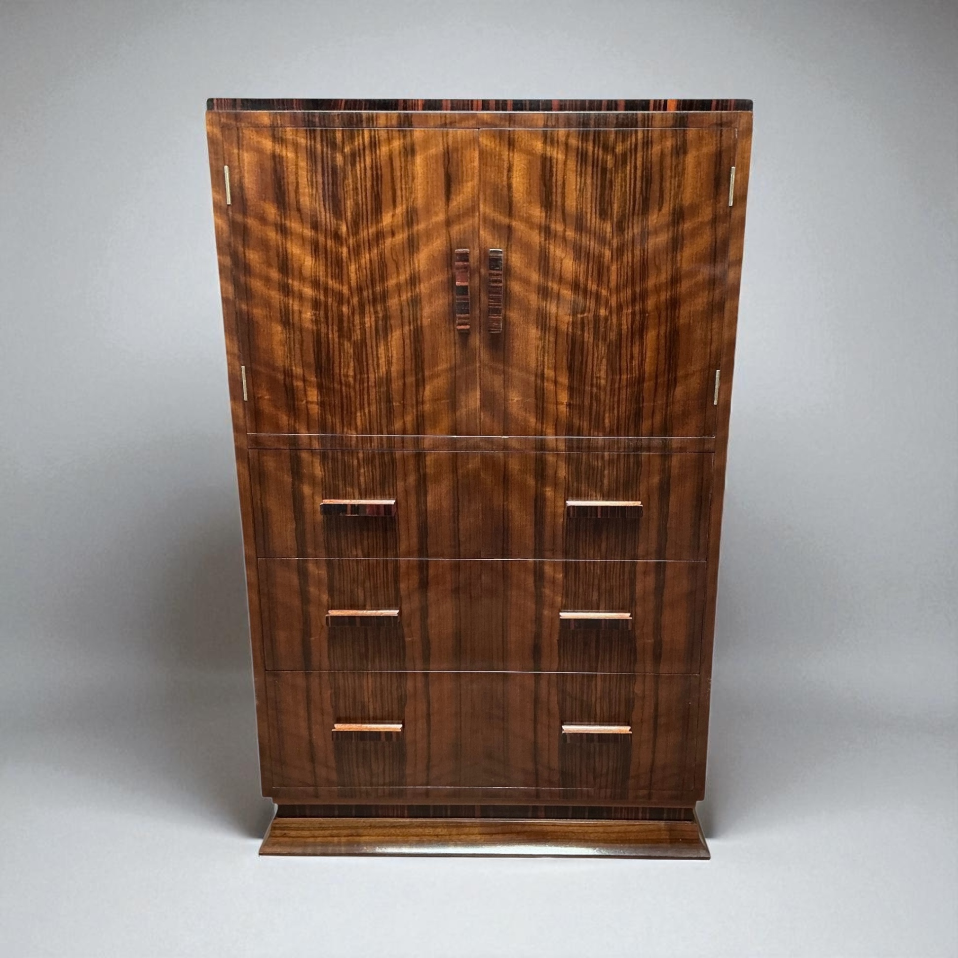 Quality Art Deco Tallboy, in walnut with macassar ebony banding. The top cupboard opening to reveal two shelves and below, three good size drawers. The label, ‘Manufactured by Crowson. C.Crowther & Son Ltd, 292 Streatham High Road S.W 16’ to one of the cupboard doors.
