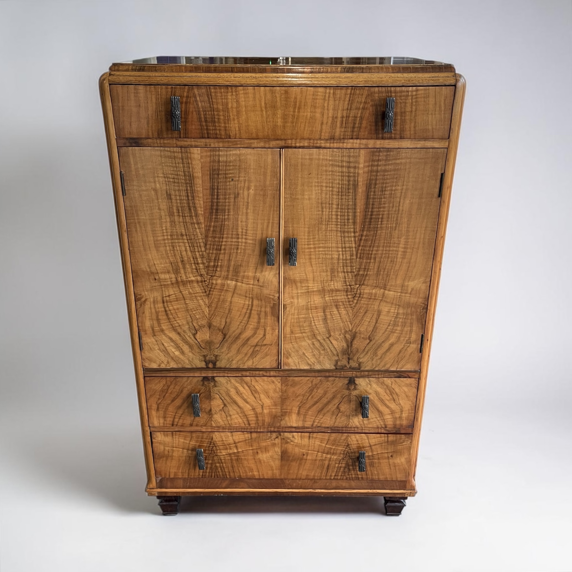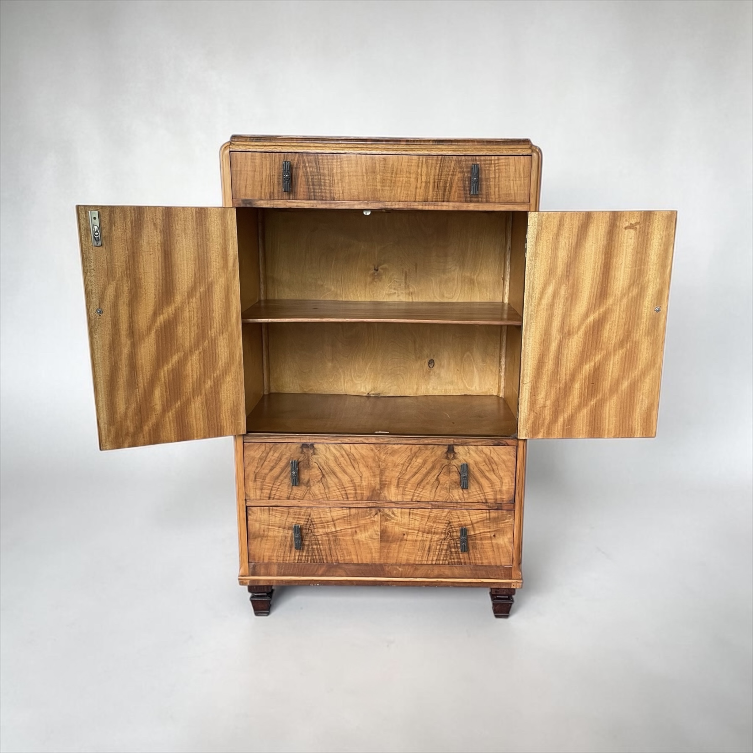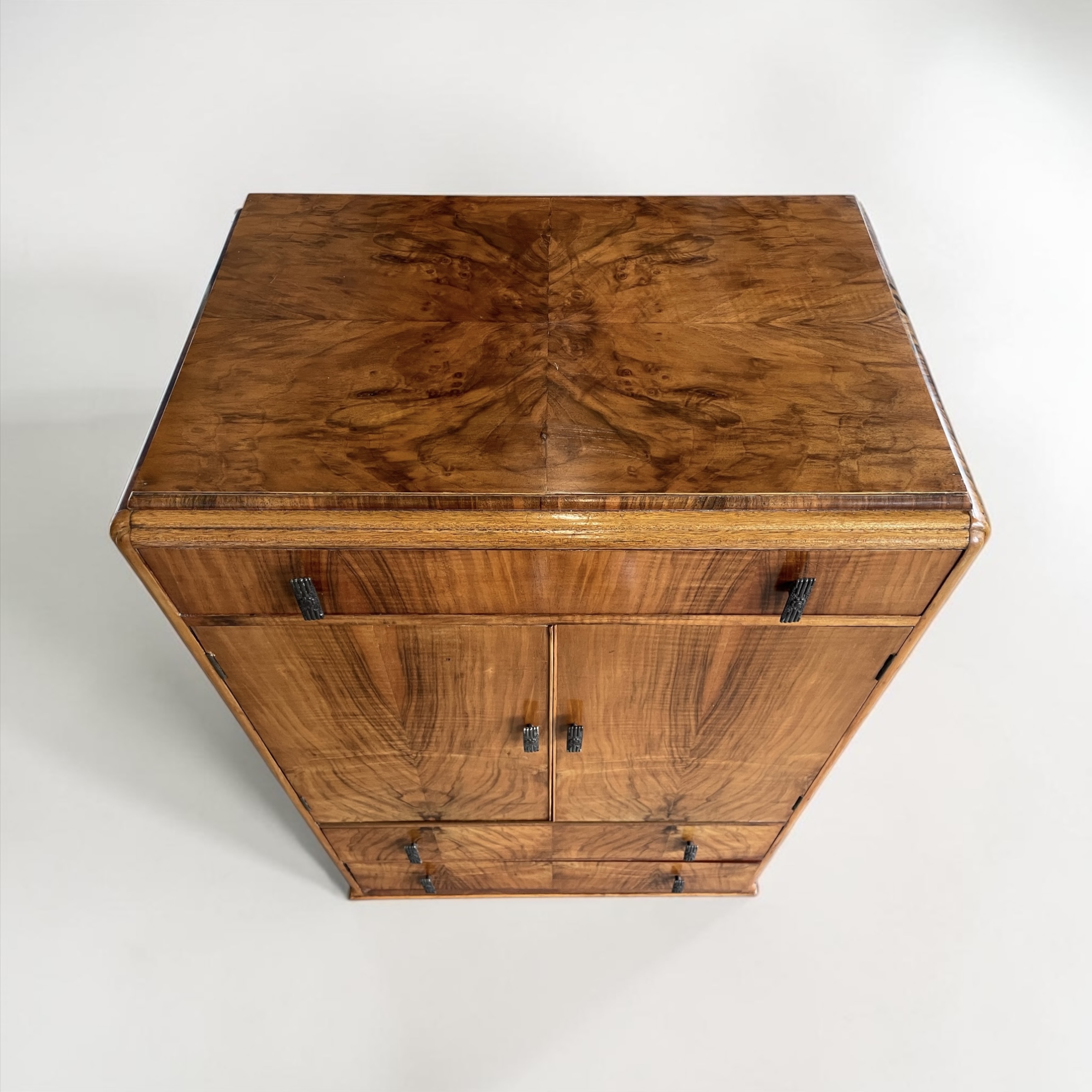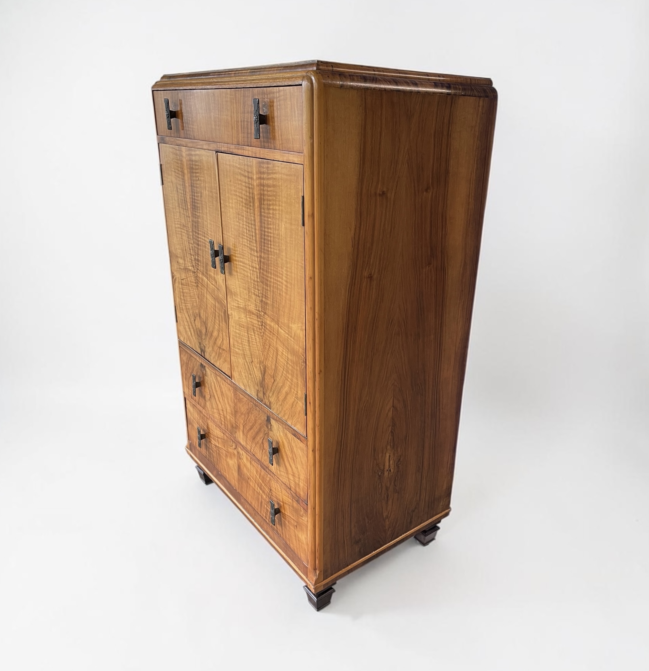 Art Deco tallboy in walnut with a top drawer and a two door cupboard below, with two shelves. A further two drawers sit below. Each door and drawer with attractive black detailed metal handles.