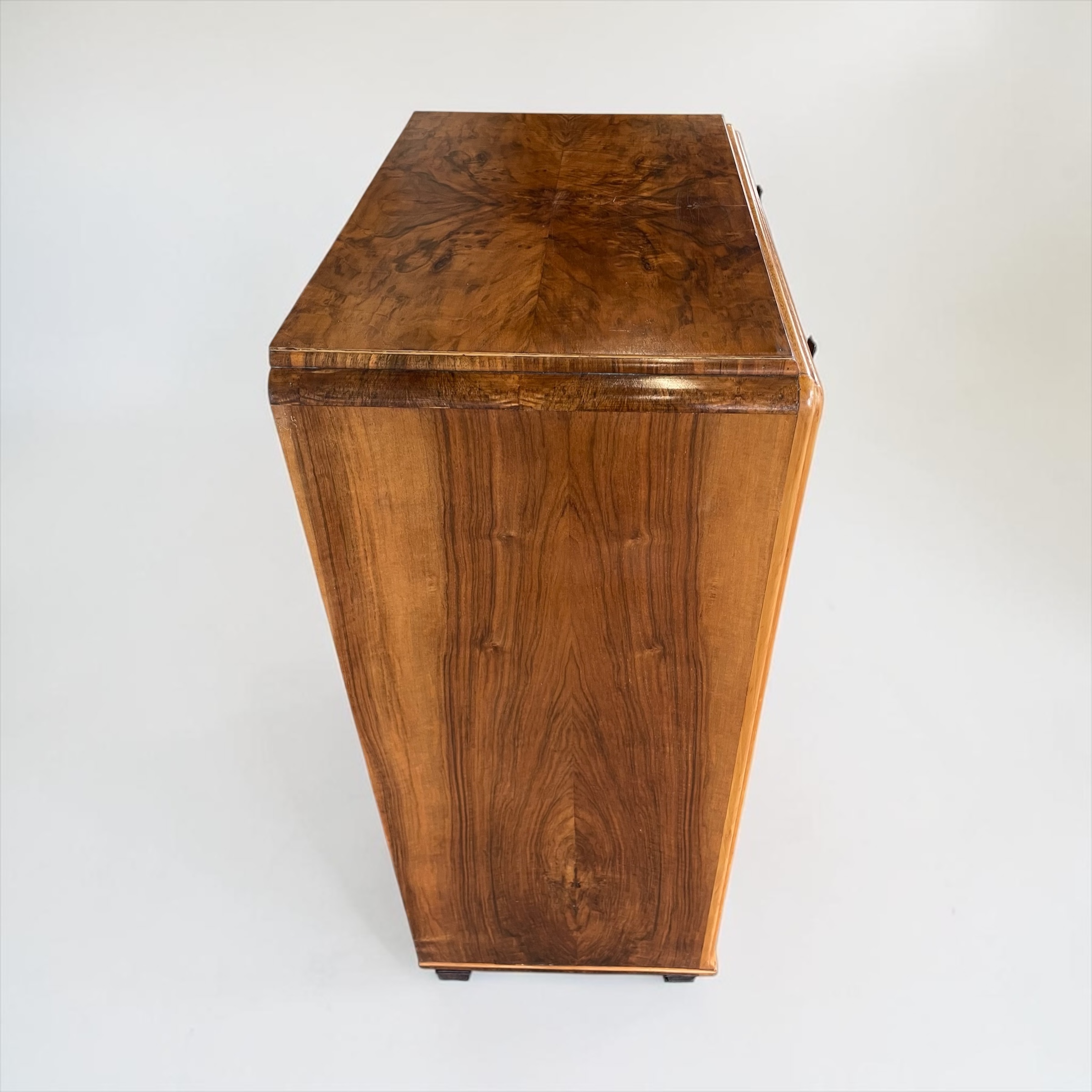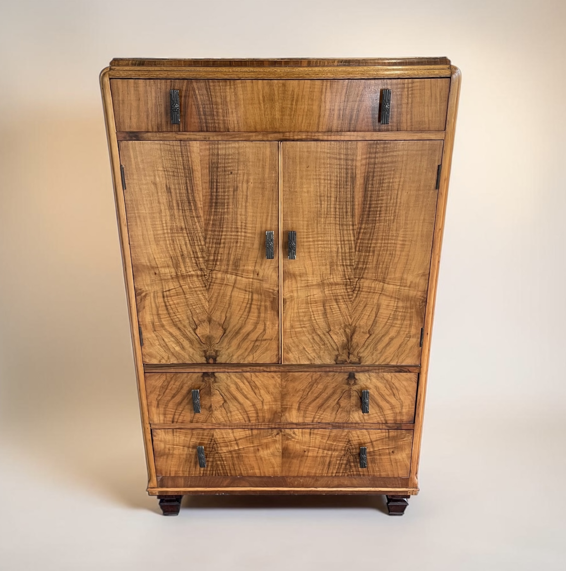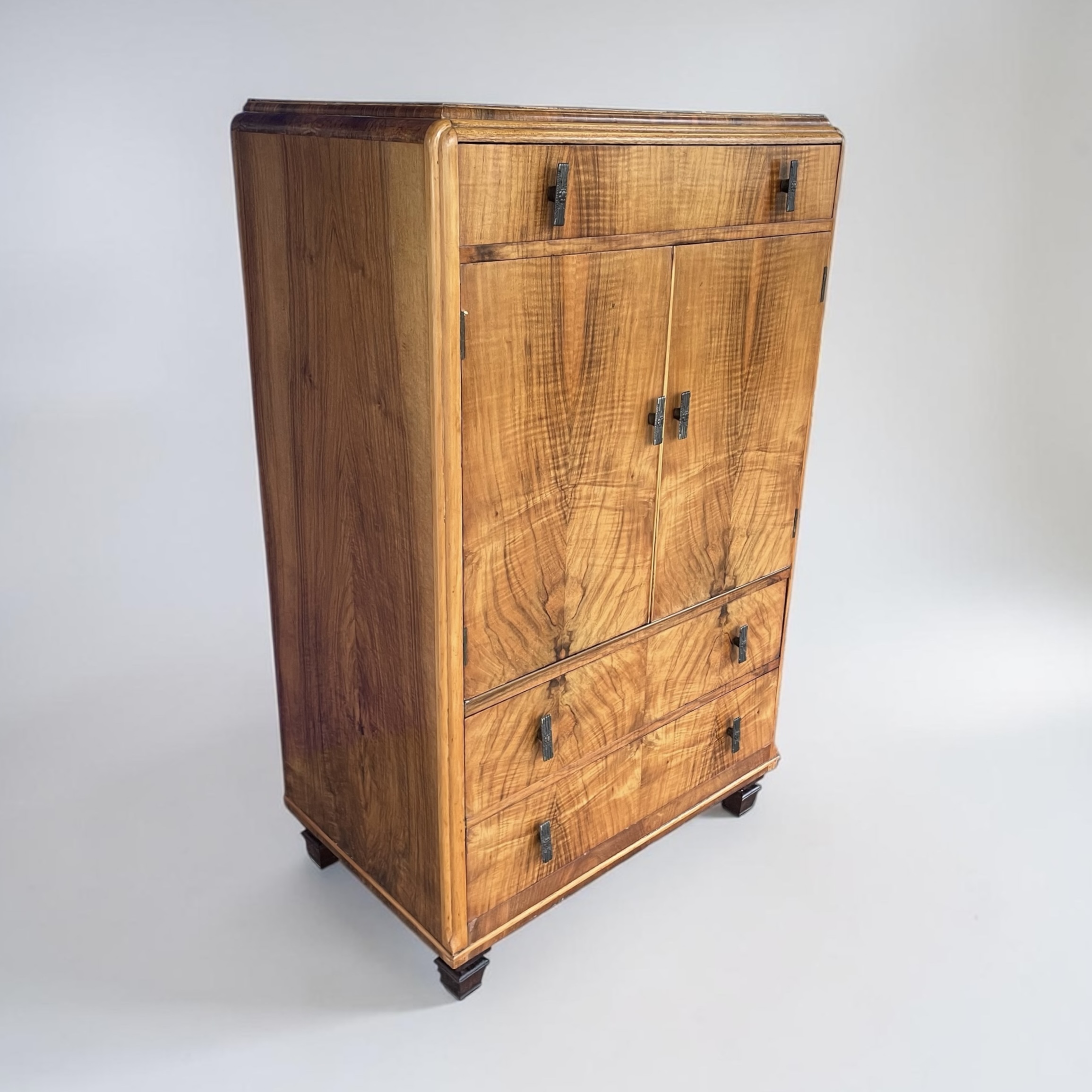 Art Deco tallboy in walnut with a top drawer and a two door cupboard below, with two shelves. A further two drawers sit below. Each door and drawer with attractive black detailed metal handles.