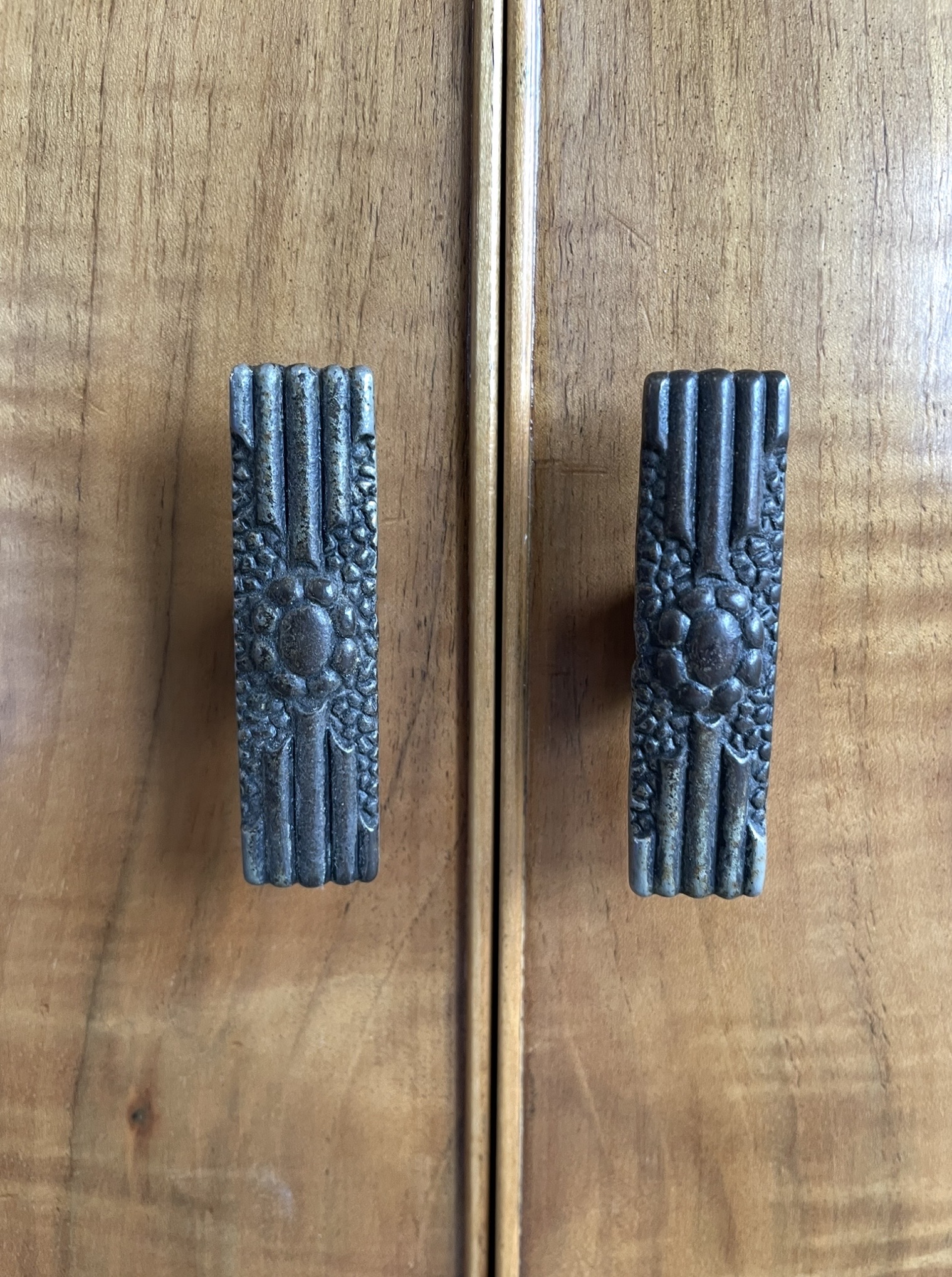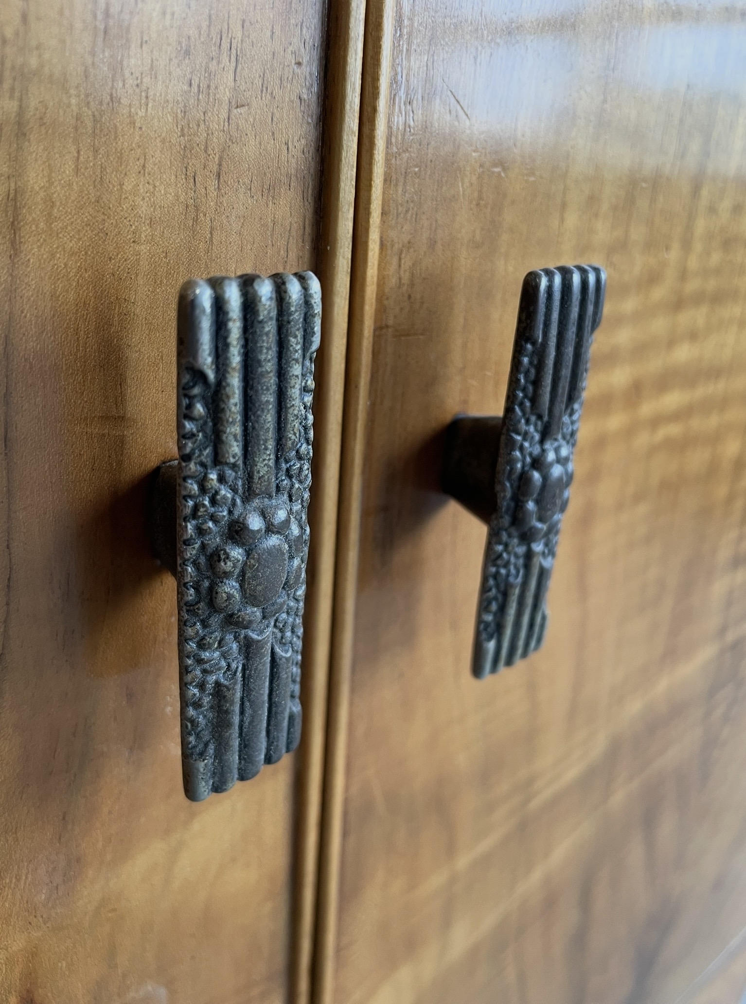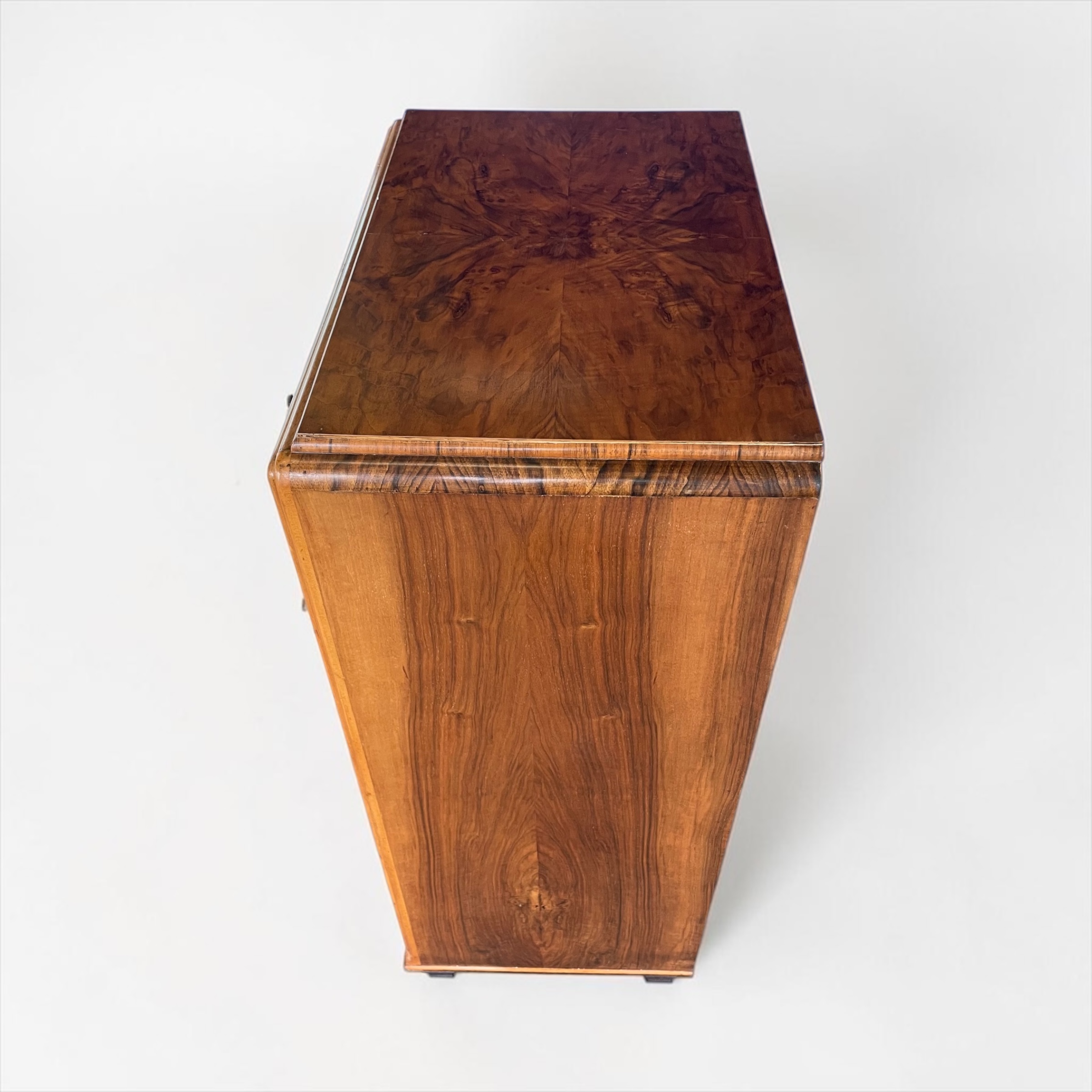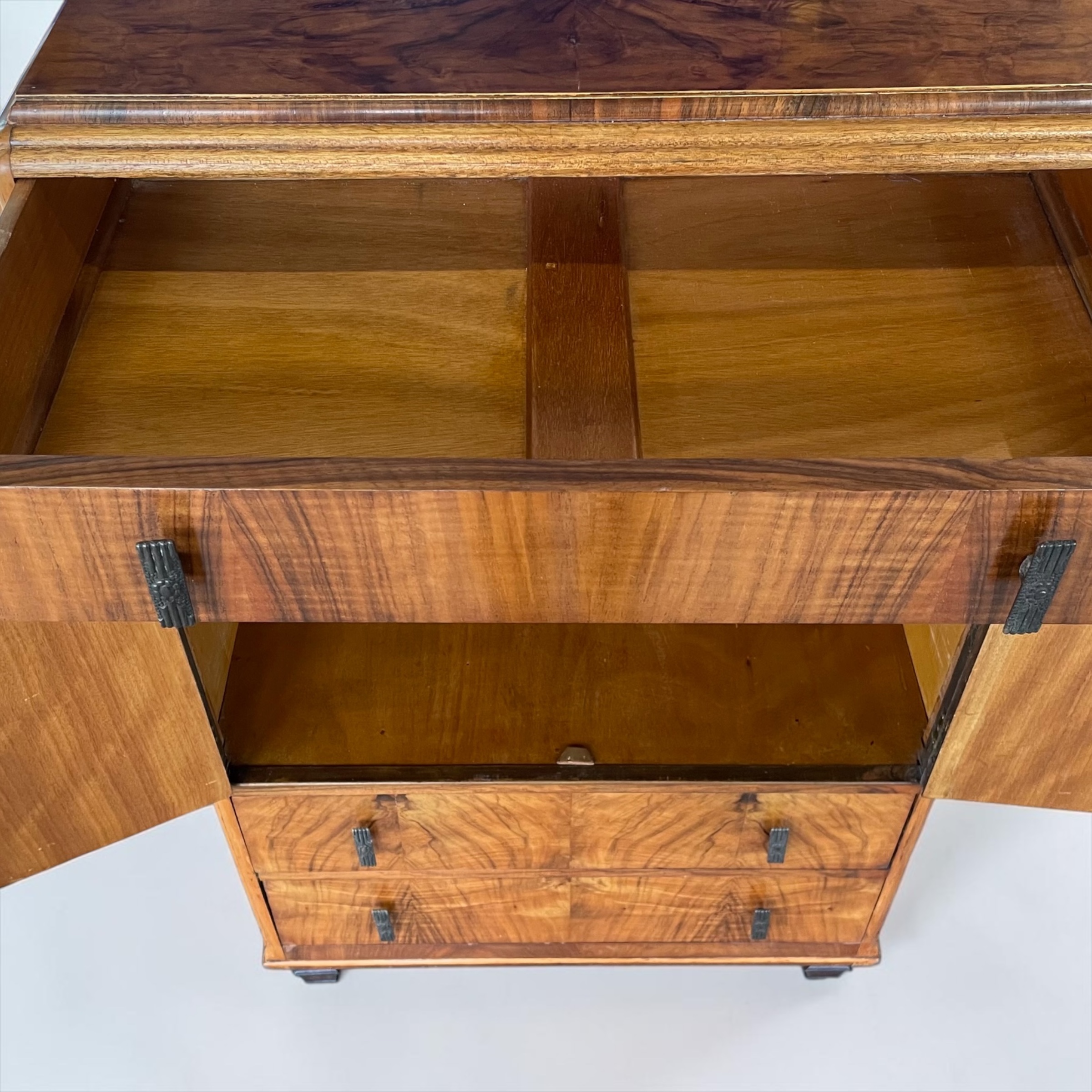Art Deco tallboy in walnut with a top drawer and a two door cupboard below, with two shelves. A further two drawers sit below. Each door and drawer with attractive black detailed metal handles.