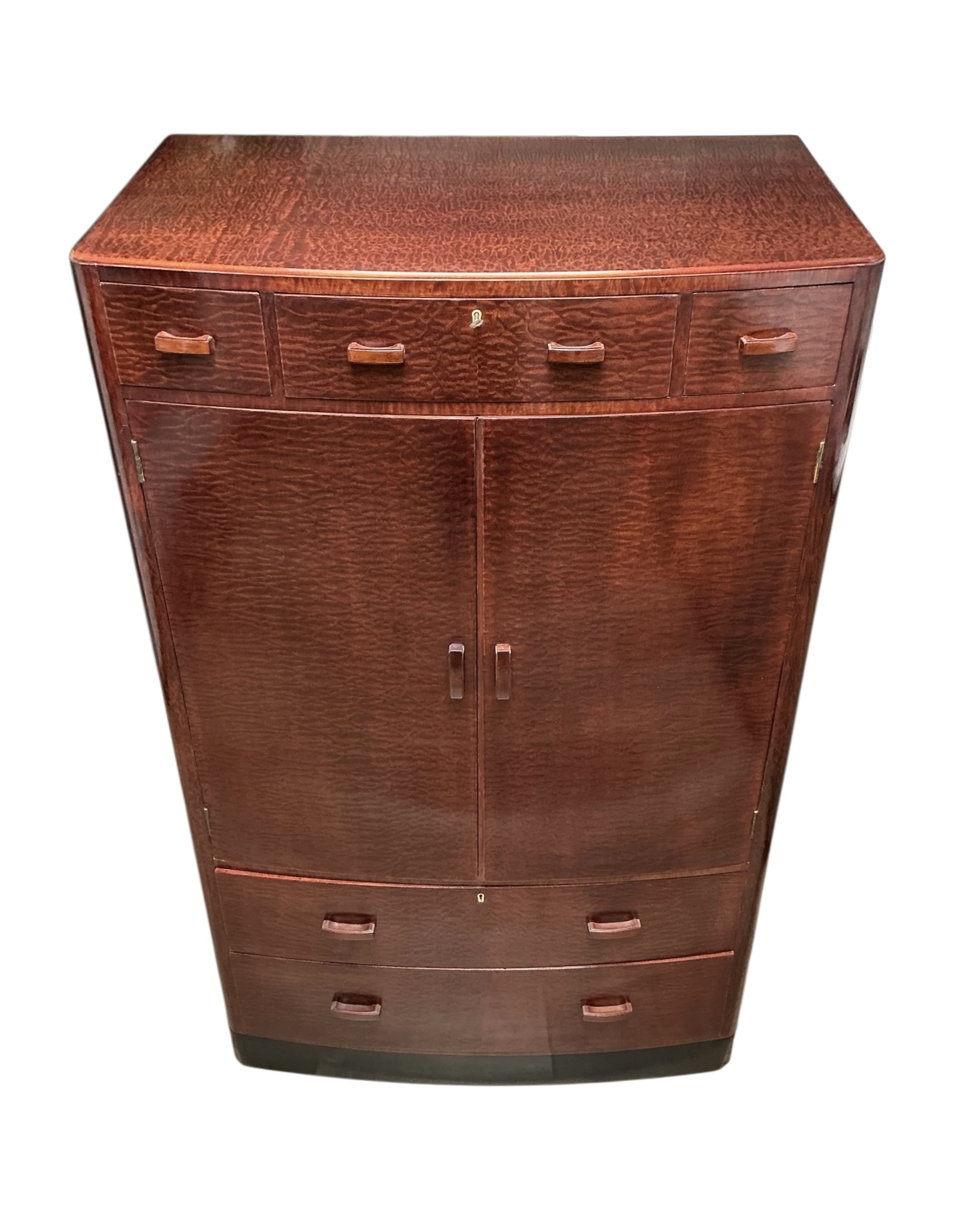 A Fine Art Deco tallboy in quilted maple by Heal’s.
