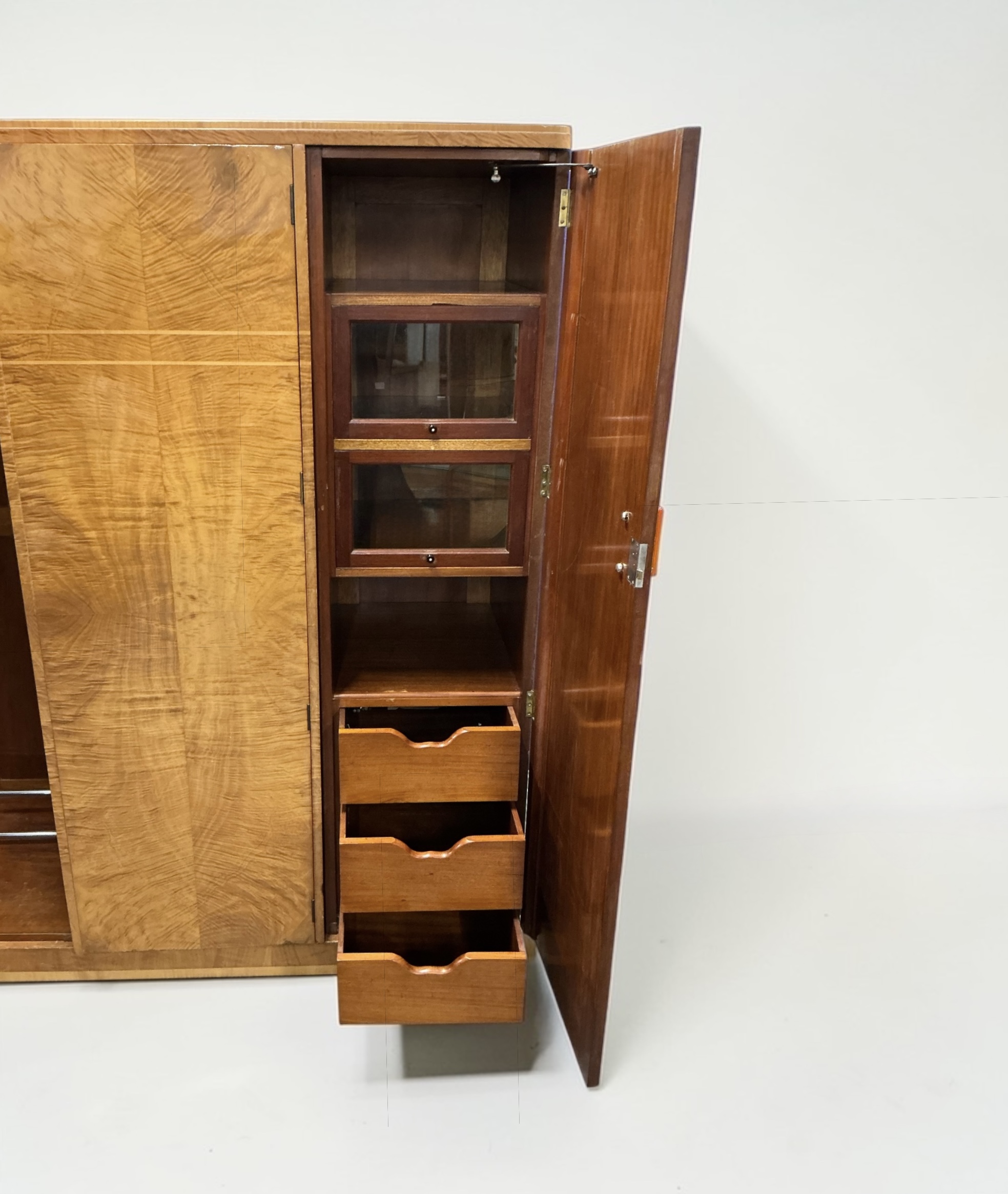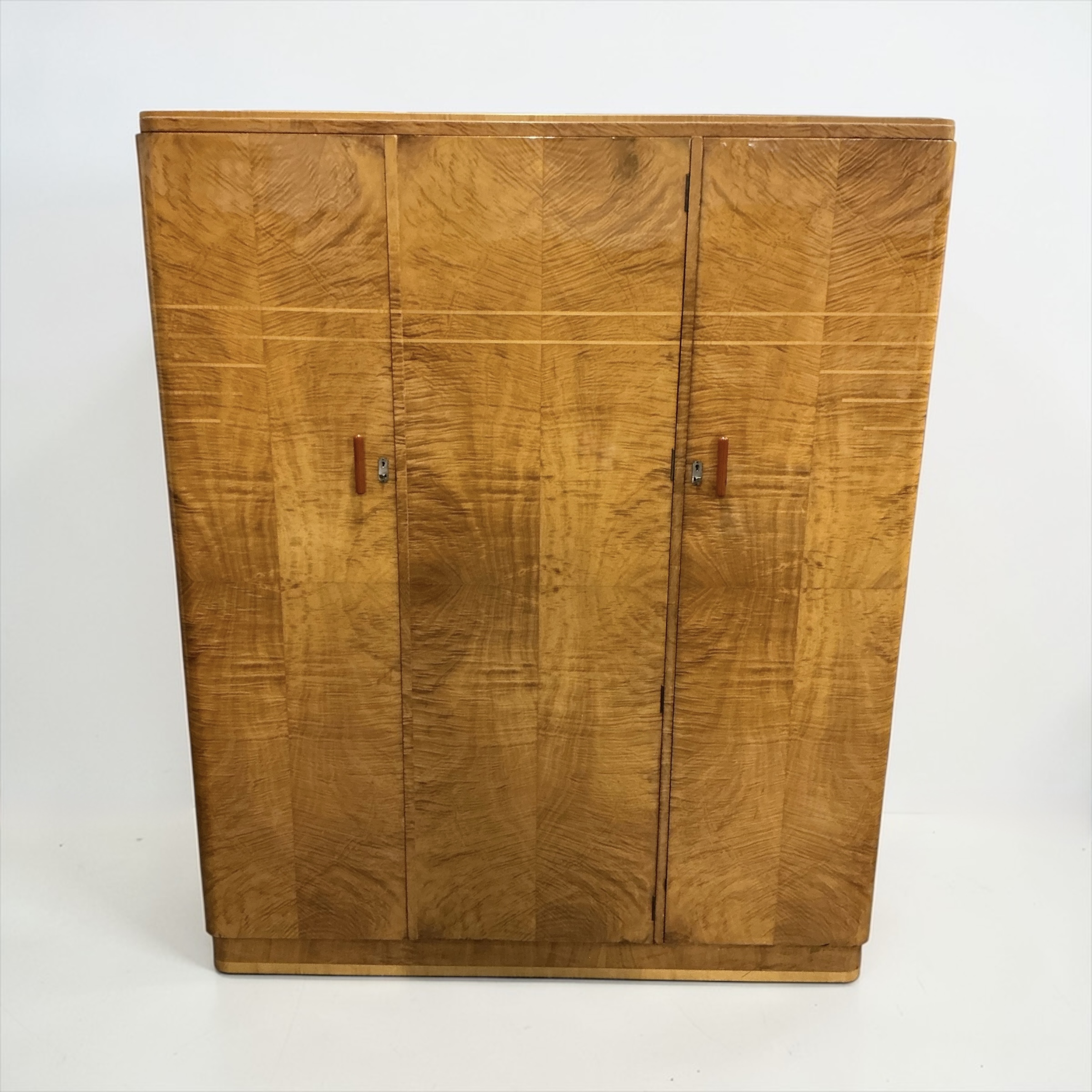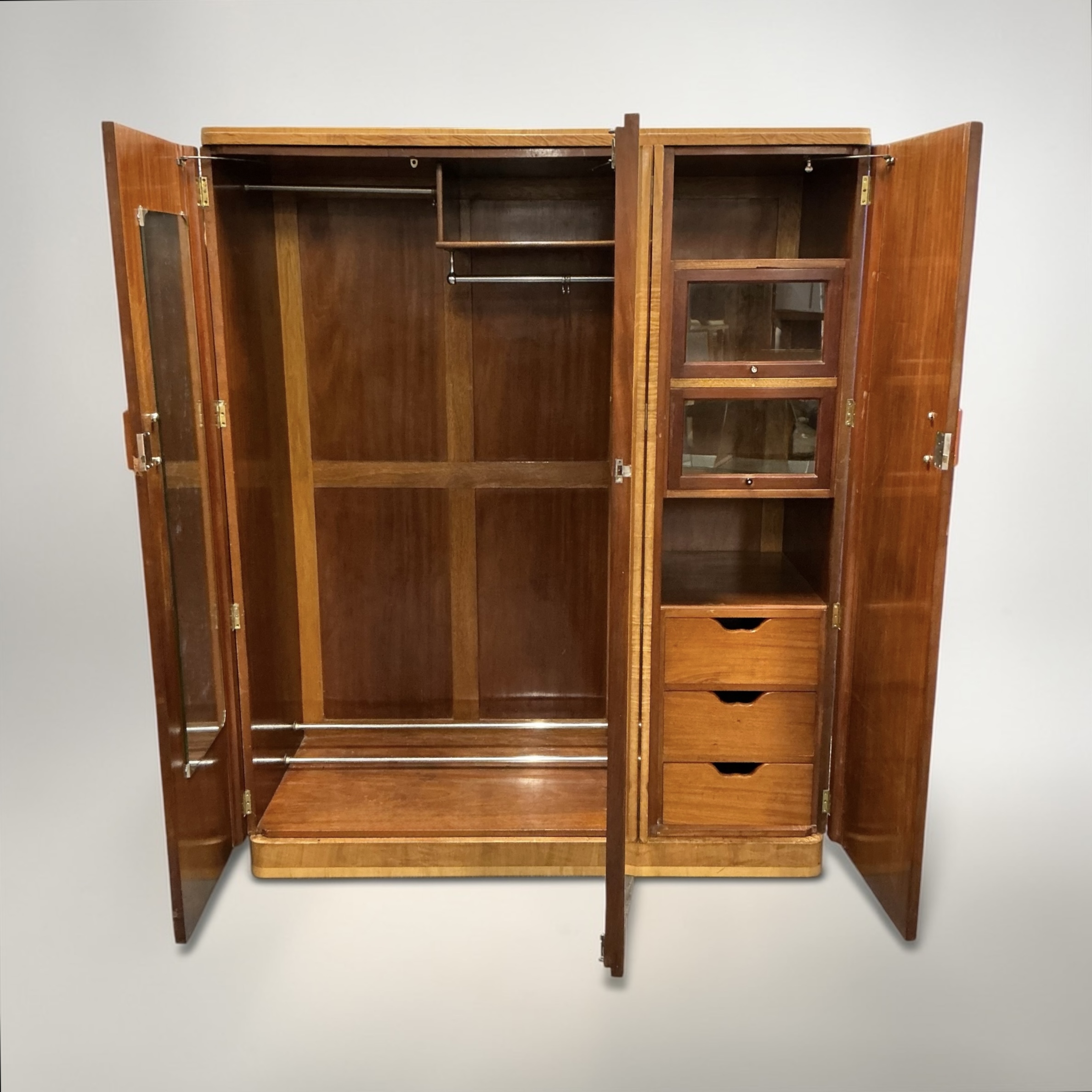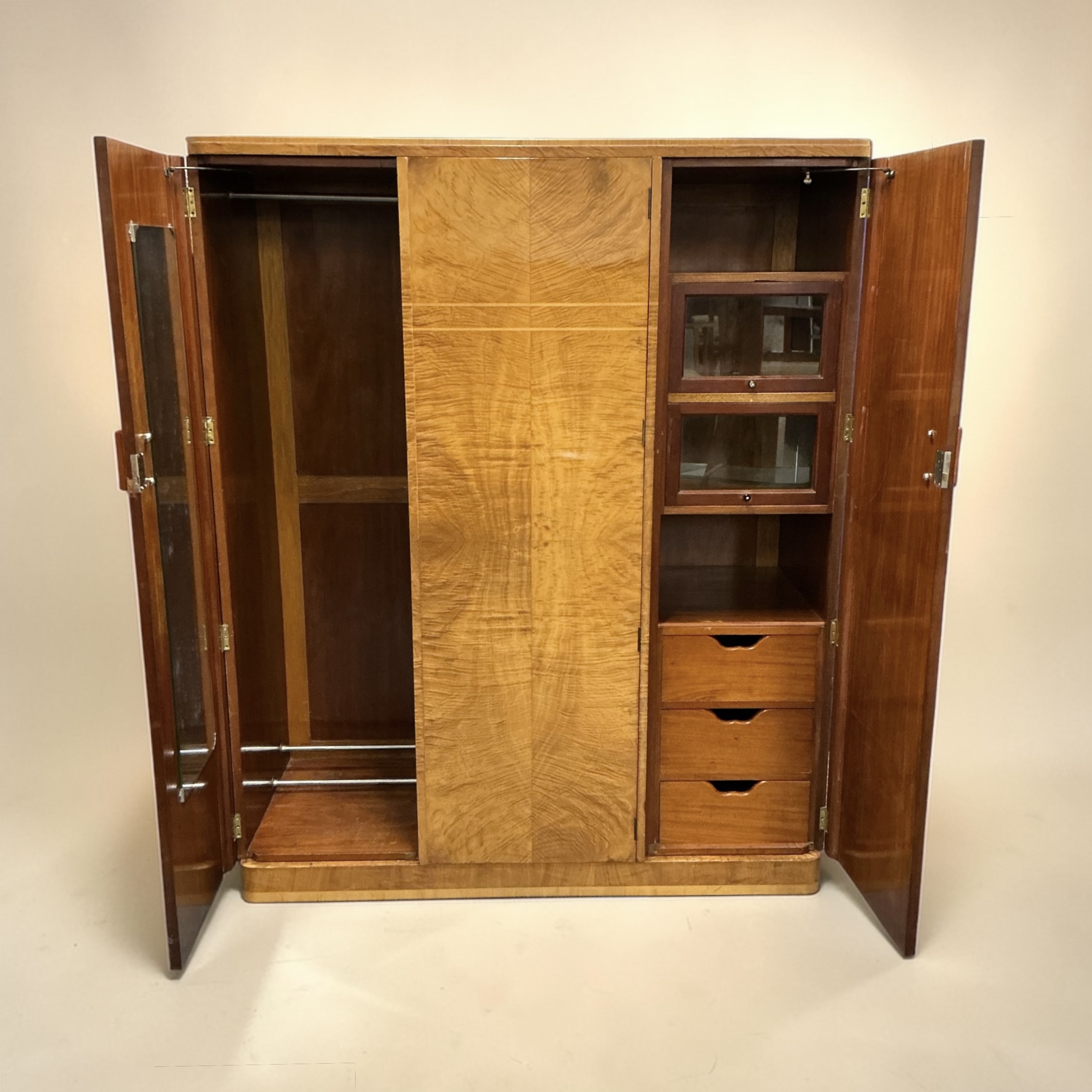 A quality Art Deco triple wardrobe in maple, with stepped inlay detailing in light maple to the front and coral colour phenolic handles. To the left side, two doors open to two hanging sections, a top shelf, a shoe rack and a fitted mirror to the left door. To the right, the door opens to a top shelf, two cupboards with open and over glazed doors, a further shelf below and three drawers.
