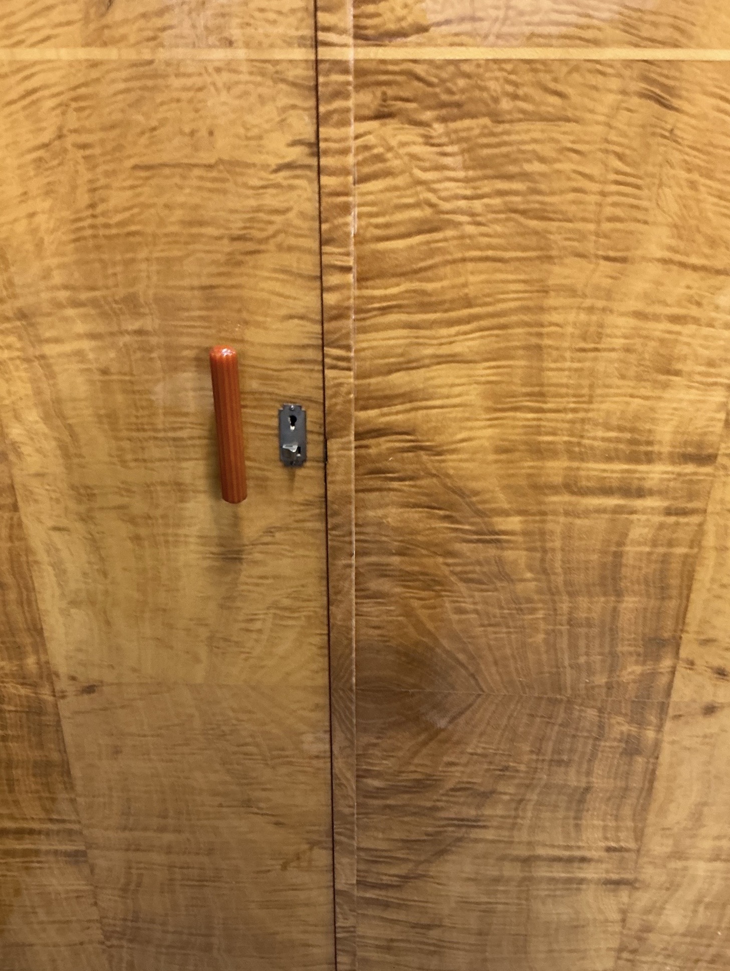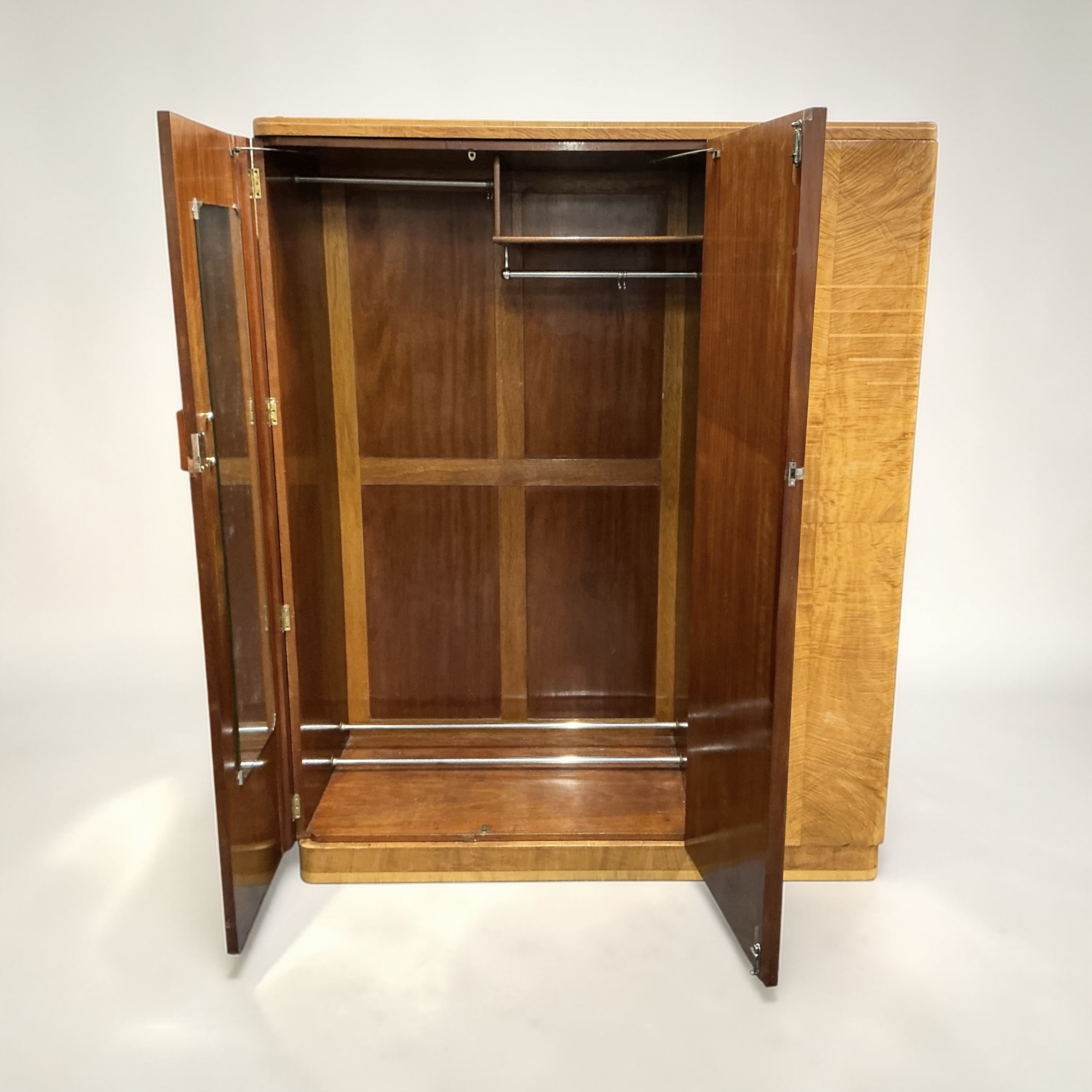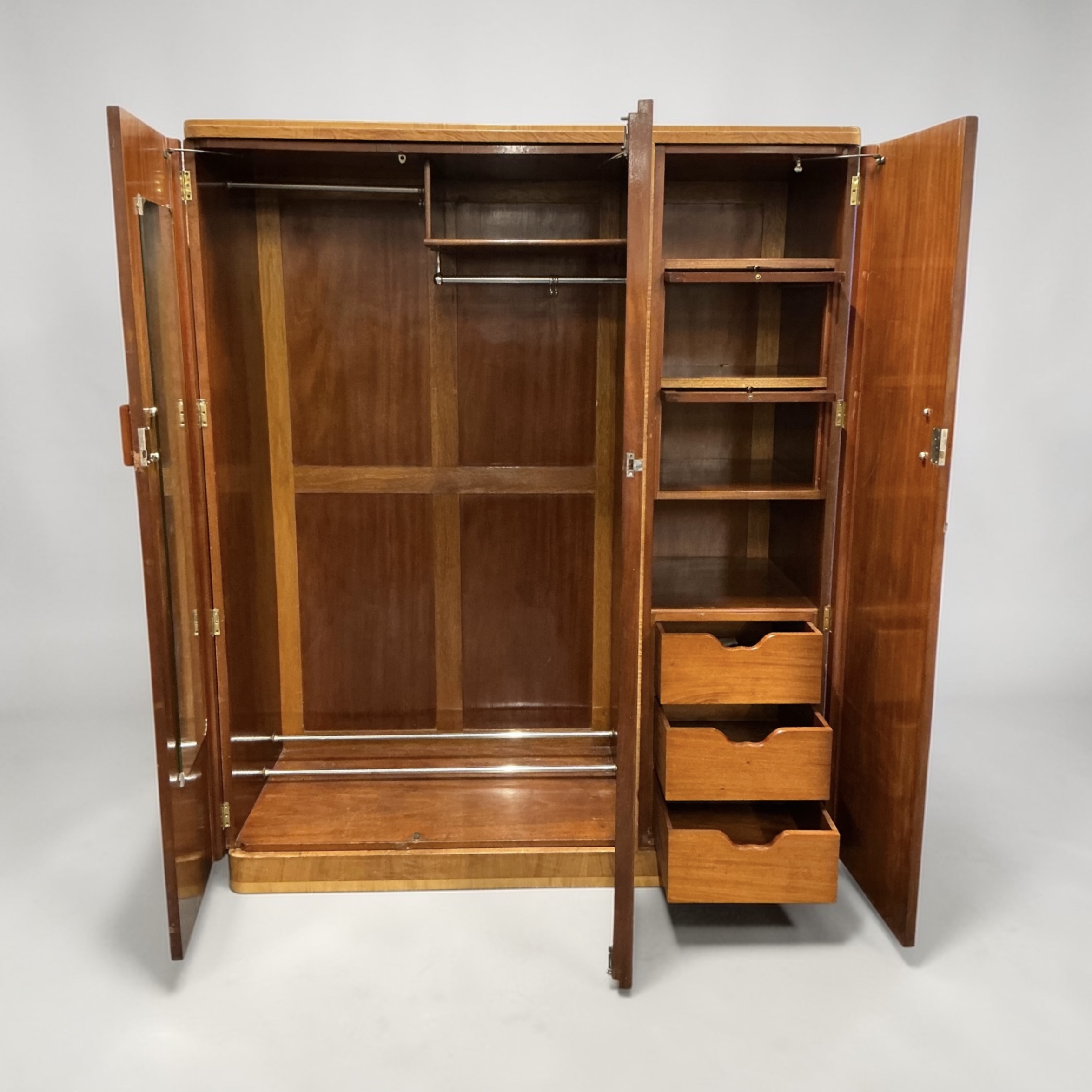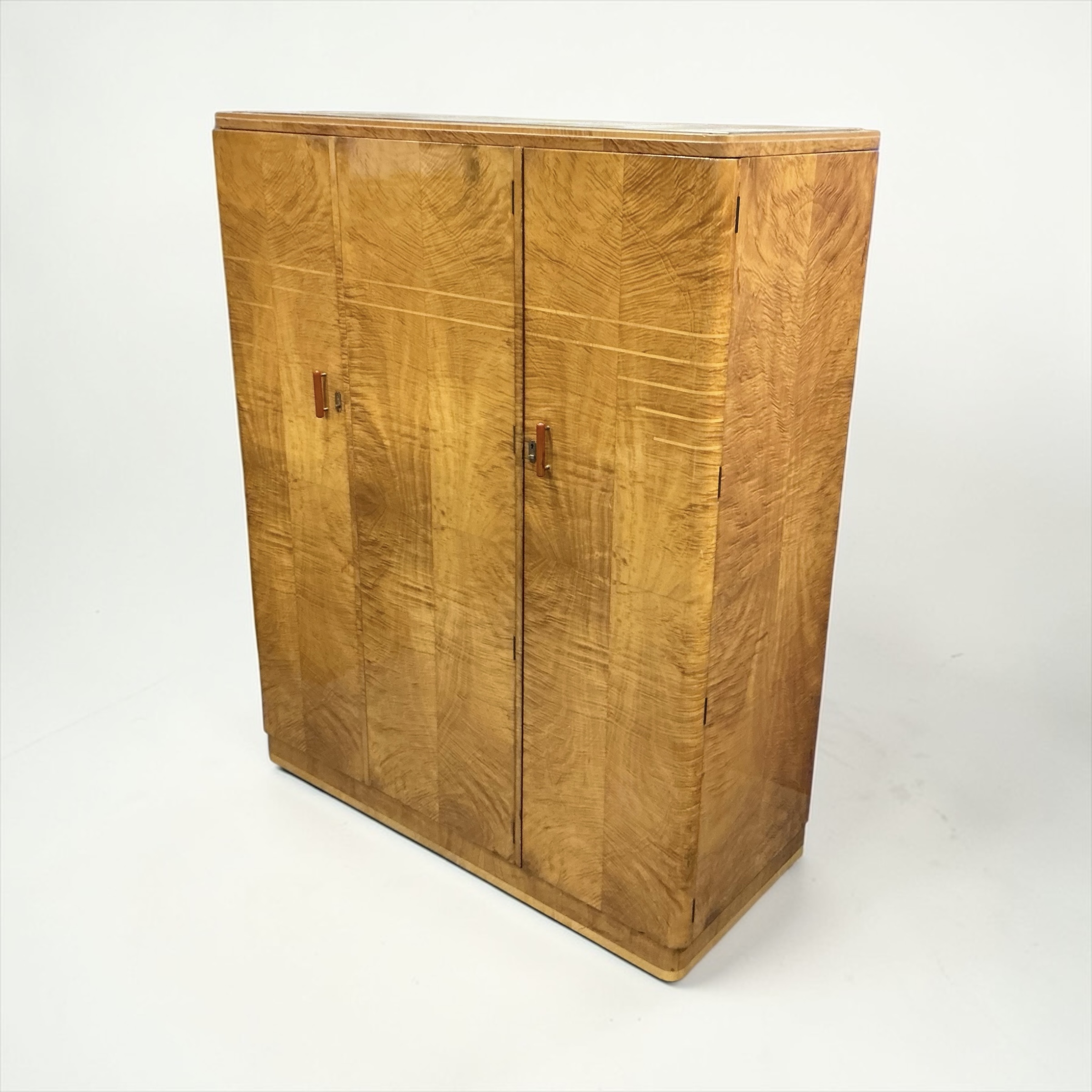 A quality Art Deco triple wardrobe in maple, with stepped inlay detailing in light maple to the front and coral colour phenolic handles. To the left side, two doors open to two hanging sections, a top shelf, a shoe rack and a fitted mirror to the left door. To the right, the door opens to a top shelf, two cupboards with open and over glazed doors, a further shelf below and three drawers.