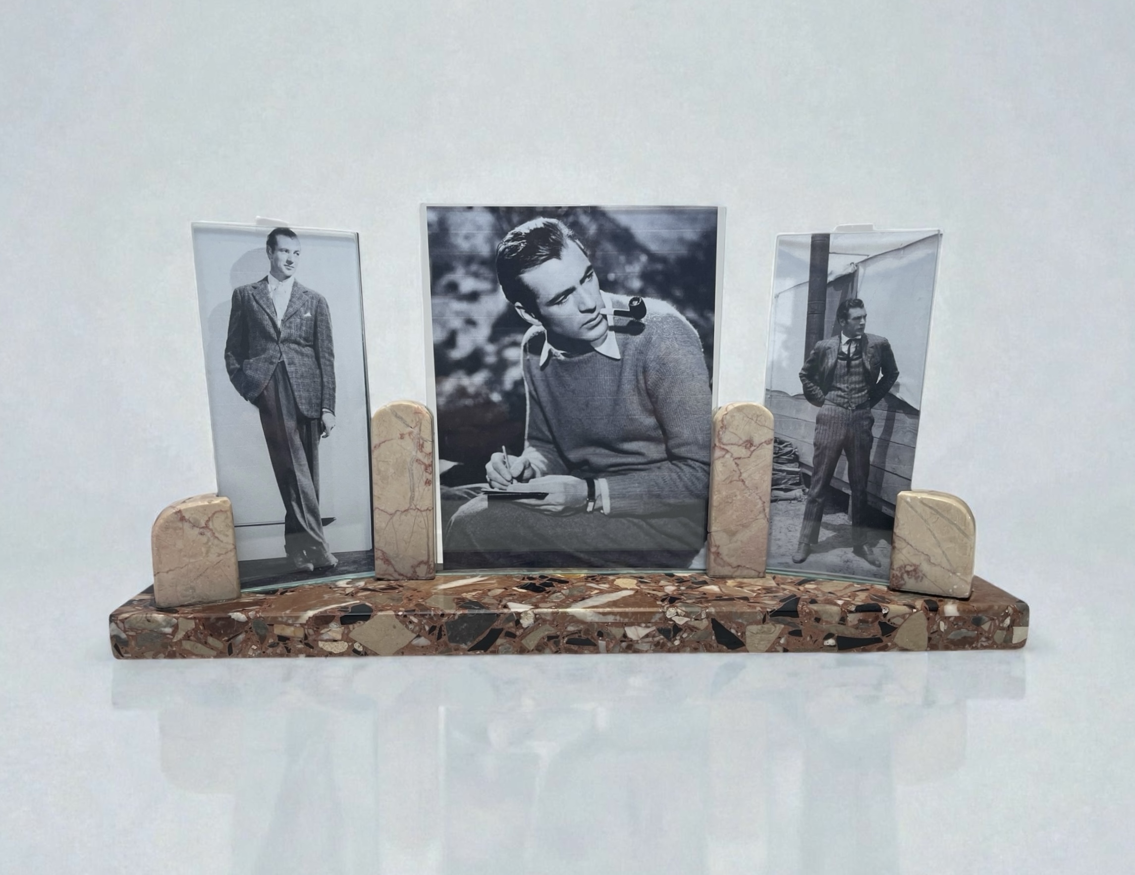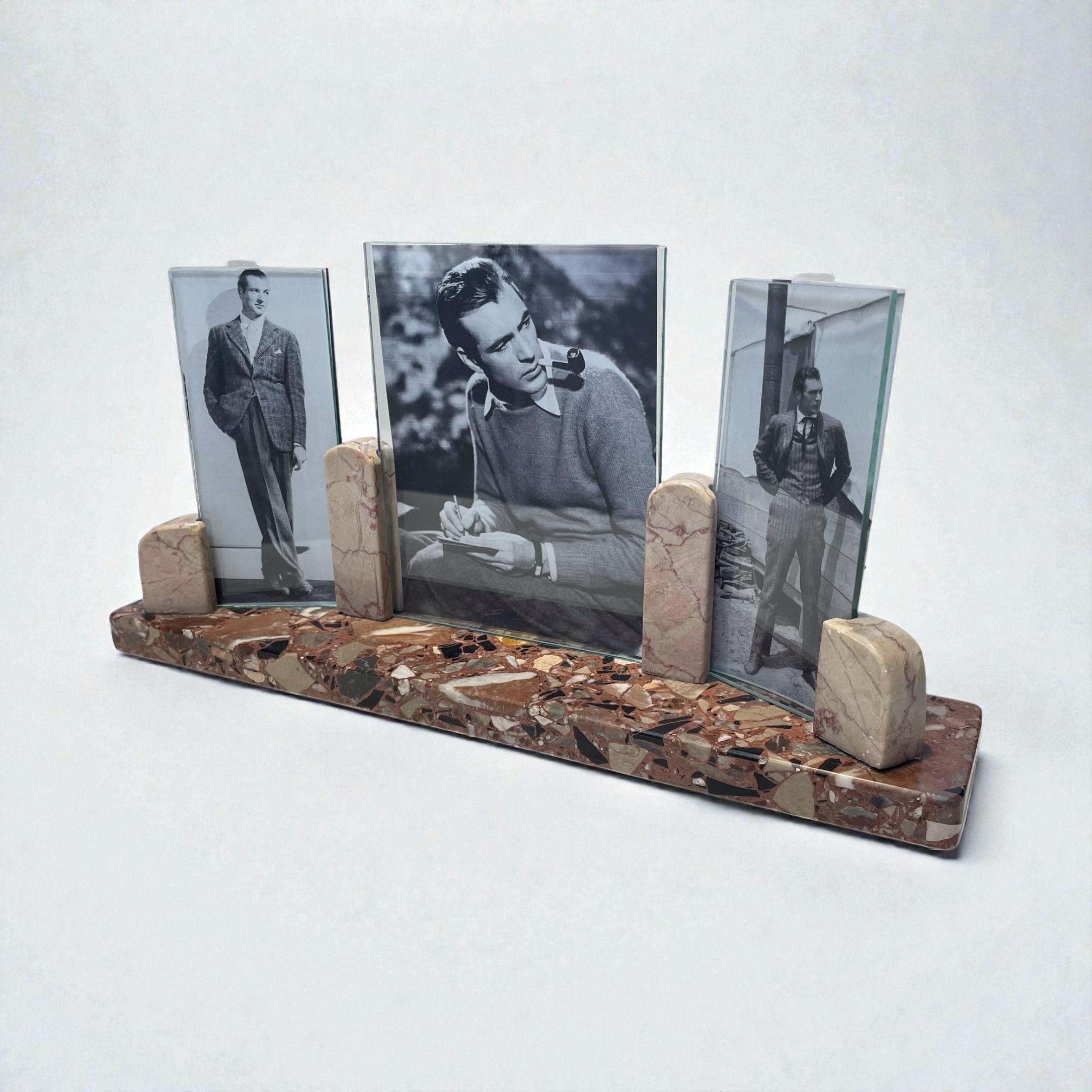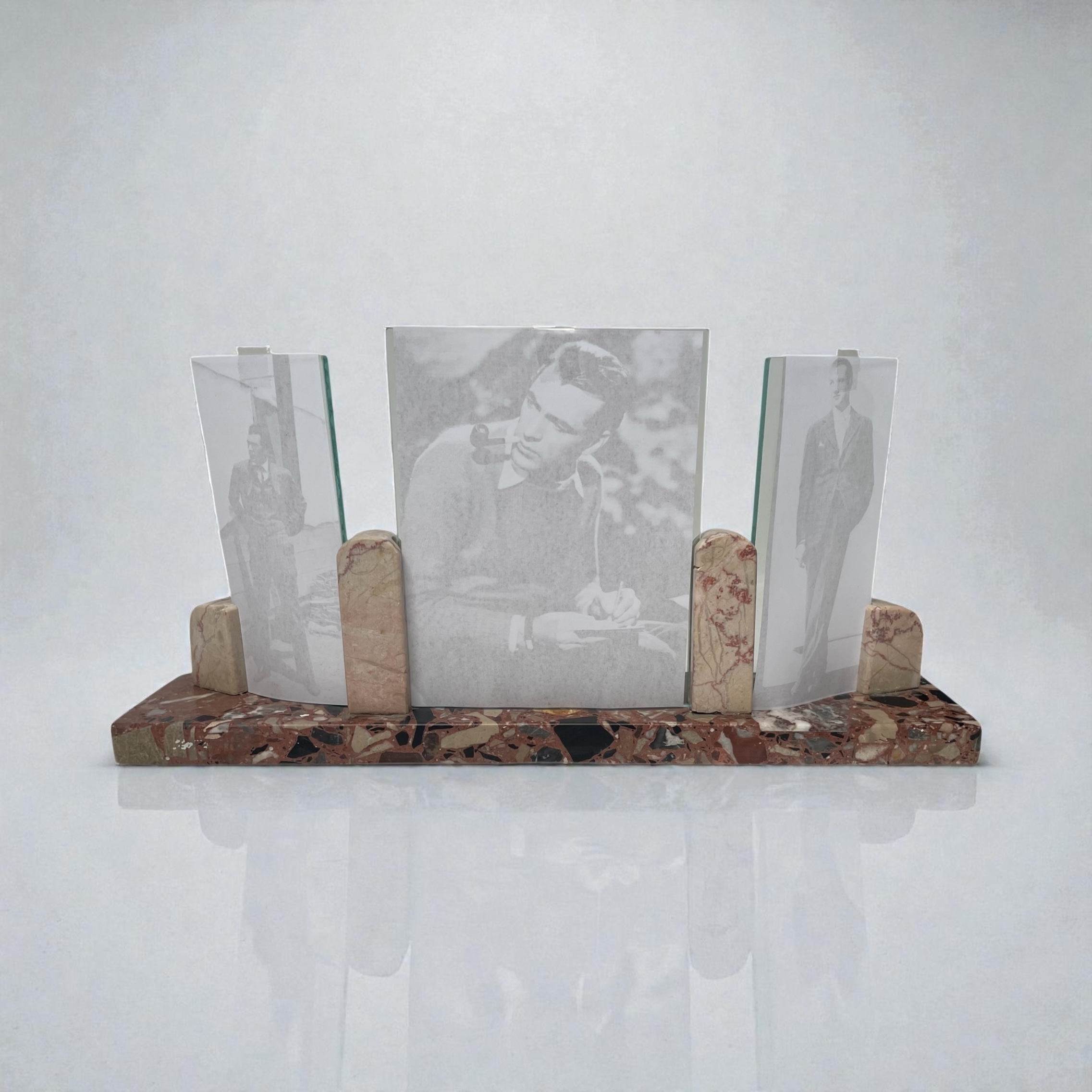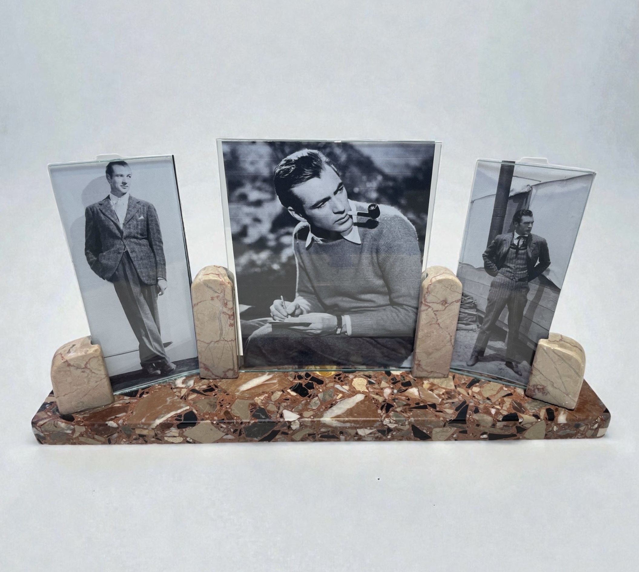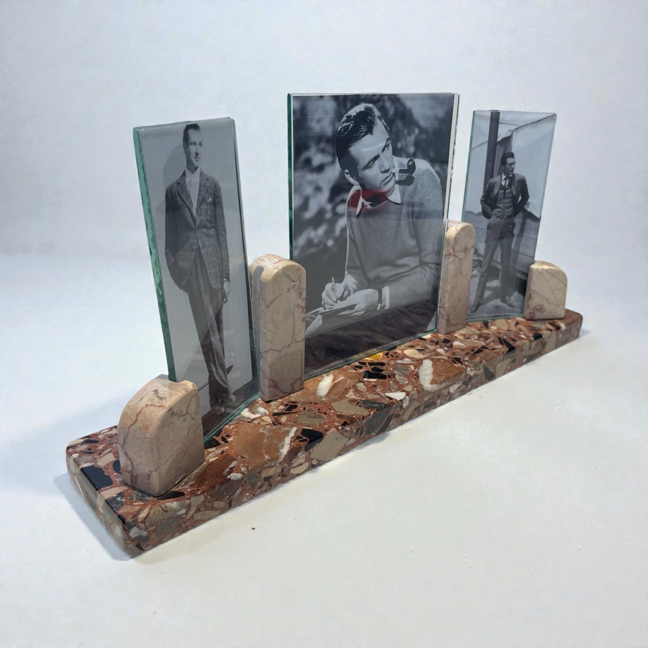 £85.00 Art Deco triptych photograph frame, with a striking multicoloured marble rectangular base and contrasting beige and red veined marble photograph supports. In very good condition. Height: 17cm Width: 35cm Depth: 7cm Categories: All Stock, Decorative Items