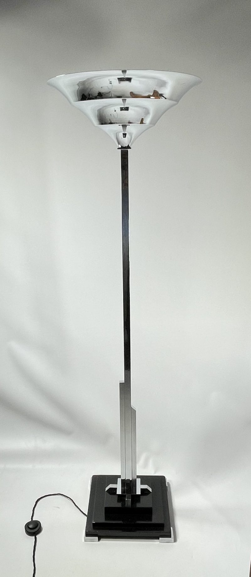An Art Deco chrome uplighter. Good Art Deco design to the black wooden base and chrome column. Raised on chrome feet.